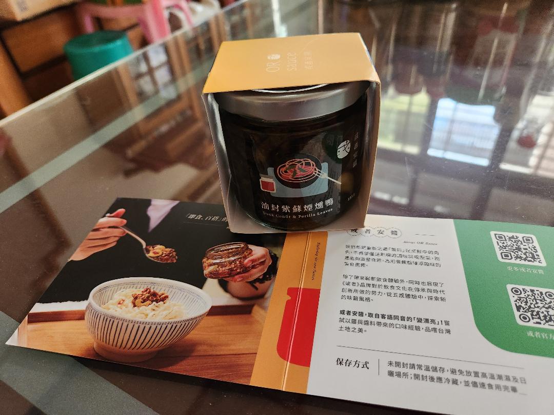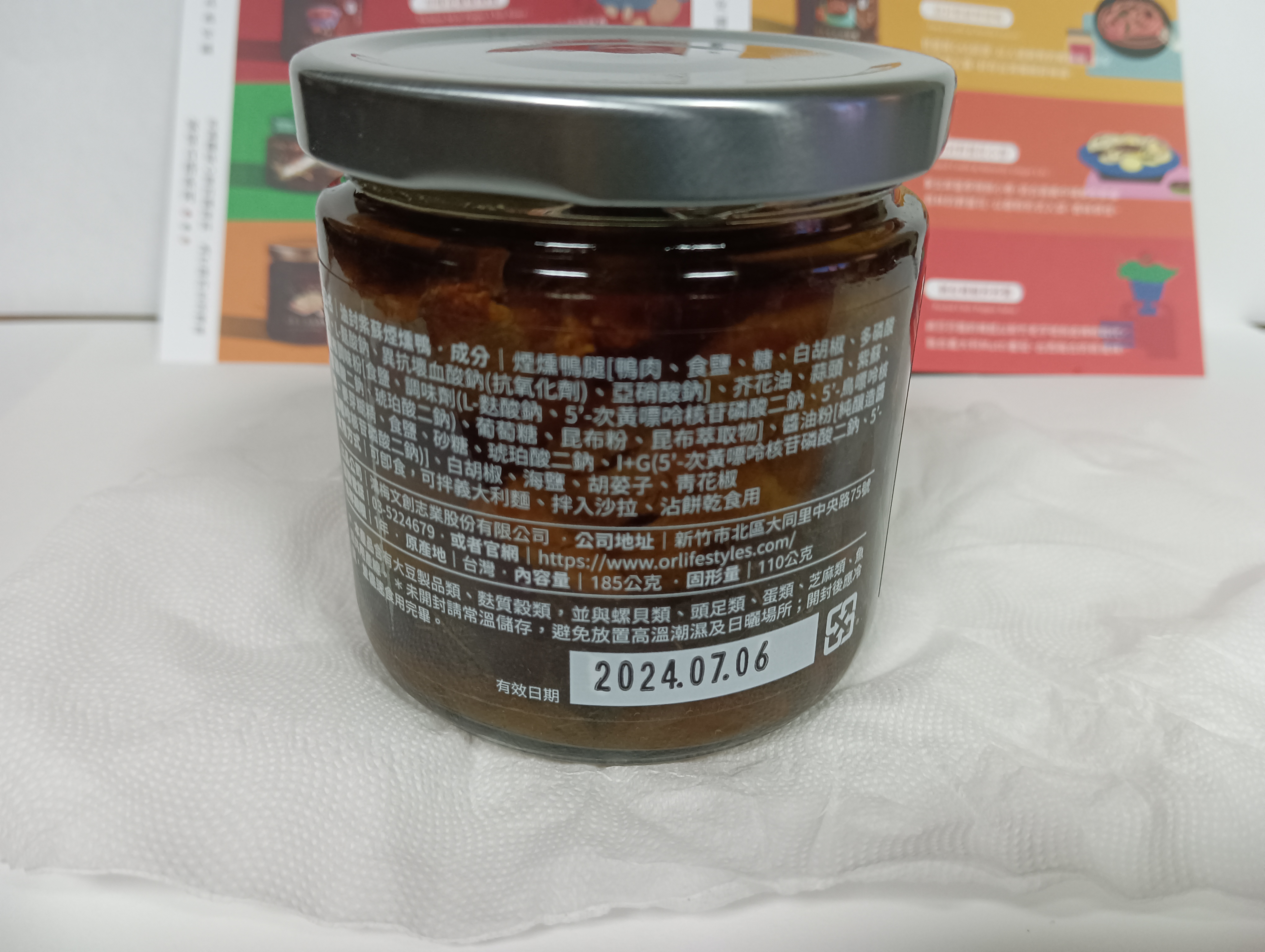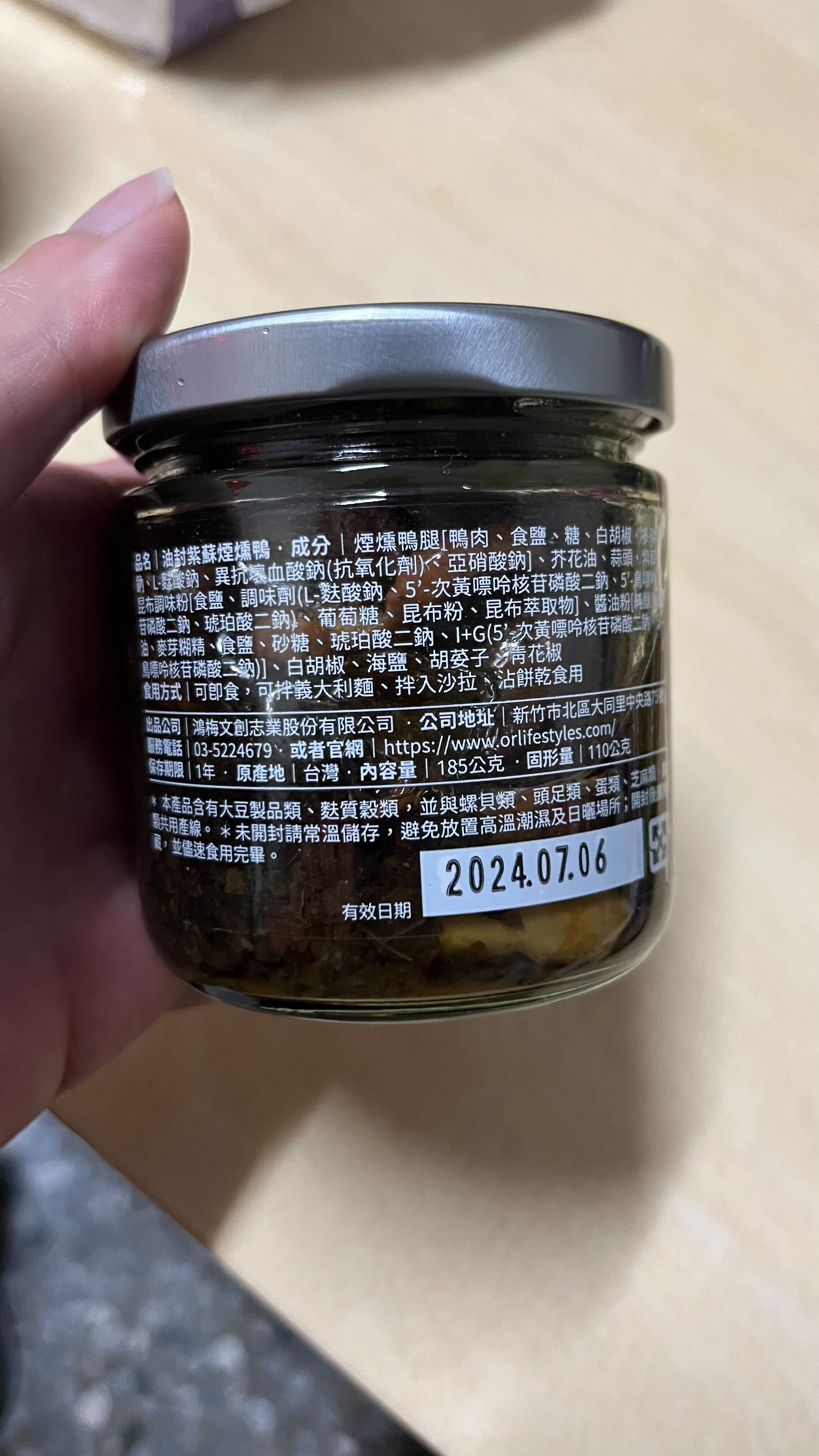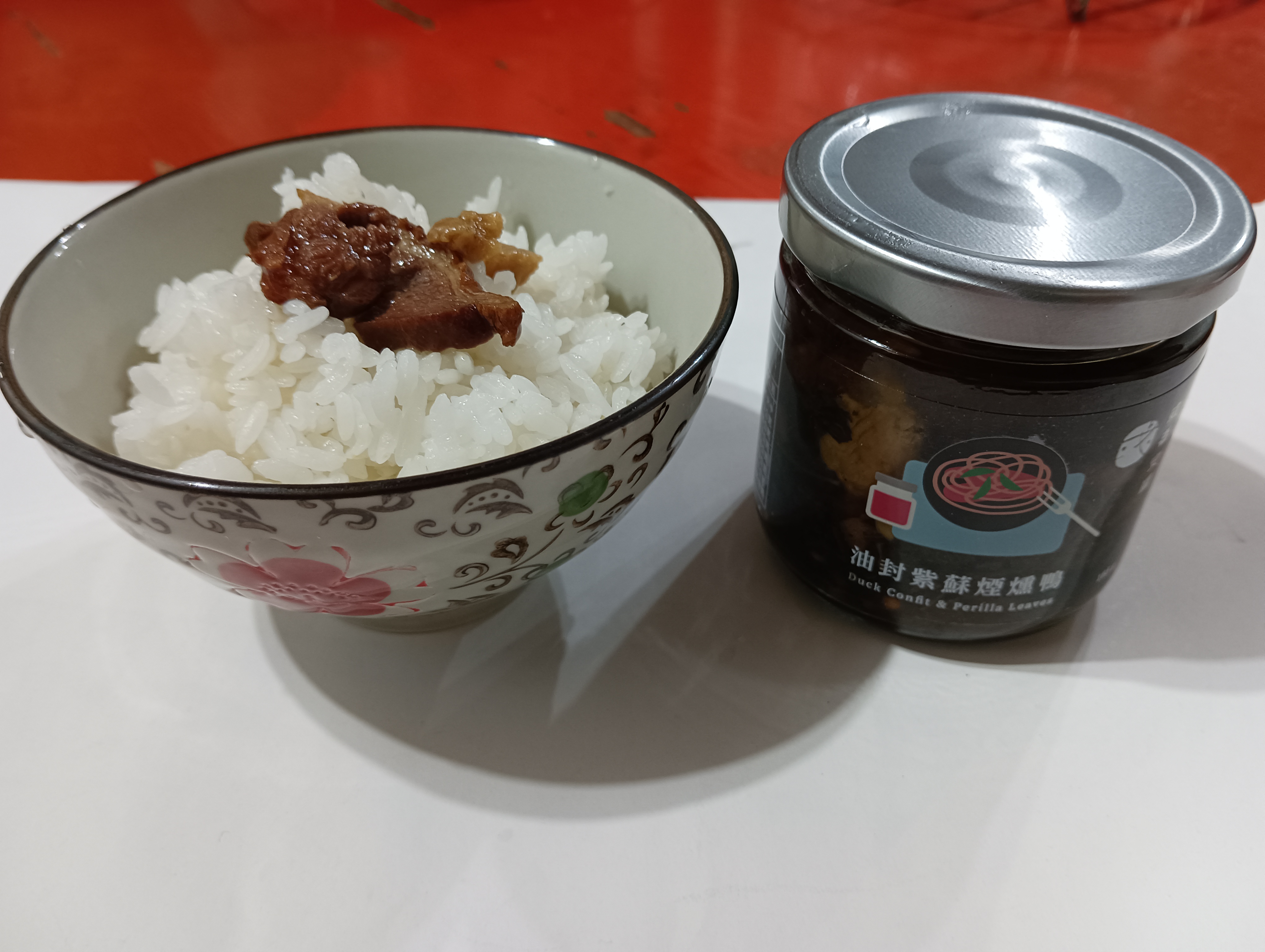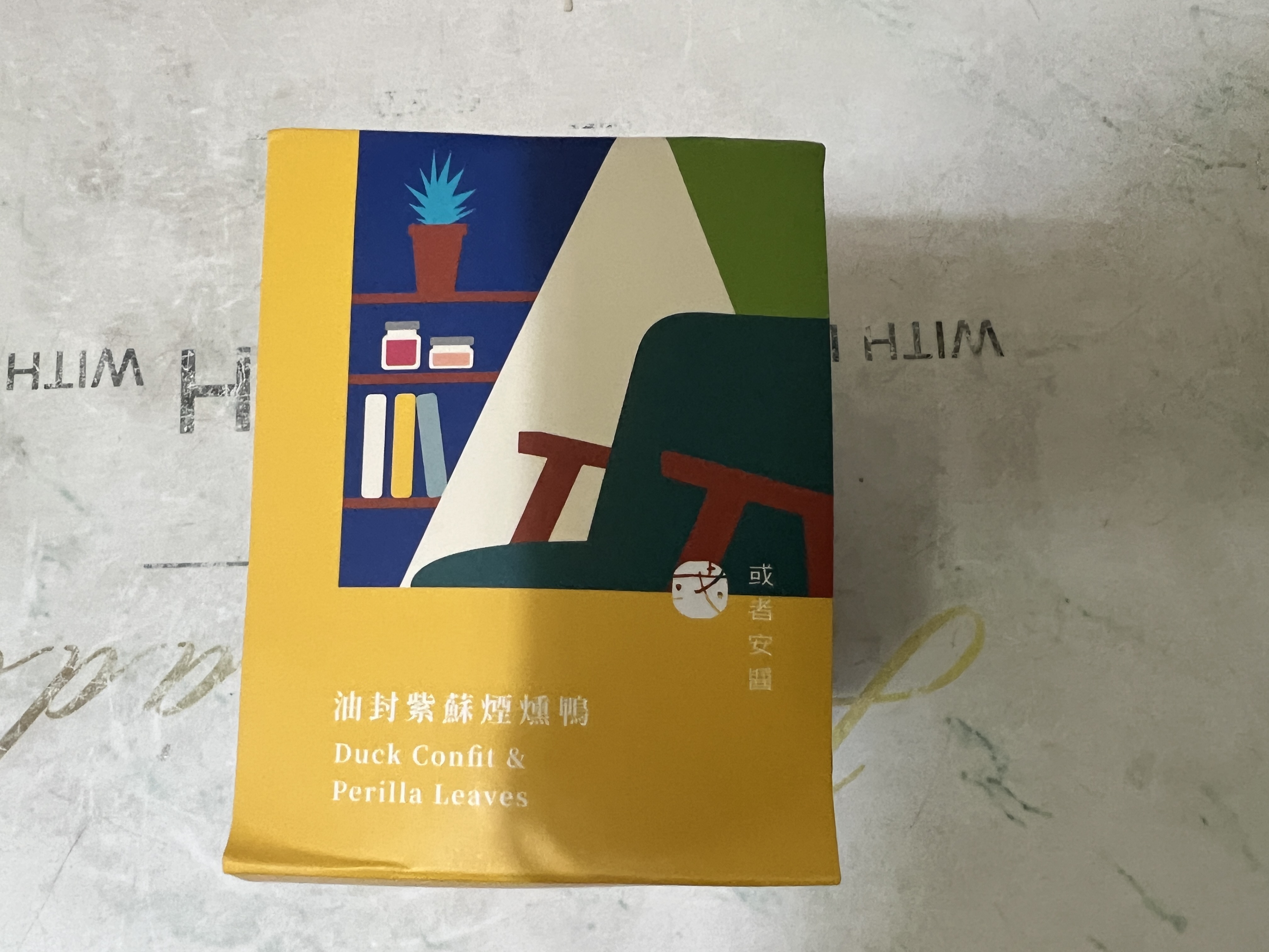 煙燻鴨腿[鴨肉、食鹽、糖、白胡椒、多磷酸鈉、L-麩酸鈉、異抗壞血酸鈉(抗氧化劑)、亞硝酸鈉]、芥花油、蒜頭、紫蘇、昆布調味粉[食鹽、調味劑(L-麩酸鈉、5’-次黃嘌呤核苷磷酸二鈉、5’-鳥嘌呤核苷磷酸二鈉、琥珀酸二鈉)、葡萄糖、昆布粉、昆布萃取物]、醬油粉[純釀造醬油、麥芽糊精、食鹽、砂糖、琥珀酸二鈉、I+G(5’-次黃嘌呤核苷磷酸二鈉、5’-鳥嘌呤核苷磷酸二鈉)]、白胡椒、海鹽、胡荽子、青花椒