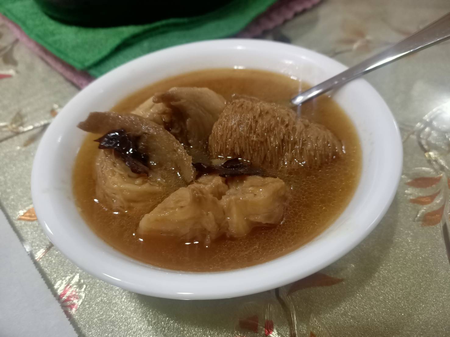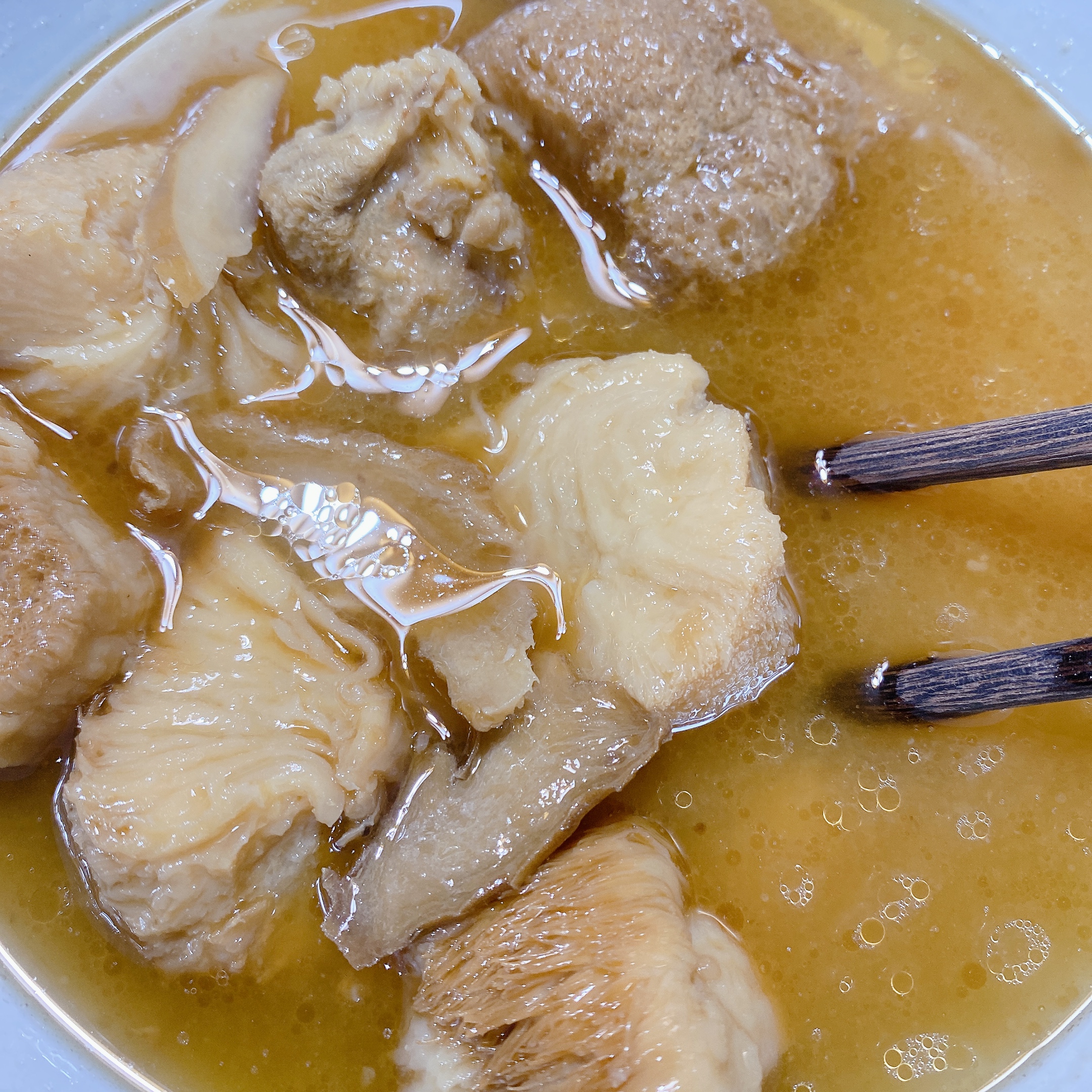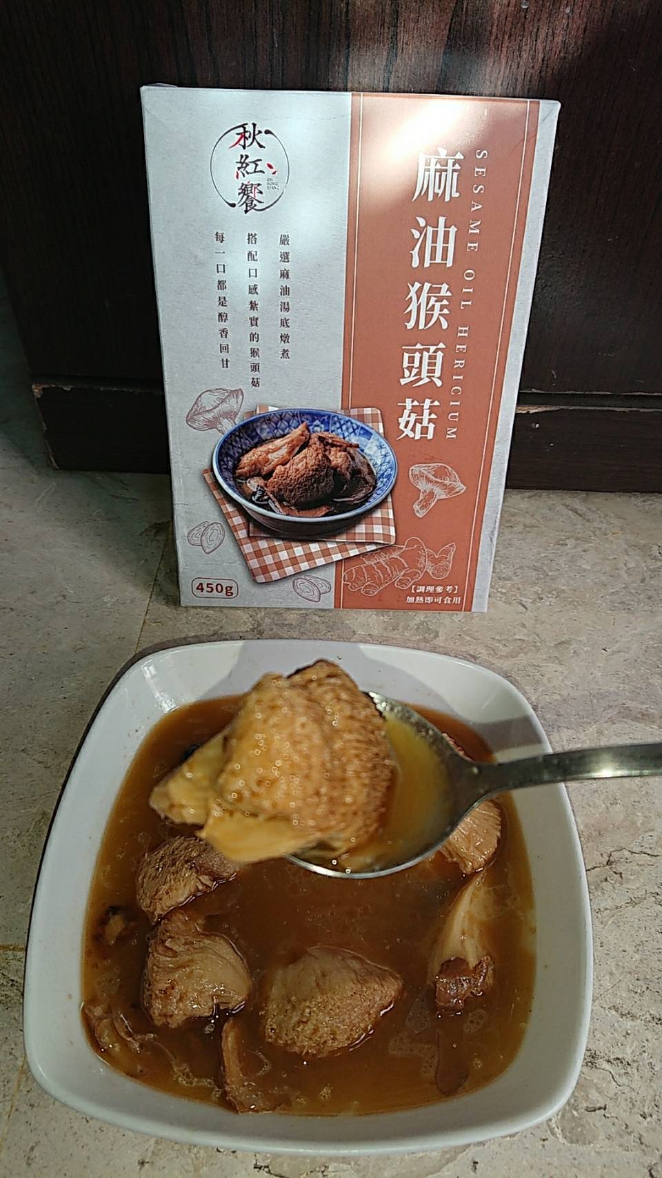 成分:湯汁(水、芝麻油、薑、豆腐乳(黃豆(基因改造)、水、糙米、食鹽、糖、調味劑(胺基乙酸、琥珀酸二鈉)、甜味劑(甘草酸鈉、蔗糖素)、健美鮮CL(麥芽糊精、食鹽、蔗糖、酵母抽出物、黃豆水解蛋白、香菇抽出物、高麗菜抽出物)、米酒、精鹽、醬油、冰糖、素鮮雞風味粉(鹽、糖、玉米澱粉、麥芽糊精、酵母抽出物、白胡椒粉、食品添加物:香料、胺基乙酸、DL-胺基丙酸、琥珀酸二鈉、5'-次黃嘌呤核苷磷酸二鈉、5'-鳥嘌呤核苷磷酸二鈉、二氧化矽)、川芎、黃耆、桂枝、當歸、枸杞、甘草)、猴頭菇(猴頭菇、蛋液、昆布粉、糖、精鹽、大豆沙拉油)、薑、紅棗