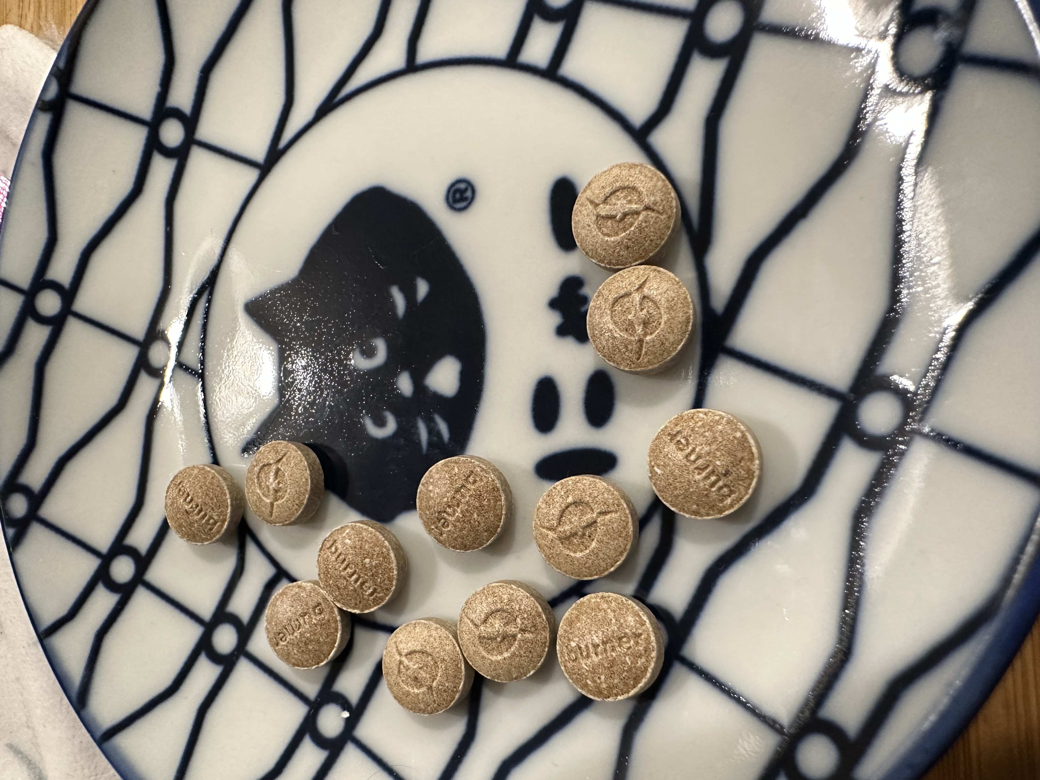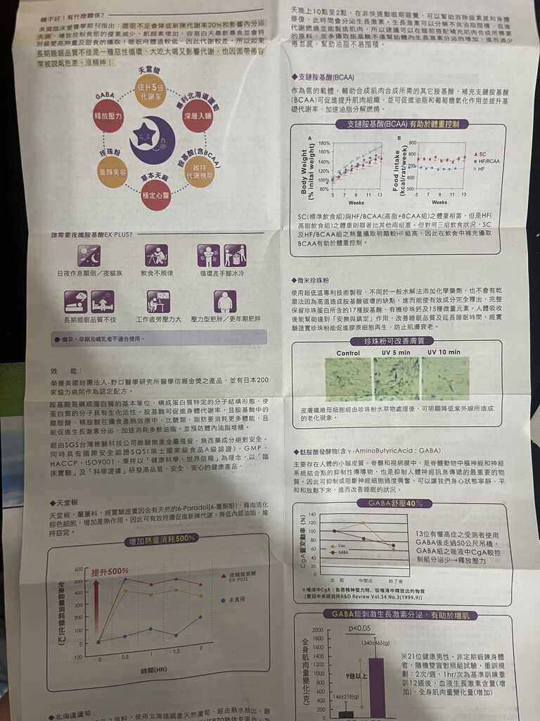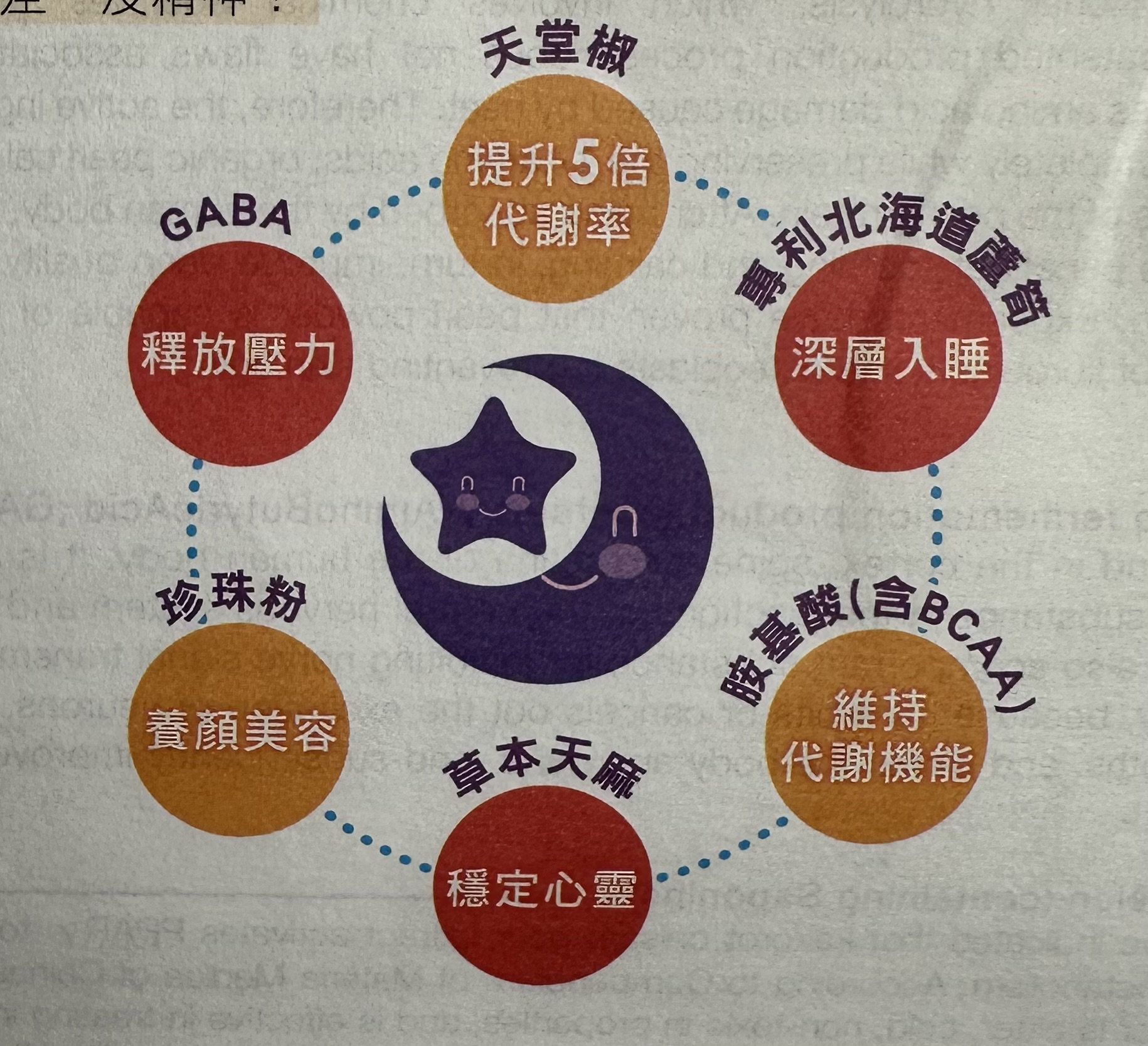 乳糖、天堂椒籽萃取物、苦瓜(含皂苷)、微結晶狀α-纖維素、天麻萃取物、綜合胺基酸【含L-組胺酸、牛磺酸、L-天冬胺酸、L-麩酸、L-二胺基己酸、L-精胺酸、L-丙胺酸、胺基乙酸、DL-羥丁胺酸、L-酪胺酸、L-苯丙胺酸、DL-蛋胺酸、L-脯胺酸、L-胱胺酸、DL-色胺酸、麩醯胺酸、L-絲胺酸、BCAA(L-白胺酸、L-異白胺酸、L-α胺基異戊酸)】、硬脂酸鎂、蘆筍萃取物、麩胺酸發酵物(含GABA)、二氧化矽、微米珍珠粉(含L-麩酸酯、L-絲胺酸)、綜合維生素與礦物質