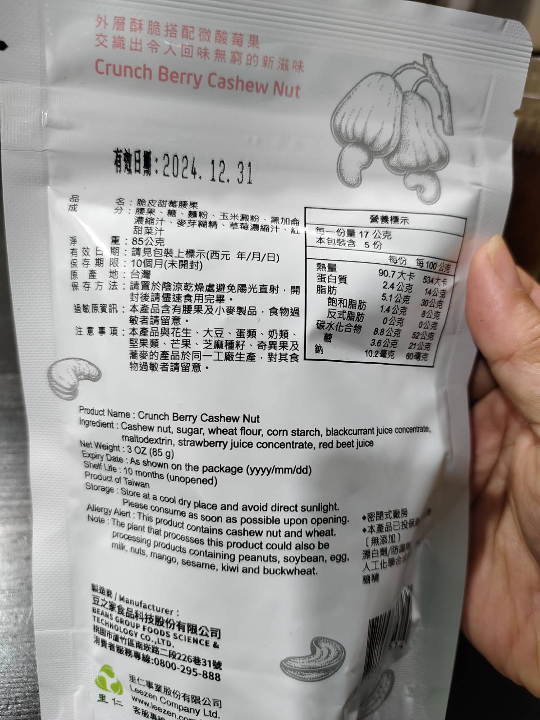 回列表 里仁 脆皮甜莓腰果 脆皮口感 甜莓風味 酸酸甜甜好滋味 市價110元/1包(免費申請) 所需等級 一般會員以上 所需學分 30 體驗份數 50 關注人數 1058 申請人數 292 申請截止 品牌業者:里仁事業股份有限公司 負責廠商 豆之家食品科技股份有限公司 廠商地址 338桃園市蘆竹區南崁路二段226巷31號 產地 台灣 試用產品規格 85g/包 食品業者登錄字號 H-186830223-00000-7 投保產品責任險字號 22A0002259 心得分享 商品介紹 商品成分 使用方法 注意事項 體驗名單 8.8 里仁脆皮甜莓腰果 口感酥脆 9.1 涮嘴程度 8.7 甜莓口味 8.7 真材實料 9.2 建議推薦 8.9 心得分享 49則 吳麗娟 鑽石達人 57歲 屏東縣 2024/04/24 對里仁脆皮甜莓腰果留下評價 10 這款零嘴外層酥脆可口,加入了甜美微酸的莓果,為原本單純的腰果帶來全新的風味。當咀嚼時,口中濃濃的草莓香氣,釋放出誘人的甜酸滋味,而後腰果的香濃口感緊接而來,交織出一種令人回味無窮的絕妙滋味。口感層次豐富,層層遞進,讓人忍不住一口接一口。這是一道巧妙融合了酥脆、甜酸、香濃等特點的創意小點心,太好吃了。 余祐鋌 金食達人 63歲 高雄市 2024/04/24 對里仁脆皮甜莓腰果留下評價 10 里仁脆皮甜莓腰果的外層酥脆搭配微酸莓果,交織出令人回味無窮的新滋味。堅果是極受歡迎的能量食物,嚴選整顆飽滿的硬脆腰果,外皮烤的香酥可口,再裹上酥脆外皮,以特製莓果調味,酸酸甜甜,酥脆口感,清爽酸甜,令味蕾充滿驚喜的獨特口味喔!真材實料、口感酥脆,是好吃的小點心。 郭素君 金食達人 41歲 高雄市 2024/04/24 對里仁脆皮甜莓腰果留下評價 10 吃完飯後總得要來份甜點或是小零食,這樣才算滿足。里仁脆皮甜莓腰果絕對能滿足我的需求,它備俱營養且熱量也不高,還能滿足口慾。一口咬下,從外脆到裡面,口感微甜不膩口,無添加複雜成份,食用起來更安心。全家食用過後都超滿意,二位寶貝還說以後要常常吃哦。 Rua Yu 金食達人 33歲 臺中市 2024/04/25 對里仁脆皮甜莓腰果留下評價 10 夾鍊袋包裝,方便攜帶和保存,成份看起來相對單純,沒有太多添加物,所以在保存上要多注意。腰果外層的殼很酥脆,酸甜可口,甜度和酸度都剛剛好相得益彰的口味,不會過甜過酸,剛剛好,我算是篇嗜甜的口味的人,卻也覺得這個酸的平衡是很剛好的,很容易一口接一口吃完(這次一打開就忍不住嗑完了)外觀紫紅色也非常好看,如果要作為零食拼盤或是點綴也是一個很特別的顏色。包裝寫純素,不過背面有寫工廠同時有做蛋奶類等(這主要是給過敏者確認用的),不太確定素食者會不會介意這一點。整體評價:很好吃,會想再吃 小烏龜 金食達人 40歲 臺北市 2024/04/25 對里仁脆皮甜莓腰果留下評價 10 很高興這次有機會能試吃到里仁脆皮甜莓腰果,沒想到腰果可以這麼好吃,脆皮的口感,酸酸甜甜的,不管是小孩或大人都喜歡,一口接一口,一下子就全吃光了!很適合來當小點心,給小朋友補充營養,又健康,有機會一定要再回購!! 鄧若琳 金食達人 60歲 新北市 2024/04/25 對里仁脆皮甜莓腰果留下評價 10 脆皮甜莓腰果算是一款健康的零食,有堅果的營養,外面裹著甜莓風味的脆皮,酸甜滋味令人驚豔,雖然莓果的風味不甚強烈,但我想應該是產品趨向天然,所以並未添加太強烈的氣味。另外,腰果烘焙的酥脆,吃起來很涮嘴,令人忍不住多吃一點。 廖玉婷 金食達人 37歲 桃園市 2024/04/25 對里仁脆皮甜莓腰果留下評價 10 通常對腰果的印象不是楓糖腰果就是原味或鹹味的,第一次吃到脆皮腰果,而且還是莓果口味,意外的很搭,會一口接一口停不下來~外面的脆皮稍微硬一點點,但是咬開來的口感真的好脆好好吃,而且裡面的腰果感覺有特別挑過都很大顆,在嘴巴裡嚼開來的堅果香味四溢,真的好好吃!莓果口味是由草莓濃縮汁+黑加侖濃縮汁+紅甜菜汁組成~微酸微甜味道剛剛好。 柯比布萊恩 金食達人 26歲 新北市 2024/04/27 對里仁脆皮甜莓腰果留下評價 10 簡單分享一下今天早餐,品嚐了里仁脆皮甜莓腰果,滿滿的好滋味! 那脆皮口感簡直讓人上癮,一口咬下去,爽脆的感覺彷彿在口中跳舞。 而甜莓的風味則是點睛之筆,酸酸甜甜的味道讓人回味無窮。 這款獨特的口味組合,讓我彷彿置身於甜蜜的童話世界。 每一顆腰果都飽含著濃濃的幸福,讓人心情愉悅。大小也跟十元硬幣一樣,非常大阿, 這次的美食體驗讓我深深地沉醉其中,對於里仁脆皮甜莓腰果的口感和風味,我已經完全著迷了!謝謝食力給我這個機會分享,繼續大快朵頤囉 謝婷婷 金食達人 45歲 臺中市 2024/04/28 對里仁脆皮甜莓腰果留下評價 10 應該都知道,堅果是優質油脂的攝取來源之一,所以市面上就出現各式各樣的堅果產品,而這次幸運抽到試吃的里仁甜莓腰果,真的讓我非常開心。首先,里仁一直是我的愛店,在食安問題層出不窮的現在,讓我能安心消費,所以我優先查看了產品成份並愉悅的證實,甜莓腰果紫紅色脆皮的部分,都是天然色素,可以放心大口吃,然後,入口之後,首先會嚐到微酸微甜的脆殼,咬碎後腰果大顆飽滿,沒有異常的油耗味,腰果果肉融合酸甜外皮,讓我一顆接一顆,是我會很愛的小零嘴,對我來說,吃里仁甜莓腰果,唯一的擔心,就是怕我會一口接一口,停不下來,又會吃太多啦~ 游茵茵 金食達人 40歲 桃園市 2024/04/29 對里仁脆皮甜莓腰果留下評價 10 每次想到要買有機的,或是健康的商品,就會想到里仁,有幾次特地去里仁就為了