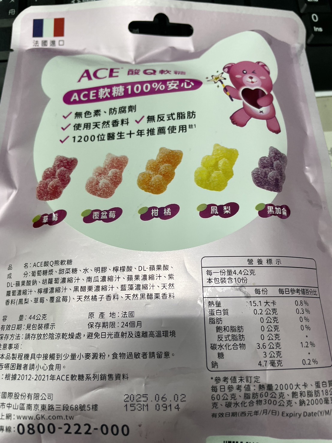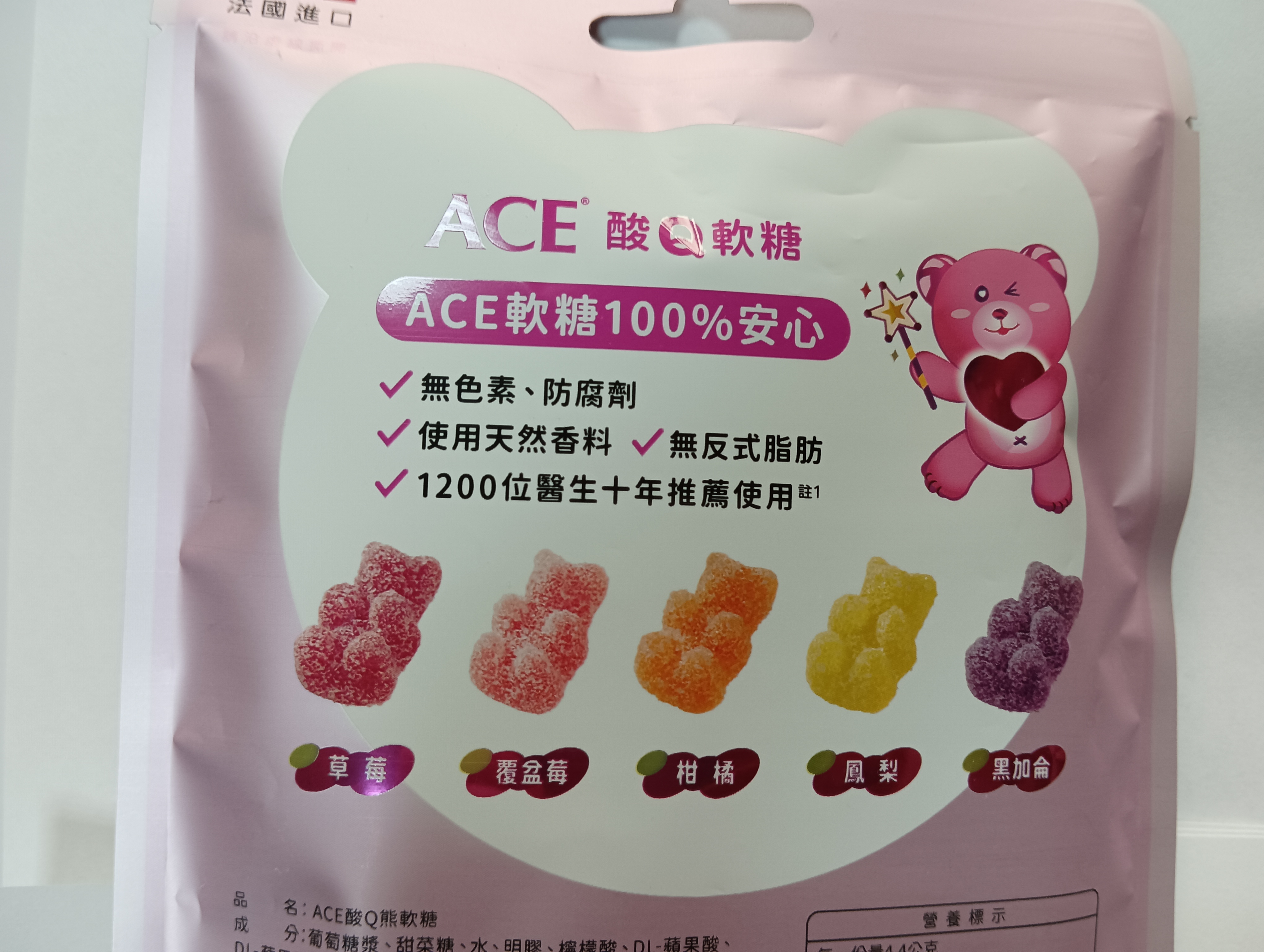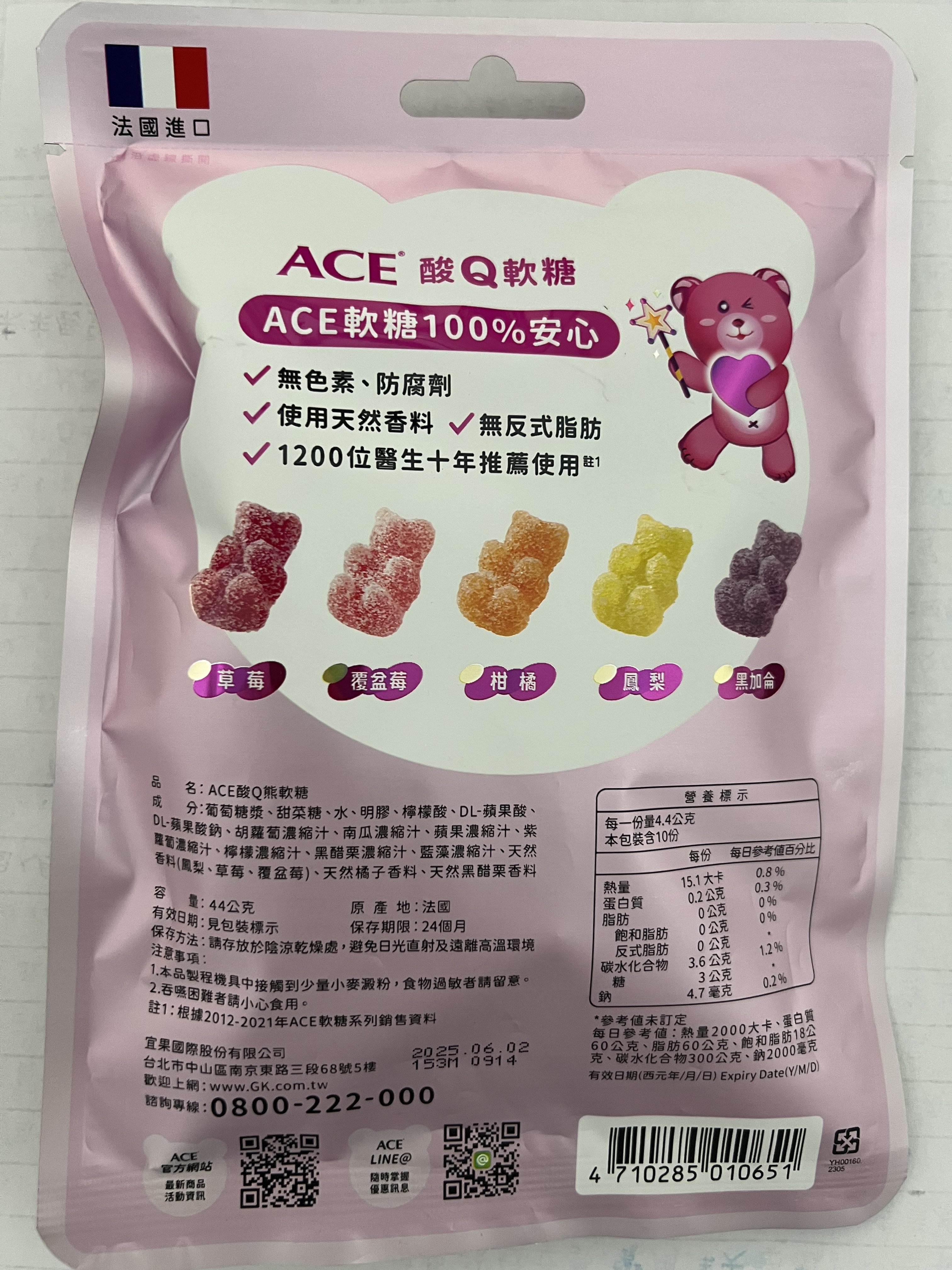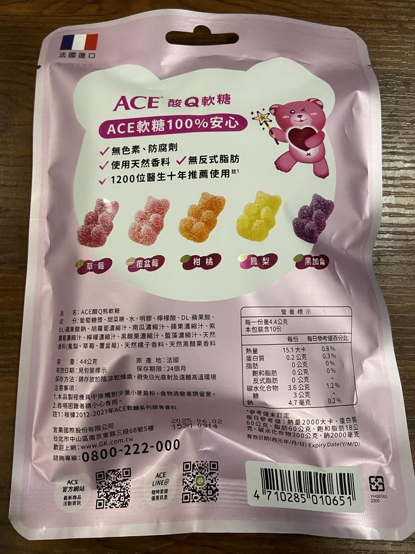 回列表 ACE 酸Q熊軟糖 媽媽心目中的軟糖首選品牌——法國浪漫與安心的存在 市價130元 (免費申請) 所需等級 一般會員以上 所需學分 50 體驗份數 15 關注人數 1349 申請人數 274 申請截止 品牌業者:ACE 負責廠商 宜果國際股份有限公司 廠商地址 台北市南京東路三段68號5樓 產地 法國 試用產品規格 44g/袋 食品業者登錄字號 A-122608830-00000-7 投保產品責任險字號 1516字第09PD02316號 心得分享 商品介紹 商品成分 使用方法 注意事項 體驗名單 9.1 ACE 酸Q熊軟糖 Q彈口感 8.9 口味多元 8.5 方便食用 9.2 包裝美學 9.1 建議推薦 8.8 心得分享 15則 Yi Yin 銀食達人 45歲 臺南市 2024/02/26 對ACE 酸Q熊軟糖留下評價 10 第一次收到試吃,就是孩子們最愛的ACE軟糖,因為ACE的天然成份,且還有醫生推薦,在各大診所藥局都會販售,覺得對它很放心,也很有信心,孩子也吃的很開心。這次ACE偏酸,風味也很明顯的分辦的出來,連大人都吃的很開心,酸酸甜甜的滋味,真是會停不下來一包接著一包打開。一次二顆的包裝,可以吃糖不過量,是貼心的設計。口感上有一點點偏硬,如果可以再軟Q一點就更棒了。 APPLE 金食達人 39歲 新北市 2024/02/27 對ACE 酸Q熊軟糖留下評價 8 咀嚼系出來吧~!*%@!*/!---(咀嚼聲)--- 也太耐咬了吧我不是前往吃的路上就是在在吃的當下等車時、座車時、看著美麗櫻花時候,讓嘴巴也一起感受美好吧!就是這包{ACE酸Q軟糖}小熊軟糖小巧又可愛又能分享包裝材質採霧面質感,顏色橘色亮眼活潑、霧面銀粉色柔和不少,在架位上也可以清楚找到此款。圖片中攤開掌心照片就是一包數量(沒有特別細數約8至10小包左右)單包裝內有兩隻小熊,上面裹滿了糖粉,但吃的時候感受不到。內包裝不一定都是不同口味小熊,也有機率是同口味包裝。小熊總共有五種口味紅色(草莓)、粉色(覆盆莓)、橘色(柑橘)、黃色(鳳梨)、紫色(黑加侖)我有驚人小發現,單吃小熊一隻味道是比較簡單的,但是當兩隻不同口味的小熊混在一口吃層次出來了,更酸甜好滋味。連不愛吃糖的朋友也讚賞一定要一口兩隻熊一起吃。小顆不怕小孩噎食,也能控制小孩吃糖的數量,包裝輕巧,又能讓小朋友學習分享食物以上照片櫻花為武陵農場 洪金蘭 金食達人 56歲 新北市 2024/02/29 對ACE 酸Q熊軟糖留下評價 9 沒想到我竟然可以試吃到〈ACE酸Q軟糖〉,這麼可愛又充滿童趣的商品。產品包裝正面是小熊的臉,背面則有非常清楚的產品介紹,尤其看到無色素無防腐劑、使用天然香料、成分主要為天然的果汁時,特別能令我感到100%的放心。整體包裝給人清新明亮又有質感,另外裏頭的小包裝更是貼心,能方便攜帶外出享用。每一顆軟糖都是小熊圖樣,每一種顏色也都有不同的口味,第一口含在嘴裡首先的感覺就是「酸」,但酸味很快就退去,取而代之是QQ的嚼感,很像是在咀嚼固態的果汁一般,很特別,不同於印象中的軟糖,我想這是一款健康的零食,能在休閒時刻帶來趣味,值得推薦! 謝子勤 金食達人 33歲 桃園市 2024/02/24 對ACE 酸Q熊軟糖留下評價 9 大包裝內含小包裝,一小包2顆,雖然可能會有過度包裝的感覺,但這一模式確實是蠻方便的,倘諾能夠一小包調整至3-4顆,個人認為是能夠滿足想吃的時候吃一包剛剛好的程度。軟糖口感偏向硬質的軟糖,非常耐咀嚼,適合喜歡具有咬合反饋感的消費客群,可以在口中咀嚼數次,有舒壓之功效。口味的部分屬於酸甜適中,但又比市售沾細沙的軟糖要來的更酸一點,不會過於甜口,整體喜好度會比市售競品高。 陳怡 金食達人 43歲 高雄市 2024/02/25 對ACE 酸Q熊軟糖留下評價 9 這次得知試吃ACE酸Q熊軟糖時很開心,平常小朋友的軟糖我都是買ACE的,沒有人工色素、人工香料、反式脂肪跟防腐劑,當孩子真的想要吃零食的時候,可以在包包裡放個幾包,很方便。這次酸Q熊軟糖,剛吃下去口味酸酸的,之後就是軟糖甜甜的口感,一包裡面有2顆軟糖,口味隨機,整體的包裝也粉嫩色系,小朋友收到也很開心。 吳秉承 鑽石達人 40歲 臺北市 2024/02/27 對ACE 酸Q熊軟糖留下評價 9 我本身工作壓力大,消除壓力喜歡吃點糖的零嘴,其中這款會很吸引我。雖然都是糖果,軟糖,當然要選對身體不會造成負擔的!這款ACE 酸Q熊軟糖是cute歐風熊的造型、又有法國濃濃浪漫包裝,大小孩看了都喜歡,而且內容物沒添加人工色素、防腐劑,使用天然元素讓人感到安心。酸酸甜甜的口味更會我愛不釋手,因為口感上先酸後甜,酸甜滋味很讚。另外,軟糖外觀非常輕巧可愛,小份量包裝,不用擔心過量,很推薦給大小朋友喔。 王子 金食達人 40歲 彰化縣 2024/02/27 對ACE 酸Q熊軟糖留下評價 10 家裡有小孩的一定都知道ACE軟糖,不是用人工香料,而是天然果汁調配出酸甜的的好滋味~當收到貨時孩子看到軟糖開心地尖叫!!平常對於孩子的糖分有在控制,不太讓他吃太多糖果,這款ACE酸Q軟糖標榜無色素、無防腐劑、無反式脂肪,打開是獨立小包裝袋,每小袋裡面會有2顆可愛造型的小熊糖果,共有5種口味隨機放,每次打開都不知道會是什麼口味,充滿驚喜~一入口是先酸味襲來,有點酸喔!!慢慢的才有糖果的甜味,我只能分配到一小包,很幸運吃到鳳梨和柑橘2種口味,吃起來都是很天然,完全沒有香料和香精的味道,很好吃!孩子很喜歡一定會回購~ Vivi Chan 金食達人 37歲 新北市 2024/02/28 對ACE 酸Q熊軟糖留下評價 10 沒想到酸甜軟糖也有健康版,自己很喜歡酸的味道,酸軟糖可以提升味道的層次,法