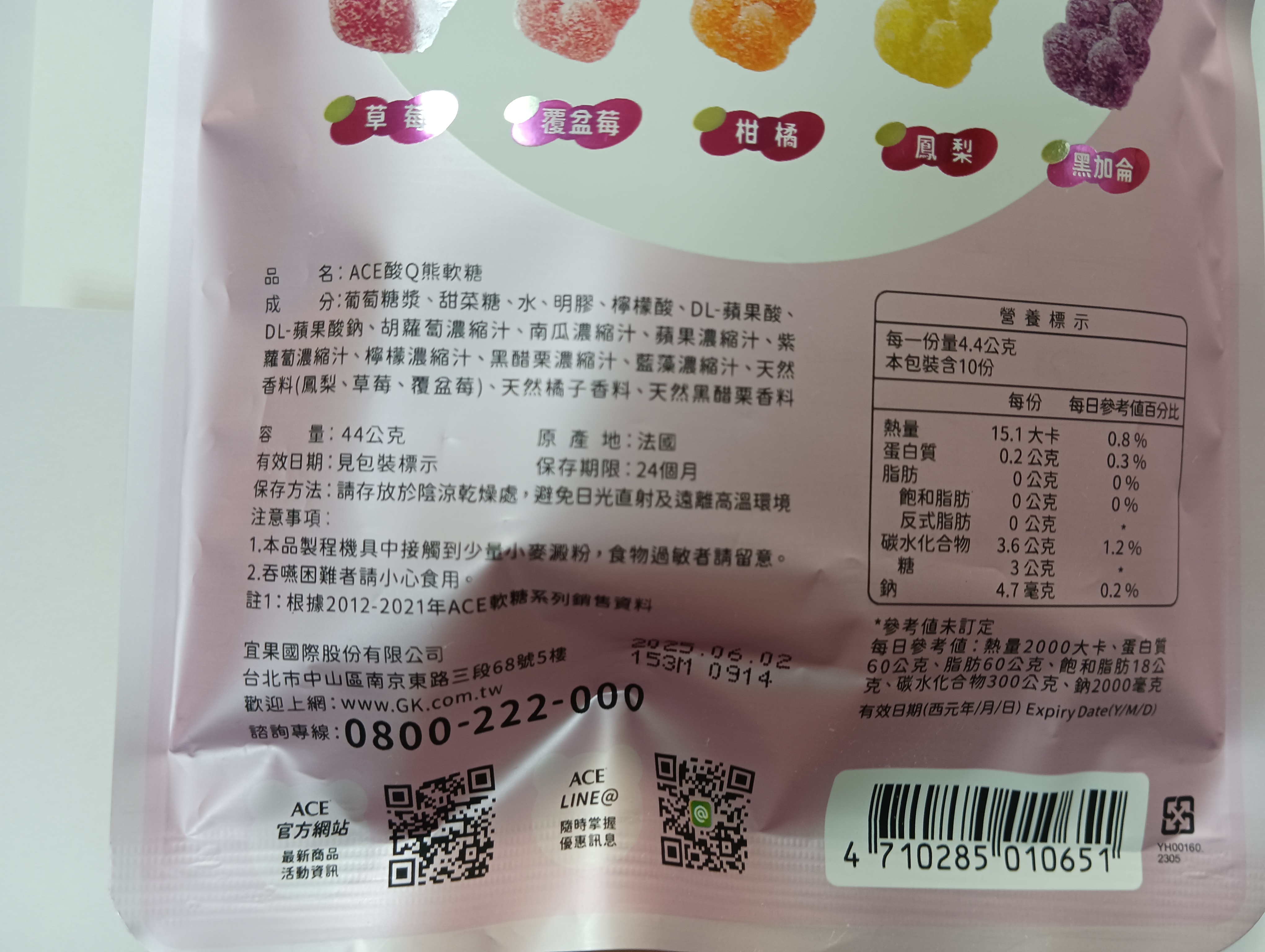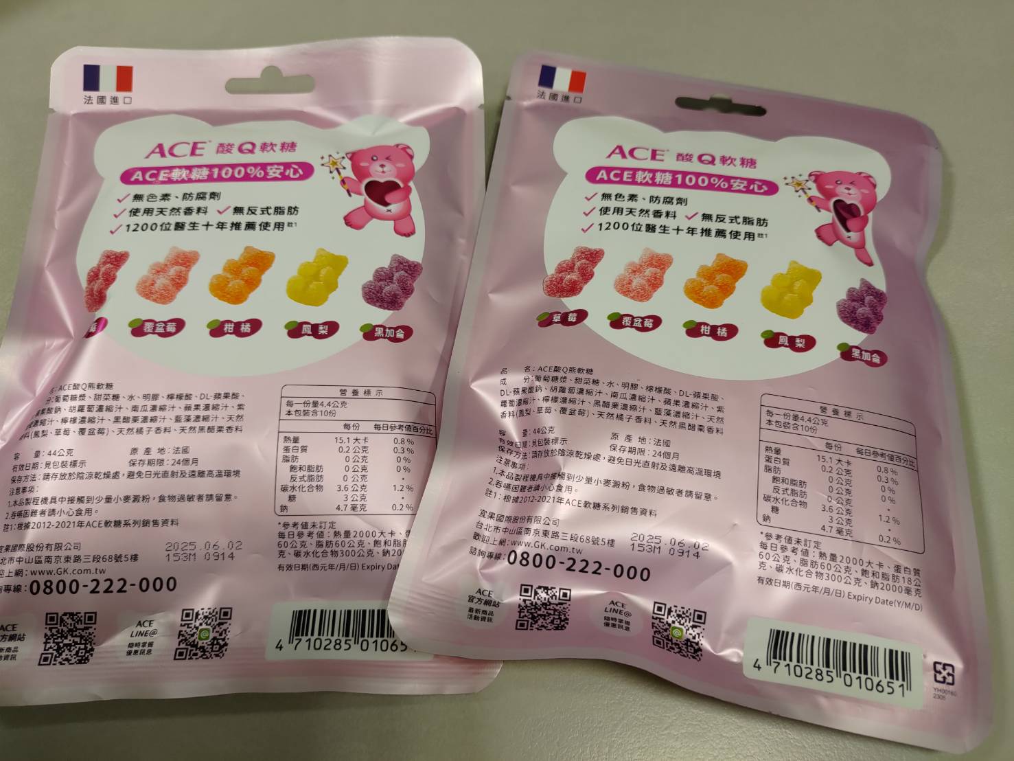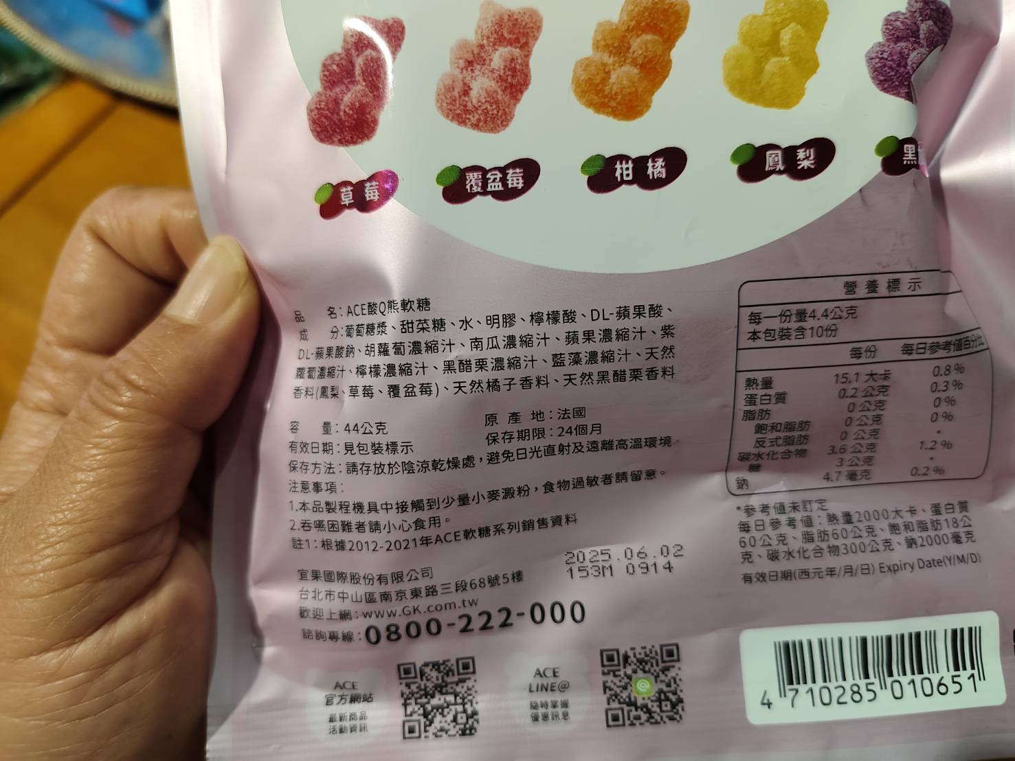 回列表 ACE 酸Q熊軟糖 媽媽心目中的軟糖首選品牌——法國浪漫與安心的存在 市價130元 (免費申請) 所需等級 一般會員以上 所需學分 50 體驗份數 15 關注人數 1349 申請人數 274 申請截止 品牌業者:ACE 負責廠商 宜果國際股份有限公司 廠商地址 台北市南京東路三段68號5樓 產地 法國 試用產品規格 44g/袋 食品業者登錄字號 A-122608830-00000-7 投保產品責任險字號 1516字第09PD02316號 心得分享 商品介紹 商品成分 使用方法 注意事項 體驗名單 9.1 ACE 酸Q熊軟糖 Q彈口感 8.9 口味多元 8.5 方便食用 9.2 包裝美學 9.1 建議推薦 8.8 心得分享 15則 Yi Yin 銀食達人 45歲 臺南市 2024/02/26 對ACE 酸Q熊軟糖留下評價 10 第一次收到試吃,就是孩子們最愛的ACE軟糖,因為ACE的天然成份,且還有醫生推薦,在各大診所藥局都會販售,覺得對它很放心,也很有信心,孩子也吃的很開心。這次ACE偏酸,風味也很明顯的分辦的出來,連大人都吃的很開心,酸酸甜甜的滋味,真是會停不下來一包接著一包打開。一次二顆的包裝,可以吃糖不過量,是貼心的設計。口感上有一點點偏硬,如果可以再軟Q一點就更棒了。 APPLE 金食達人 39歲 新北市 2024/02/27 對ACE 酸Q熊軟糖留下評價 8 咀嚼系出來吧~!*%@!*/!---(咀嚼聲)--- 也太耐咬了吧我不是前往吃的路上就是在在吃的當下等車時、座車時、看著美麗櫻花時候,讓嘴巴也一起感受美好吧!就是這包{ACE酸Q軟糖}小熊軟糖小巧又可愛又能分享包裝材質採霧面質感,顏色橘色亮眼活潑、霧面銀粉色柔和不少,在架位上也可以清楚找到此款。圖片中攤開掌心照片就是一包數量(沒有特別細數約8至10小包左右)單包裝內有兩隻小熊,上面裹滿了糖粉,但吃的時候感受不到。內包裝不一定都是不同口味小熊,也有機率是同口味包裝。小熊總共有五種口味紅色(草莓)、粉色(覆盆莓)、橘色(柑橘)、黃色(鳳梨)、紫色(黑加侖)我有驚人小發現,單吃小熊一隻味道是比較簡單的,但是當兩隻不同口味的小熊混在一口吃層次出來了,更酸甜好滋味。連不愛吃糖的朋友也讚賞一定要一口兩隻熊一起吃。小顆不怕小孩噎食,也能控制小孩吃糖的數量,包裝輕巧,又能讓小朋友學習分享食物以上照片櫻花為武陵農場 洪金蘭 金食達人 56歲 新北市 2024/02/29 對ACE 酸Q熊軟糖留下評價 9 沒想到我竟然可以試吃到〈ACE酸Q軟糖〉,這麼可愛又充滿童趣的商品。產品包裝正面是小熊的臉,背面則有非常清楚的產品介紹,尤其看到無色素無防腐劑、使用天然香料、成分主要為天然的果汁時,特別能令我感到100%的放心。整體包裝給人清新明亮又有質感,另外裏頭的小包裝更是貼心,能方便攜帶外出享用。每一顆軟糖都是小熊圖樣,每一種顏色也都有不同的口味,第一口含在嘴裡首先的感覺就是「酸」,但酸味很快就退去,取而代之是QQ的嚼感,很像是在咀嚼固態的果汁一般,很特別,不同於印象中的軟糖,我想這是一款健康的零食,能在休閒時刻帶來趣味,值得推薦! 謝子勤 金食達人 33歲 桃園市 2024/02/24 對ACE 酸Q熊軟糖留下評價 9 大包裝內含小包裝,一小包2顆,雖然可能會有過度包裝的感覺,但這一模式確實是蠻方便的,倘諾能夠一小包調整至3-4顆,個人認為是能夠滿足想吃的時候吃一包剛剛好的程度。軟糖口感偏向硬質的軟糖,非常耐咀嚼,適合喜歡具有咬合反饋感的消費客群,可以在口中咀嚼數次,有舒壓之功效。口味的部分屬於酸甜適中,但又比市售沾細沙的軟糖要來的更酸一點,不會過於甜口,整體喜好度會比市售競品高。 陳怡 金食達人 43歲 高雄市 2024/02/25 對ACE 酸Q熊軟糖留下評價 9 這次得知試吃ACE酸Q熊軟糖時很開心,平常小朋友的軟糖我都是買ACE的,沒有人工色素、人工香料、反式脂肪跟防腐劑,當孩子真的想要吃零食的時候,可以在包包裡放個幾包,很方便。這次酸Q熊軟糖,剛吃下去口味酸酸的,之後就是軟糖甜甜的口感,一包裡面有2顆軟糖,口味隨機,整體的包裝也粉嫩色系,小朋友收到也很開心。 吳秉承 鑽石達人 40歲 臺北市 2024/02/27 對ACE 酸Q熊軟糖留下評價 9 我本身工作壓力大,消除壓力喜歡吃點糖的零嘴,其中這款會很吸引我。雖然都是糖果,軟糖,當然要選對身體不會造成負擔的!這款ACE 酸Q熊軟糖是cute歐風熊的造型、又有法國濃濃浪漫包裝,大小孩看了都喜歡,而且內容物沒添加人工色素、防腐劑,使用天然元素讓人感到安心。酸酸甜甜的口味更會我愛不釋手,因為口感上先酸後甜,酸甜滋味很讚。另外,軟糖外觀非常輕巧可愛,小份量包裝,不用擔心過量,很推薦給大小朋友喔。 王子 金食達人 40歲 彰化縣 2024/02/27 對ACE 酸Q熊軟糖留下評價 10 家裡有小孩的一定都知道ACE軟糖,不是用人工香料,而是天然果汁調配出酸甜的的好滋味~當收到貨時孩子看到軟糖開心地尖叫!!平常對於孩子的糖分有在控制,不太讓他吃太多糖果,這款ACE酸Q軟糖標榜無色素、無防腐劑、無反式脂肪,打開是獨立小包裝袋,每小袋裡面會有2顆可愛造型的小熊糖果,共有5種口味隨機放,每次打開都不知道會是什麼口味,充滿驚喜~一入口是先酸味襲來,有點酸喔!!慢慢的才有糖果的甜味,我只能分配到一小包,很幸運吃到鳳梨和柑橘2種口味,吃起來都是很天然,完全沒有香料和香精的味道,很好吃!孩子很喜歡一定會回購~ Vivi Chan 金食達人 37歲 新北市 2024/02/28 對ACE 酸Q熊軟糖留下評價 10 沒想到酸甜軟糖也有健康版,自己很喜歡酸的味道,酸軟糖可以提升味道的層次,法