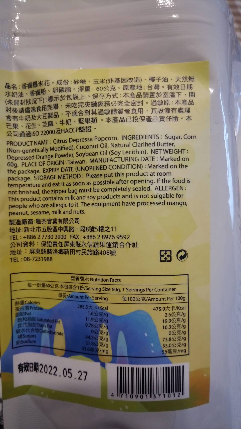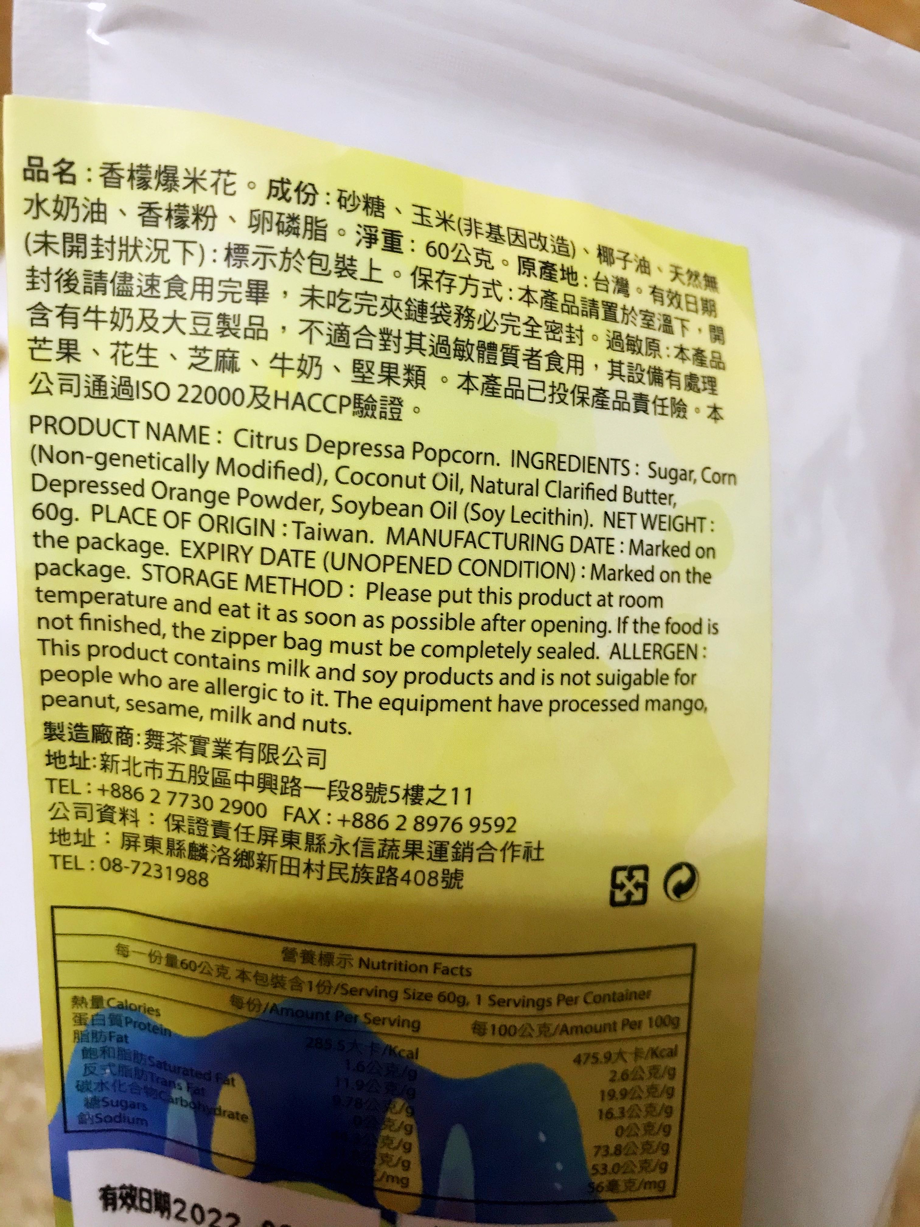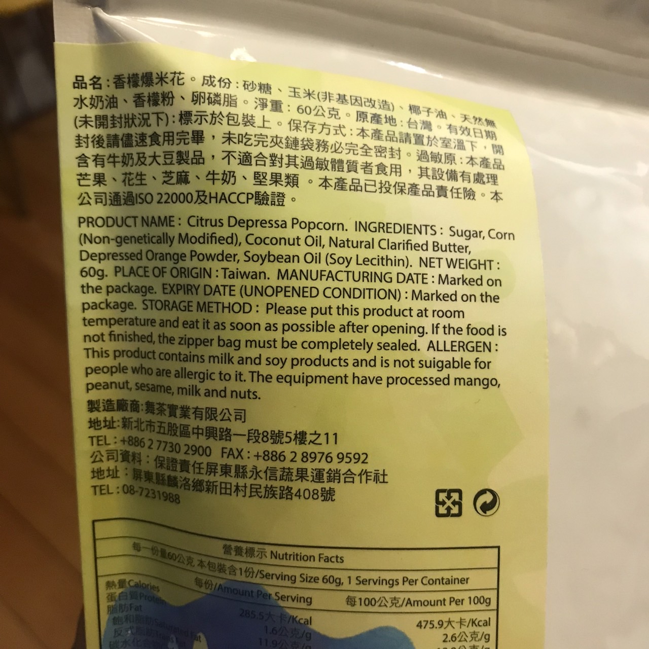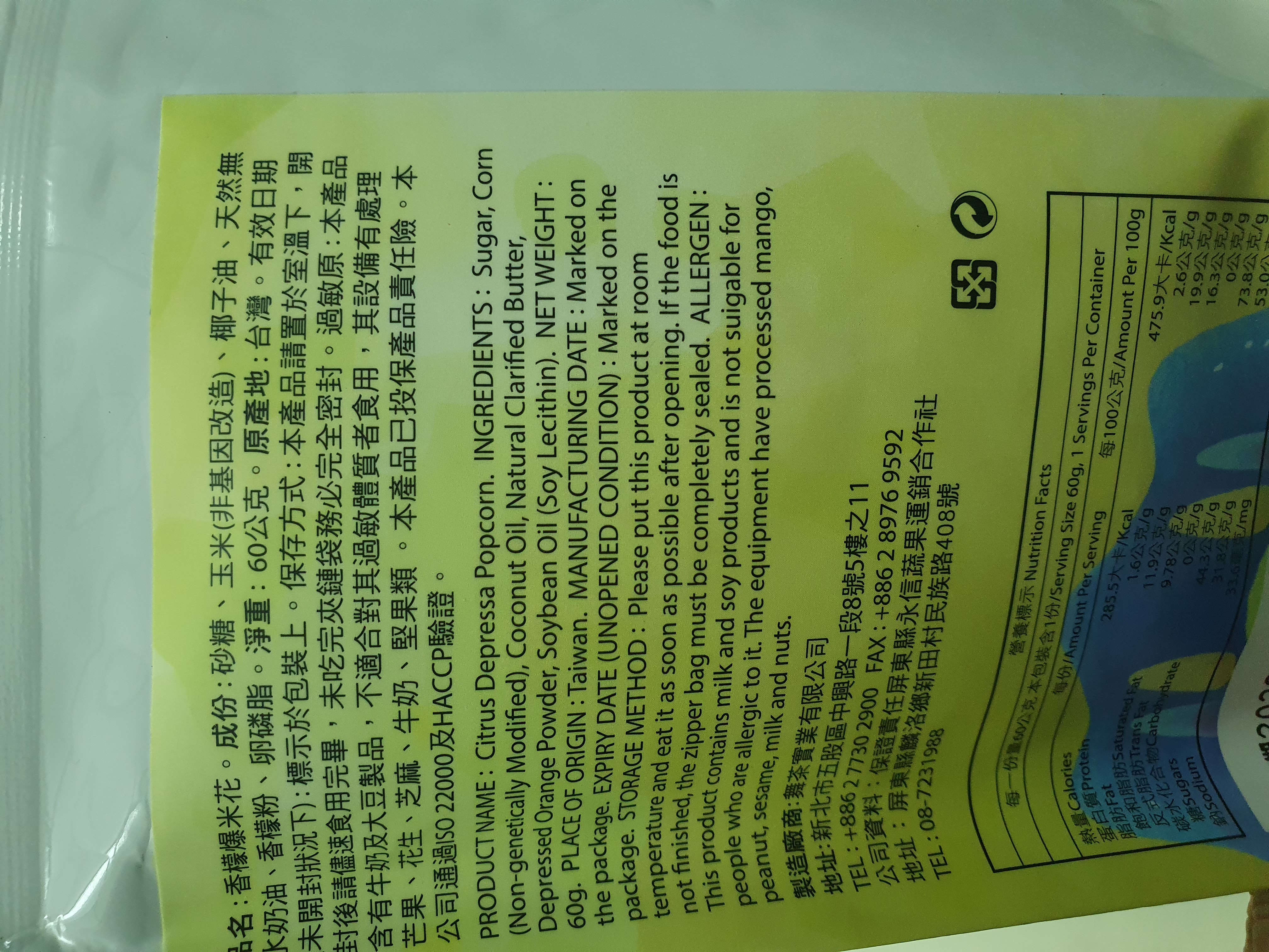 回列表 厝邊ㄟ果記 香檬爆米花 感受台灣原生香檬的酸甜與芬芳 市價120元 所需等級 一般會員以上 所需學分 40 體驗份數 50 關注人數 1806 申請人數 297 申請截止 品牌業者:保證責任屏東縣永信蔬果運銷合作社 負責廠商 保證責任屏東縣永信蔬果運銷合作社 負責廠商地址 屏東縣麟洛香新田村民族路408號 製造廠商 舞茶實業有限公司 產地 台灣 試用產品規格 60g /包 工廠登記字號 53696247 心得分享 商品介紹 商品成分 使用方法 注意事項 體驗名單 8.0 厝邊ㄟ果記 香檬爆米花 包裝美學 7.6 香檬芬芳 8.3 酸甜滋味 8.2 口感酥脆 8.4 建議推薦 7.9 心得分享 49則 Wesley Wei 金食達人 56歲 臺中市 2021/10/27 對厝邊ㄟ果記 香檬爆米花留下評價 8 包裝應是樣品包,印刷稍嫌陽春,設計也不太吸引人,成份標示字太小,但夾鍊袋設計就加分,方便單次食用不完可以保存!入口味道令人驚豔,酸甜中帶著些微檸檬的苦澀味,味道很天然且和真實檸檬很像,酸甜適中!口感很酥脆,吃起來像剛出爐的爆米花般爽口,且無油耗味及油腻感,整個很清爽的口感,令人想一口接一口,可惜試用包容量不大,很快就吃完了,欲罷不能! 吳庭瑤 金食達人 40歲 新竹市 2021/10/27 對厝邊ㄟ果記 香檬爆米花留下評價 9 香檬的味道很像金桔跟檸檬的綜合,酸度不會到非常酸,但是香氣很濃郁。香檬爆米花一打開是爆米花的香氣、咬下一口馬上就能感受到香檬的酸甜及香氣,爆米花爆的很漂亮完整,不會有沒爆好,而且香檬醬是包覆滿滿的在爆米花上,沒有只沾到一點點,這個工很細。爆米花酥脆度很足、再加上香檬酸甜香氣,很適合配上冰涼飲品一同當點心吃。而且和一般爆米花口味真的差別很不同,這種酸甜香氣會讓人不由的唾液分泌,想要一直吃如果喜愛偏酸甜或嘗試新口味的朋友,很推薦試試這款香檬爆米花。 陳正智 鑽石達人 63歲 新北市 2021/10/25 對厝邊ㄟ果記 香檬爆米花留下評價 9 厝邊ㄟ果記 香檬爆米花 感受台灣原生香檬的酸甜與芬芳臺灣香檬又叫扁實檸檬,是臺灣原生種的柑橘! 香氣獨特、清爽宜人…酸甜香檬和酥脆爆米花混搭,譜出療癒美好滋味。■試吃實測◆打開包裝袋,飄散出淡淡香檸香氣◆每顆爆米花都圓圓胖胖,形狀如蘑菇◆入口酸酸甜甜,能感受到香檬的酸甜芬芳!◆吃起來酸甜不甜膩,尾韻帶有淡淡的香檬香氣◆口感香脆爽口,喀滋喀滋的酥脆感,不會黏牙!好吃 ◆成份天然,無添加香料,爆米花吃完不會猛灌飲料,用手拿取爆米花也不會黏手~超棒!◆不管是一顆顆享用,還是整把入口,酸甜味道交織、爽口,吃起來唰嘴過癮◆口味皆完整包覆每顆爆米花,自然健康酸甜好滋味■推薦理由大解密■來自屏東淨土的果實~~支持臺灣農業■支持台灣在地原生種、香檬以有機農法種植,無任何化學農藥~讚 ! 讚 !■純正自然的原生滋味■玉米(非基因改造)製做■通過驗證~讓人吃得安心■不含防腐劑、無添加香料■夾鏈袋設計~方便保存與便利香檬果皮,含有川陳皮素、橘皮素、類黃酮等機能成分~讓吃零食變得更健康酸甜適中不甜膩, 讓你一口一口停不下來~超唰嘴的零食! jon 鑽石達人 42歲 新北市 2021/10/24 對厝邊ㄟ果記 香檬爆米花留下評價 8 第一眼外觀上不太起眼應該是屬於通用型夾鏈袋再貼上店家商品的圖案與說明比起一般為特定商品所做的包裝少了一點感覺而且可能為了省成本貼紙也比包裝帶小造成留白部位過多降低美感一開封淡淡的檸檬香氣傳出內裝很實在應該有九分滿外觀上焦糖色爆米花燈光下微微的反光很漂亮入口後甜味與檸檬香氣就跑出來然後微酸味才跟上酸酸甜甜很好吃口感上爆米花的酥脆也有保留下來吃完後柑橘類的香氣與微酸有點回甘也讓身體自動生津總結雖然外觀上不是很突出但味道口感上很實在 官怡汝 金食達人 26歲 臺中市 2021/10/20 對厝邊ㄟ果記 香檬爆米花留下評價 9 一開始聞到味道的時候覺得沒有很期待,但實際吃下口時,滿滿的檸檬香氣充斥整個口腔,咬下去依舊保持爆米花應有的酥脆口感,外層均勻的用檸檬醬包裹著,還帶有檸檬皮特有的苦味,酸酸甜甜的味道,容易讓人一口接著一口,整體的甜味跟酸味平衡的很好,不會覺得有一方特別突出,但建議檸檬的苦味可以再降低一點,因為吃到後面苦的味道會殘留在嘴巴較長的時間,可能是比較適合大人的口味。 謝宛芸 金食達人 42歲 新北市 2021/10/20 對厝邊ㄟ果記 香檬爆米花留下評價 7 因為本身喜歡偏酸的食物,因此很感謝有這次的體驗機會!包裝是夾鏈袋,可以供多次食用,在便利上有加分剛打開來有聞到淡淡的檸檬香,吃第一顆時不是自己預期中的檸檬酸味,比較像是檸檬夾心酥的味道口感是酥脆的,不會過硬;形狀比較像是星球爆米花般的球形可惜吃了幾顆後口中會有淡淡的苦味,推測可能是爆米花的油或是檸檬皮的苦味整體來說口味是獨特的,名稱上也有新意,是在農業展示市場中會想要買來嘗鮮的商品 林廷耀 金食達人 31歲 基隆市 2021/10/20 對厝邊ㄟ果記 香檬爆米花留下評價 8 香檬爆米花,帶有檸檬香氣,口味清香酸甜,能促進食慾,一口接一口,小小一包爆米花一下就吃光了!成分有別於市售大部分餅乾,只有簡單6種成分:玉米、糖、奶油、椰子油、卵磷脂及香檬粉,而香檬粉正是這爆米花的靈魂,帶來獨特風味,是平常不會吃到的味道! 鍾晴安 金食達人 31歲 高雄市 2021/10/20 對厝邊ㄟ果記 香檬爆米花留下評價 8 超喜歡收