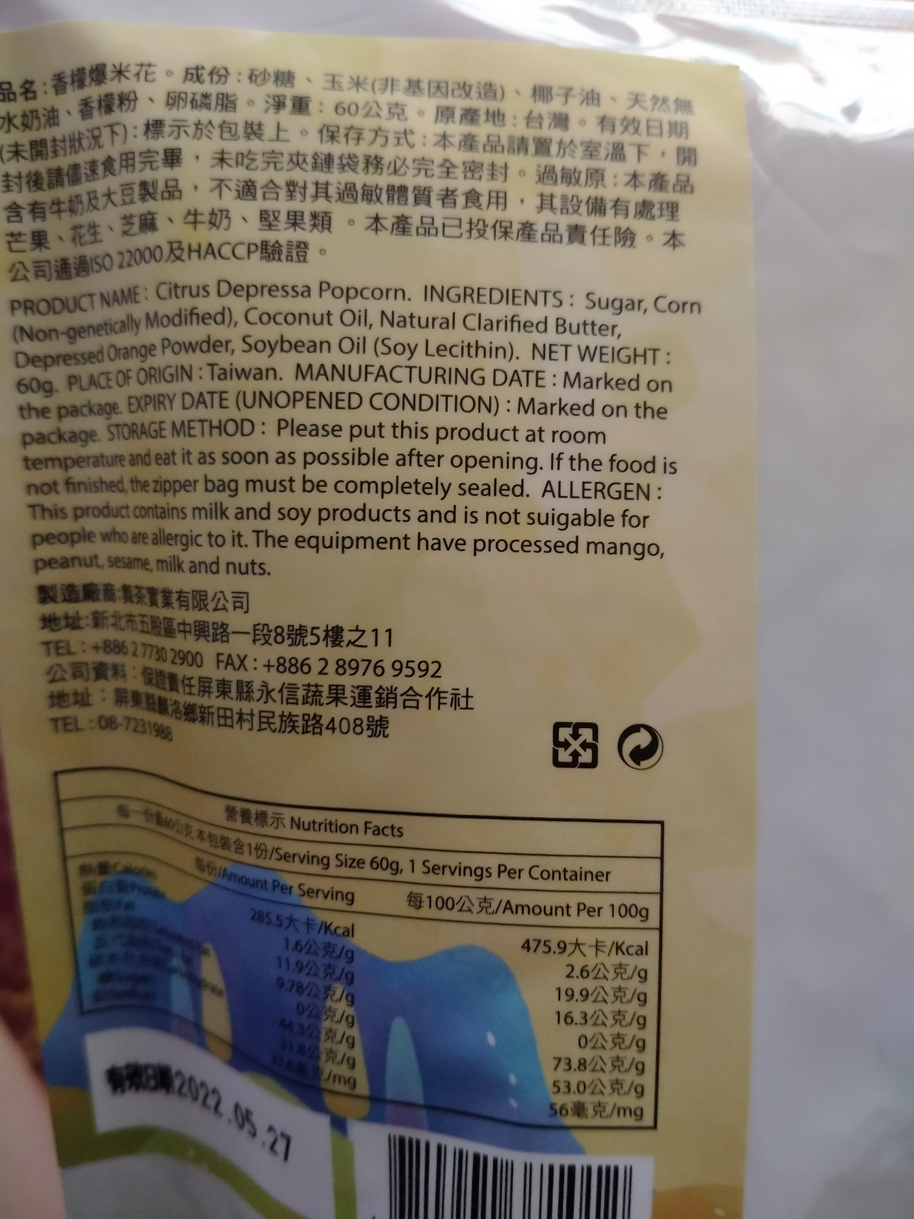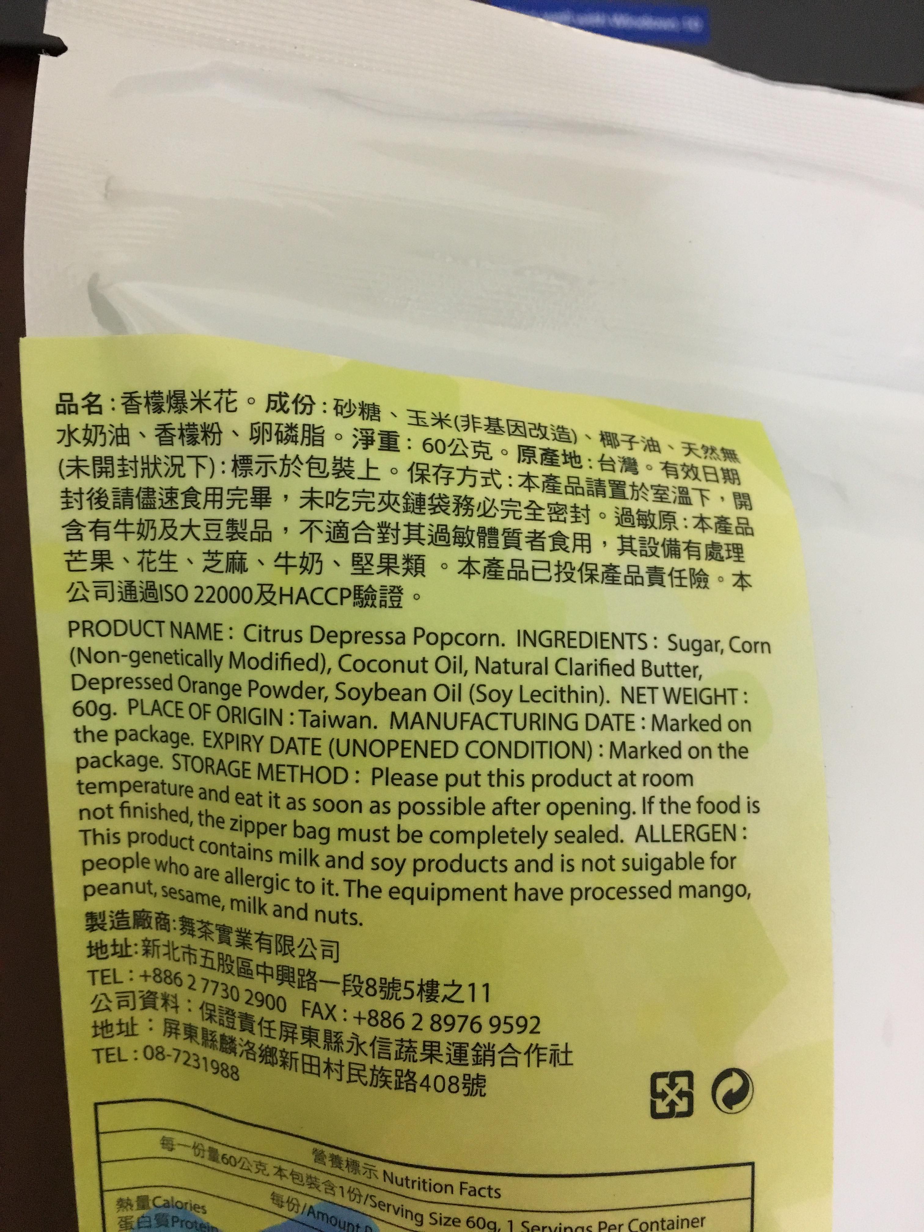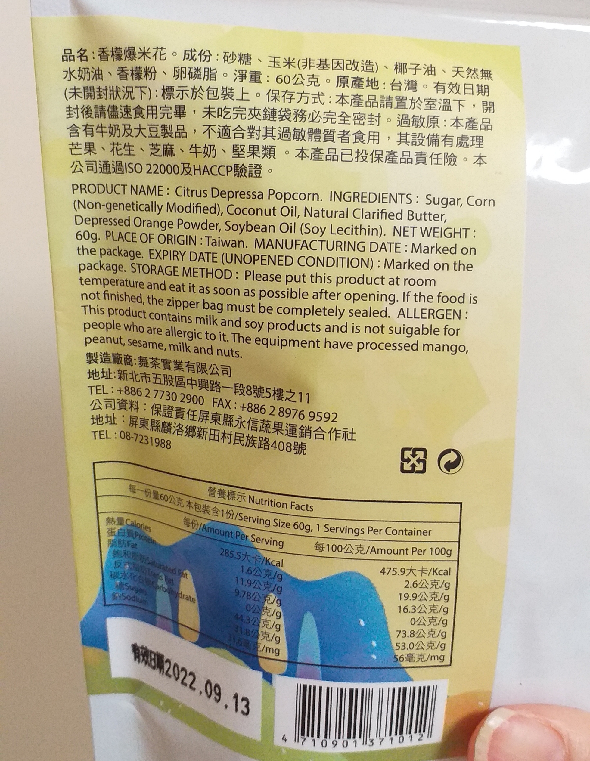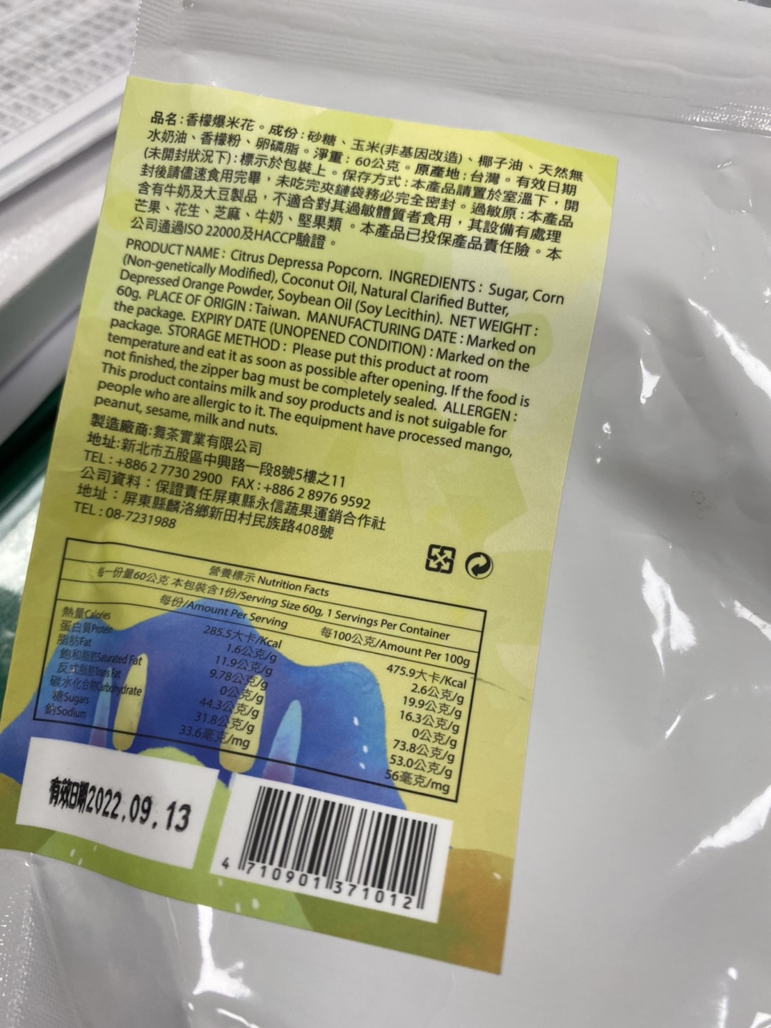 回列表 厝邊ㄟ果記 香檬爆米花 感受台灣原生香檬的酸甜與芬芳 市價120元 所需等級 一般會員以上 所需學分 40 體驗份數 50 關注人數 1806 申請人數 297 申請截止 品牌業者:保證責任屏東縣永信蔬果運銷合作社 負責廠商 保證責任屏東縣永信蔬果運銷合作社 負責廠商地址 屏東縣麟洛香新田村民族路408號 製造廠商 舞茶實業有限公司 產地 台灣 試用產品規格 60g /包 工廠登記字號 53696247 心得分享 商品介紹 商品成分 使用方法 注意事項 體驗名單 8.0 厝邊ㄟ果記 香檬爆米花 包裝美學 7.6 香檬芬芳 8.3 酸甜滋味 8.2 口感酥脆 8.4 建議推薦 7.9 心得分享 49則 Wesley Wei 金食達人 56歲 臺中市 2021/10/27 對厝邊ㄟ果記 香檬爆米花留下評價 8 包裝應是樣品包,印刷稍嫌陽春,設計也不太吸引人,成份標示字太小,但夾鍊袋設計就加分,方便單次食用不完可以保存!入口味道令人驚豔,酸甜中帶著些微檸檬的苦澀味,味道很天然且和真實檸檬很像,酸甜適中!口感很酥脆,吃起來像剛出爐的爆米花般爽口,且無油耗味及油腻感,整個很清爽的口感,令人想一口接一口,可惜試用包容量不大,很快就吃完了,欲罷不能! 吳庭瑤 金食達人 40歲 新竹市 2021/10/27 對厝邊ㄟ果記 香檬爆米花留下評價 9 香檬的味道很像金桔跟檸檬的綜合,酸度不會到非常酸,但是香氣很濃郁。香檬爆米花一打開是爆米花的香氣、咬下一口馬上就能感受到香檬的酸甜及香氣,爆米花爆的很漂亮完整,不會有沒爆好,而且香檬醬是包覆滿滿的在爆米花上,沒有只沾到一點點,這個工很細。爆米花酥脆度很足、再加上香檬酸甜香氣,很適合配上冰涼飲品一同當點心吃。而且和一般爆米花口味真的差別很不同,這種酸甜香氣會讓人不由的唾液分泌,想要一直吃如果喜愛偏酸甜或嘗試新口味的朋友,很推薦試試這款香檬爆米花。 陳正智 鑽石達人 63歲 新北市 2021/10/25 對厝邊ㄟ果記 香檬爆米花留下評價 9 厝邊ㄟ果記 香檬爆米花 感受台灣原生香檬的酸甜與芬芳臺灣香檬又叫扁實檸檬,是臺灣原生種的柑橘! 香氣獨特、清爽宜人…酸甜香檬和酥脆爆米花混搭,譜出療癒美好滋味。■試吃實測◆打開包裝袋,飄散出淡淡香檸香氣◆每顆爆米花都圓圓胖胖,形狀如蘑菇◆入口酸酸甜甜,能感受到香檬的酸甜芬芳!◆吃起來酸甜不甜膩,尾韻帶有淡淡的香檬香氣◆口感香脆爽口,喀滋喀滋的酥脆感,不會黏牙!好吃 ◆成份天然,無添加香料,爆米花吃完不會猛灌飲料,用手拿取爆米花也不會黏手~超棒!◆不管是一顆顆享用,還是整把入口,酸甜味道交織、爽口,吃起來唰嘴過癮◆口味皆完整包覆每顆爆米花,自然健康酸甜好滋味■推薦理由大解密■來自屏東淨土的果實~~支持臺灣農業■支持台灣在地原生種、香檬以有機農法種植,無任何化學農藥~讚 ! 讚 !■純正自然的原生滋味■玉米(非基因改造)製做■通過驗證~讓人吃得安心■不含防腐劑、無添加香料■夾鏈袋設計~方便保存與便利香檬果皮,含有川陳皮素、橘皮素、類黃酮等機能成分~讓吃零食變得更健康酸甜適中不甜膩, 讓你一口一口停不下來~超唰嘴的零食! jon 鑽石達人 42歲 新北市 2021/10/24 對厝邊ㄟ果記 香檬爆米花留下評價 8 第一眼外觀上不太起眼應該是屬於通用型夾鏈袋再貼上店家商品的圖案與說明比起一般為特定商品所做的包裝少了一點感覺而且可能為了省成本貼紙也比包裝帶小造成留白部位過多降低美感一開封淡淡的檸檬香氣傳出內裝很實在應該有九分滿外觀上焦糖色爆米花燈光下微微的反光很漂亮入口後甜味與檸檬香氣就跑出來然後微酸味才跟上酸酸甜甜很好吃口感上爆米花的酥脆也有保留下來吃完後柑橘類的香氣與微酸有點回甘也讓身體自動生津總結雖然外觀上不是很突出但味道口感上很實在 官怡汝 金食達人 26歲 臺中市 2021/10/20 對厝邊ㄟ果記 香檬爆米花留下評價 9 一開始聞到味道的時候覺得沒有很期待,但實際吃下口時,滿滿的檸檬香氣充斥整個口腔,咬下去依舊保持爆米花應有的酥脆口感,外層均勻的用檸檬醬包裹著,還帶有檸檬皮特有的苦味,酸酸甜甜的味道,容易讓人一口接著一口,整體的甜味跟酸味平衡的很好,不會覺得有一方特別突出,但建議檸檬的苦味可以再降低一點,因為吃到後面苦的味道會殘留在嘴巴較長的時間,可能是比較適合大人的口味。 謝宛芸 金食達人 42歲 新北市 2021/10/20 對厝邊ㄟ果記 香檬爆米花留下評價 7 因為本身喜歡偏酸的食物,因此很感謝有這次的體驗機會!包裝是夾鏈袋,可以供多次食用,在便利上有加分剛打開來有聞到淡淡的檸檬香,吃第一顆時不是自己預期中的檸檬酸味,比較像是檸檬夾心酥的味道口感是酥脆的,不會過硬;形狀比較像是星球爆米花般的球形可惜吃了幾顆後口中會有淡淡的苦味,推測可能是爆米花的油或是檸檬皮的苦味整體來說口味是獨特的,名稱上也有新意,是在農業展示市場中會想要買來嘗鮮的商品 林廷耀 金食達人 31歲 基隆市 2021/10/20 對厝邊ㄟ果記 香檬爆米花留下評價 8 香檬爆米花,帶有檸檬香氣,口味清香酸甜,能促進食慾,一口接一口,小小一包爆米花一下就吃光了!成分有別於市售大部分餅乾,只有簡單6種成分:玉米、糖、奶油、椰子油、卵磷脂及香檬粉,而香檬粉正是這爆米花的靈魂,帶來獨特風味,是平常不會吃到的味道! 鍾晴安 金食達人 31歲 高雄市 2021/10/20 對厝邊ㄟ果記 香檬爆米花留下評價 8 超喜歡收