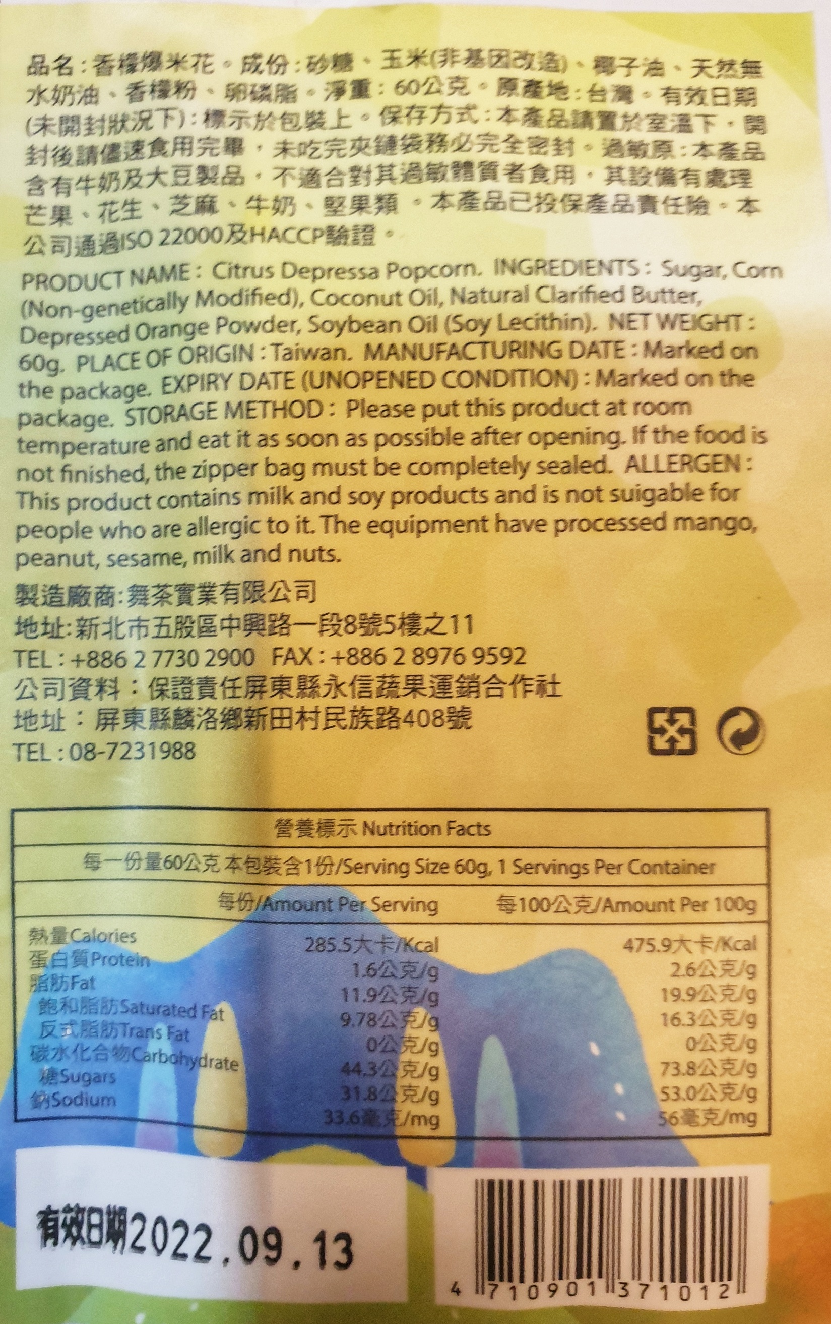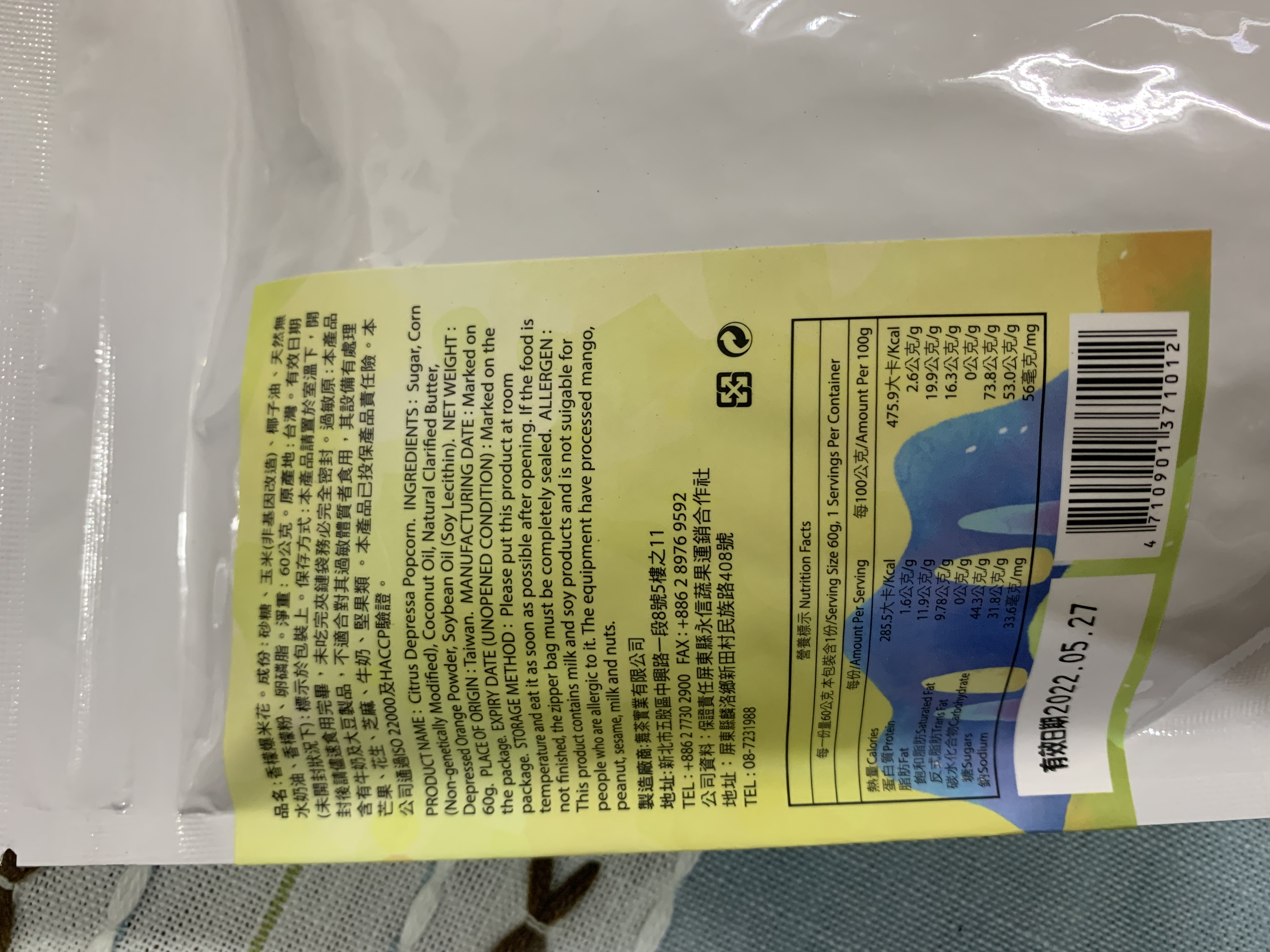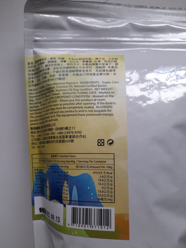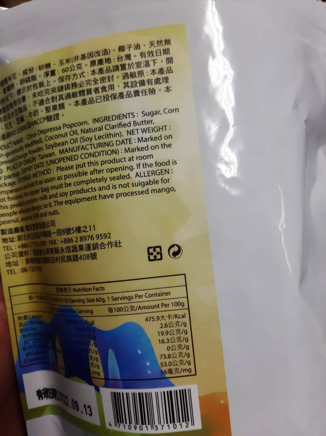 回列表 厝邊ㄟ果記 香檬爆米花 感受台灣原生香檬的酸甜與芬芳 市價120元 所需等級 一般會員以上 所需學分 40 體驗份數 50 關注人數 1806 申請人數 297 申請截止 品牌業者:保證責任屏東縣永信蔬果運銷合作社 負責廠商 保證責任屏東縣永信蔬果運銷合作社 負責廠商地址 屏東縣麟洛香新田村民族路408號 製造廠商 舞茶實業有限公司 產地 台灣 試用產品規格 60g /包 工廠登記字號 53696247 心得分享 商品介紹 商品成分 使用方法 注意事項 體驗名單 8.0 厝邊ㄟ果記 香檬爆米花 包裝美學 7.6 香檬芬芳 8.3 酸甜滋味 8.2 口感酥脆 8.4 建議推薦 7.9 心得分享 49則 Wesley Wei 金食達人 56歲 臺中市 2021/10/27 對厝邊ㄟ果記 香檬爆米花留下評價 8 包裝應是樣品包,印刷稍嫌陽春,設計也不太吸引人,成份標示字太小,但夾鍊袋設計就加分,方便單次食用不完可以保存!入口味道令人驚豔,酸甜中帶著些微檸檬的苦澀味,味道很天然且和真實檸檬很像,酸甜適中!口感很酥脆,吃起來像剛出爐的爆米花般爽口,且無油耗味及油腻感,整個很清爽的口感,令人想一口接一口,可惜試用包容量不大,很快就吃完了,欲罷不能! 吳庭瑤 金食達人 40歲 新竹市 2021/10/27 對厝邊ㄟ果記 香檬爆米花留下評價 9 香檬的味道很像金桔跟檸檬的綜合,酸度不會到非常酸,但是香氣很濃郁。香檬爆米花一打開是爆米花的香氣、咬下一口馬上就能感受到香檬的酸甜及香氣,爆米花爆的很漂亮完整,不會有沒爆好,而且香檬醬是包覆滿滿的在爆米花上,沒有只沾到一點點,這個工很細。爆米花酥脆度很足、再加上香檬酸甜香氣,很適合配上冰涼飲品一同當點心吃。而且和一般爆米花口味真的差別很不同,這種酸甜香氣會讓人不由的唾液分泌,想要一直吃如果喜愛偏酸甜或嘗試新口味的朋友,很推薦試試這款香檬爆米花。 陳正智 鑽石達人 63歲 新北市 2021/10/25 對厝邊ㄟ果記 香檬爆米花留下評價 9 厝邊ㄟ果記 香檬爆米花 感受台灣原生香檬的酸甜與芬芳臺灣香檬又叫扁實檸檬,是臺灣原生種的柑橘! 香氣獨特、清爽宜人…酸甜香檬和酥脆爆米花混搭,譜出療癒美好滋味。■試吃實測◆打開包裝袋,飄散出淡淡香檸香氣◆每顆爆米花都圓圓胖胖,形狀如蘑菇◆入口酸酸甜甜,能感受到香檬的酸甜芬芳!◆吃起來酸甜不甜膩,尾韻帶有淡淡的香檬香氣◆口感香脆爽口,喀滋喀滋的酥脆感,不會黏牙!好吃 ◆成份天然,無添加香料,爆米花吃完不會猛灌飲料,用手拿取爆米花也不會黏手~超棒!◆不管是一顆顆享用,還是整把入口,酸甜味道交織、爽口,吃起來唰嘴過癮◆口味皆完整包覆每顆爆米花,自然健康酸甜好滋味■推薦理由大解密■來自屏東淨土的果實~~支持臺灣農業■支持台灣在地原生種、香檬以有機農法種植,無任何化學農藥~讚 ! 讚 !■純正自然的原生滋味■玉米(非基因改造)製做■通過驗證~讓人吃得安心■不含防腐劑、無添加香料■夾鏈袋設計~方便保存與便利香檬果皮,含有川陳皮素、橘皮素、類黃酮等機能成分~讓吃零食變得更健康酸甜適中不甜膩, 讓你一口一口停不下來~超唰嘴的零食! jon 鑽石達人 42歲 新北市 2021/10/24 對厝邊ㄟ果記 香檬爆米花留下評價 8 第一眼外觀上不太起眼應該是屬於通用型夾鏈袋再貼上店家商品的圖案與說明比起一般為特定商品所做的包裝少了一點感覺而且可能為了省成本貼紙也比包裝帶小造成留白部位過多降低美感一開封淡淡的檸檬香氣傳出內裝很實在應該有九分滿外觀上焦糖色爆米花燈光下微微的反光很漂亮入口後甜味與檸檬香氣就跑出來然後微酸味才跟上酸酸甜甜很好吃口感上爆米花的酥脆也有保留下來吃完後柑橘類的香氣與微酸有點回甘也讓身體自動生津總結雖然外觀上不是很突出但味道口感上很實在 官怡汝 金食達人 26歲 臺中市 2021/10/20 對厝邊ㄟ果記 香檬爆米花留下評價 9 一開始聞到味道的時候覺得沒有很期待,但實際吃下口時,滿滿的檸檬香氣充斥整個口腔,咬下去依舊保持爆米花應有的酥脆口感,外層均勻的用檸檬醬包裹著,還帶有檸檬皮特有的苦味,酸酸甜甜的味道,容易讓人一口接著一口,整體的甜味跟酸味平衡的很好,不會覺得有一方特別突出,但建議檸檬的苦味可以再降低一點,因為吃到後面苦的味道會殘留在嘴巴較長的時間,可能是比較適合大人的口味。 謝宛芸 金食達人 42歲 新北市 2021/10/20 對厝邊ㄟ果記 香檬爆米花留下評價 7 因為本身喜歡偏酸的食物,因此很感謝有這次的體驗機會!包裝是夾鏈袋,可以供多次食用,在便利上有加分剛打開來有聞到淡淡的檸檬香,吃第一顆時不是自己預期中的檸檬酸味,比較像是檸檬夾心酥的味道口感是酥脆的,不會過硬;形狀比較像是星球爆米花般的球形可惜吃了幾顆後口中會有淡淡的苦味,推測可能是爆米花的油或是檸檬皮的苦味整體來說口味是獨特的,名稱上也有新意,是在農業展示市場中會想要買來嘗鮮的商品 林廷耀 金食達人 31歲 基隆市 2021/10/20 對厝邊ㄟ果記 香檬爆米花留下評價 8 香檬爆米花,帶有檸檬香氣,口味清香酸甜,能促進食慾,一口接一口,小小一包爆米花一下就吃光了!成分有別於市售大部分餅乾,只有簡單6種成分:玉米、糖、奶油、椰子油、卵磷脂及香檬粉,而香檬粉正是這爆米花的靈魂,帶來獨特風味,是平常不會吃到的味道! 鍾晴安 金食達人 31歲 高雄市 2021/10/20 對厝邊ㄟ果記 香檬爆米花留下評價 8 超喜歡收