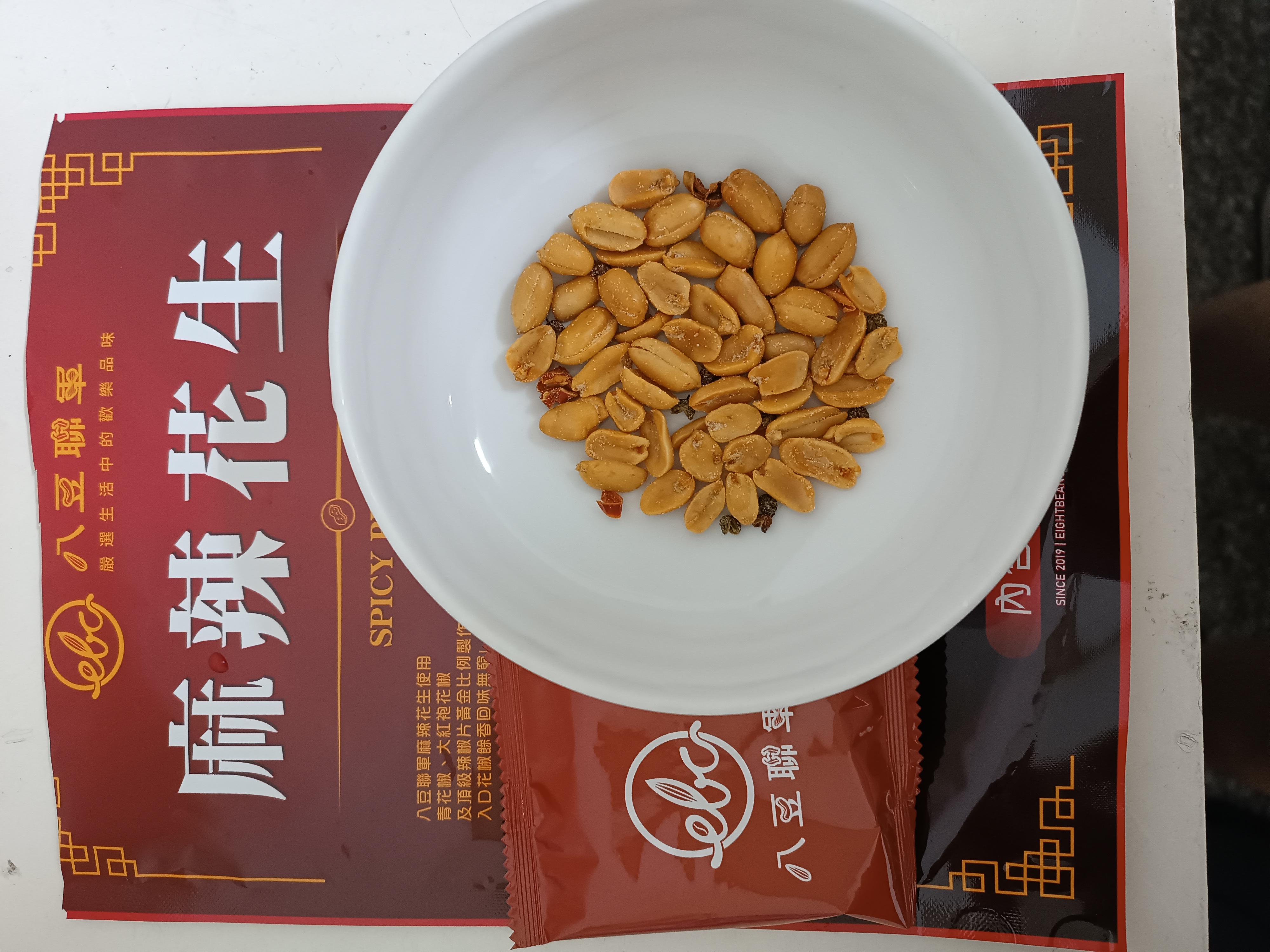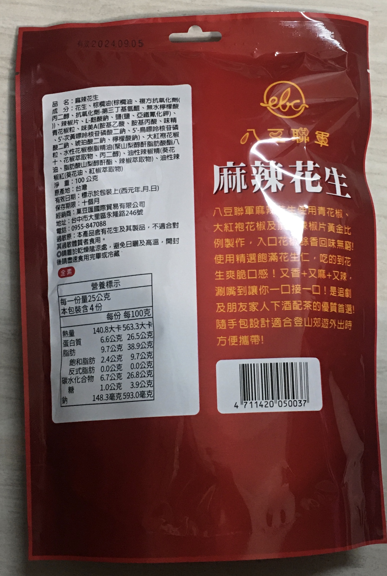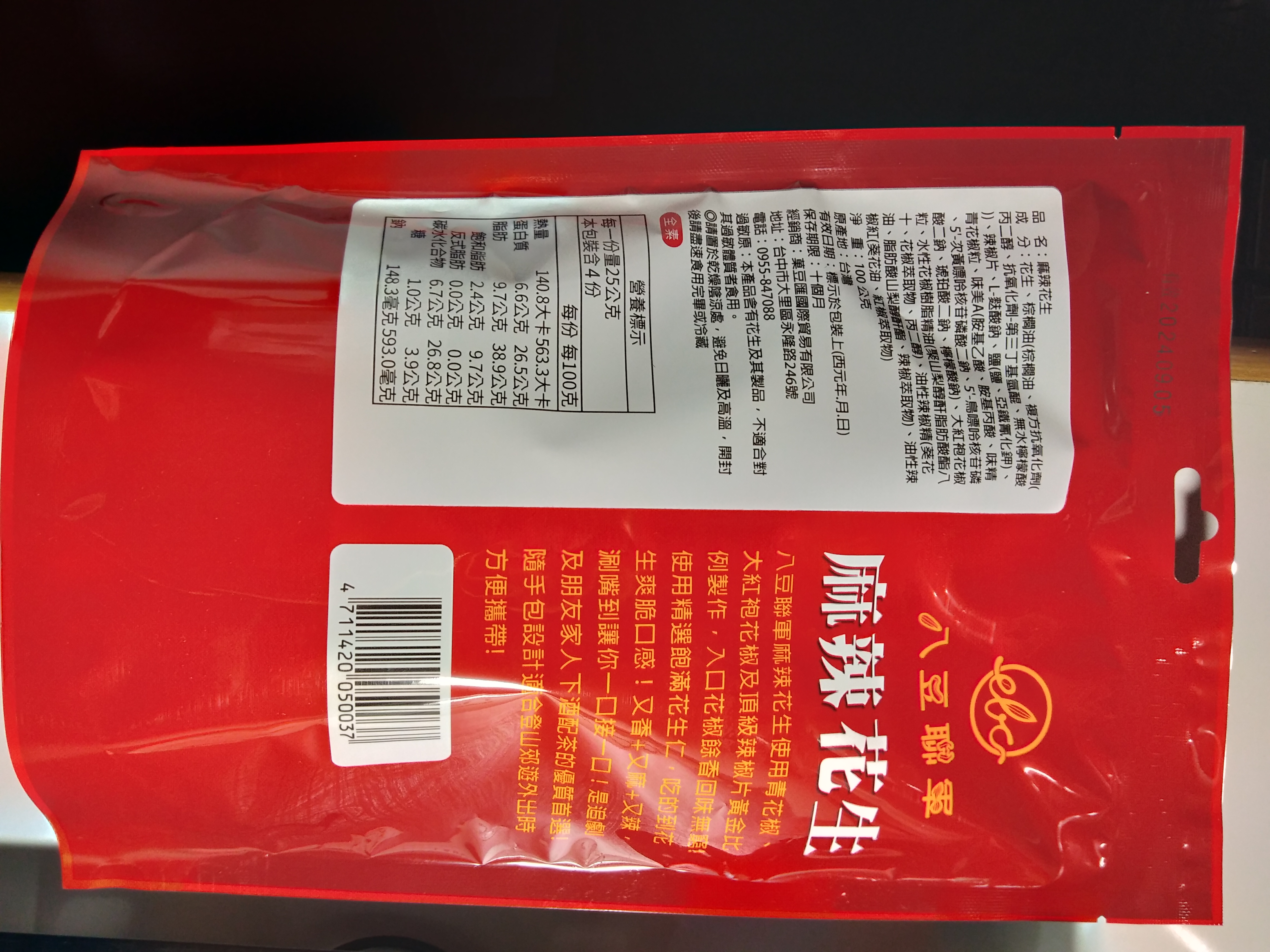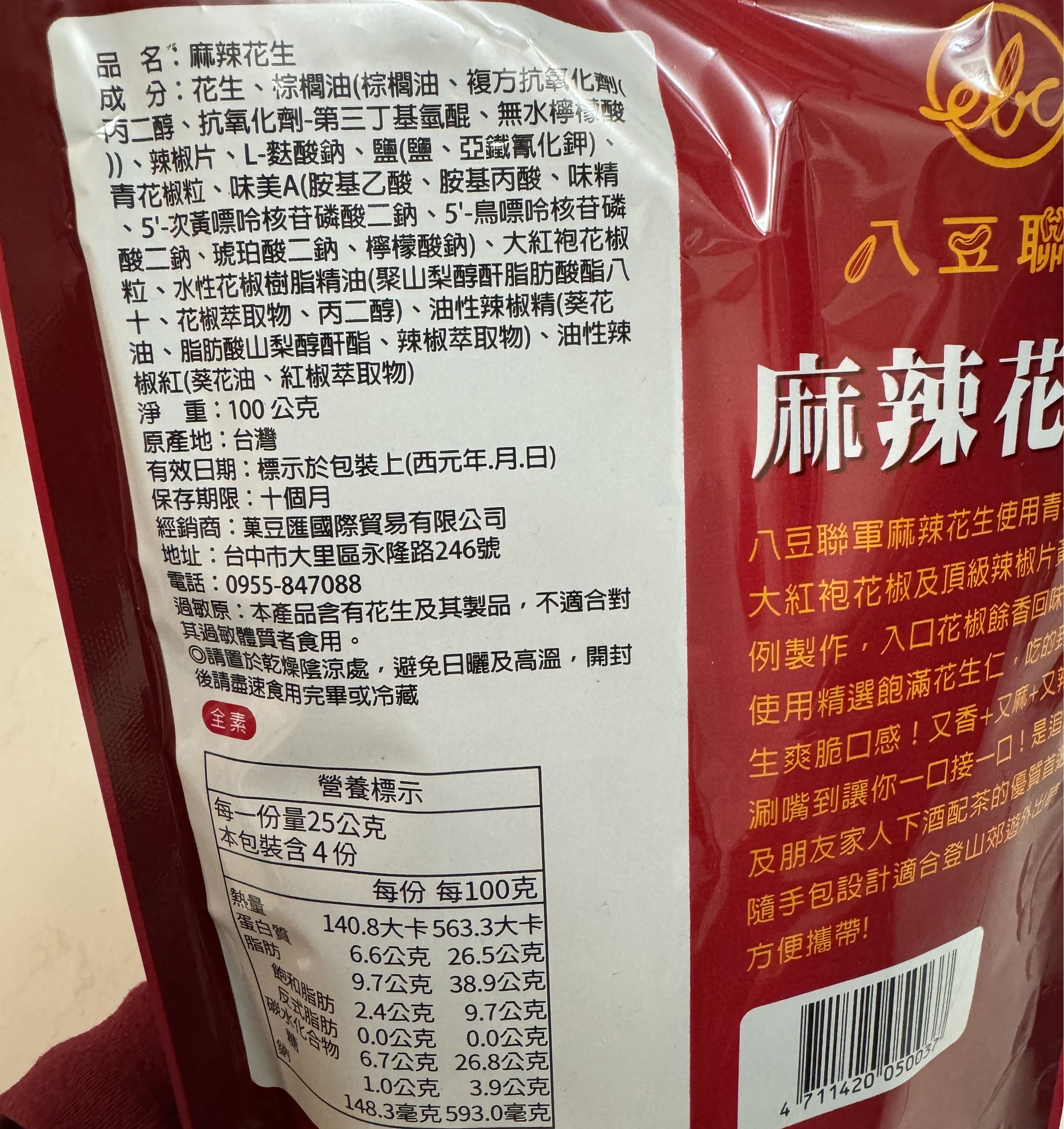 花生、棕櫚油(棕櫚油、複方抗氧化劑(丙二醇、抗氧化劑-第三丁基氫、無水檸檬酸))、辣椒片、L-麩酸鈉、鹽(鹽、亞鐵氫化鉀)、青花椒粒、味美A(胺基乙酸、胺基丙酸、味精、5’-次黃嘌呤核苷磷酸二鈉、5’-鳥嘌呤核苷磷酸二鈉、琥珀酸二鈉、檸檬酸鈉)、大紅袍花椒粒、水性花椒樹脂精油(聚山梨醇酐脂酸脂八十、花椒萃取物、丙二醇)、油性辣椒精(葵花油、脂肪酸山梨醇酐脂、辣椒萃取物)、油性辣椒紅(葵花油、紅椒萃取物)
