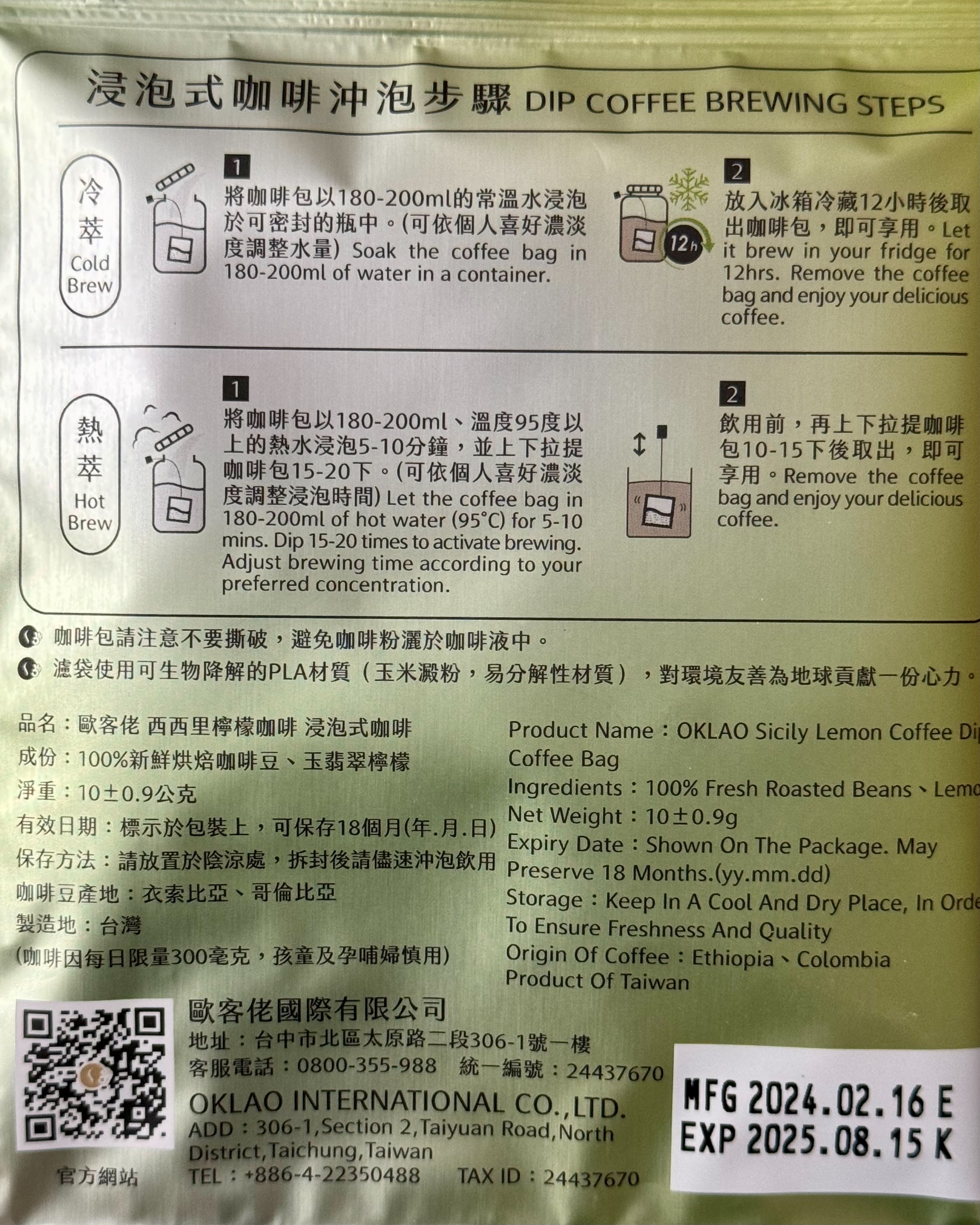 沖泡-將咖啡包以180-200ml、溫度95度以上的熱水,浸泡10-15分中,並上下拉提咖啡包10-15下。