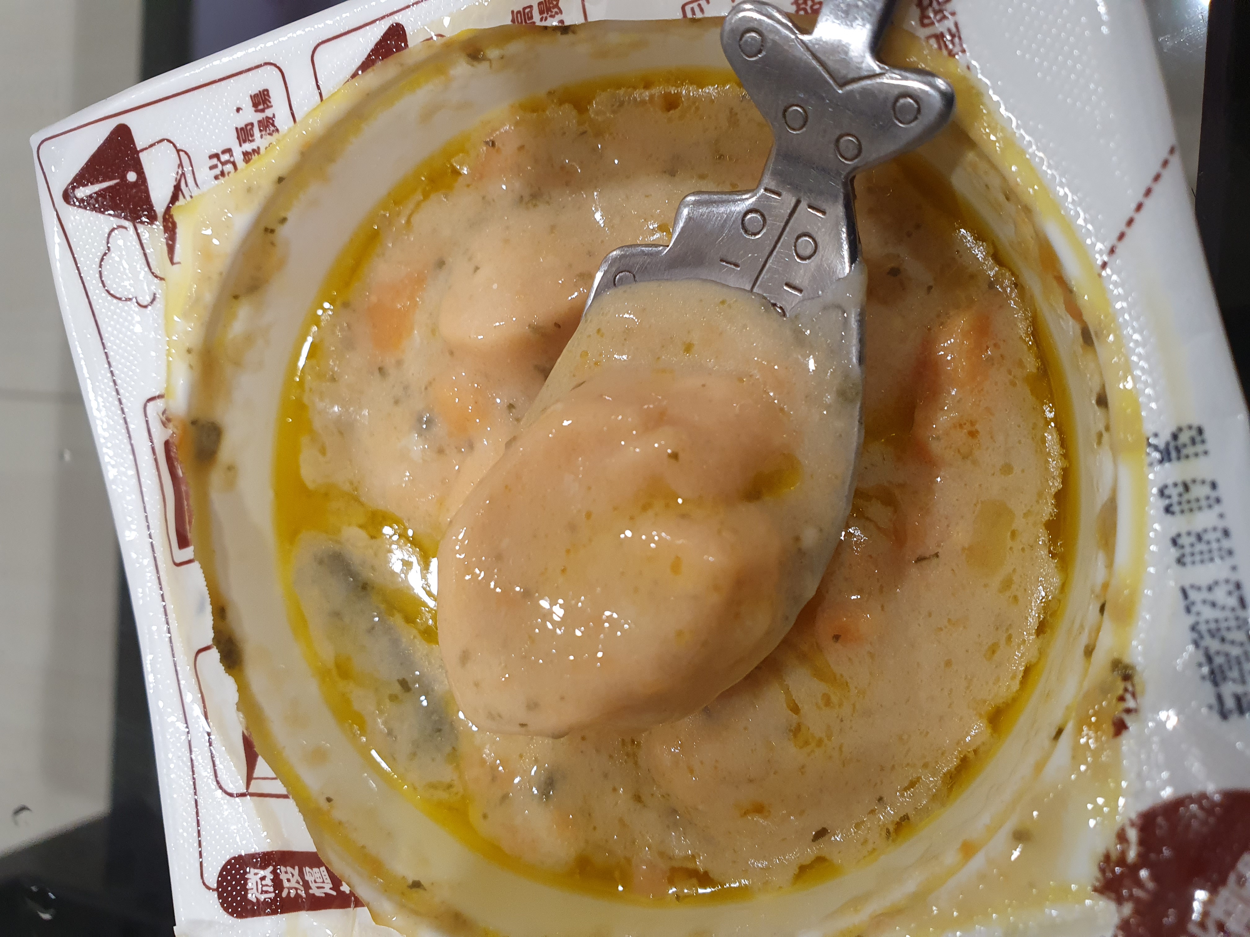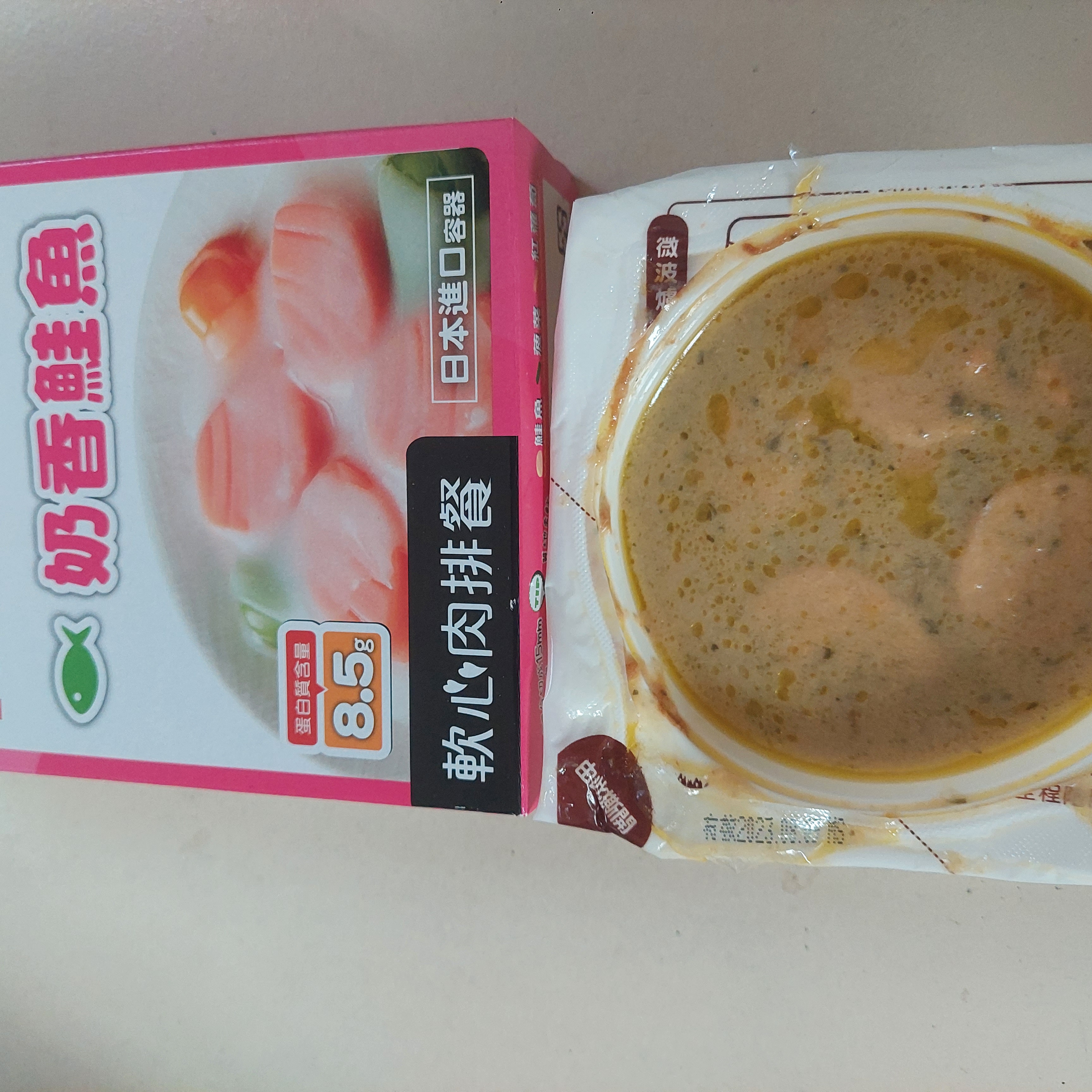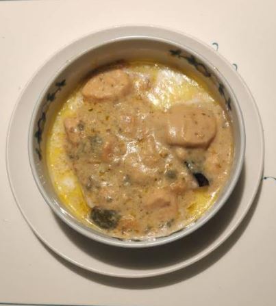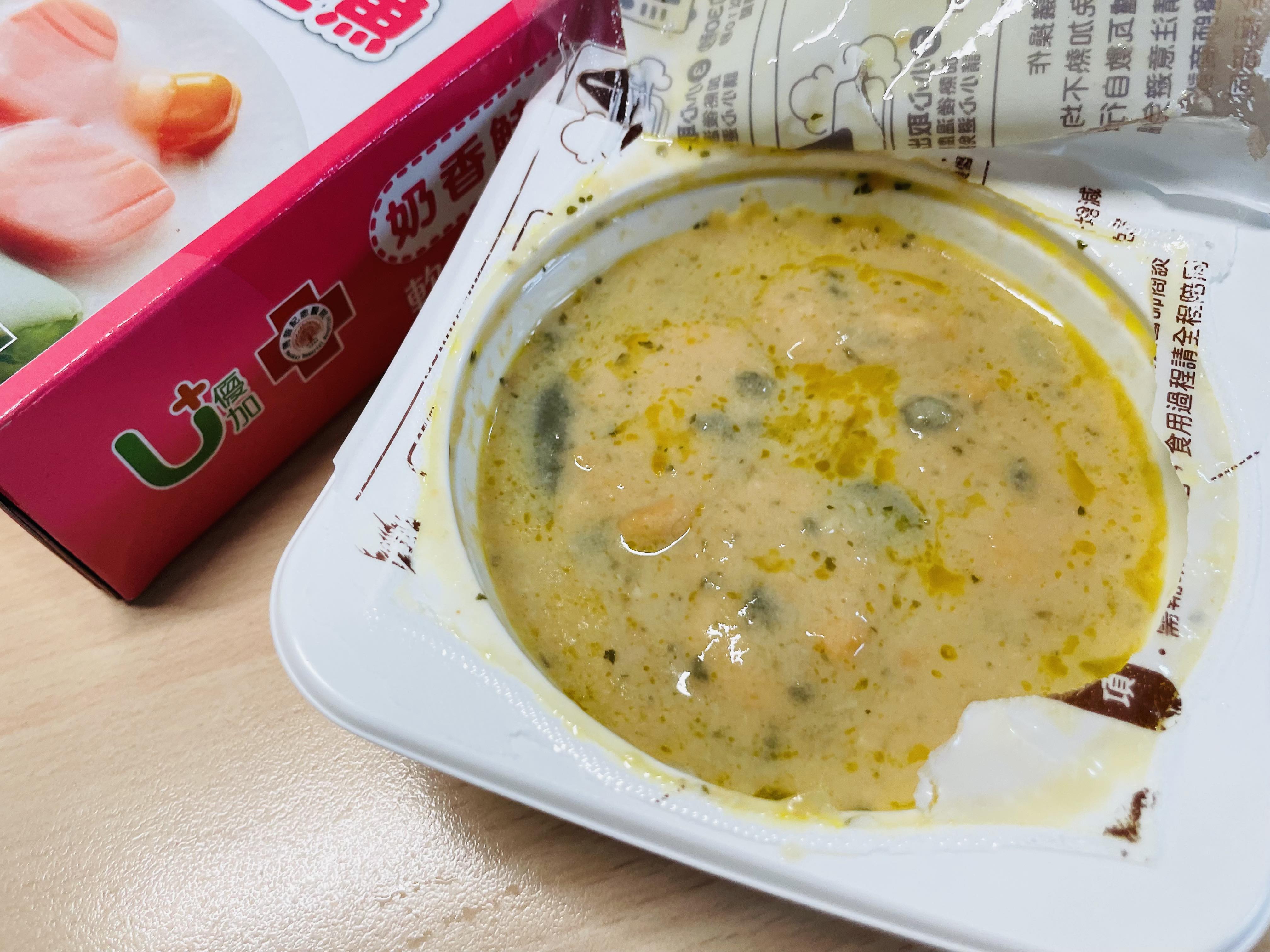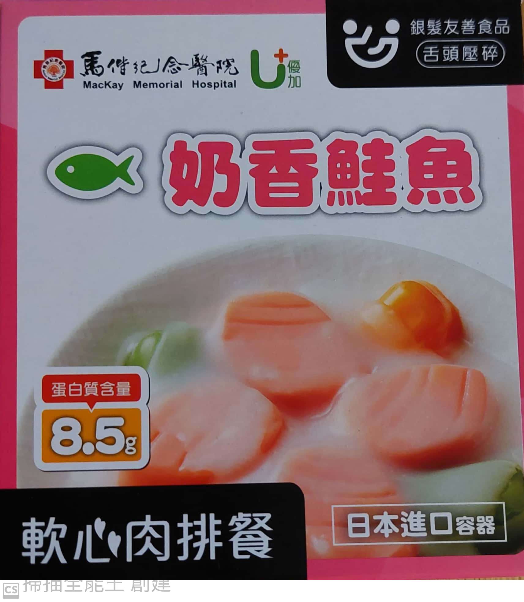 水、蛋白、鮭魚、動物性鮮奶油、大豆沙拉油、玉米來源可溶性纖維、菠菜、乙醯化己二酸二澱粉、洋蔥、有鹽奶油(殺菌乳脂、鹽)、小麥粉、砂糖、乳酪(牛奶、鹽、乳酸菌、凝乳酶、玉米澱粉、礦物油)、乳清分離蛋白、紅蘿蔔、蒜、食鹽、大豆蛋白、風味調味料(食鹽、砂糖、柴魚粉、L-麩酸鈉、5'-次黃嘌呤核苷磷酸二鈉、5'-鳥嘌呤核苷磷酸二鈉、琥珀酸二鈉)、玉米糖膠、乾酪粉(牛乳、培養菌種、氯化鈣、鹽、凝乳酵素、馬鈴薯澱粉)、柴魚粉調味料[糊精、(鰹、鯖、鯷節類)柴魚萃取物、食鹽]、L-麩酸鈉、香蒜粉(麥芽糊精、蒜粉、二氧化矽、大蒜香料)、刺槐豆膠、胡蘿蔔香料、乳酸鈣、紅麴色素(酒精、紅麴色素)、油性辣椒紅(芥花油、紅椒色素)、胺基乙酸、洋蔥粉、DL-胺基丙酸、蔬菜調味粉(食鹽、蔗糖、麥芽糊精、小麥水解蛋白、酵母抽出物、高麗菜抽出物、棕櫚油)、梔子花色素(黃梔子色素、梔子藍色素、糊精)、二氧化鈦、洋香菜葉、調味劑(5'-鳥嘌呤核苷磷酸二鈉、5'-次黃嘌呤核苷磷酸二鈉)、蒟蒻粉、鹿角菜膠、β-胡蘿蔔素[辛烯基丁二酸鈉澱粉、葵花油、砂糖、抗氧化劑(L-抗壞血酸、L-抗壞血酸鈉、維生素E)、二氧化矽]、奶油香料、魚香料 。