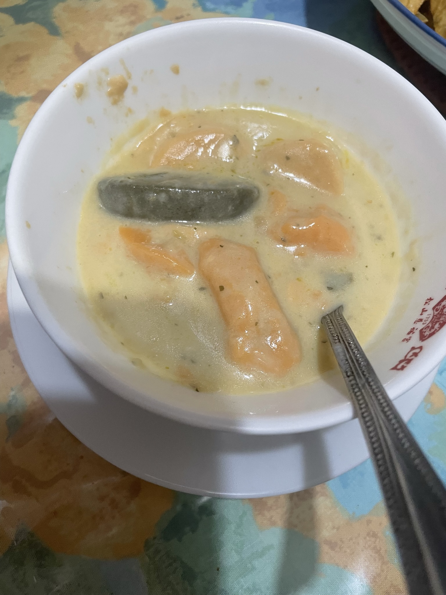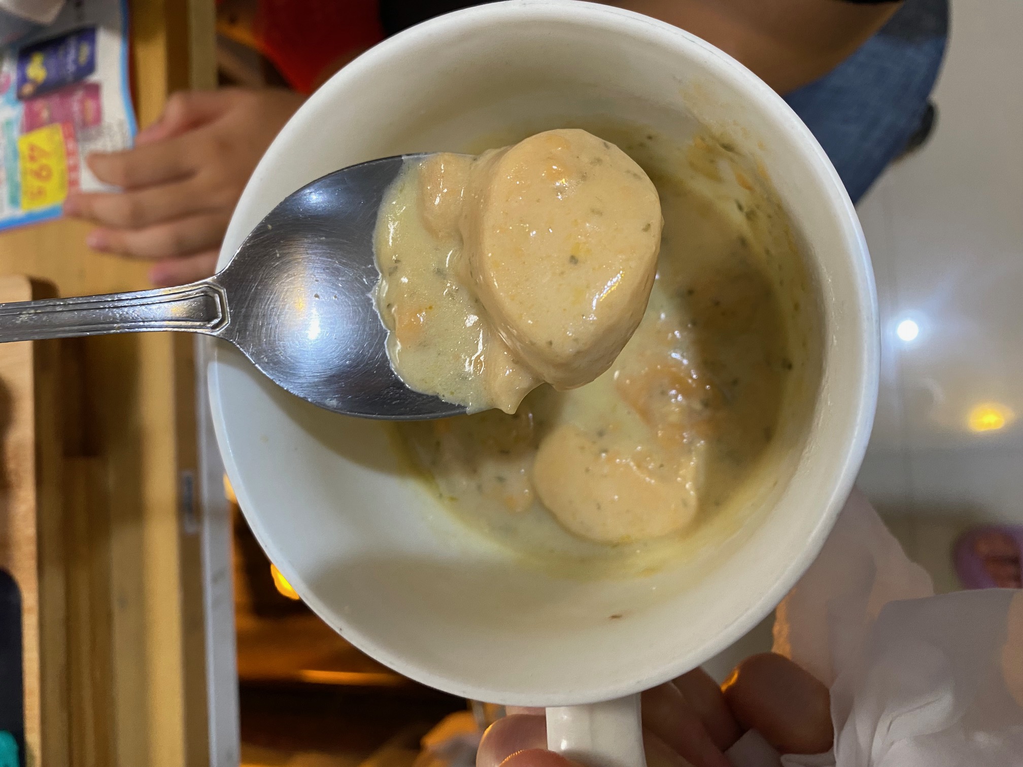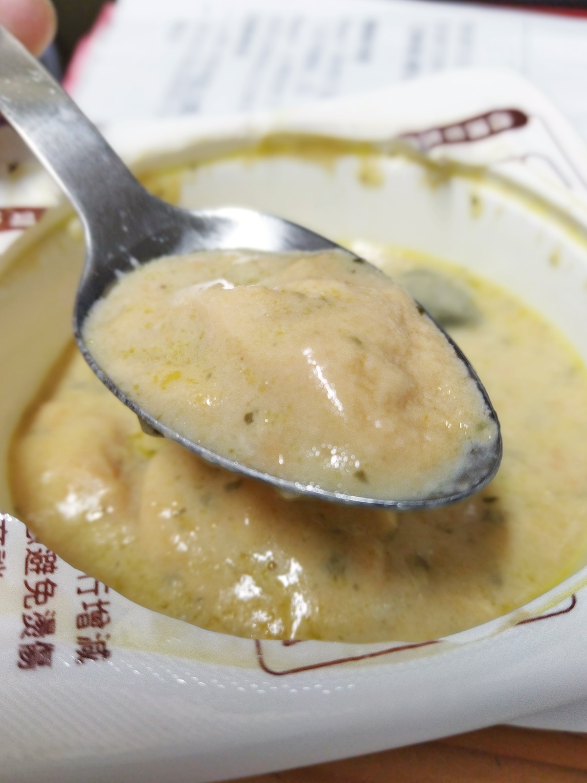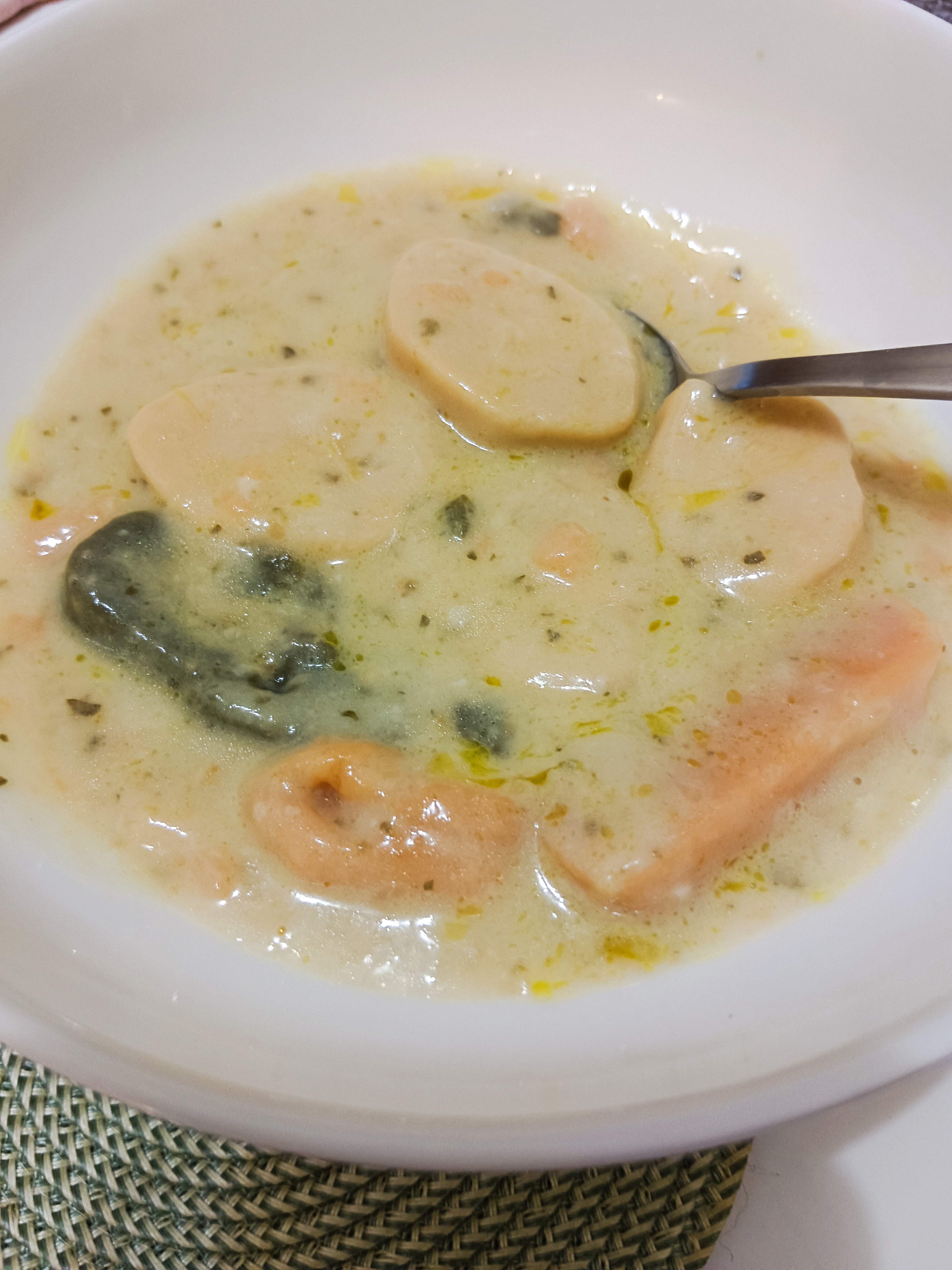 水、蛋白、鮭魚、動物性鮮奶油、大豆沙拉油、玉米來源可溶性纖維、菠菜、乙醯化己二酸二澱粉、洋蔥、有鹽奶油(殺菌乳脂、鹽)、小麥粉、砂糖、乳酪(牛奶、鹽、乳酸菌、凝乳酶、玉米澱粉、礦物油)、乳清分離蛋白、紅蘿蔔、蒜、食鹽、大豆蛋白、風味調味料(食鹽、砂糖、柴魚粉、L-麩酸鈉、5'-次黃嘌呤核苷磷酸二鈉、5'-鳥嘌呤核苷磷酸二鈉、琥珀酸二鈉)、玉米糖膠、乾酪粉(牛乳、培養菌種、氯化鈣、鹽、凝乳酵素、馬鈴薯澱粉)、柴魚粉調味料[糊精、(鰹、鯖、鯷節類)柴魚萃取物、食鹽]、L-麩酸鈉、香蒜粉(麥芽糊精、蒜粉、二氧化矽、大蒜香料)、刺槐豆膠、胡蘿蔔香料、乳酸鈣、紅麴色素(酒精、紅麴色素)、油性辣椒紅(芥花油、紅椒色素)、胺基乙酸、洋蔥粉、DL-胺基丙酸、蔬菜調味粉(食鹽、蔗糖、麥芽糊精、小麥水解蛋白、酵母抽出物、高麗菜抽出物、棕櫚油)、梔子花色素(黃梔子色素、梔子藍色素、糊精)、二氧化鈦、洋香菜葉、調味劑(5'-鳥嘌呤核苷磷酸二鈉、5'-次黃嘌呤核苷磷酸二鈉)、蒟蒻粉、鹿角菜膠、β-胡蘿蔔素[辛烯基丁二酸鈉澱粉、葵花油、砂糖、抗氧化劑(L-抗壞血酸、L-抗壞血酸鈉、維生素E)、二氧化矽]、奶油香料、魚香料 。