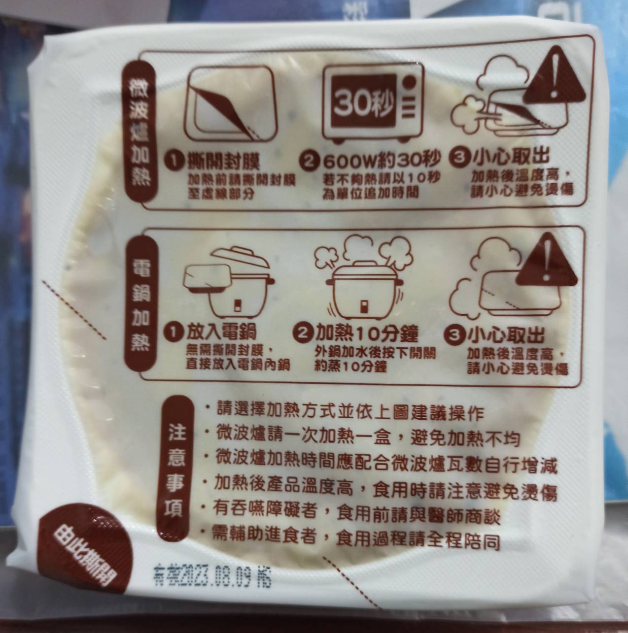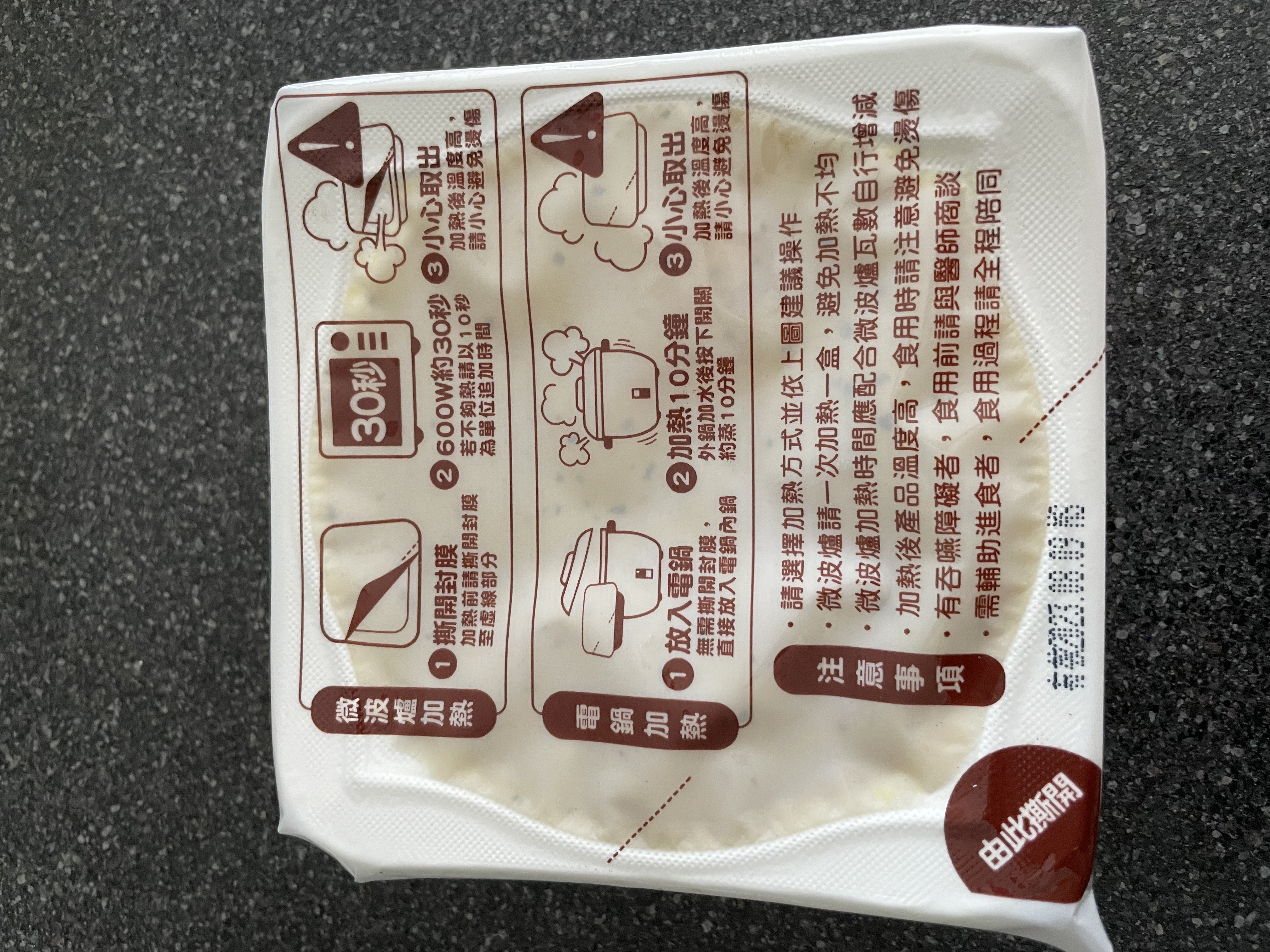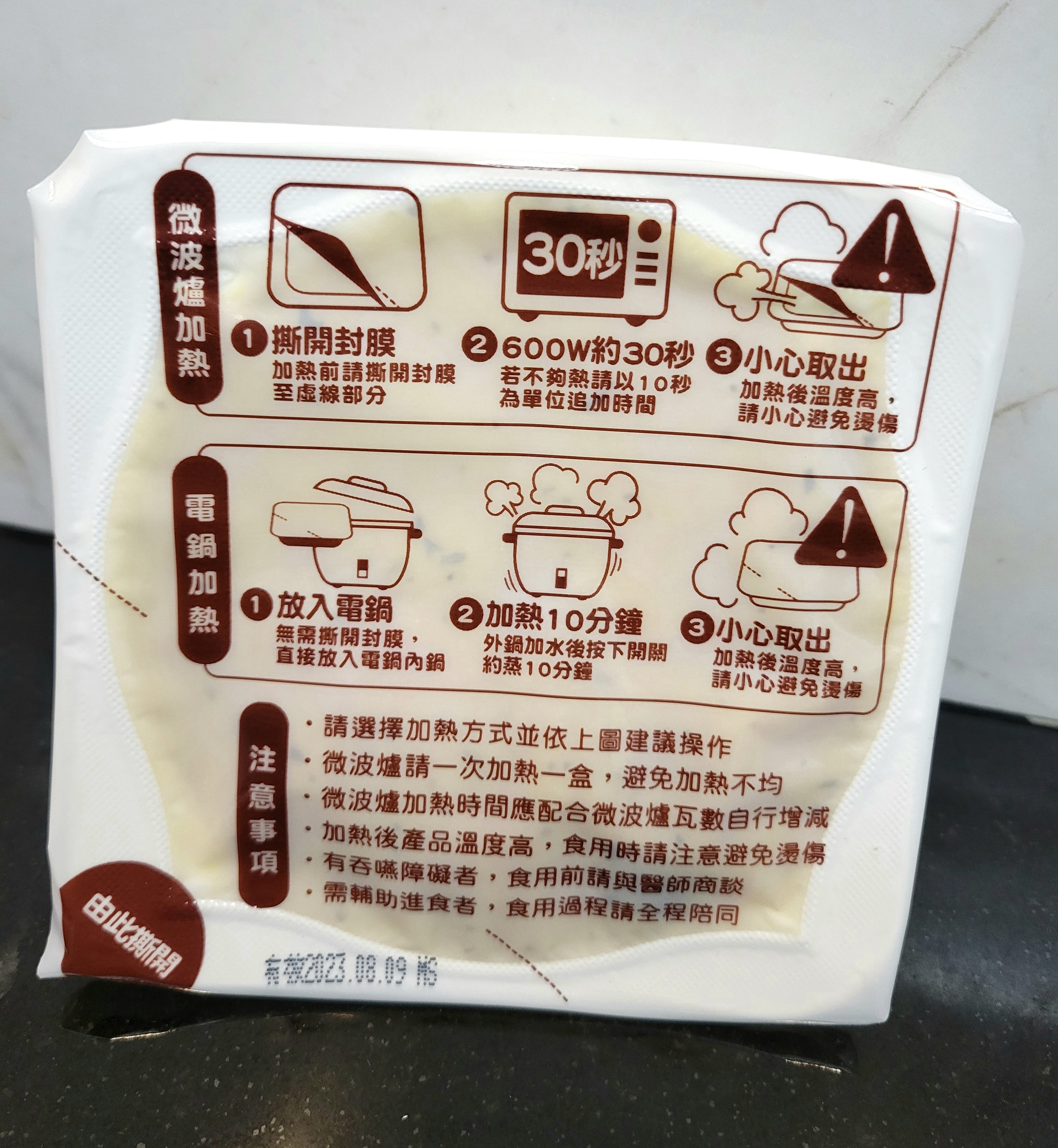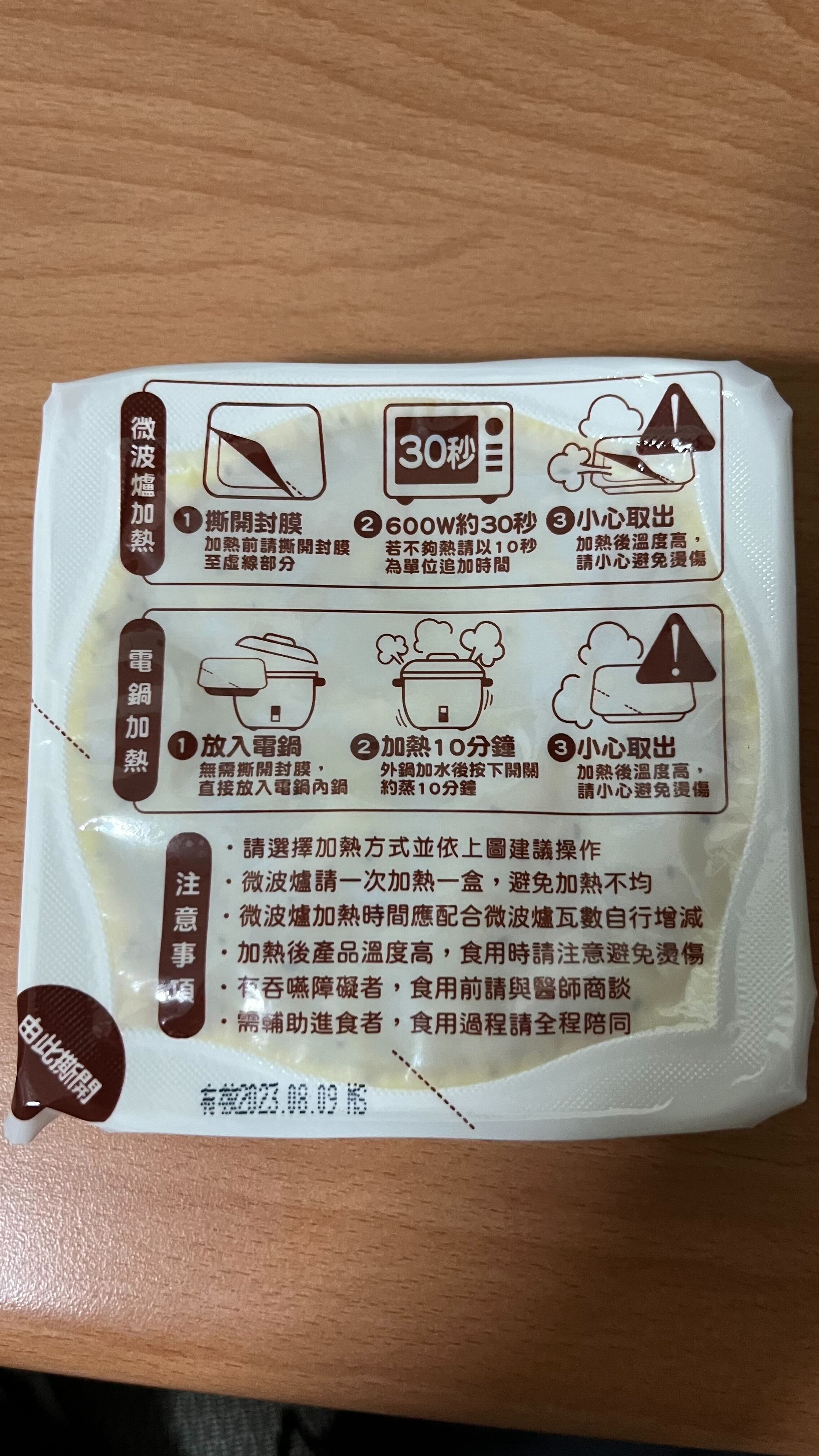 ‧微波爐【30秒】600W約30秒,封膜需撕開一小角,若不夠熱請以10秒為單位追加時間