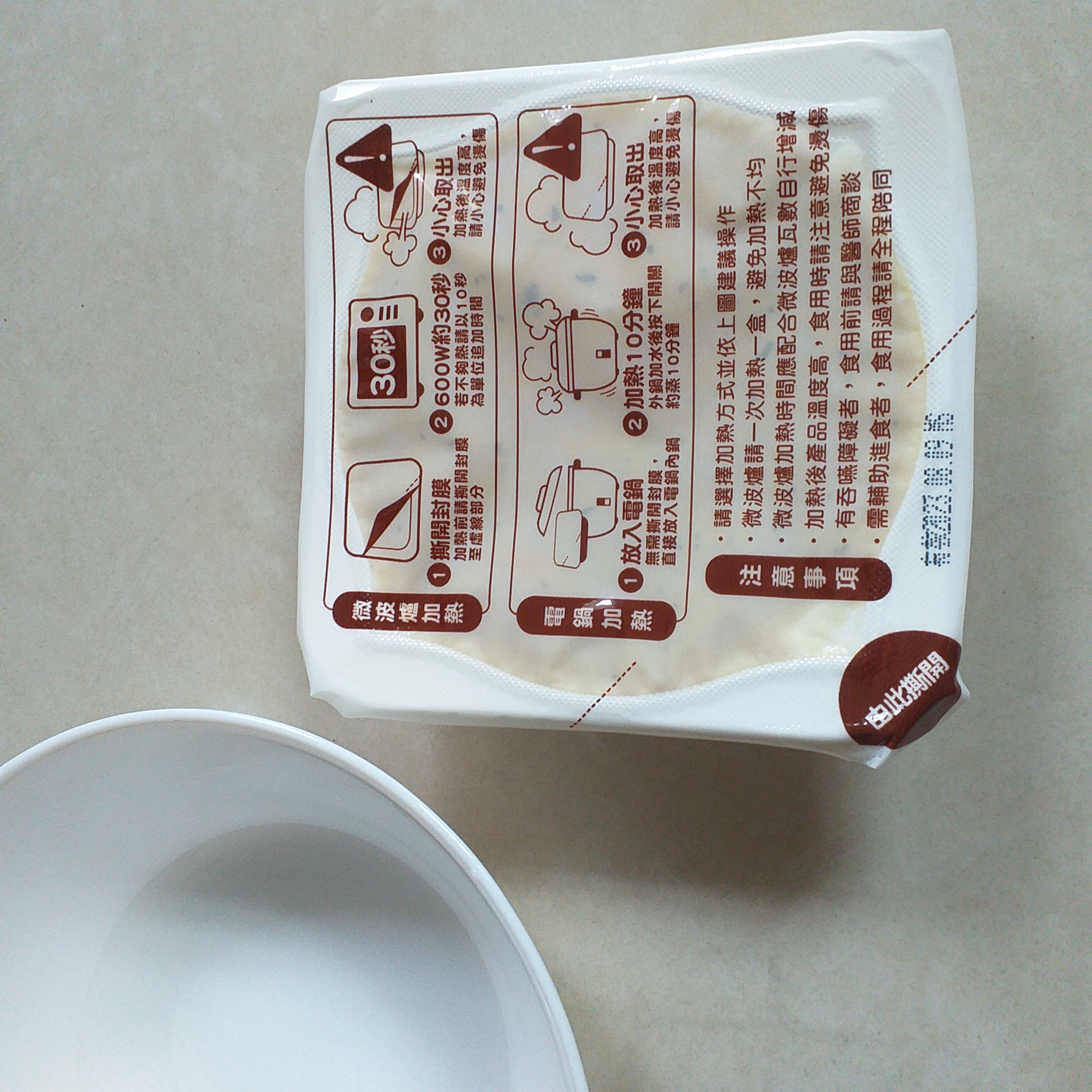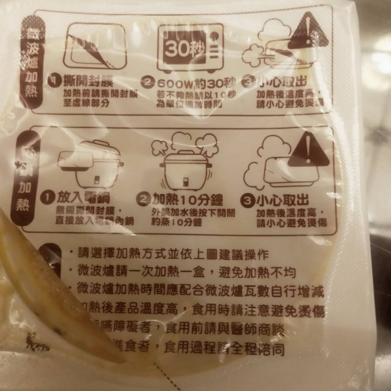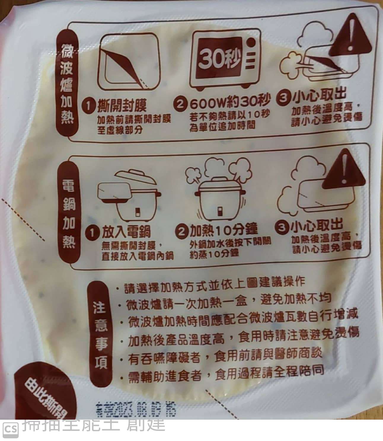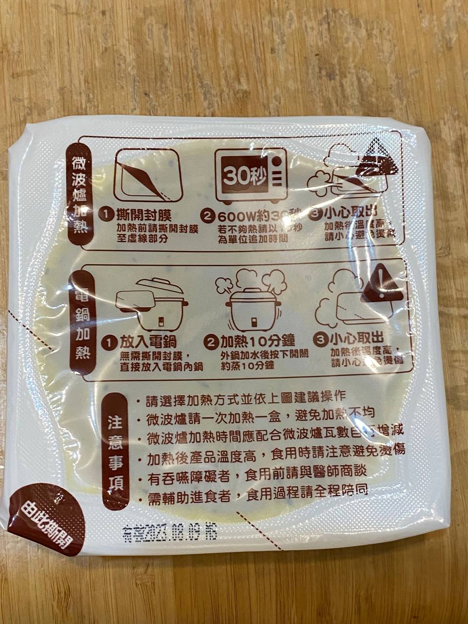 ‧微波爐【30秒】600W約30秒,封膜需撕開一小角,若不夠熱請以10秒為單位追加時間