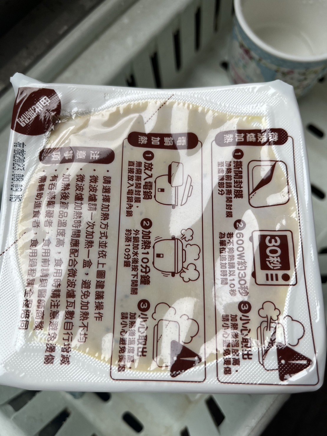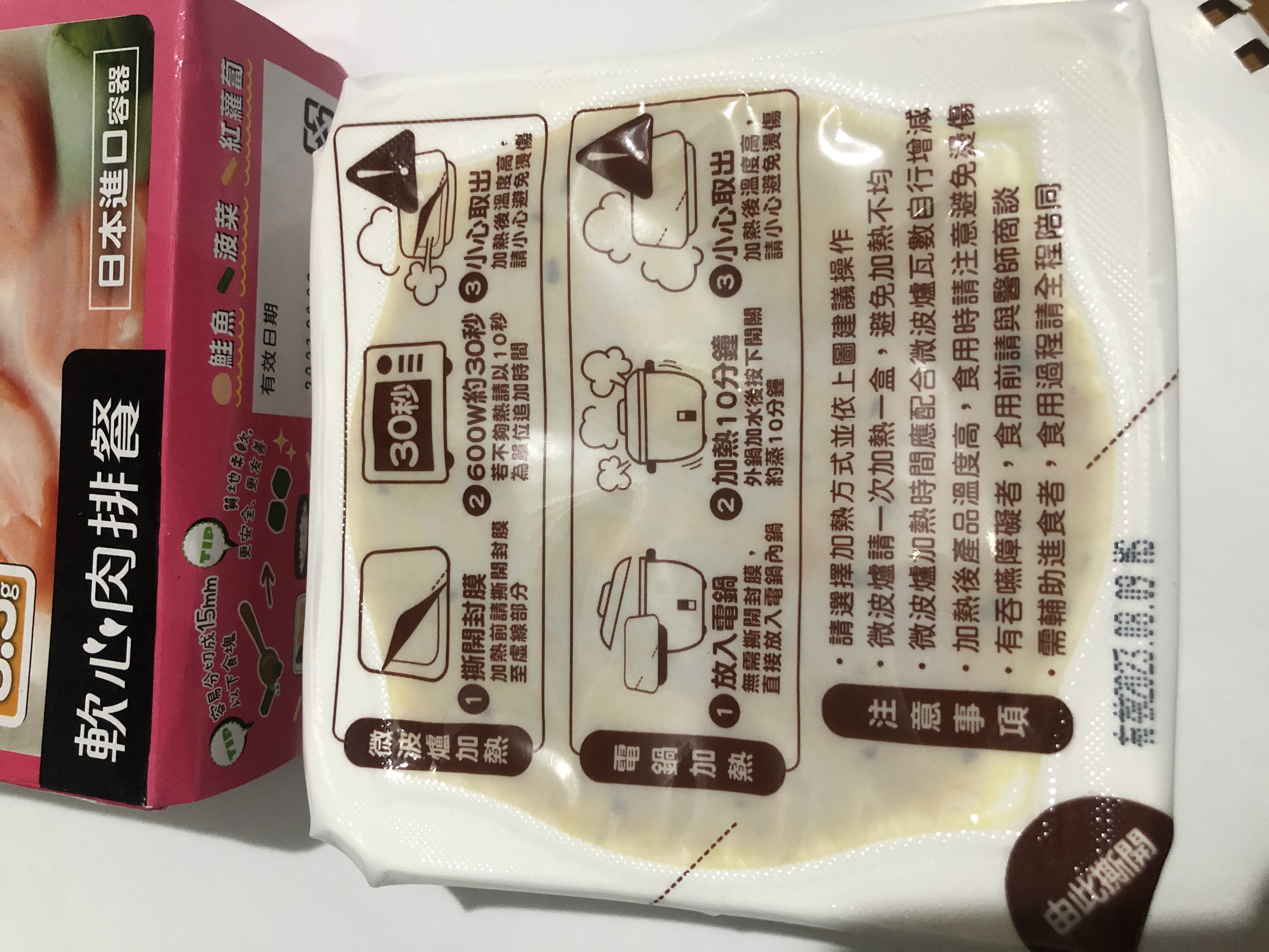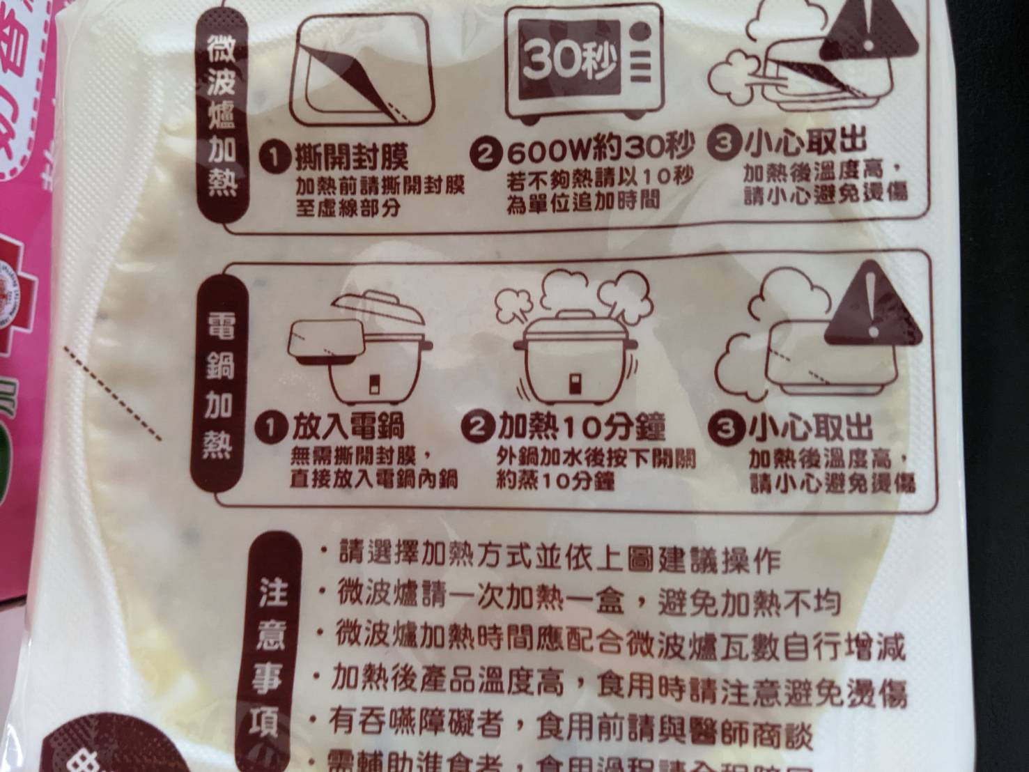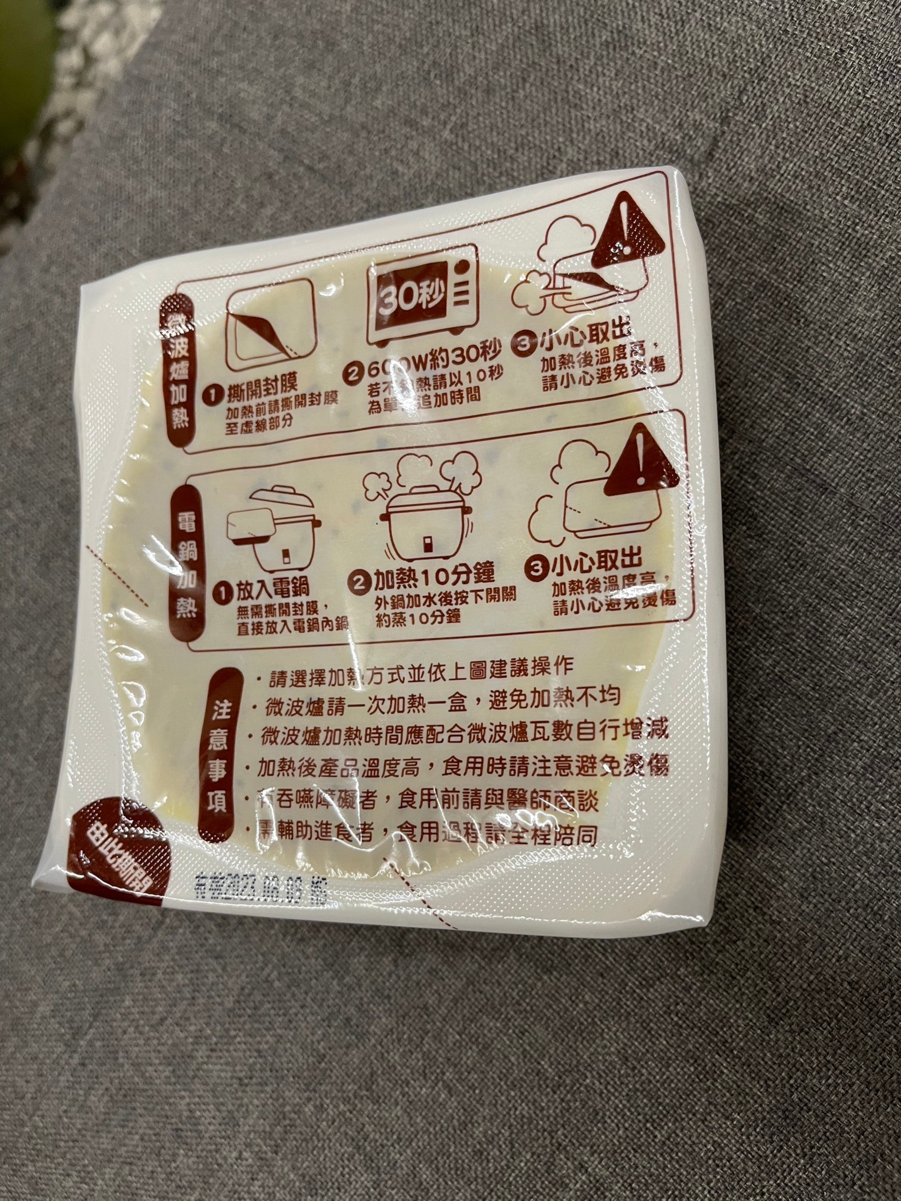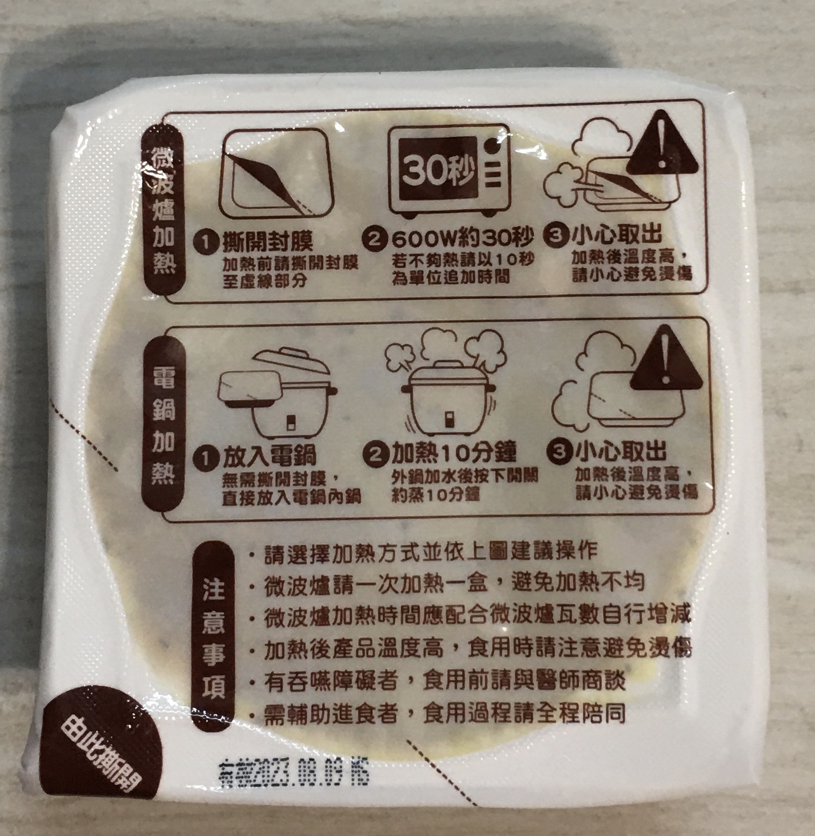 ‧微波爐【30秒】600W約30秒,封膜需撕開一小角,若不夠熱請以10秒為單位追加時間