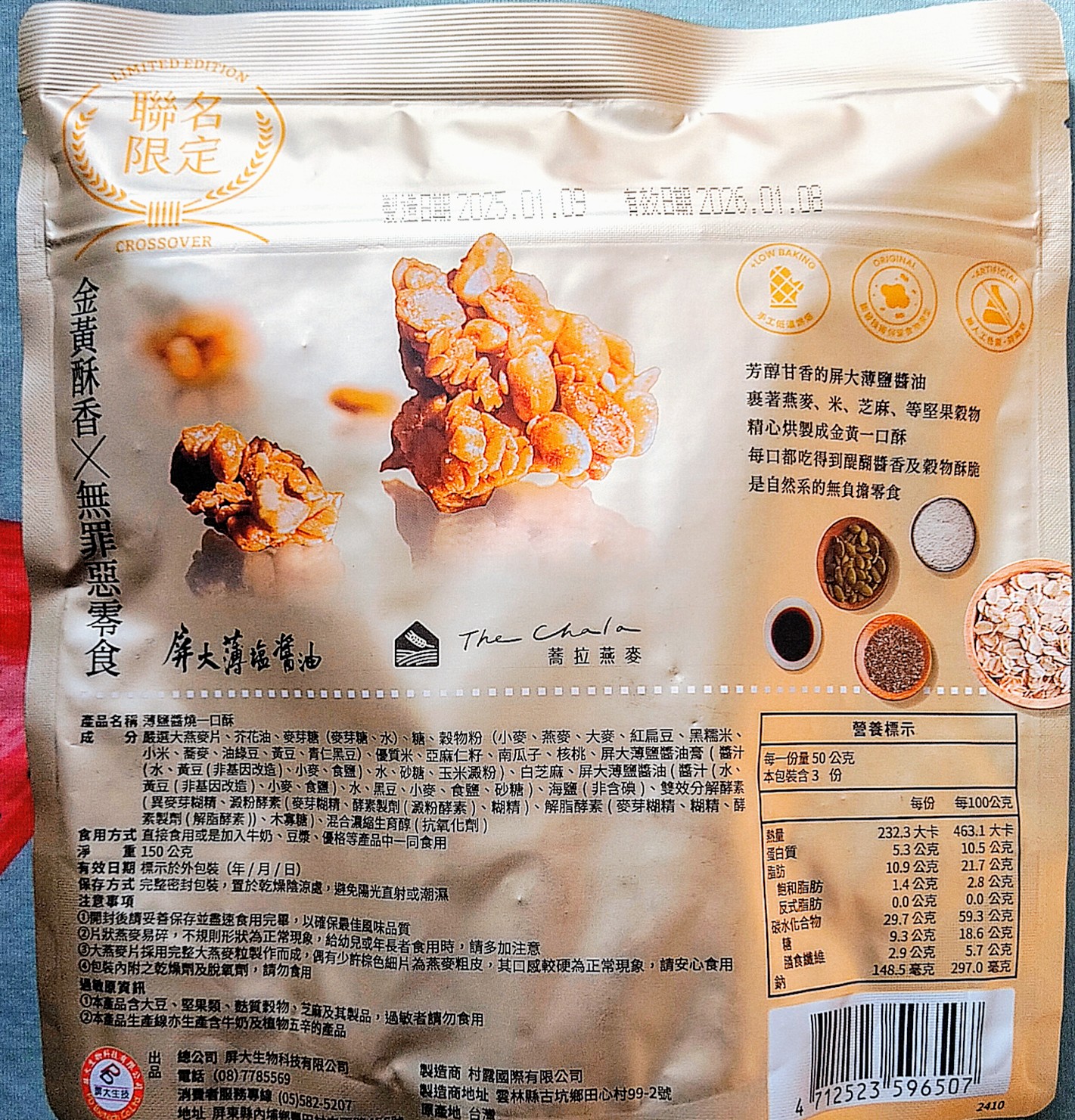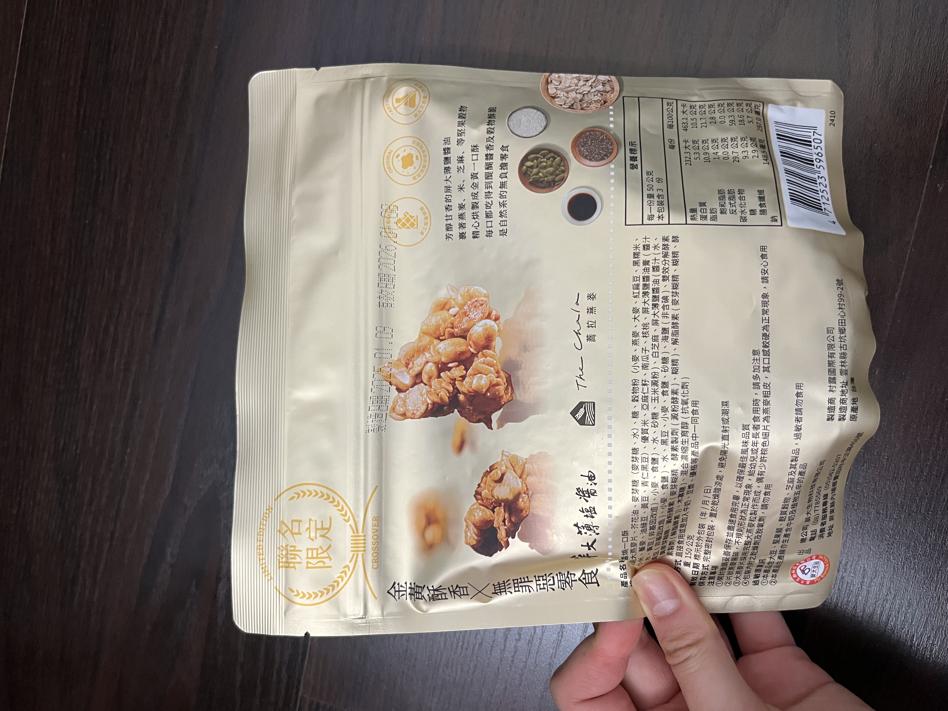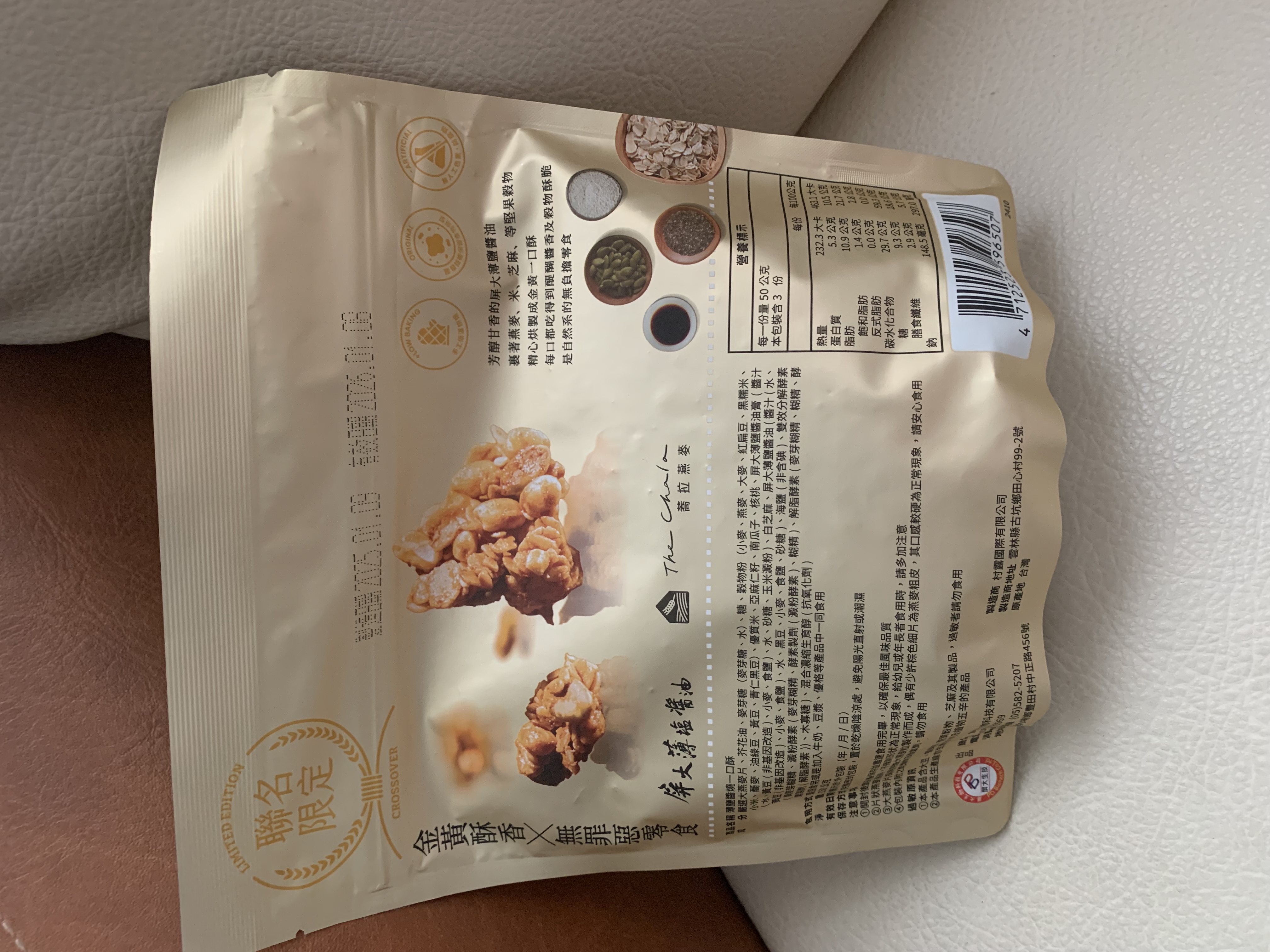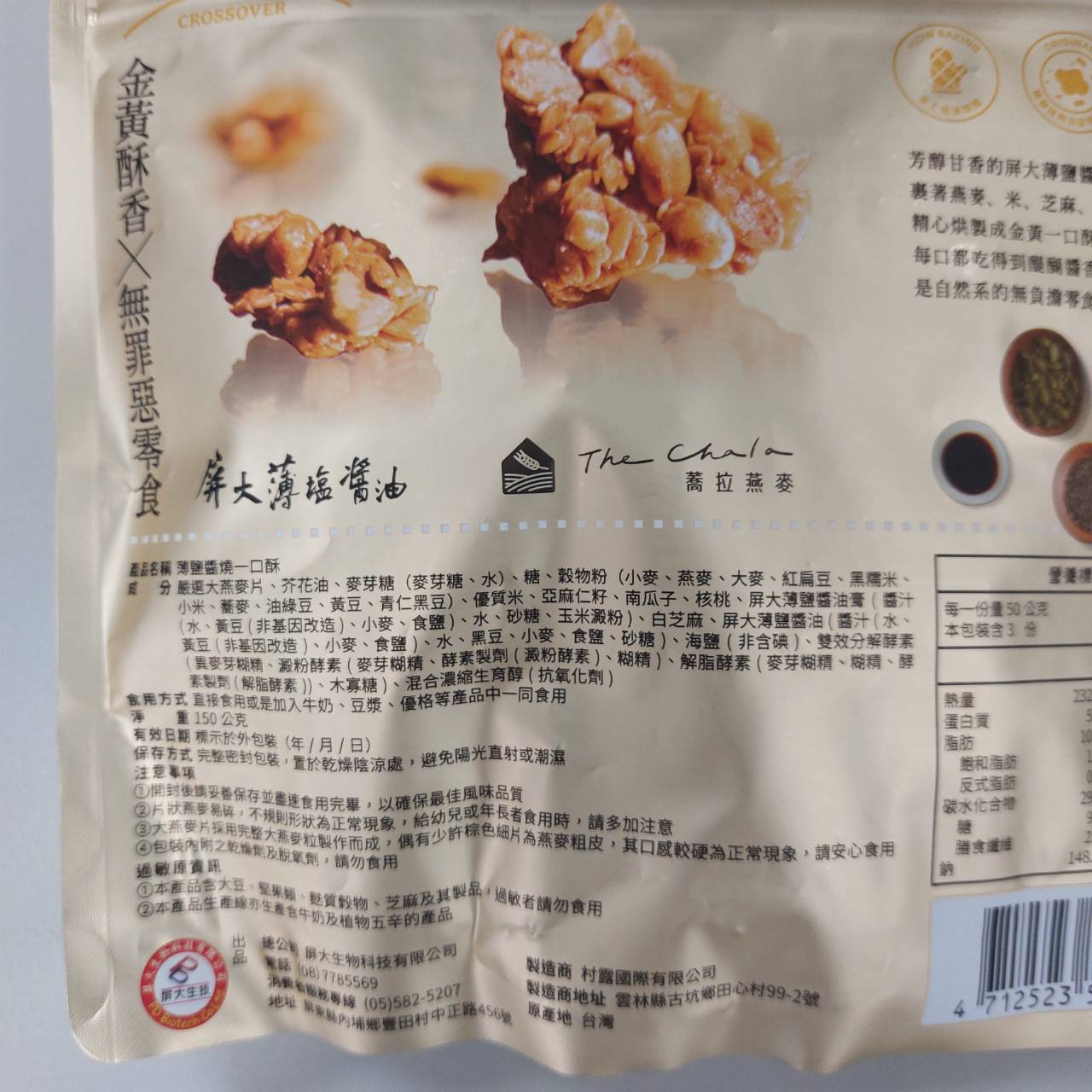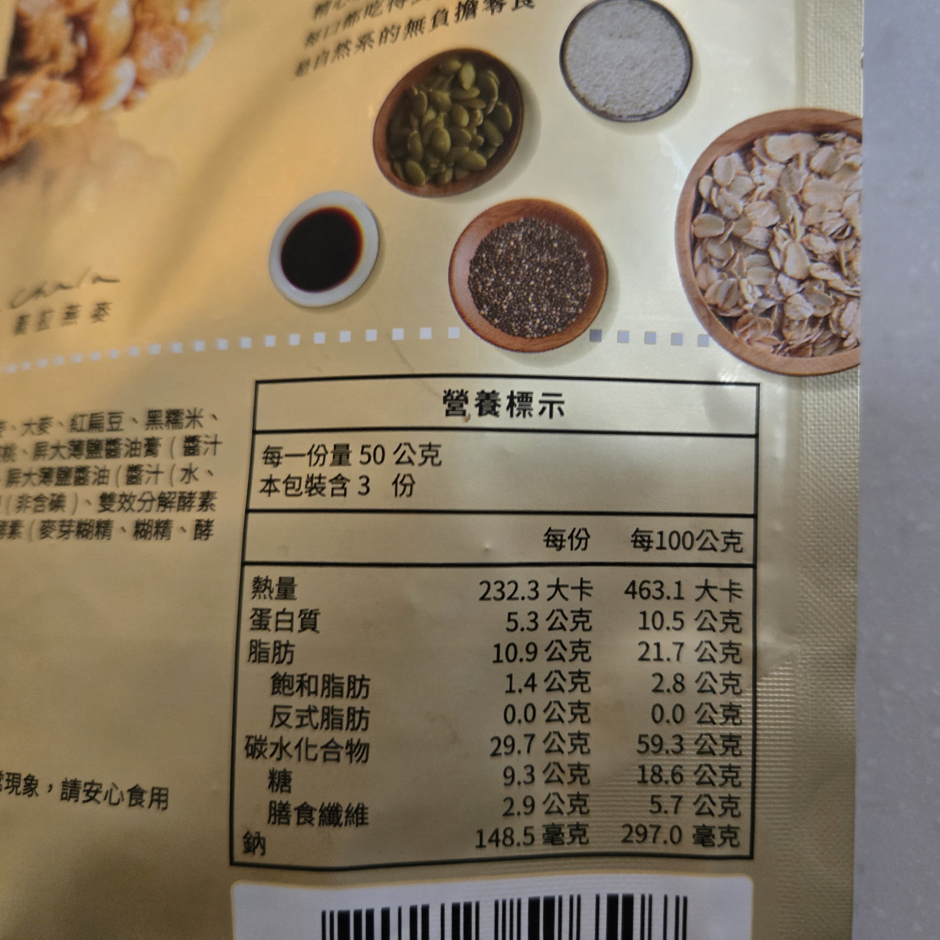 嚴選大燕麥片、芥花油、麥芽糖(麥芽糖、水)、糖、穀物粉(小麥、燕麥、大麥、紅扁豆、黑糯米、小米、蕎麥、油綠豆、黃豆、青仁黑豆)、優質米、亞麻仁籽、南瓜子、核桃、屏大薄鹽醬油膏(醬汁(水、黃豆(非基因改造)、小麥、食鹽)、水、砂糖、玉米澱粉)、白芝麻、屏大薄鹽醬油(醬汁(水、黃豆(非基因改造)、小麥、食鹽)、水、黑豆、小麥、食鹽、砂糖)、海鹽(非含碘)、雙效分解酵素(異麥芽糊精、澱粉酵素(麥芽糊精、酵素製劑(澱粉酵素)、糊精)、解脂酵素(麥芽糊精、糊精、酵素製劑(解脂酵素))、木寡糖)、混合濃縮生育醇(抗氧化劑)。