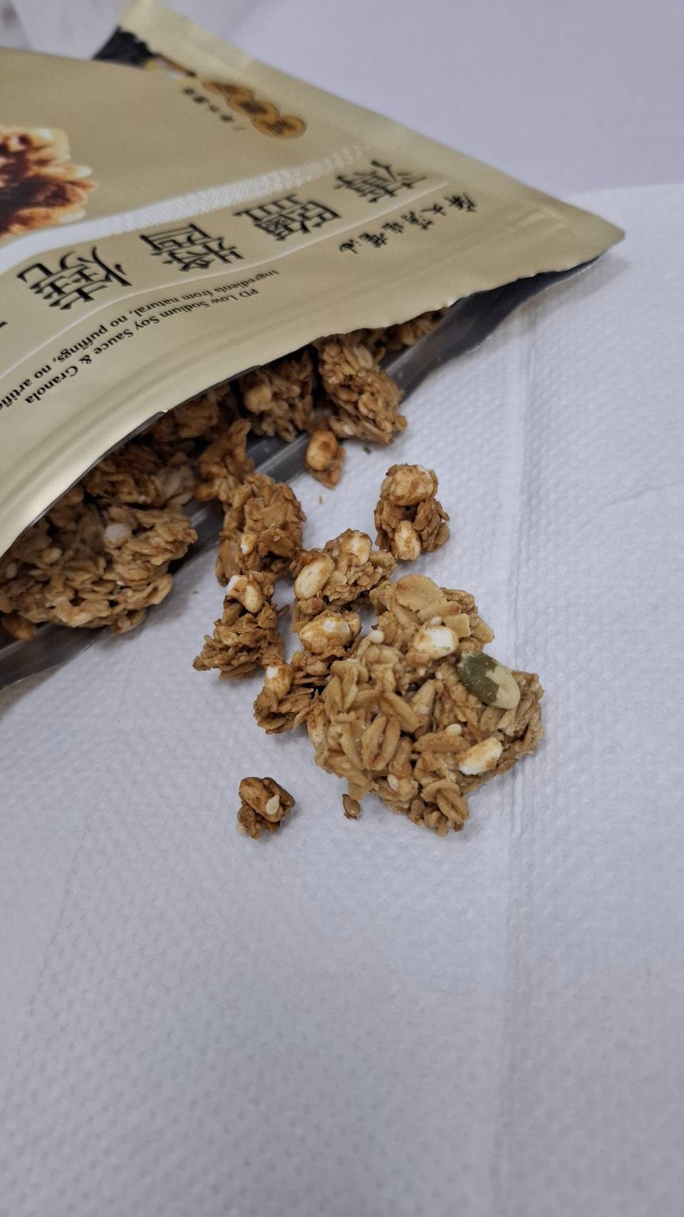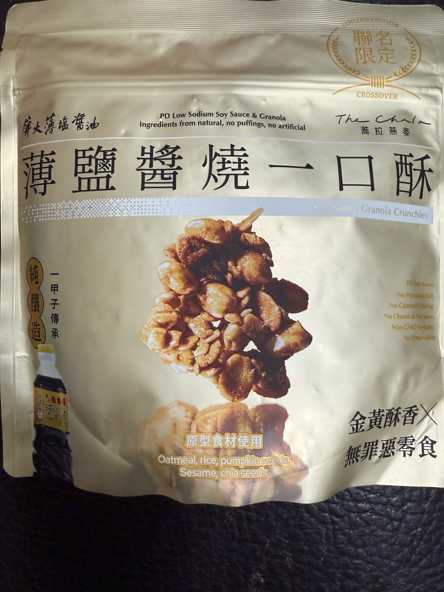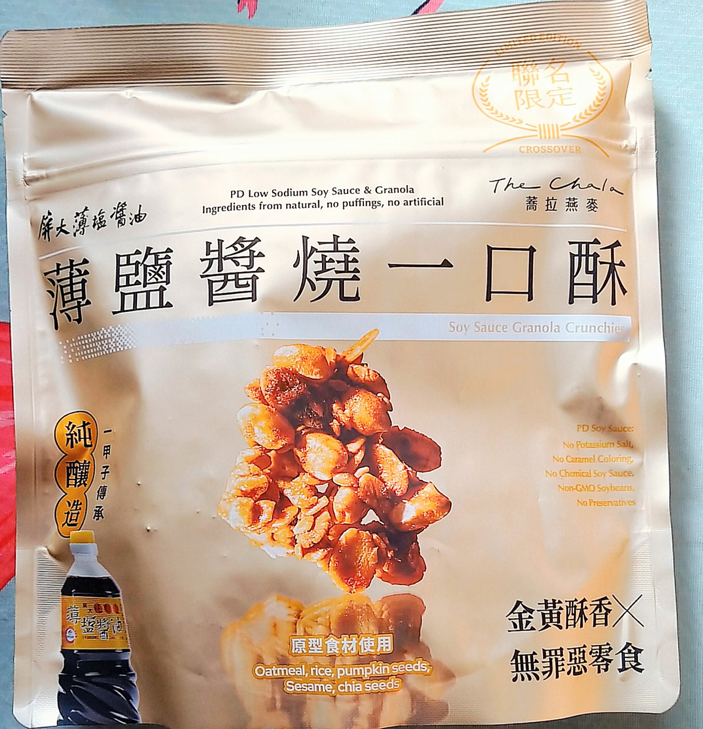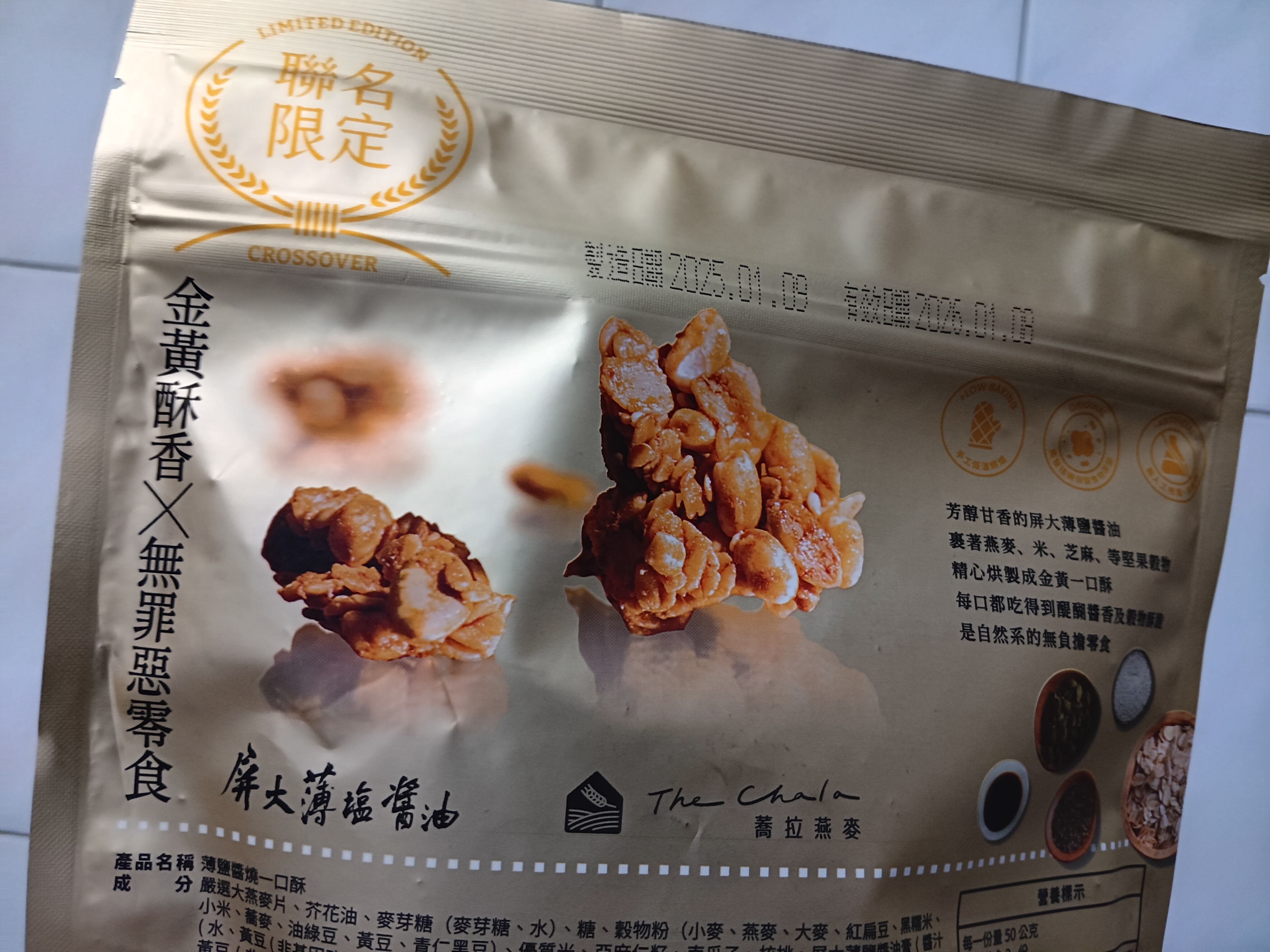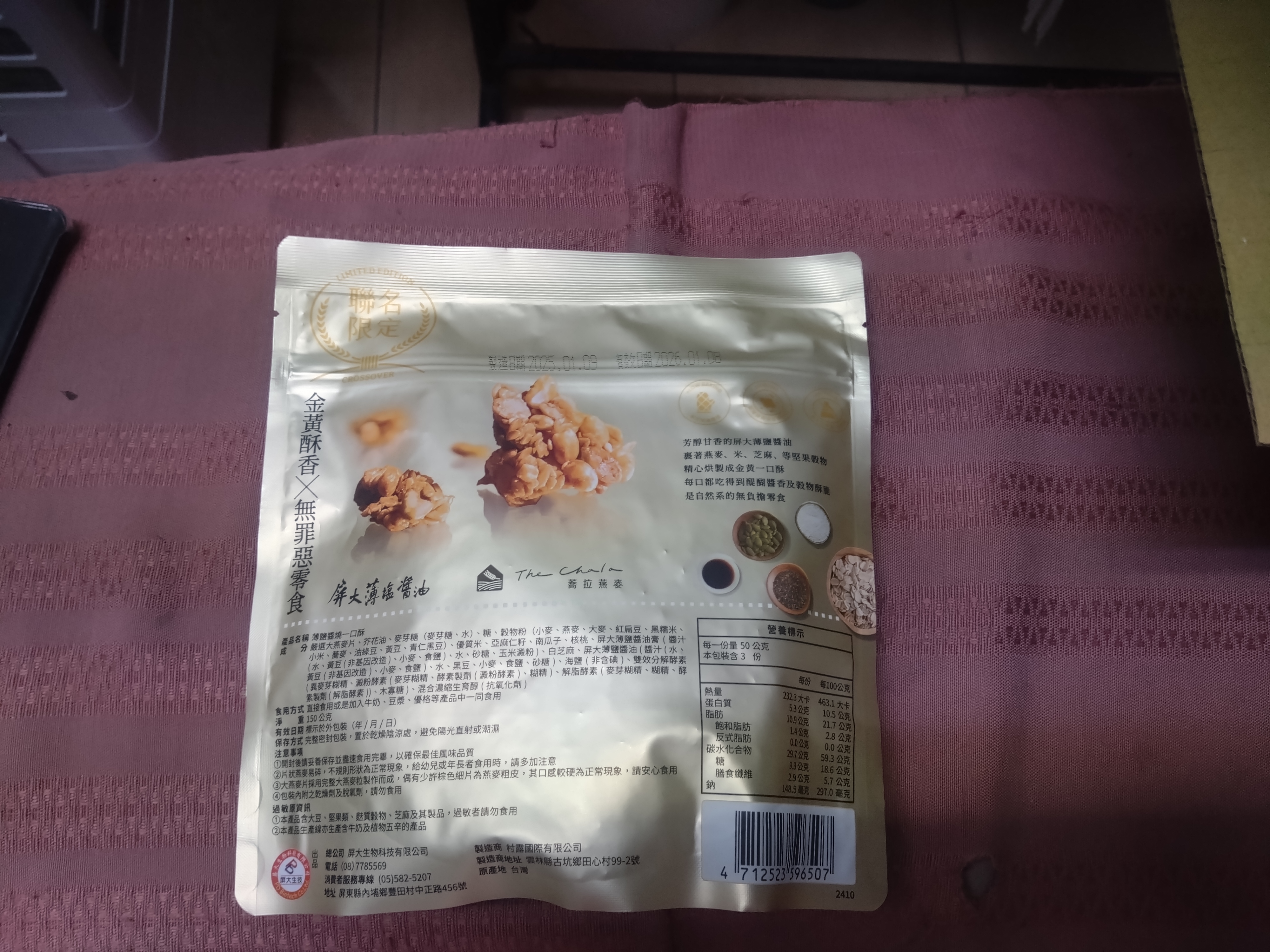 嚴選大燕麥片、芥花油、麥芽糖(麥芽糖、水)、糖、穀物粉(小麥、燕麥、大麥、紅扁豆、黑糯米、小米、蕎麥、油綠豆、黃豆、青仁黑豆)、優質米、亞麻仁籽、南瓜子、核桃、屏大薄鹽醬油膏(醬汁(水、黃豆(非基因改造)、小麥、食鹽)、水、砂糖、玉米澱粉)、白芝麻、屏大薄鹽醬油(醬汁(水、黃豆(非基因改造)、小麥、食鹽)、水、黑豆、小麥、食鹽、砂糖)、海鹽(非含碘)、雙效分解酵素(異麥芽糊精、澱粉酵素(麥芽糊精、酵素製劑(澱粉酵素)、糊精)、解脂酵素(麥芽糊精、糊精、酵素製劑(解脂酵素))、木寡糖)、混合濃縮生育醇(抗氧化劑)。