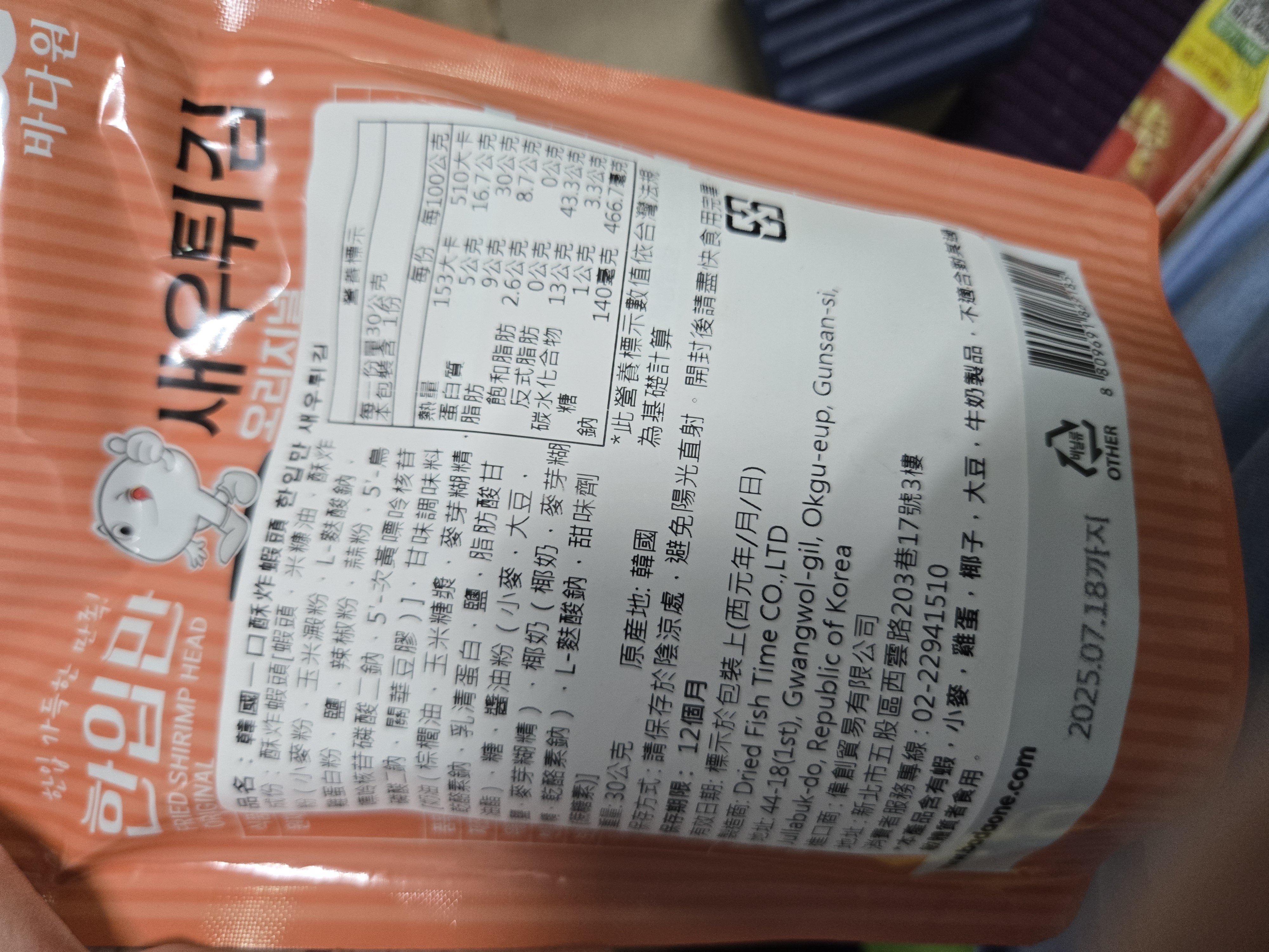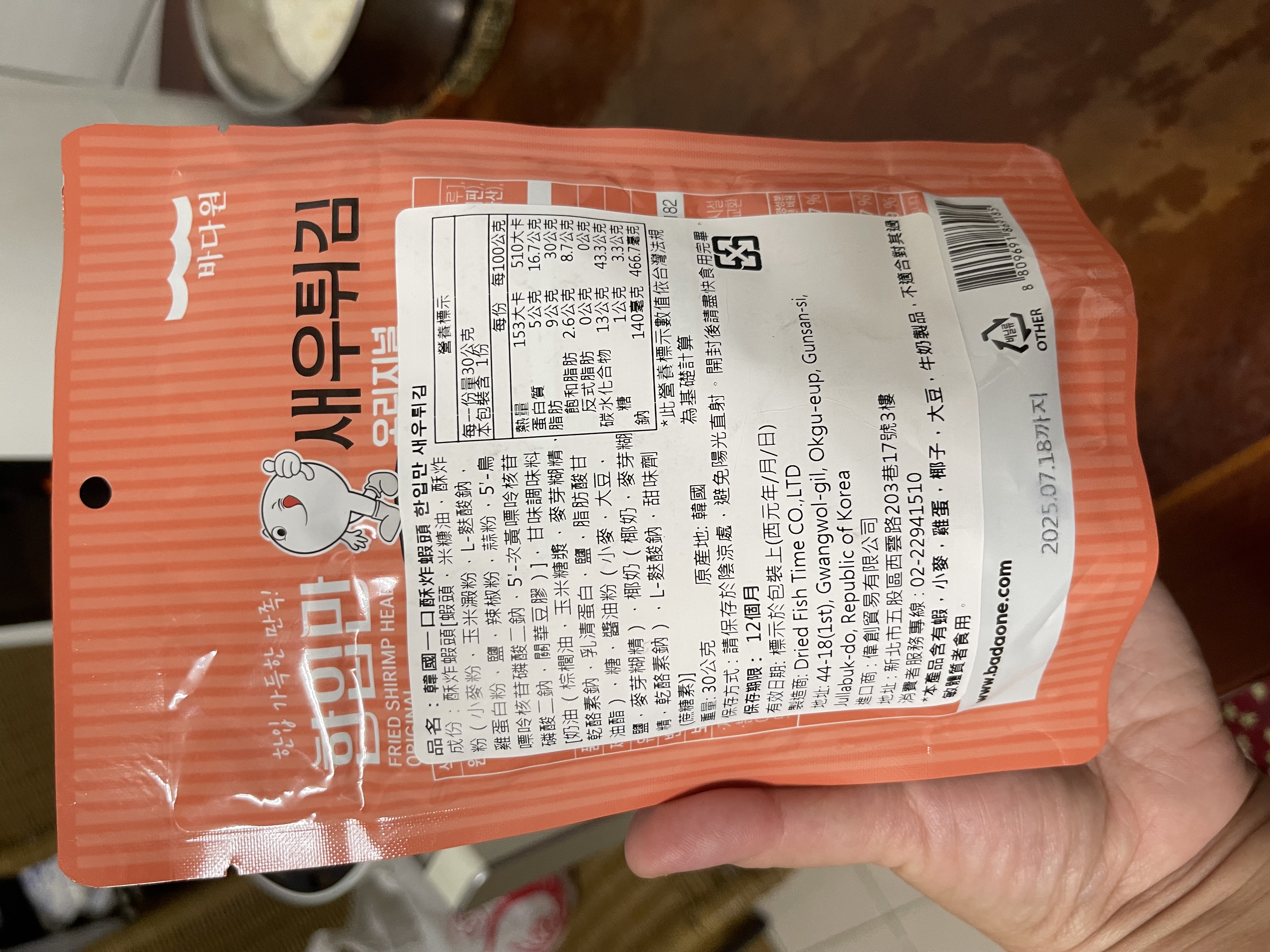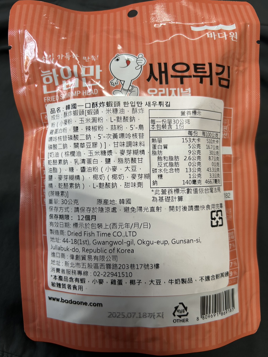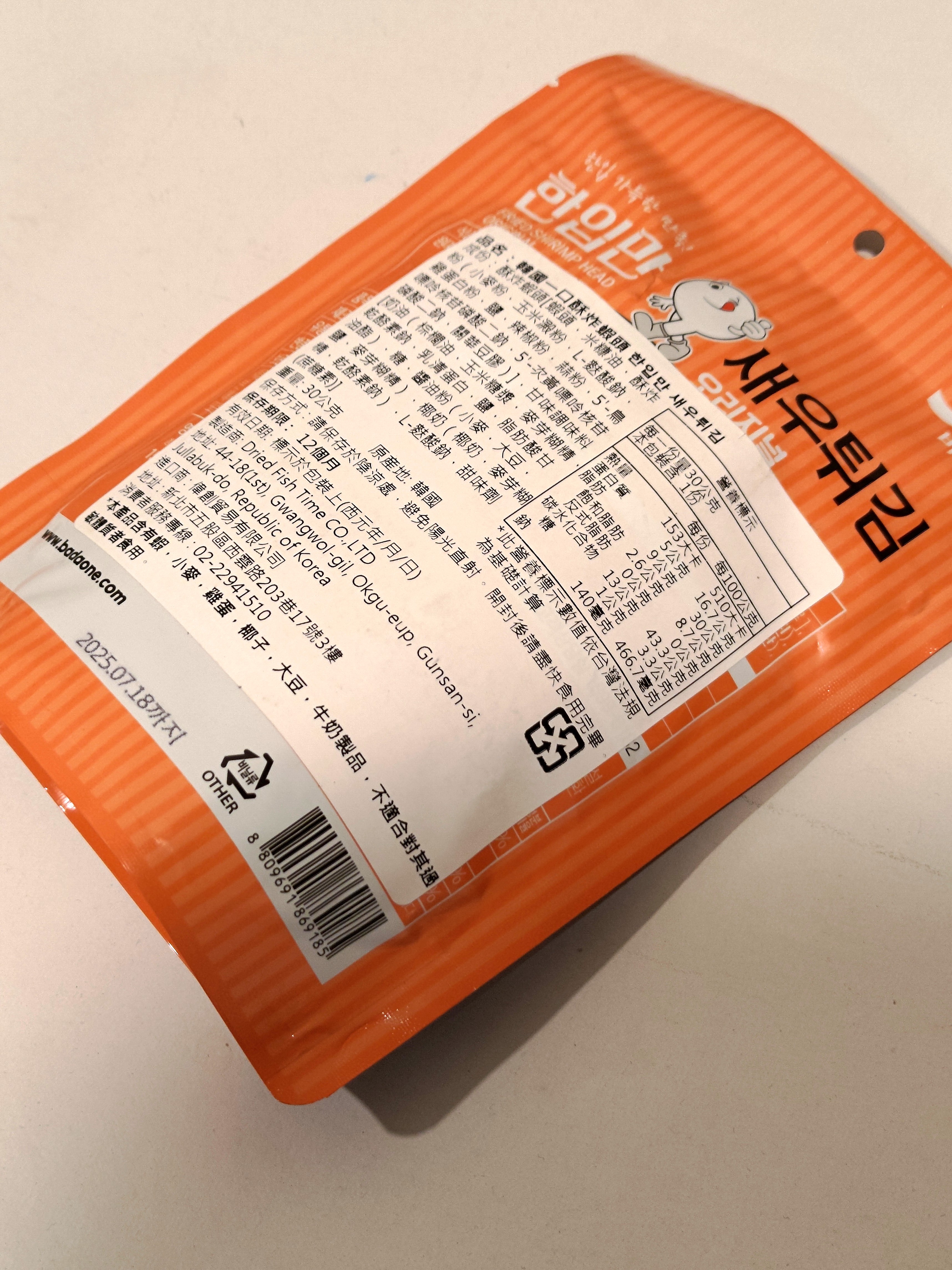 成分:酥炸蝦頭[蝦頭,米糠油,酥炸粉(小麥粉,玉米澱粉,L-麩酸鈉,雞蛋白粉,鹽,辣椒粉,蒜粉,5’-鳥嘌呤核苷磷酸二鈉,5’-次黃嘌呤核苷磷酸二鈉,關華豆膠)],甘味調味料[植物性油脂(棕櫚油,玉米糖漿,麥芽糊精,乾酪素鈉,乳清蛋白,鹽,脂肪酸甘油酯),糖,醬油粉(小麥,大豆,鹽,麥芽糊精),椰奶(椰奶,麥芽糊精,乾酪素鈉),L-麩酸鈉,甜味劑(蔗糖素)]