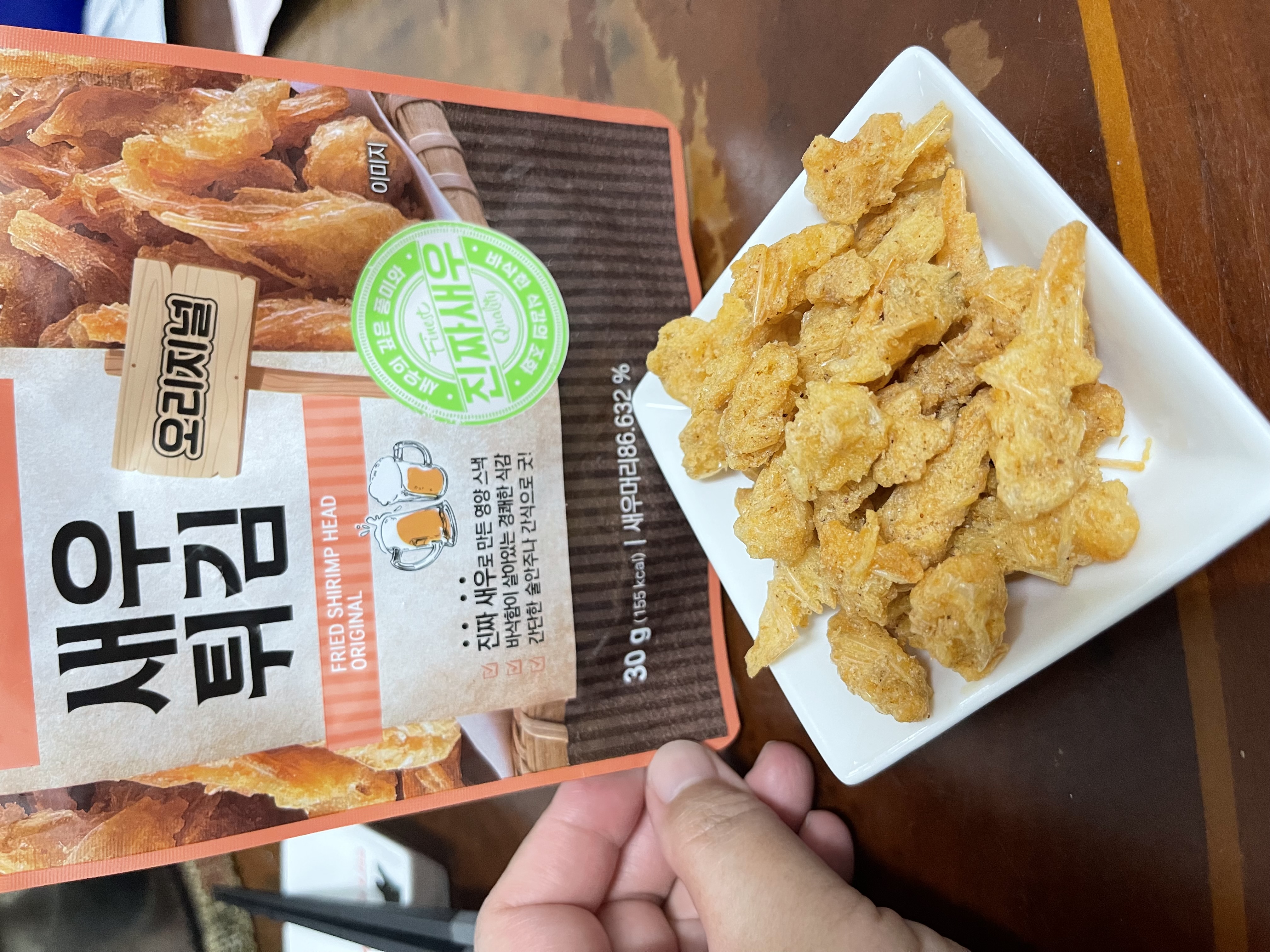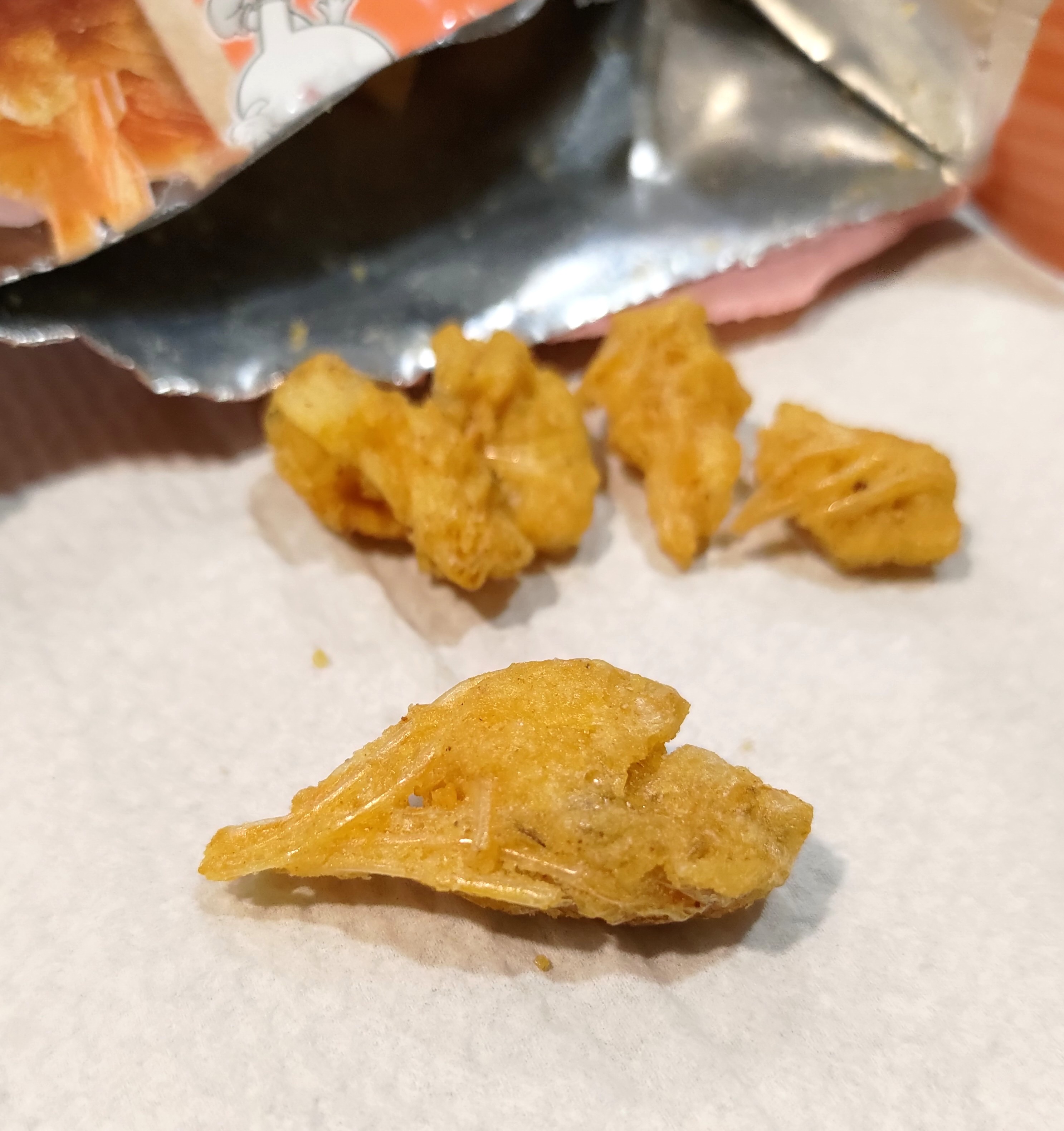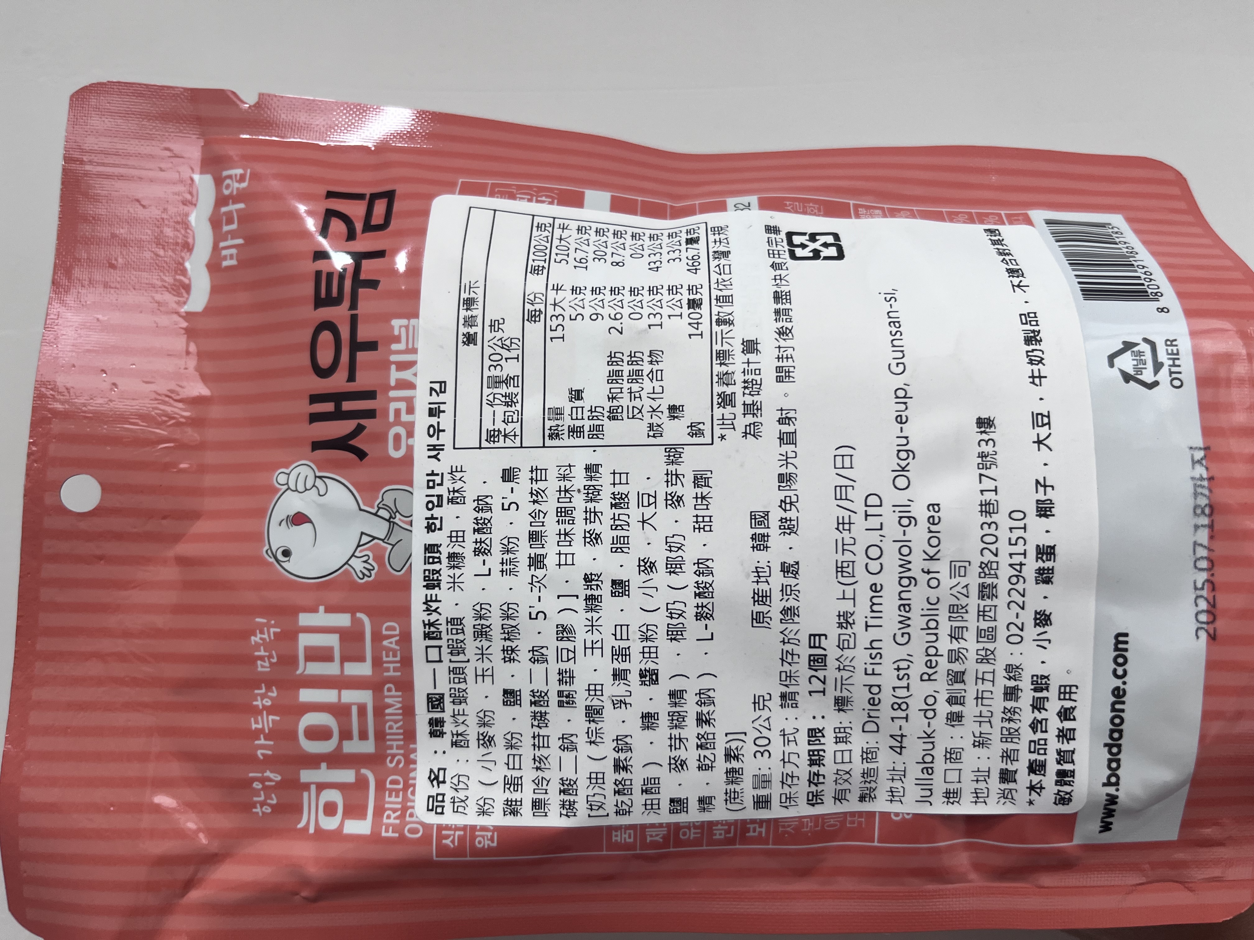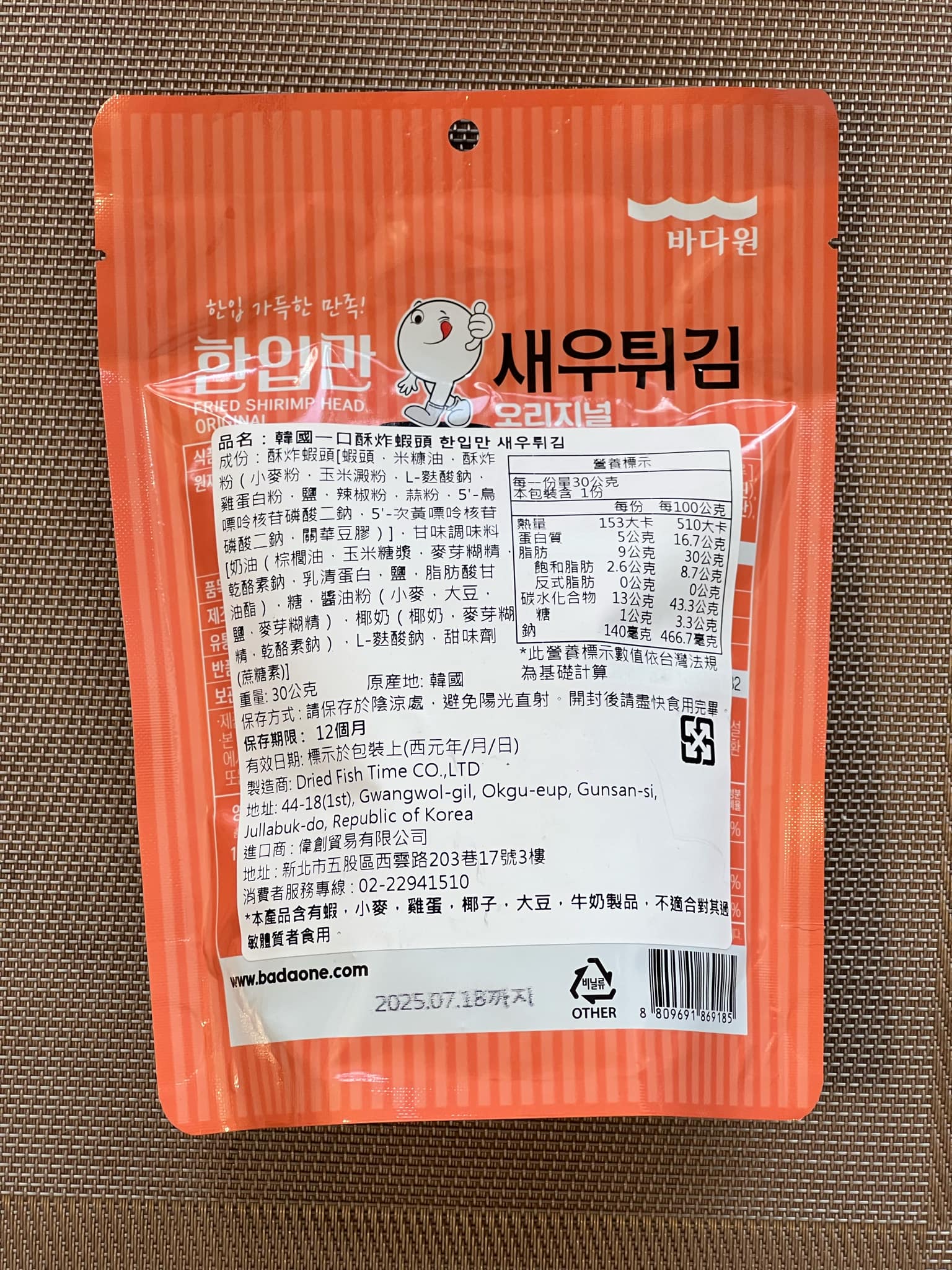 成分:酥炸蝦頭[蝦頭,米糠油,酥炸粉(小麥粉,玉米澱粉,L-麩酸鈉,雞蛋白粉,鹽,辣椒粉,蒜粉,5’-鳥嘌呤核苷磷酸二鈉,5’-次黃嘌呤核苷磷酸二鈉,關華豆膠)],甘味調味料[植物性油脂(棕櫚油,玉米糖漿,麥芽糊精,乾酪素鈉,乳清蛋白,鹽,脂肪酸甘油酯),糖,醬油粉(小麥,大豆,鹽,麥芽糊精),椰奶(椰奶,麥芽糊精,乾酪素鈉),L-麩酸鈉,甜味劑(蔗糖素)]