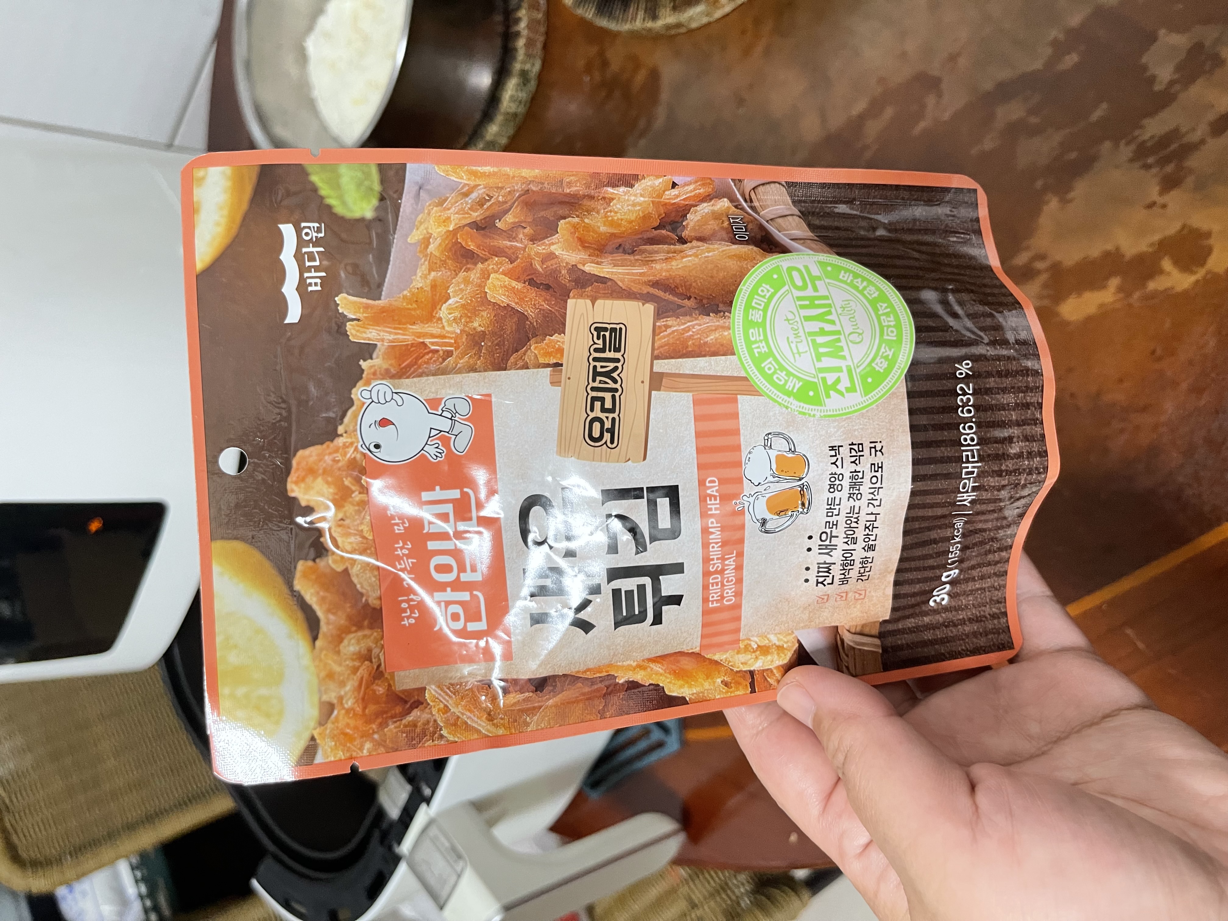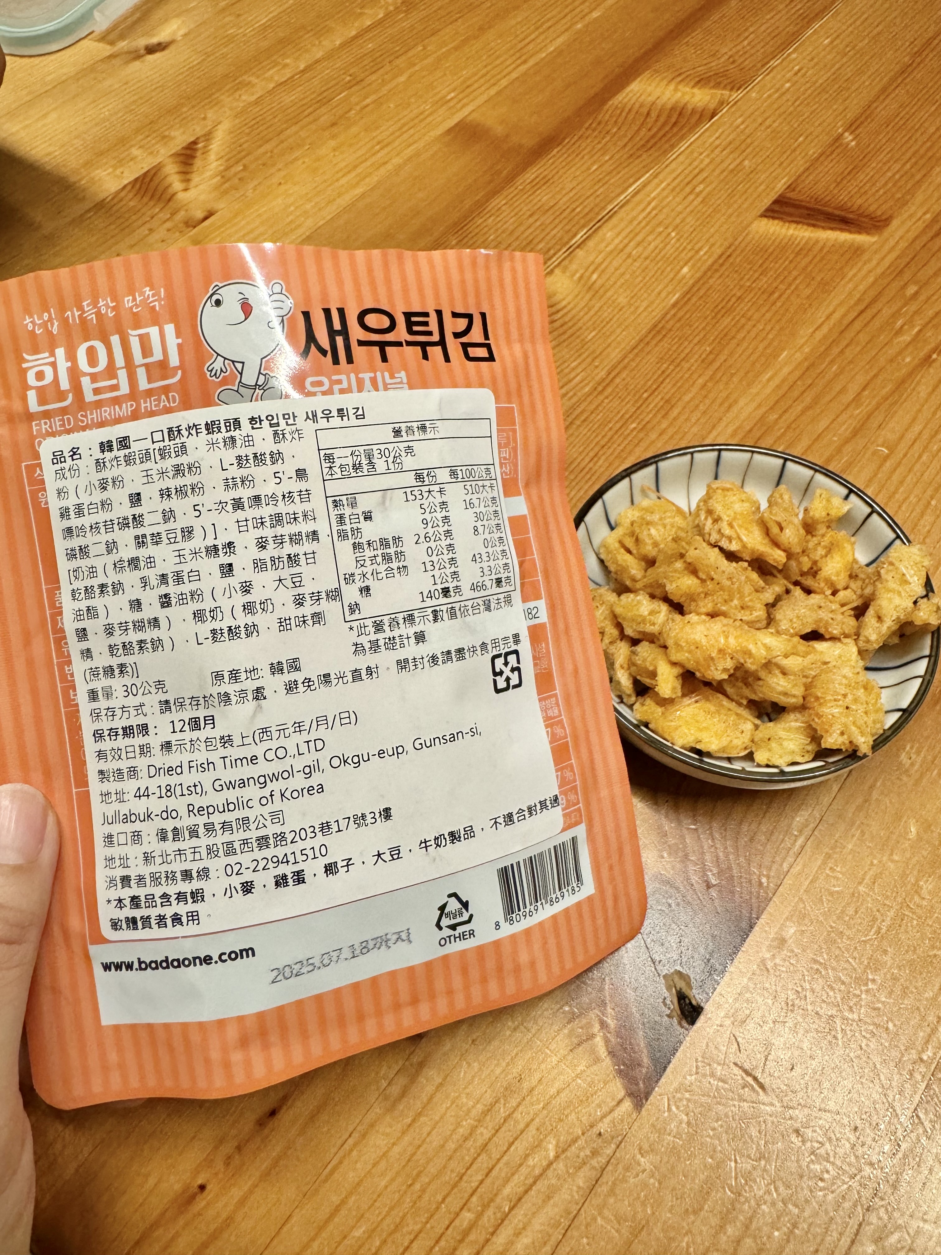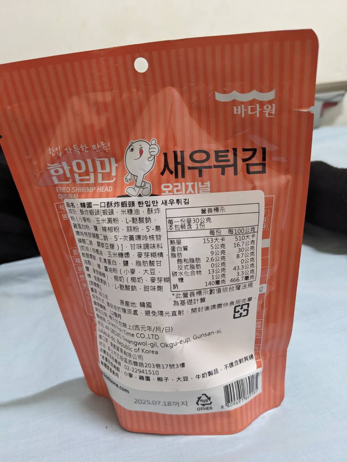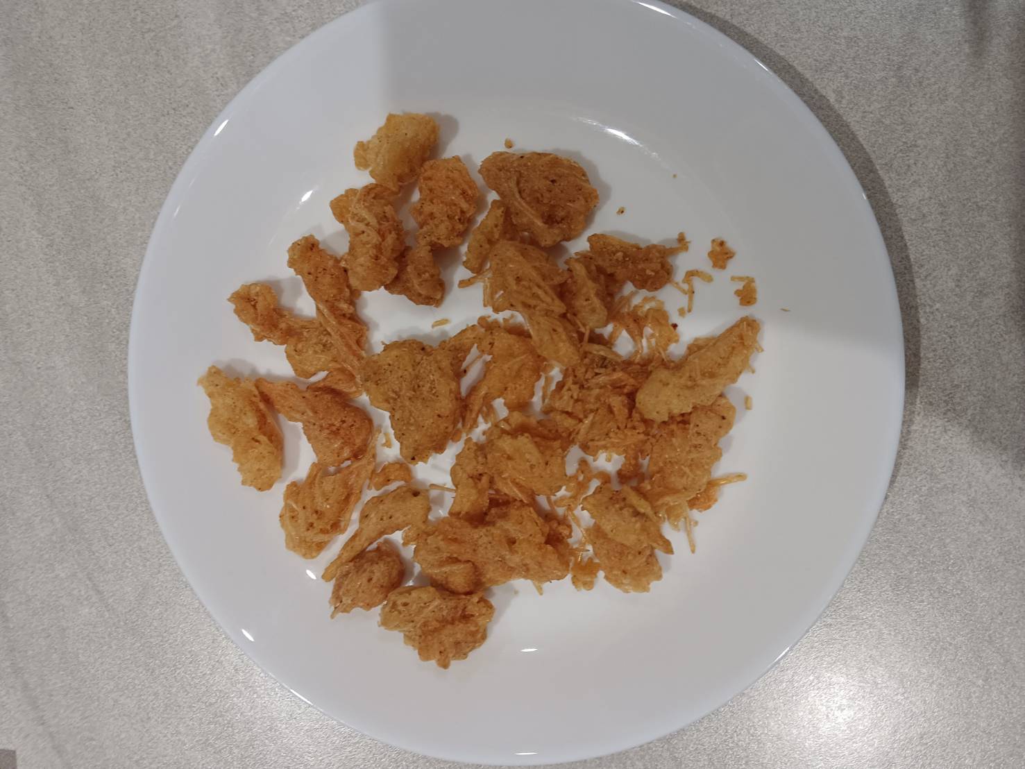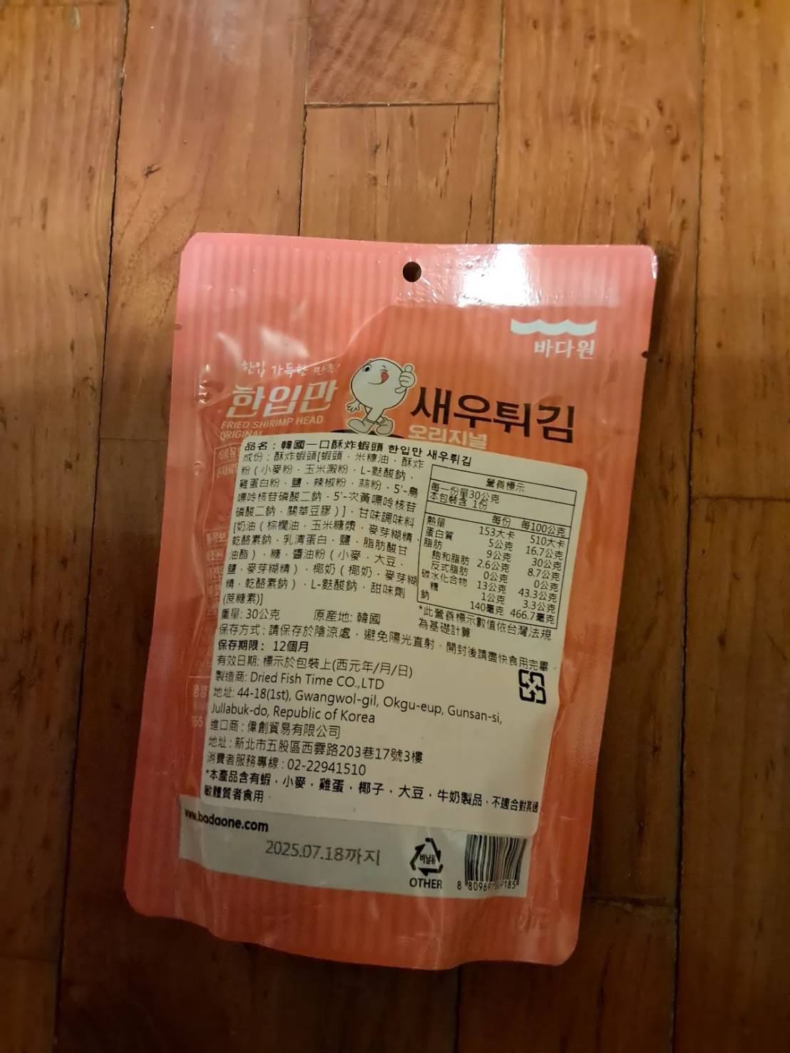 成分:酥炸蝦頭[蝦頭,米糠油,酥炸粉(小麥粉,玉米澱粉,L-麩酸鈉,雞蛋白粉,鹽,辣椒粉,蒜粉,5’-鳥嘌呤核苷磷酸二鈉,5’-次黃嘌呤核苷磷酸二鈉,關華豆膠)],甘味調味料[植物性油脂(棕櫚油,玉米糖漿,麥芽糊精,乾酪素鈉,乳清蛋白,鹽,脂肪酸甘油酯),糖,醬油粉(小麥,大豆,鹽,麥芽糊精),椰奶(椰奶,麥芽糊精,乾酪素鈉),L-麩酸鈉,甜味劑(蔗糖素)]