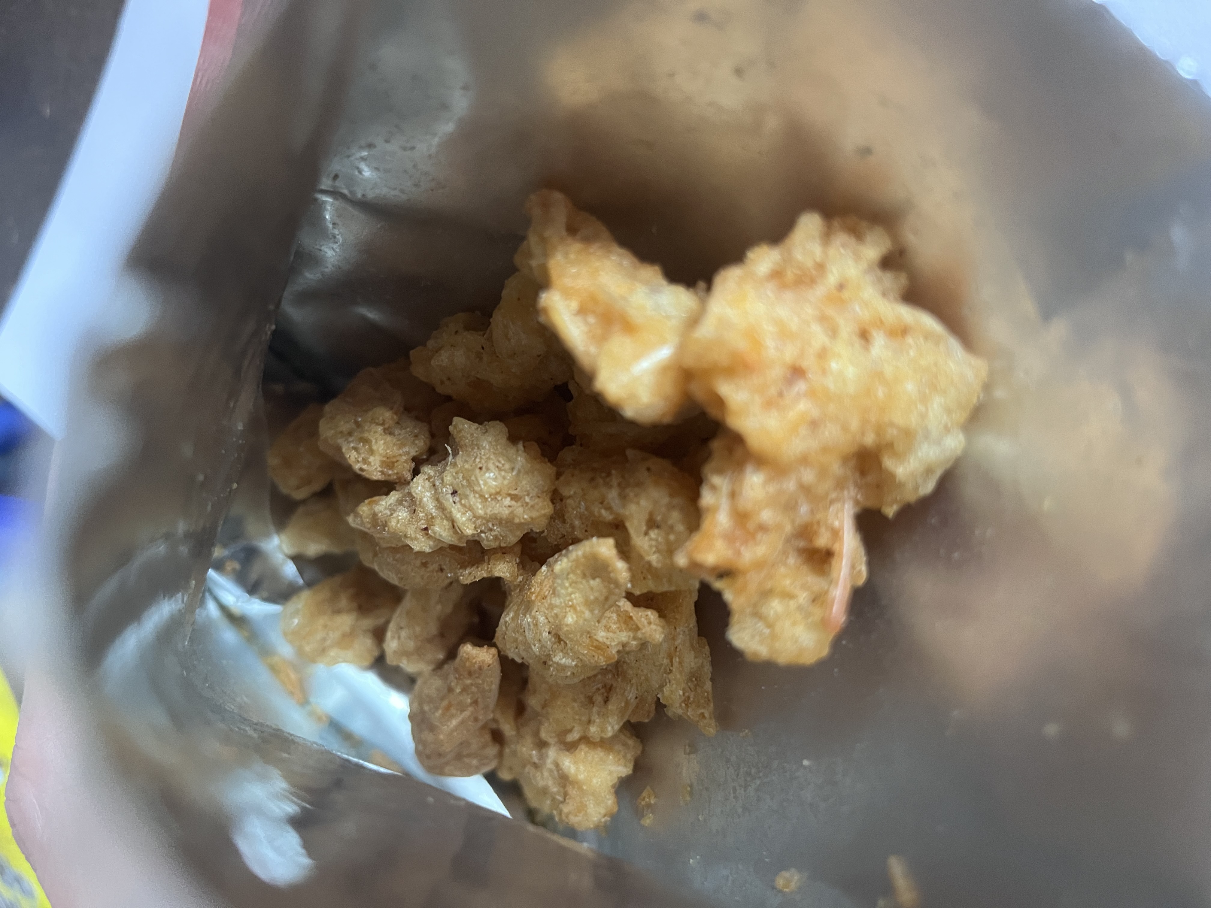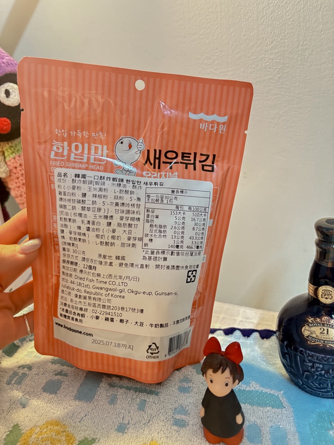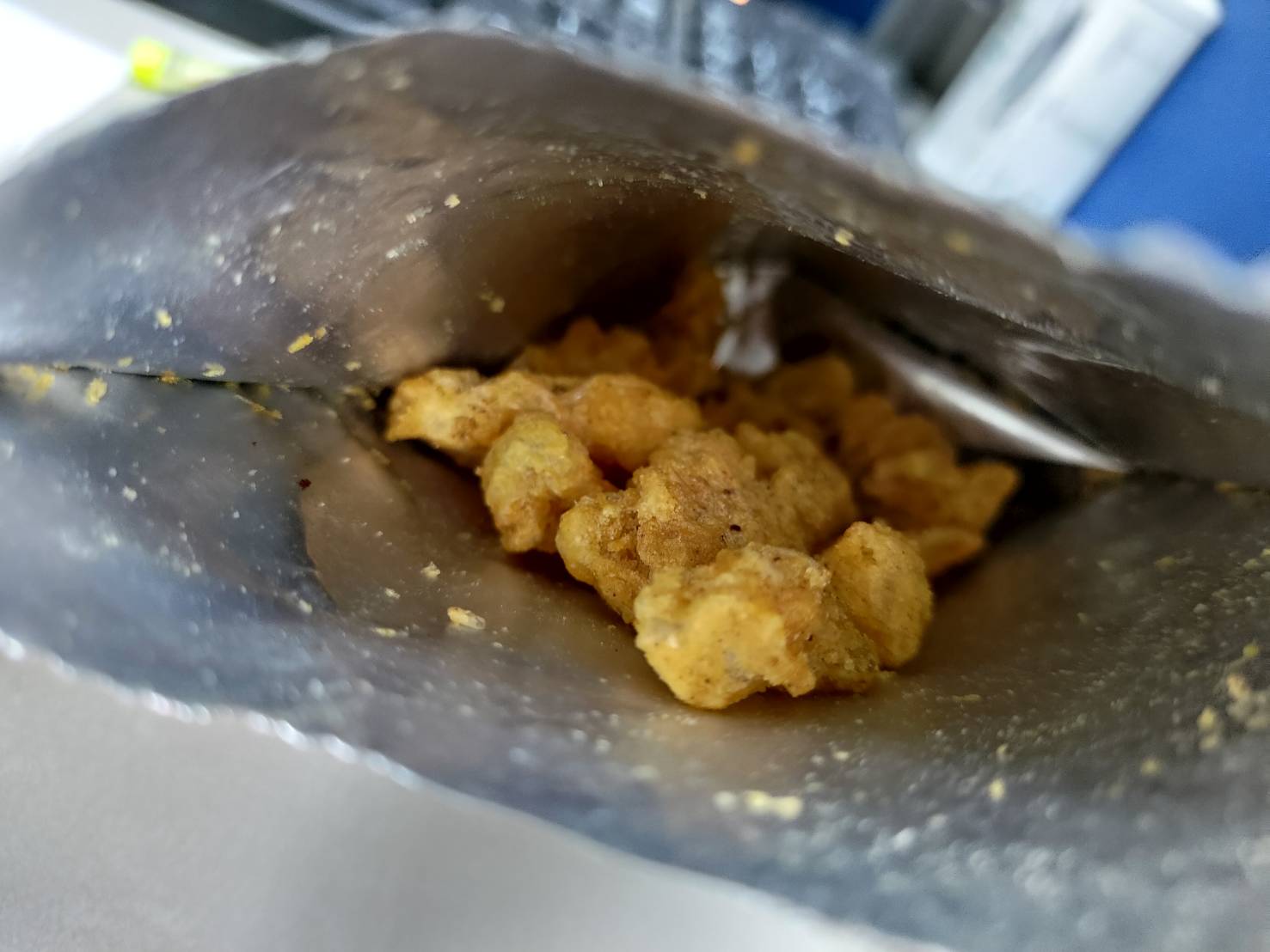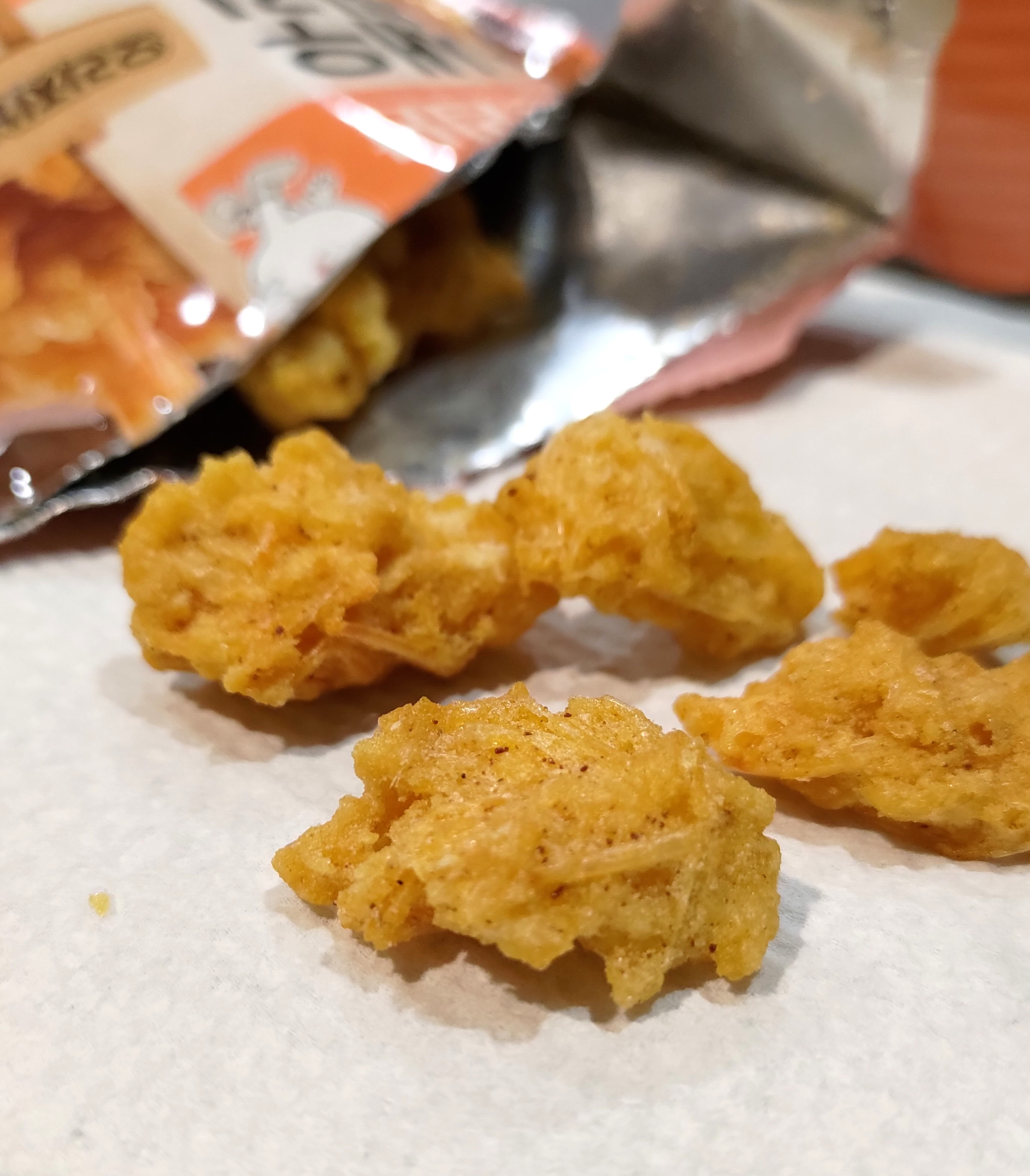 成分:酥炸蝦頭[蝦頭,米糠油,酥炸粉(小麥粉,玉米澱粉,L-麩酸鈉,雞蛋白粉,鹽,辣椒粉,蒜粉,5’-鳥嘌呤核苷磷酸二鈉,5’-次黃嘌呤核苷磷酸二鈉,關華豆膠)],甘味調味料[植物性油脂(棕櫚油,玉米糖漿,麥芽糊精,乾酪素鈉,乳清蛋白,鹽,脂肪酸甘油酯),糖,醬油粉(小麥,大豆,鹽,麥芽糊精),椰奶(椰奶,麥芽糊精,乾酪素鈉),L-麩酸鈉,甜味劑(蔗糖素)]