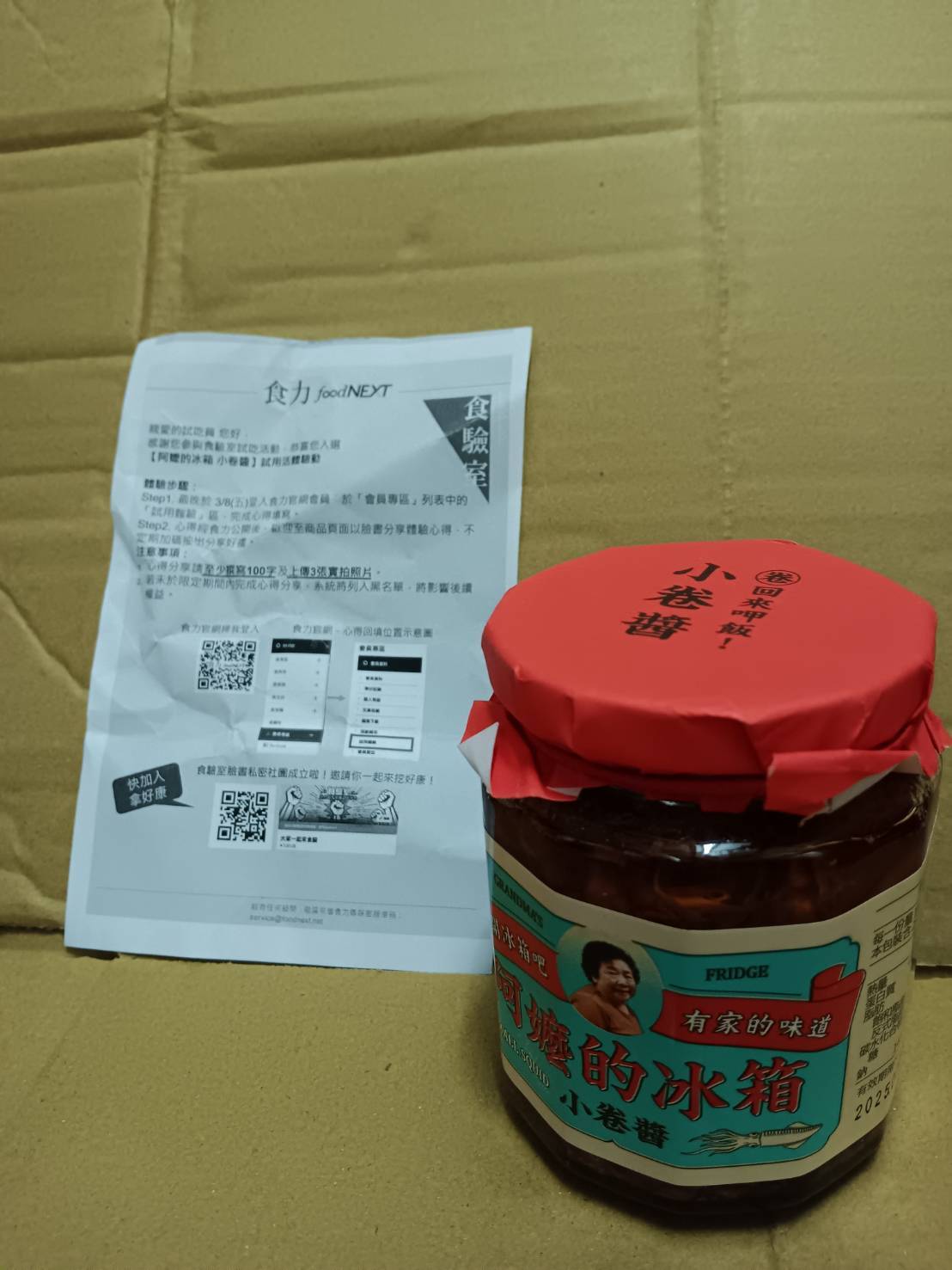 回列表 阿嬤的冰箱 小卷醬 有一種餓叫阿嬤覺得你餓 超澎湃海鮮小卷驚艷眾人目光 市價389元 (免費申請) 所需等級 一般會員以上 所需學分 100 體驗份數 15 關注人數 2155 申請人數 406 申請截止 品牌業者:阿嬤的冰箱 負責廠商 品炘科技股份有限公司 廠商地址 104台北市長安東路二段246號12樓 產地 台灣 試用產品規格 240g/罐 食品業者登錄字號 F-146390403-00000-2 投保產品責任險字號 心得分享 商品介紹 商品成分 使用方法 注意事項 體驗名單 8.3 阿嬤的冰箱 小卷醬 小卷口感 7.8 小卷份量 9.2 多元搭配 8.1 鹹度適中 7.9 懷舊美學 8.6 建議推薦 8.2 心得分享 13則 金燕 金食達人 55歲 臺南市 2024/03/05 對阿嬤的冰箱 小卷醬留下評價 8 很開心可以抽到阿嬤的冰箱小卷醬視吃,很期待收到包裹,包裝很接地氣,直接放一張阿嬤的照片,很有特色!裡面是滿滿的小卷排排站,用料非常豐富,原本以為吃起來會像是小魚乾醬那種味道,但這款調味比較淡一點,沒有很重的蒜頭味,辣味屬於中辣吧!小卷吃起來偏硬,需要一直咬,對有年紀的比較不適合,單吃口感比較硬,可以放入麵或飯裡,軟化一下小卷會比較好吃有更有味道! YC CHANG 金食達人 26歲 臺北市 2024/03/02 對阿嬤的冰箱 小卷醬留下評價 9 開封前就從透明瓶身看到滿滿的小卷!份量非常夠,開封後再被它的份量震驚了一次!海鮮香氣非常足夠,小卷也很有嚼勁唯一美中不足的是辣度不太夠,我本身是吃小辣的人,看到顏色時原本是蠻期待的,因此有點小可惜~下次想試試看有小魚乾口味的! 小毛 金食達人 38歲 彰化縣 2024/03/04 對阿嬤的冰箱 小卷醬留下評價 8 阿嬤料理總是給人彭湃又豐富的印象,深怕孫子吃不飽,想必這款「阿嬤的冰箱小卷醬」就是以這樣的心情創造出來的,從玻璃罐透出的內容物全是一隻隻小卷,塞得滿滿的!!打開後香味撲鼻,沒有任何腥味,迫不及待的夾了一隻吃看看,微辣,原本以為像是新鮮的小卷那樣軟Q口感,但卻是非常有嚼勁!牙口不好的可能無法駕馭這罐食物~~順著一圈圈的咬下越嚼越香,有小卷的鮮甜味,單吃小卷不會很辣,但如果淋上醬就很有辣度了,可惜的是味道沒有很驚艷,蒜頭味和辣度若再提昇會更好! 陳秀閔 金食達人 56歲 高雄市 2024/03/06 對阿嬤的冰箱 小卷醬留下評價 9 小卷醬是我滿喜歡的一種醬料,因為比起一般的醬料,小卷醬就多了小卷,可以充當加菜的角色。這次有機會試吃阿嬤的冰箱小卷醬,一打開就聞到濃郁的海味,醬裡面給的小卷也滿多的,我是拿來直接拌麵吃就很好吃了,調味方面我覺得不至於太死鹹還不錯,包裝是一個阿嬤的頭像也太可愛了吧! 吳芊慧 金食達人 50歲 高雄市 2024/03/07 對阿嬤的冰箱 小卷醬留下評價 9 一打開瓶蓋就已經香氣撲鼻,小卷很大很肥,一口咬下,小卷彈牙的口感加上滿滿鮮味在嘴巴裡炸開,好吃搭配白飯吃,會一口接一口停不下來,不知不覺中一碗白飯就扒光了,完全不會覺得太油膩嘗試了單獨吃跟配飯吃都很美味,也不會過鹹,下次要來試試看與客家小炒一起搭配或拌麵吃,感覺應該也很美味超適合用來當作懶人料理的瓶蓋處還貼心提醒~開罐後請密蓋冷藏 林玉雯 金食達人 51歲 臺北市 2024/03/08 對阿嬤的冰箱 小卷醬留下評價 9 謝謝食力和阿嬤的廚房提供的機會!真材實料的小卷醬,從側面可以看見滿滿的小卷,並非以辣油充數而已。口味則有別於一般的XO醬,阿嬤的小卷醬以辣椒和蒜頭為主要調味,相對清淡,和預期不大相同。浸在黃豆油裡的小卷不顯油膩,入口後有種滑順感。小卷的大小包含一至三公分不等,小的比較堅韌,大的則比較軟。大部分的小卷都有去除內殼,十分貼心。小卷醬無論用來拌麵、拌飯都很合適,拌炒也是個不錯的選擇,不一會兒便用了半罐。即使突然想吃小卷也能馬上準備好!備註:剛收到小卷醬時,不知是因為蓋子沒有密封,還是運送的過程中遭受碰撞,辣油有些溢出,我覺十分可惜。 Quinnie 金食達人 30歲 臺南市 2024/03/03 對阿嬤的冰箱 小卷醬留下評價 10 1、小卷顏色較淡,口味不是很鹹,但是我不喜歡太鹹,算是符合口味。2、一罐的份量剛好,不會吃太久,保持新鮮的時期食用完畢。3、包裝漂亮、喜氣,很有質感,正面的阿嬤圖案也會讓人想到自己的阿嬤,想念阿嬤味道時就會想買來吃。 葉治明 銀食達人 54歲 基隆市 2024/03/04 對阿嬤的冰箱 小卷醬留下評價 8 阿嬤的冰箱小卷醬 首先從外觀包裝看包裝簡單從外即可一目瞭然清楚看出物品內容物形狀大小及一些添加物,小卷醬無論是配飯或者是配麵皆適合,另外小卷醬也適合單吃不會太鹹只是單吃多了會有油膩感。個人覺得小卷醬香氣不足,若是在小卷醬再添加豆豉會增加小卷醬的香氣整體看起來也比較繽紛。 楊雅婷 鑽石達人 45歲 新北市 2024/03/04 對阿嬤的冰箱 小卷醬留下評價 9 這次很高興能獲得阿嬤冰箱小卷醬的試用,外包裝的品名、成份跟營養標示都很清楚,LOGO阿嬤的圖像很顯眼,有懷舊的風格。打開後看到整隻小卷有驚豔到,口感微辣帶點咬勁很對成人的胃口,當配菜或下酒菜都很適合。很推薦給大家 wan xuan 金食達人 32歲 新北市 2024/03/04 對阿嬤的冰箱 小卷醬留下評價 9 外包裝好看,有家的感覺,內容物調味鹹、香、辣,不會過鹹,搭配飯類、粥類、麵類都很適合,小卷口感有嚼勁、越嚼越香,完全沒有腥味,小卷數量也給得很大方,家人配飯讚不絕口,喜歡吃辣的很快就可以吃完一整罐,平常不吃辣的可以
