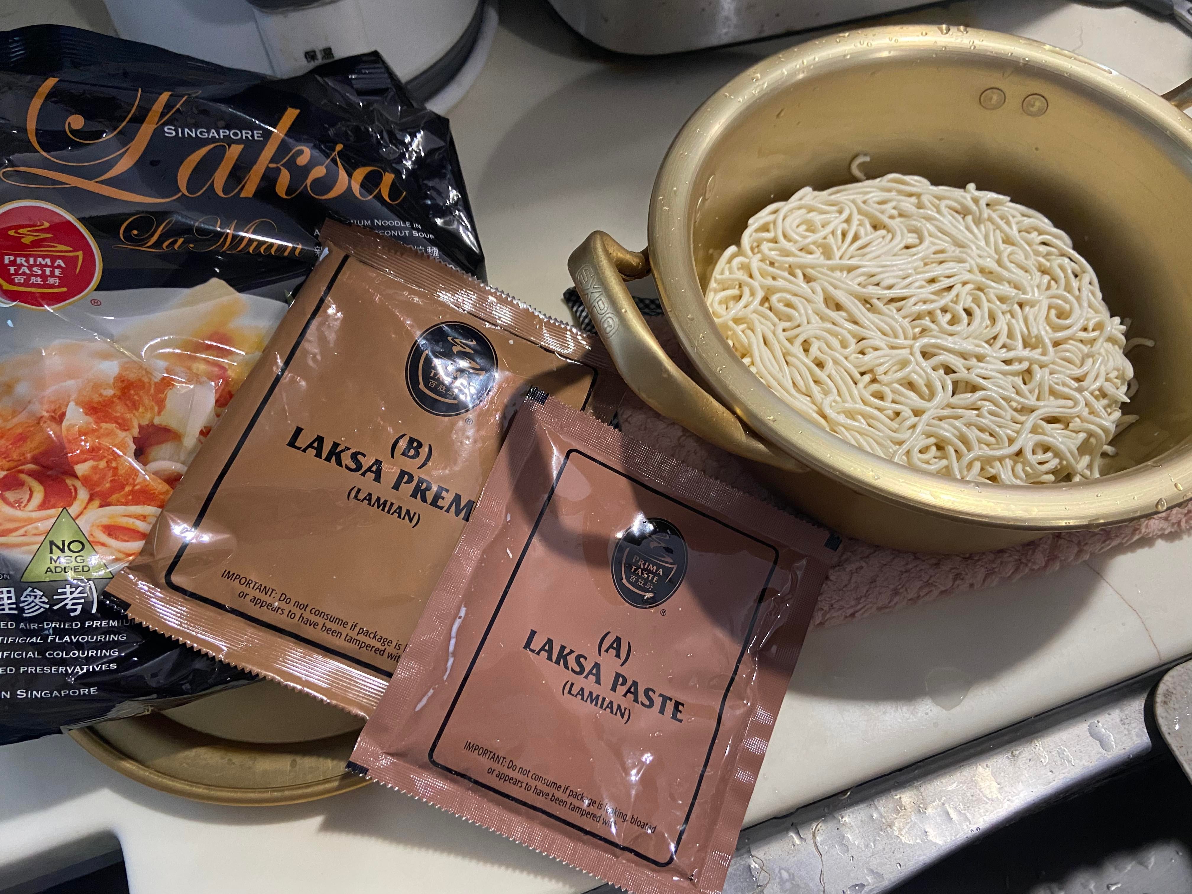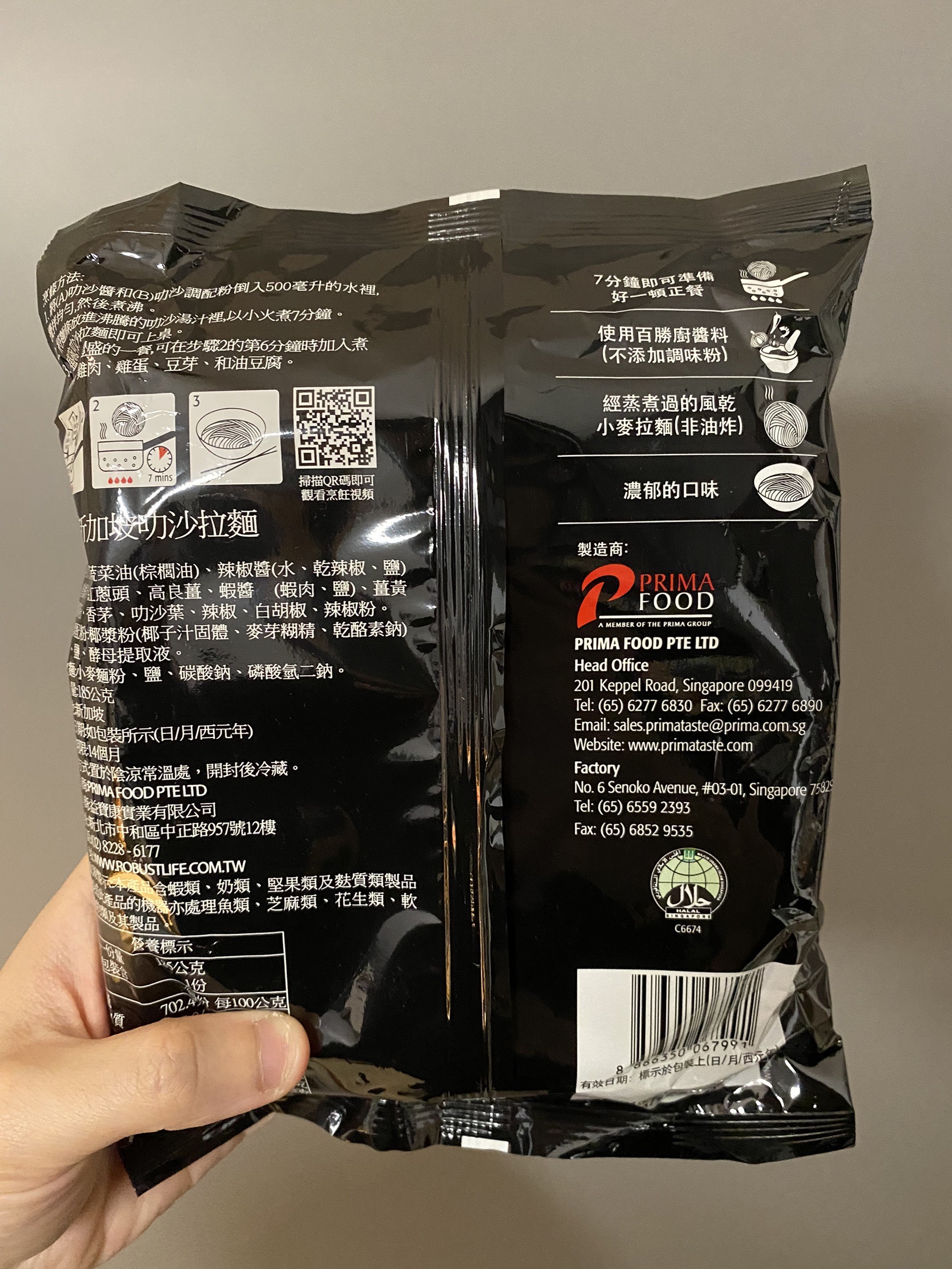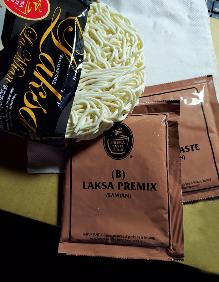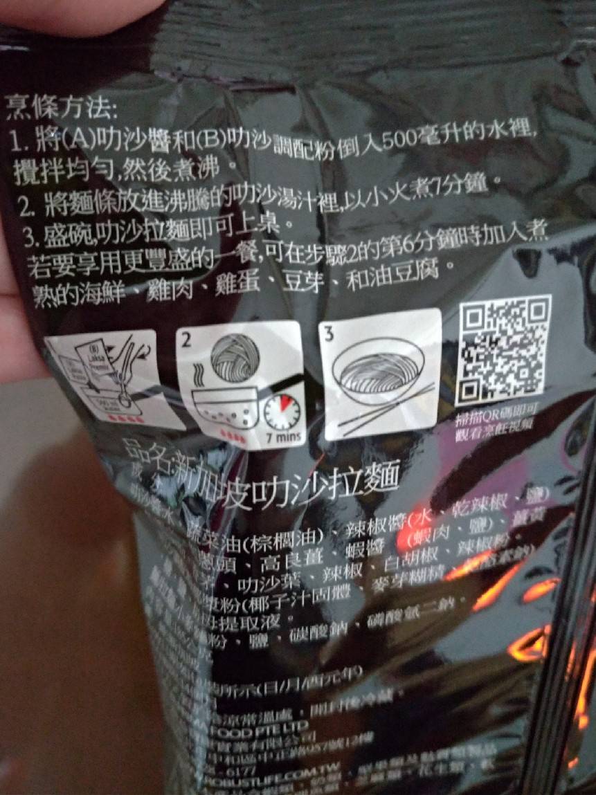 叻沙醬:水、蔬菜油(棕櫚油)、辣椒醬(水、乾辣椒、鹽)、乾蝦米、紅蔥頭、高良薑、蝦醬(蝦肉、鹽)、薑黃、薑黃粉、香茅、叻沙葉、辣椒、白胡椒、辣椒粉