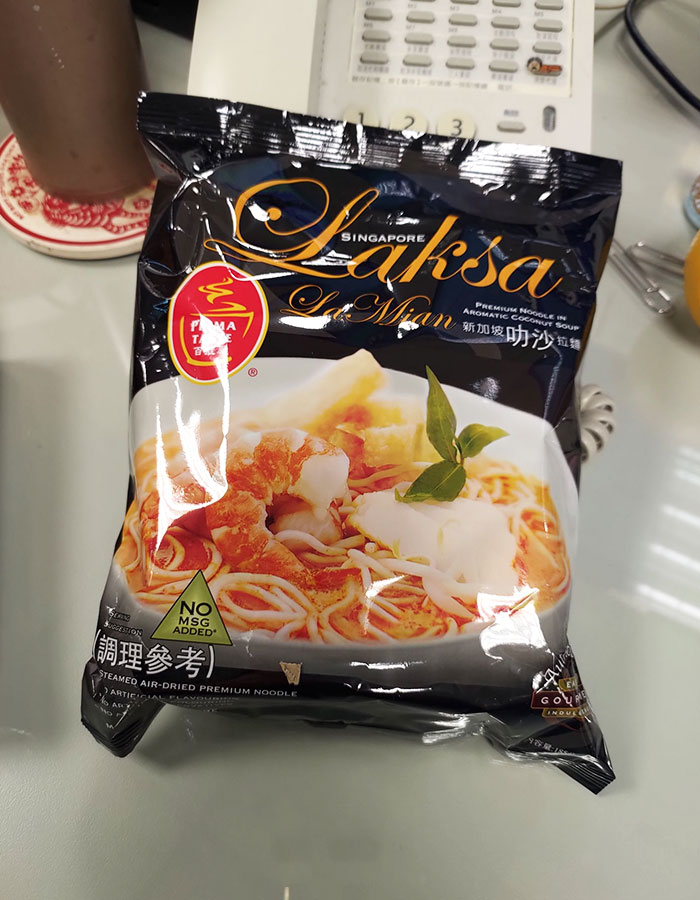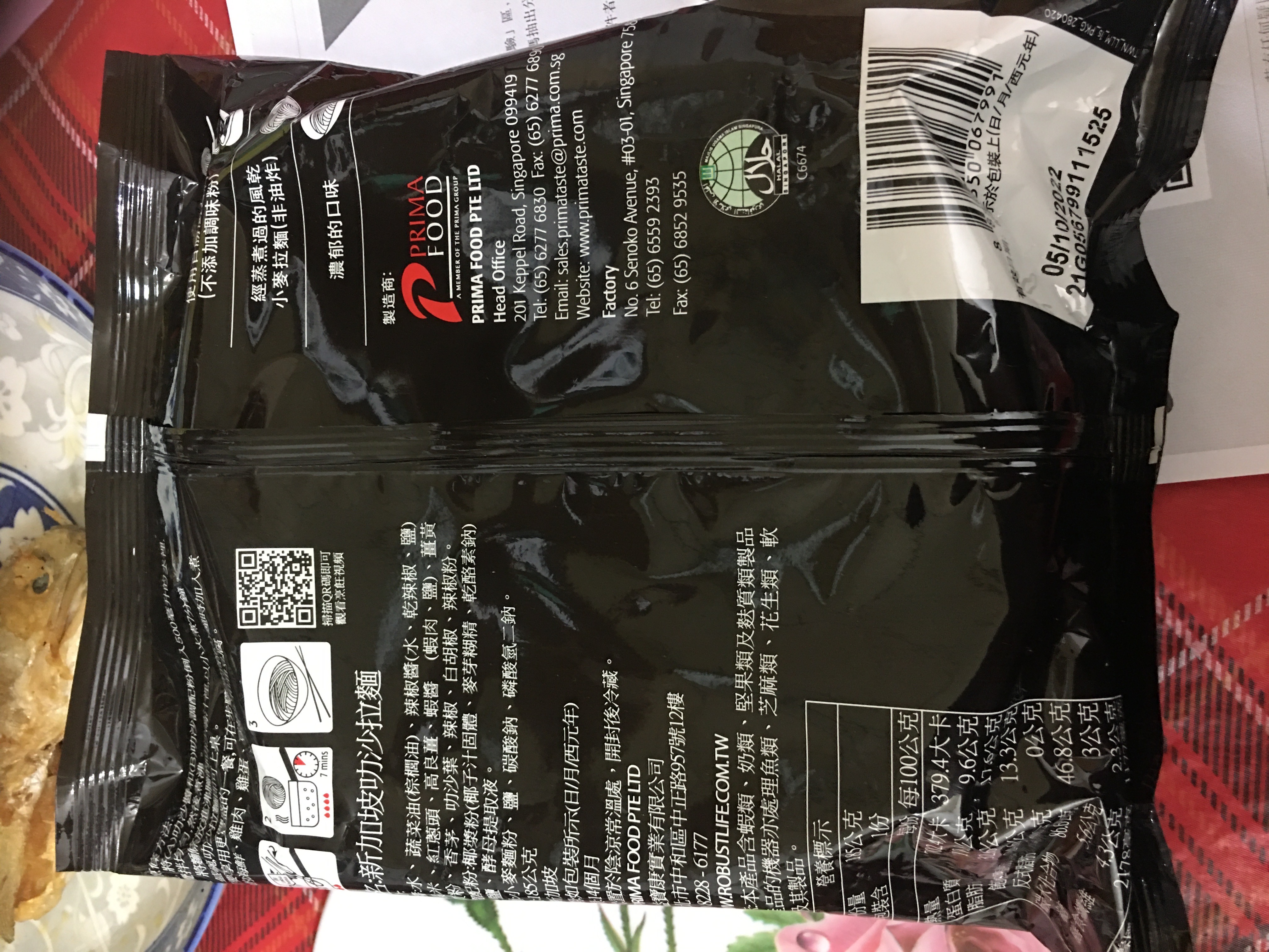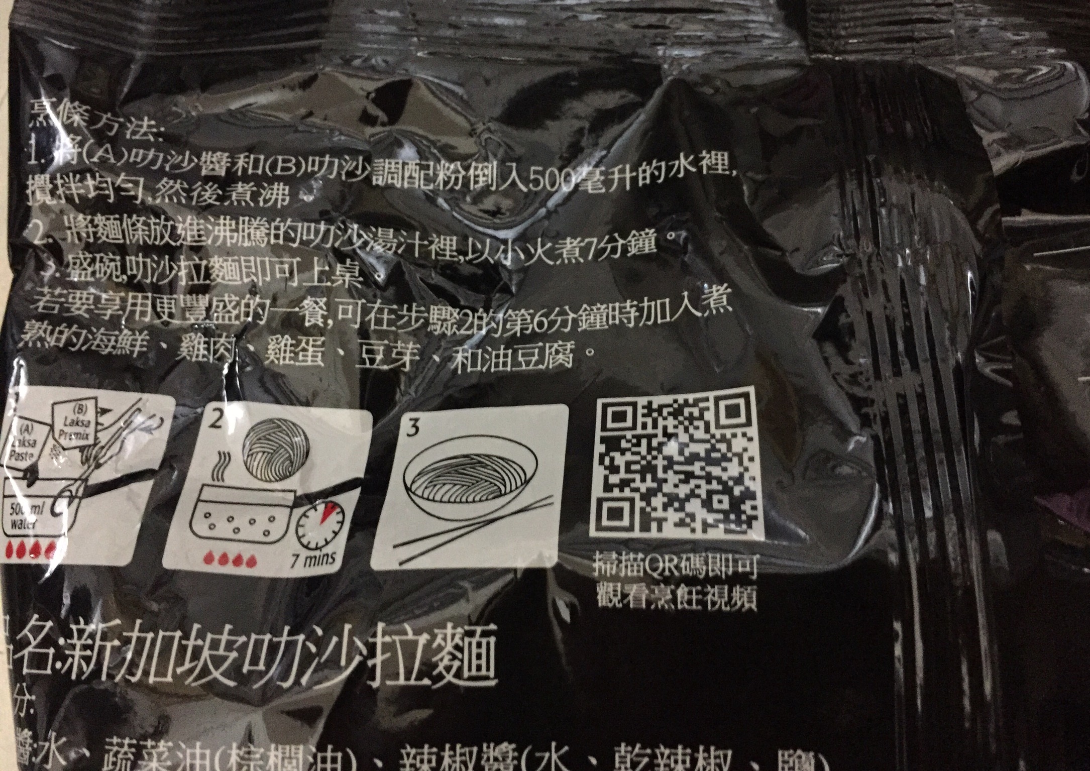 叻沙醬:水、蔬菜油(棕櫚油)、辣椒醬(水、乾辣椒、鹽)、乾蝦米、紅蔥頭、高良薑、蝦醬(蝦肉、鹽)、薑黃、薑黃粉、香茅、叻沙葉、辣椒、白胡椒、辣椒粉
