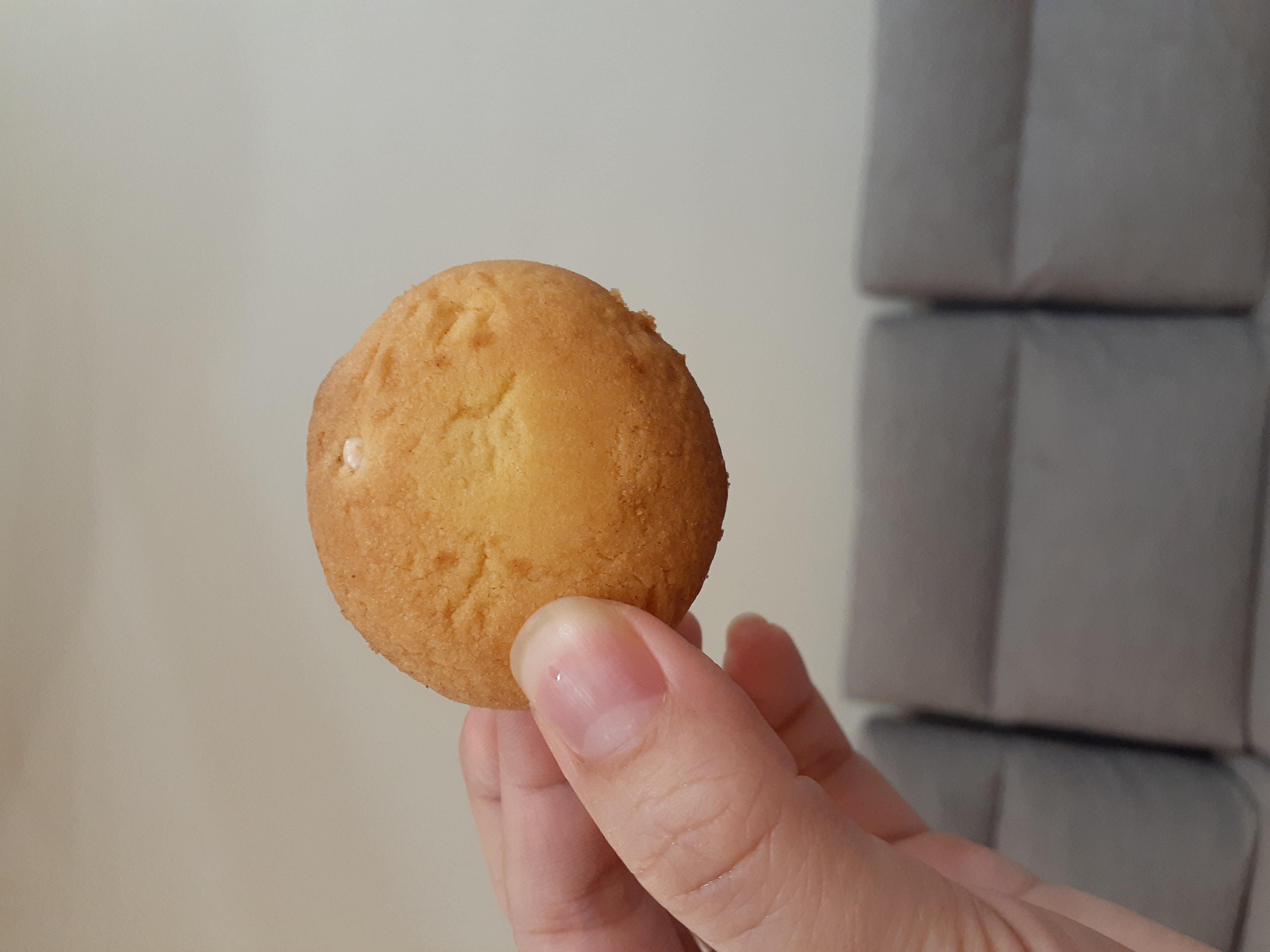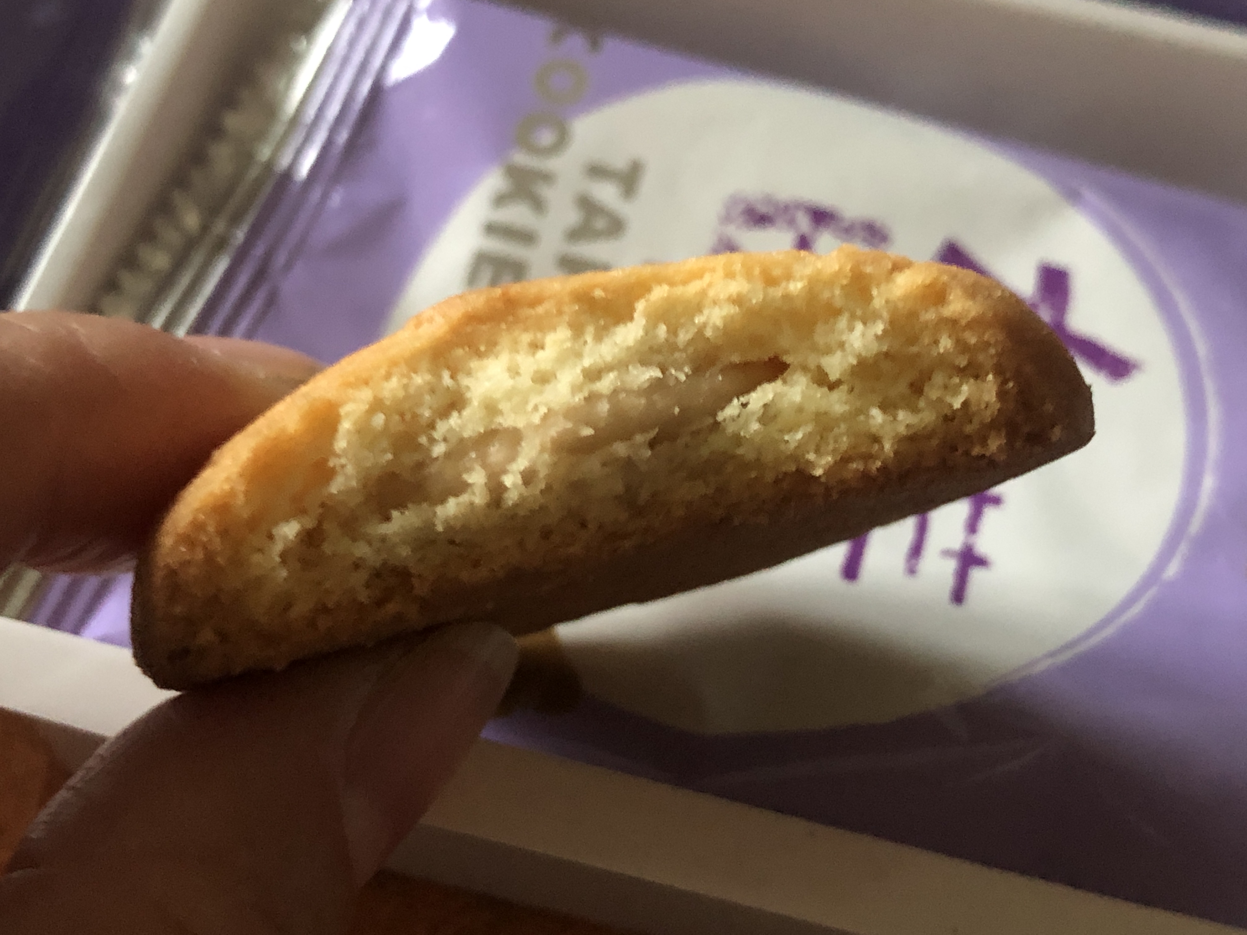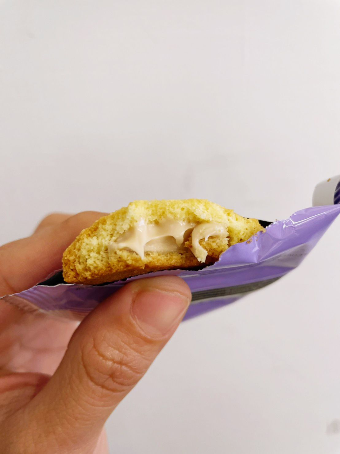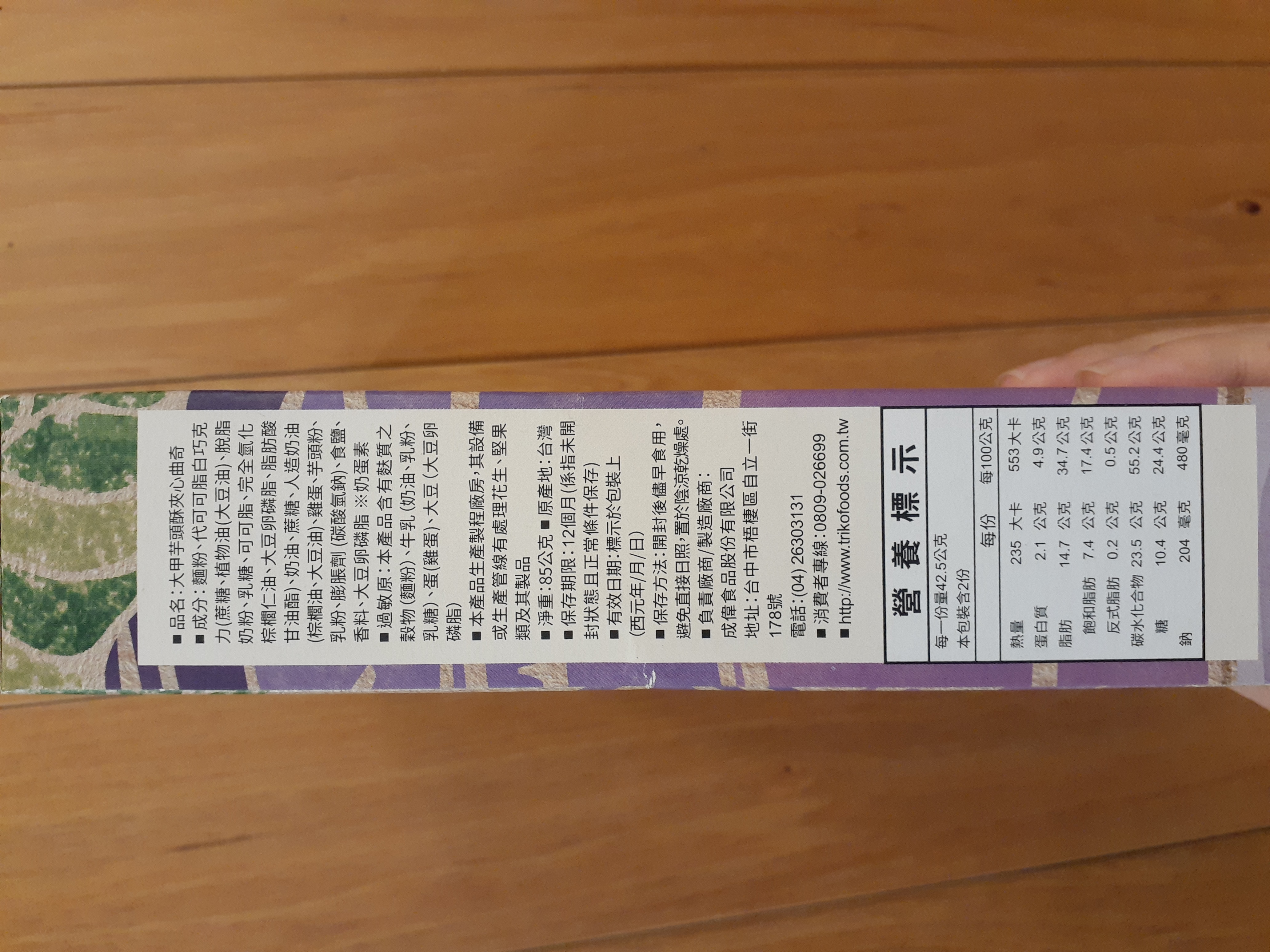 產品成份:麵粉、代可可脂白巧克力(蔗糖、植物油(大豆油)、脫脂奶粉、乳糖、可可脂、完全氫化棕櫚仁油、大豆卵磷脂、脂肪酸甘油酯)、奶油、蔗糖、人造奶油(棕櫚油、大豆油)、雞蛋、芋頭粉、乳粉、膨脹劑 (碳酸氫鈉)、食鹽、香料、大豆卵磷脂。