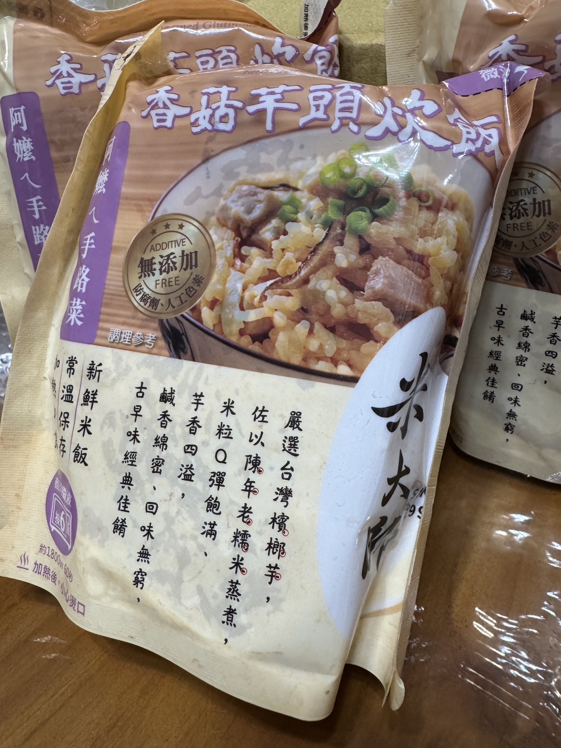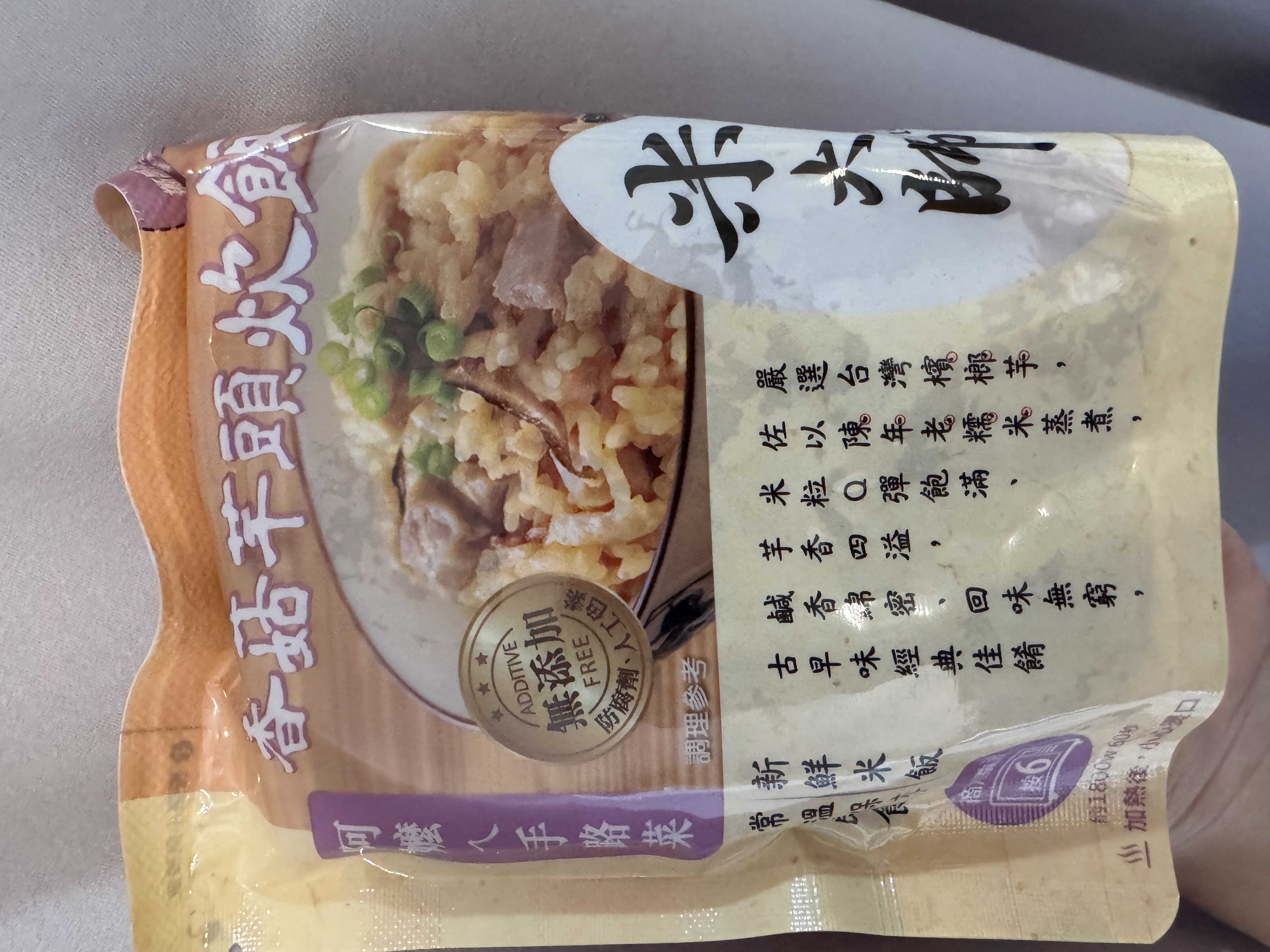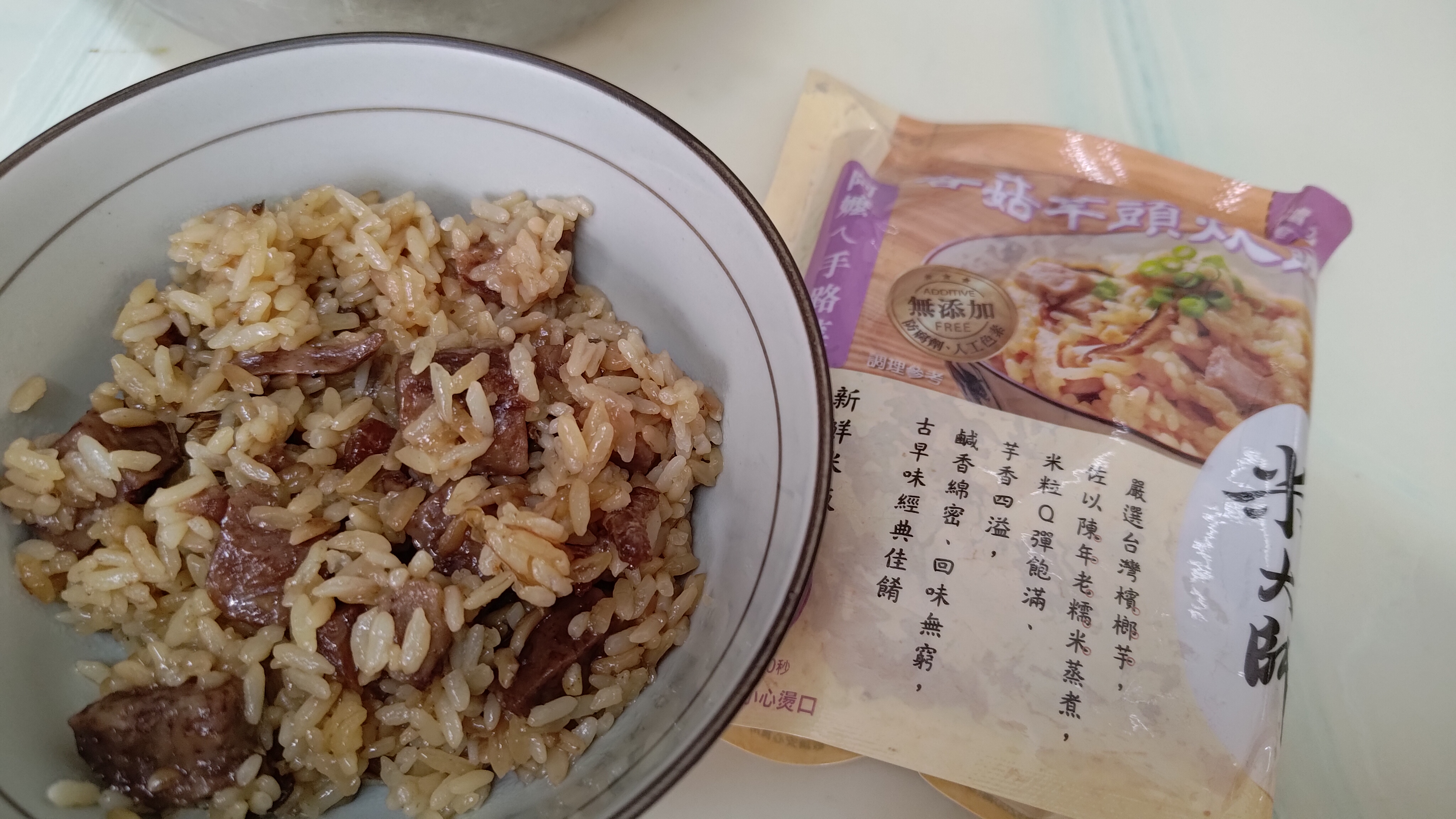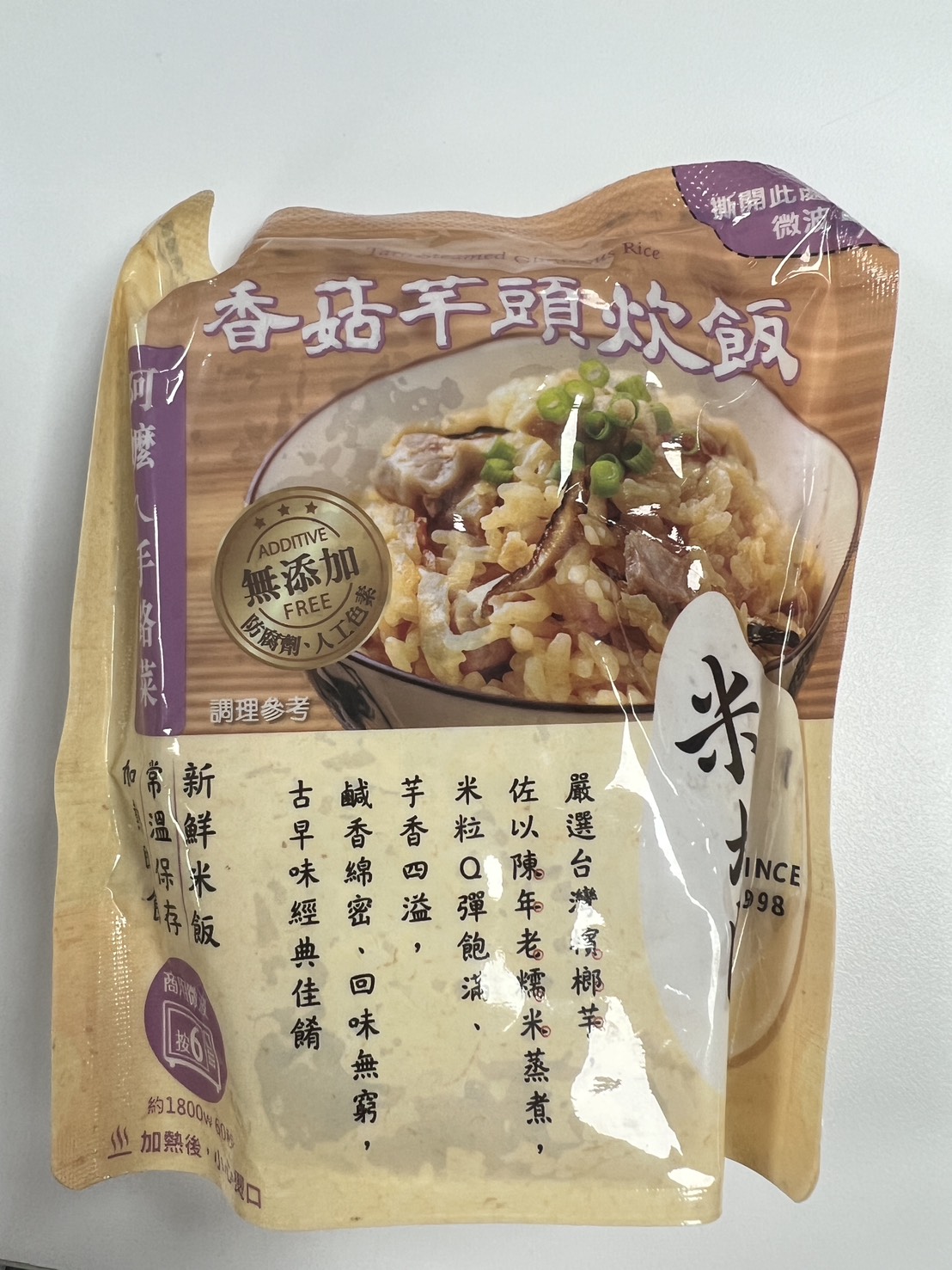 成分:水、白米、芋頭、糯米、香菇、蝦、紅蔥頭、豬油(產地:加拿大)、複方調味粉(L-麩酸鈉、胺基乙酸、琥珀酸二鈉、DL-胺基丙酸、5'-次黃嘌呤核苷磷酸二鈉、5'-鳥嘌呤核苷磷酸二鈉、麥芽糊精、鹽、糖、雞肉抽出物、玉米澱粉、軟質棕油、檸檬酸、洋蔥粉、L-天門冬酸鈉、檸檬酸鈉、二氧化矽)、蔗糖、釀造醬油、食鹽、棕櫚油、紅蔥粉、白胡椒粉、黑胡椒粉、雞肉、西洋芹、白蘿蔔、紅蘿蔔、洋蔥、香蔥調味油(棕櫚油、大豆油、蔥萃取物)、肉燥香料(中鏈三酸甘油脂、香料)、芋頭香料(中鏈三酸甘油脂、芋頭香料)、香菇香料(芝麻油、香料、中鏈三酸甘油脂)