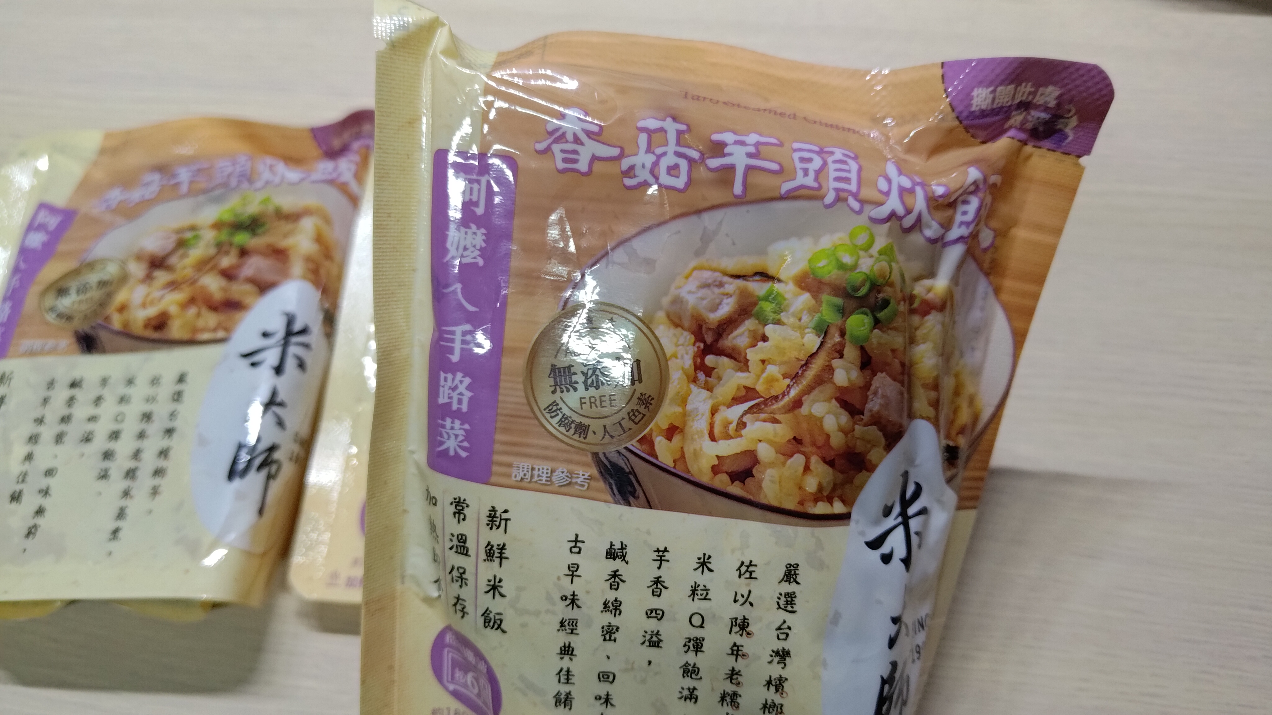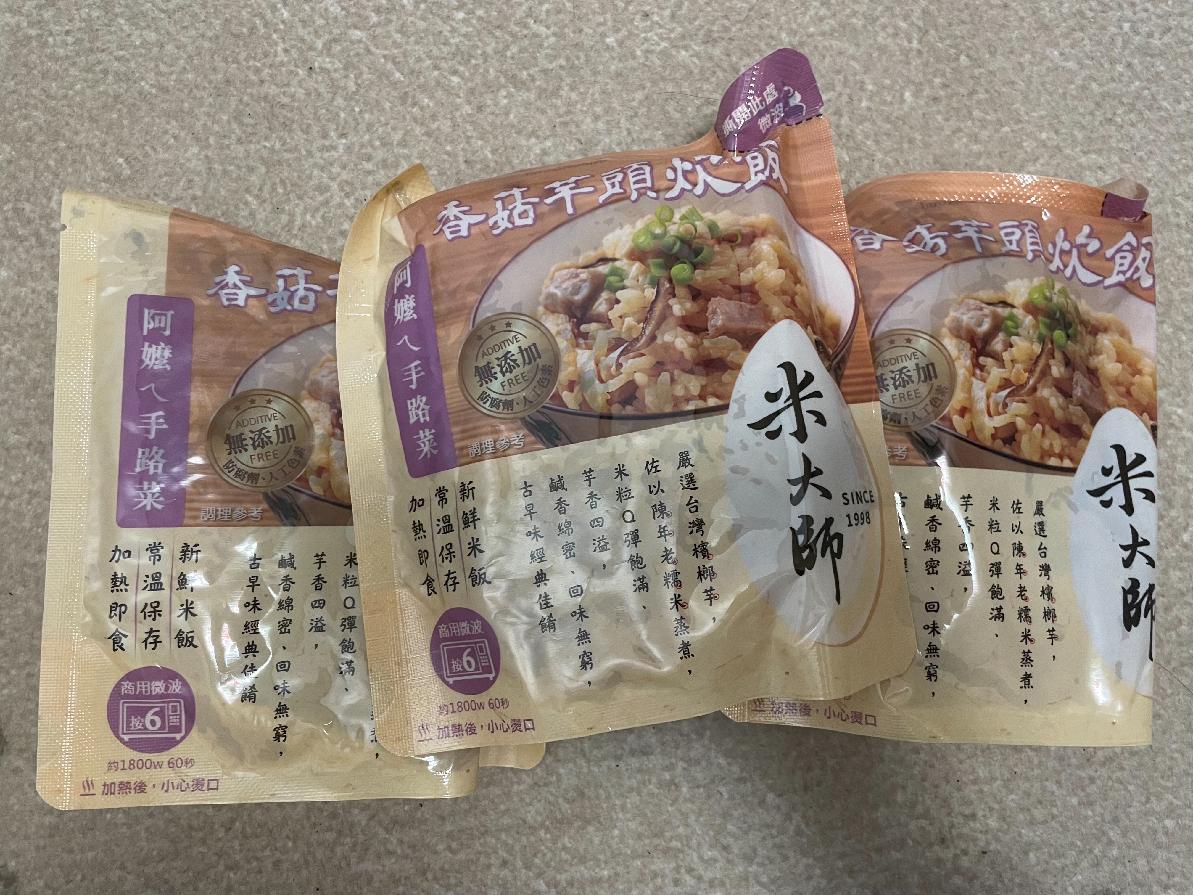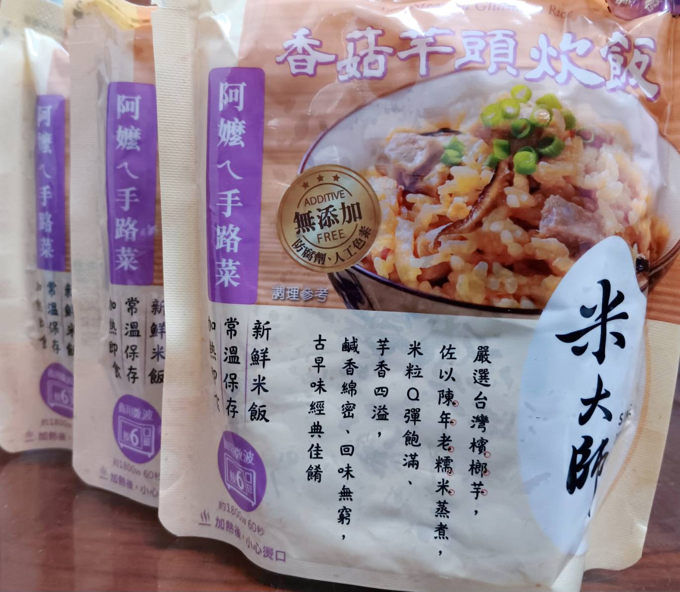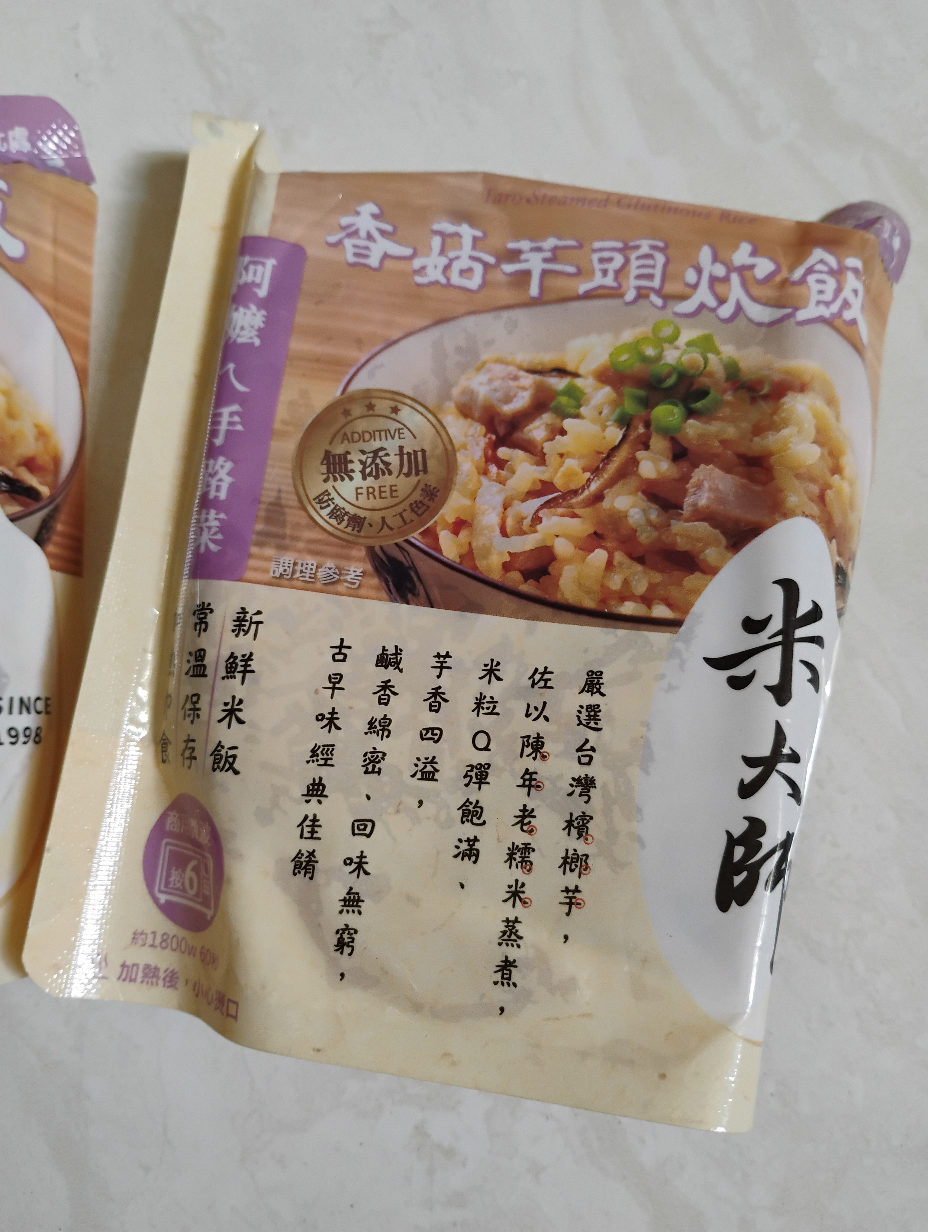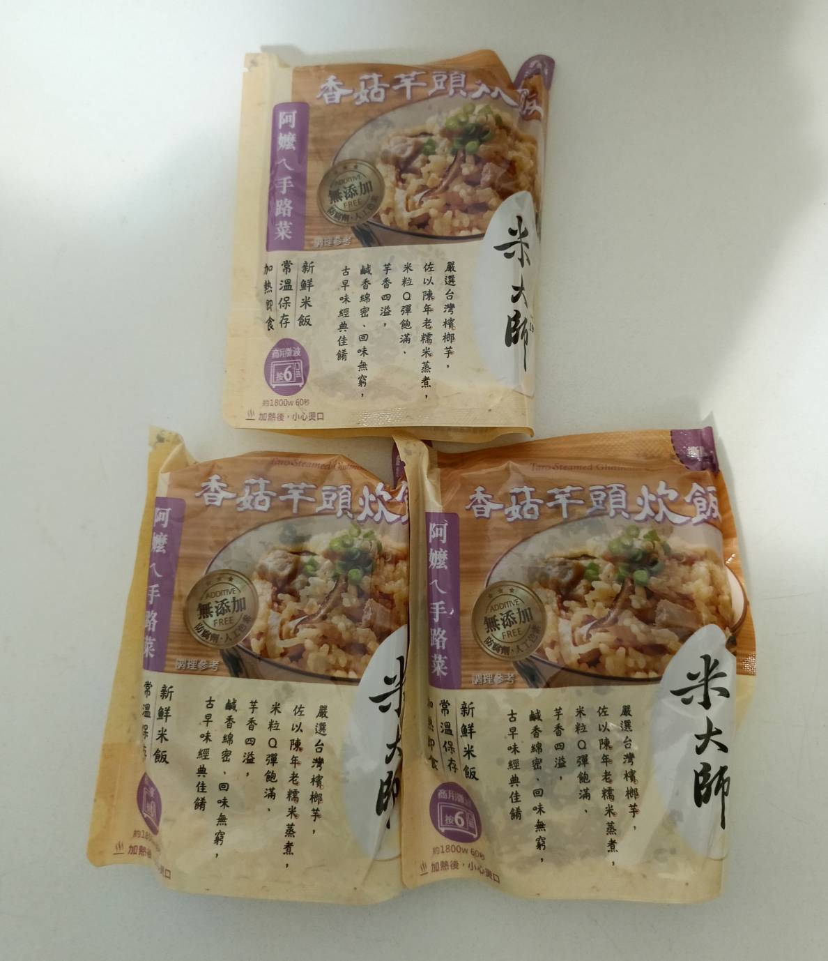 成分:水、白米、芋頭、糯米、香菇、蝦、紅蔥頭、豬油(產地:加拿大)、複方調味粉(L-麩酸鈉、胺基乙酸、琥珀酸二鈉、DL-胺基丙酸、5'-次黃嘌呤核苷磷酸二鈉、5'-鳥嘌呤核苷磷酸二鈉、麥芽糊精、鹽、糖、雞肉抽出物、玉米澱粉、軟質棕油、檸檬酸、洋蔥粉、L-天門冬酸鈉、檸檬酸鈉、二氧化矽)、蔗糖、釀造醬油、食鹽、棕櫚油、紅蔥粉、白胡椒粉、黑胡椒粉、雞肉、西洋芹、白蘿蔔、紅蘿蔔、洋蔥、香蔥調味油(棕櫚油、大豆油、蔥萃取物)、肉燥香料(中鏈三酸甘油脂、香料)、芋頭香料(中鏈三酸甘油脂、芋頭香料)、香菇香料(芝麻油、香料、中鏈三酸甘油脂)