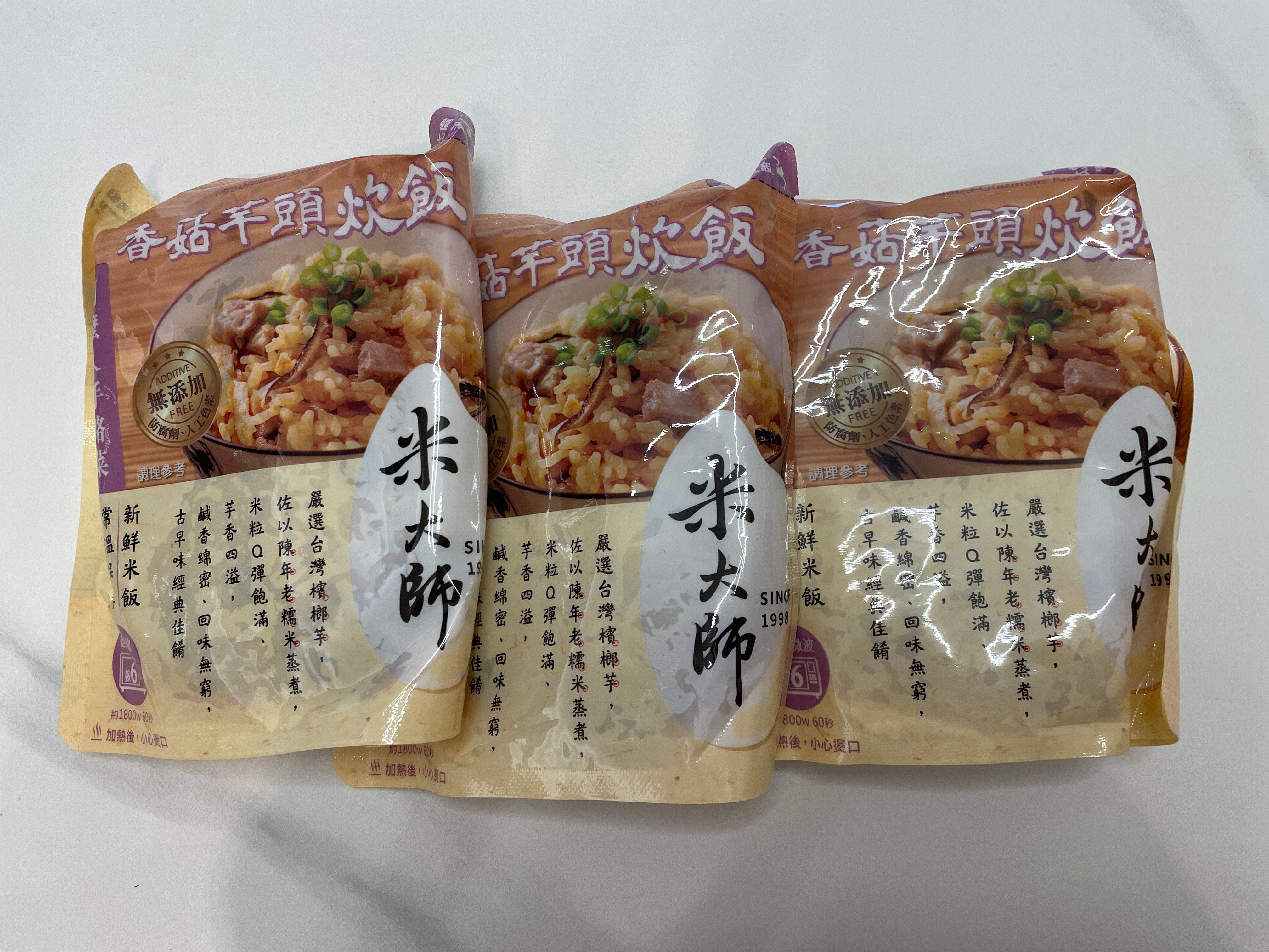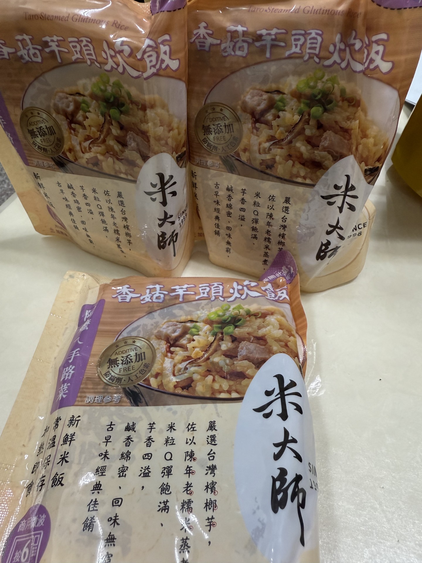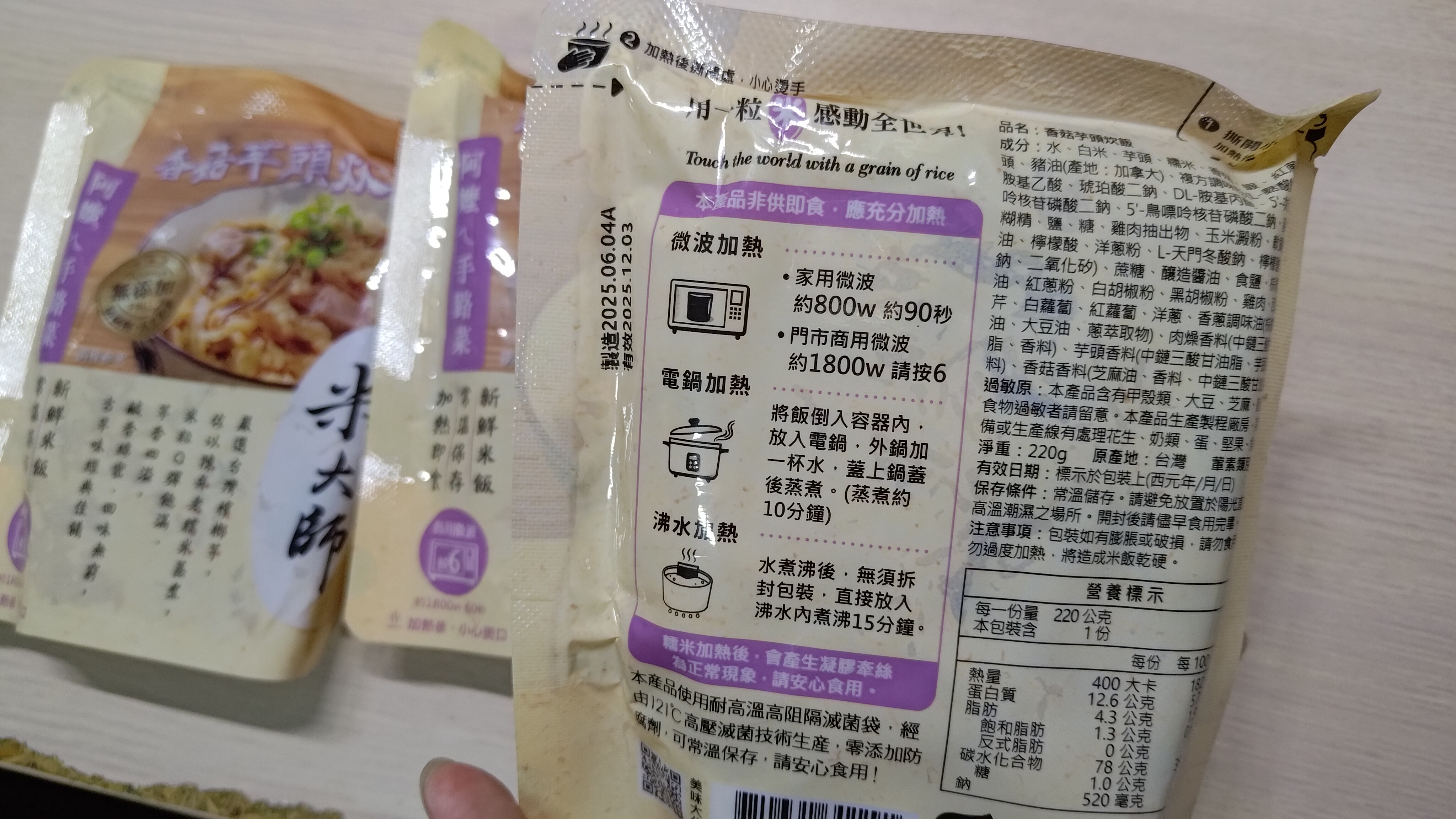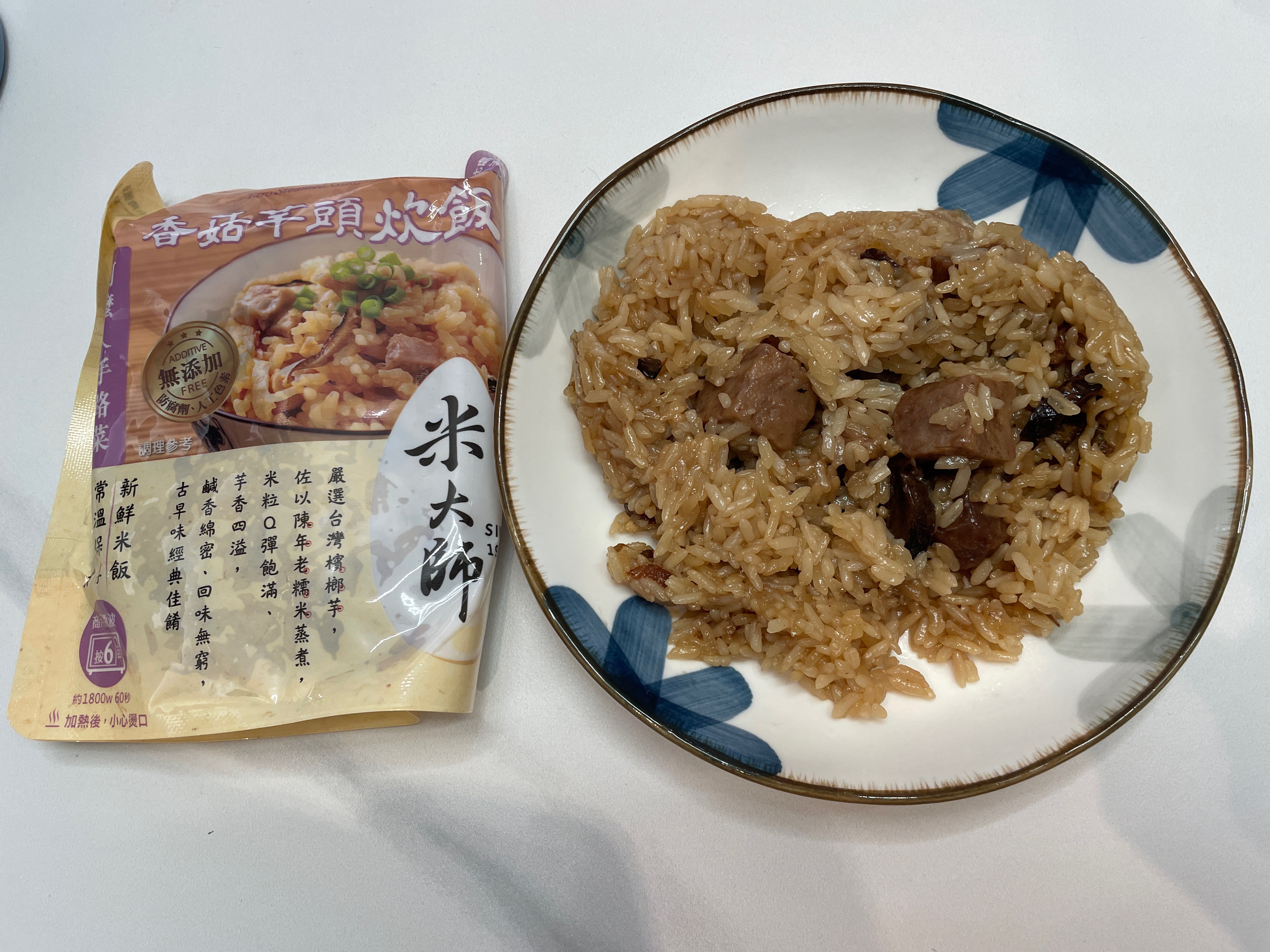 成分:水、白米、芋頭、糯米、香菇、蝦、紅蔥頭、豬油(產地:加拿大)、複方調味粉(L-麩酸鈉、胺基乙酸、琥珀酸二鈉、DL-胺基丙酸、5'-次黃嘌呤核苷磷酸二鈉、5'-鳥嘌呤核苷磷酸二鈉、麥芽糊精、鹽、糖、雞肉抽出物、玉米澱粉、軟質棕油、檸檬酸、洋蔥粉、L-天門冬酸鈉、檸檬酸鈉、二氧化矽)、蔗糖、釀造醬油、食鹽、棕櫚油、紅蔥粉、白胡椒粉、黑胡椒粉、雞肉、西洋芹、白蘿蔔、紅蘿蔔、洋蔥、香蔥調味油(棕櫚油、大豆油、蔥萃取物)、肉燥香料(中鏈三酸甘油脂、香料)、芋頭香料(中鏈三酸甘油脂、芋頭香料)、香菇香料(芝麻油、香料、中鏈三酸甘油脂)