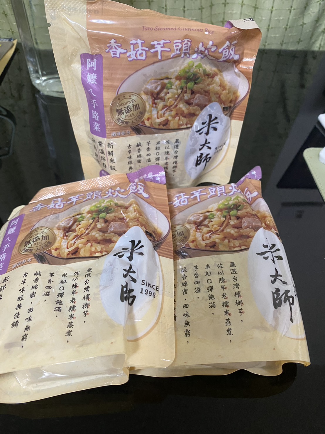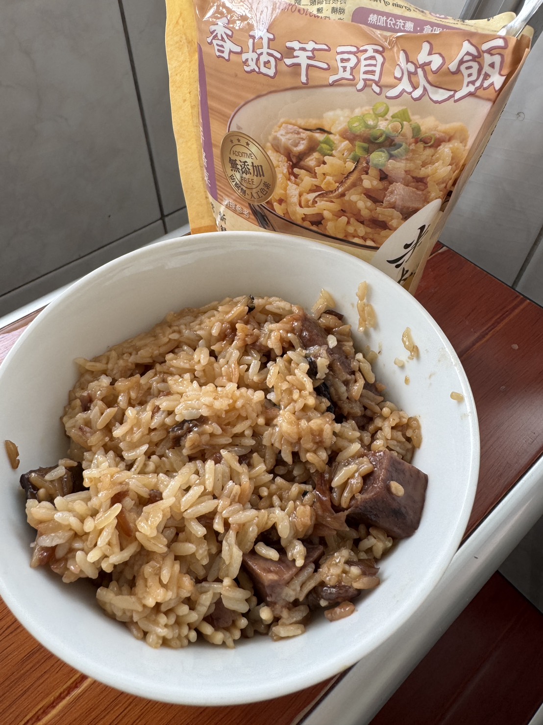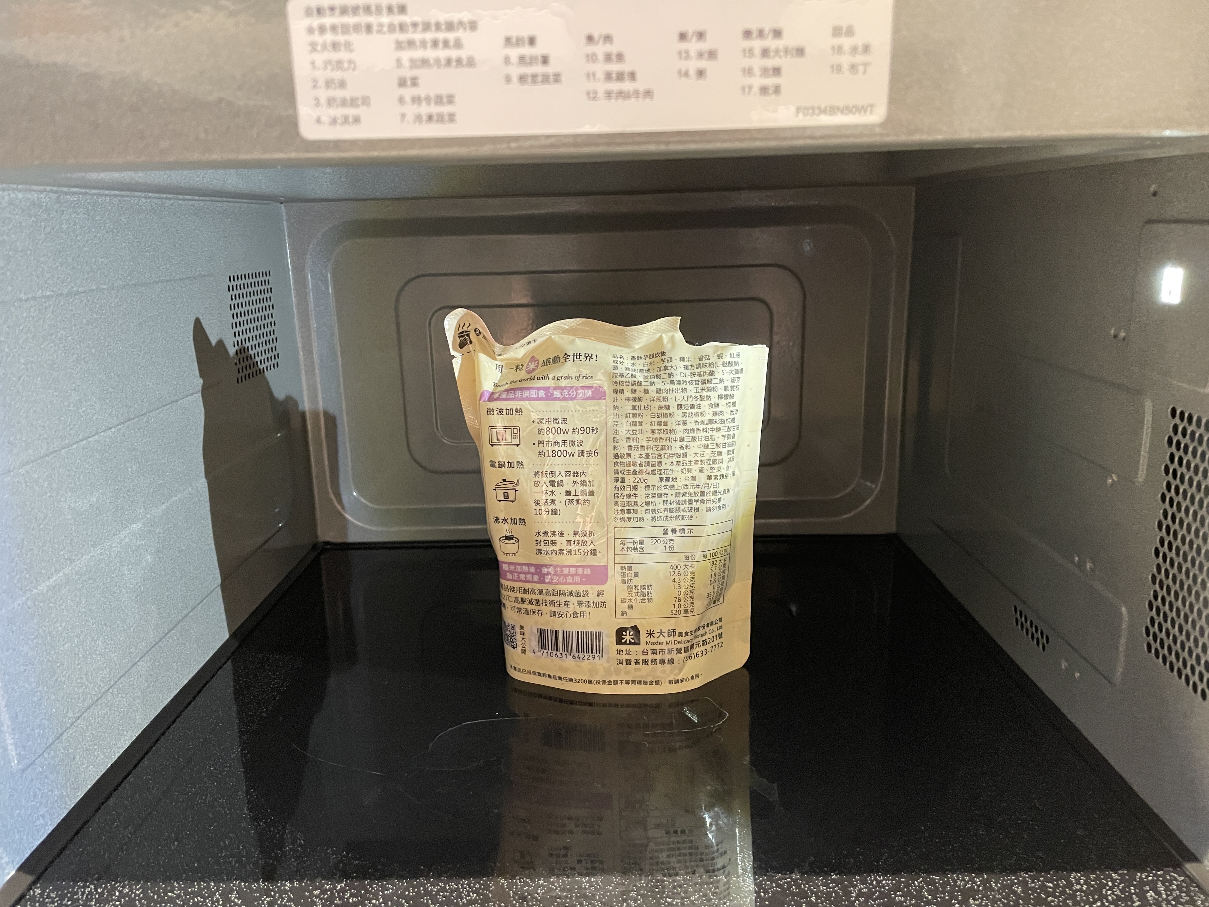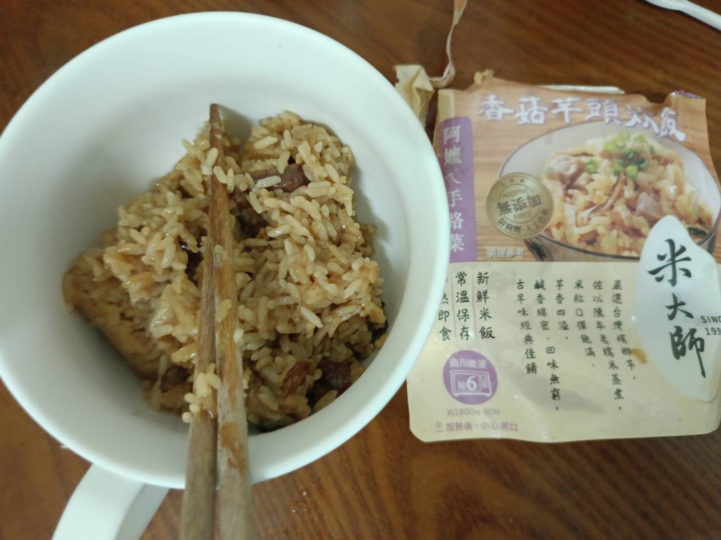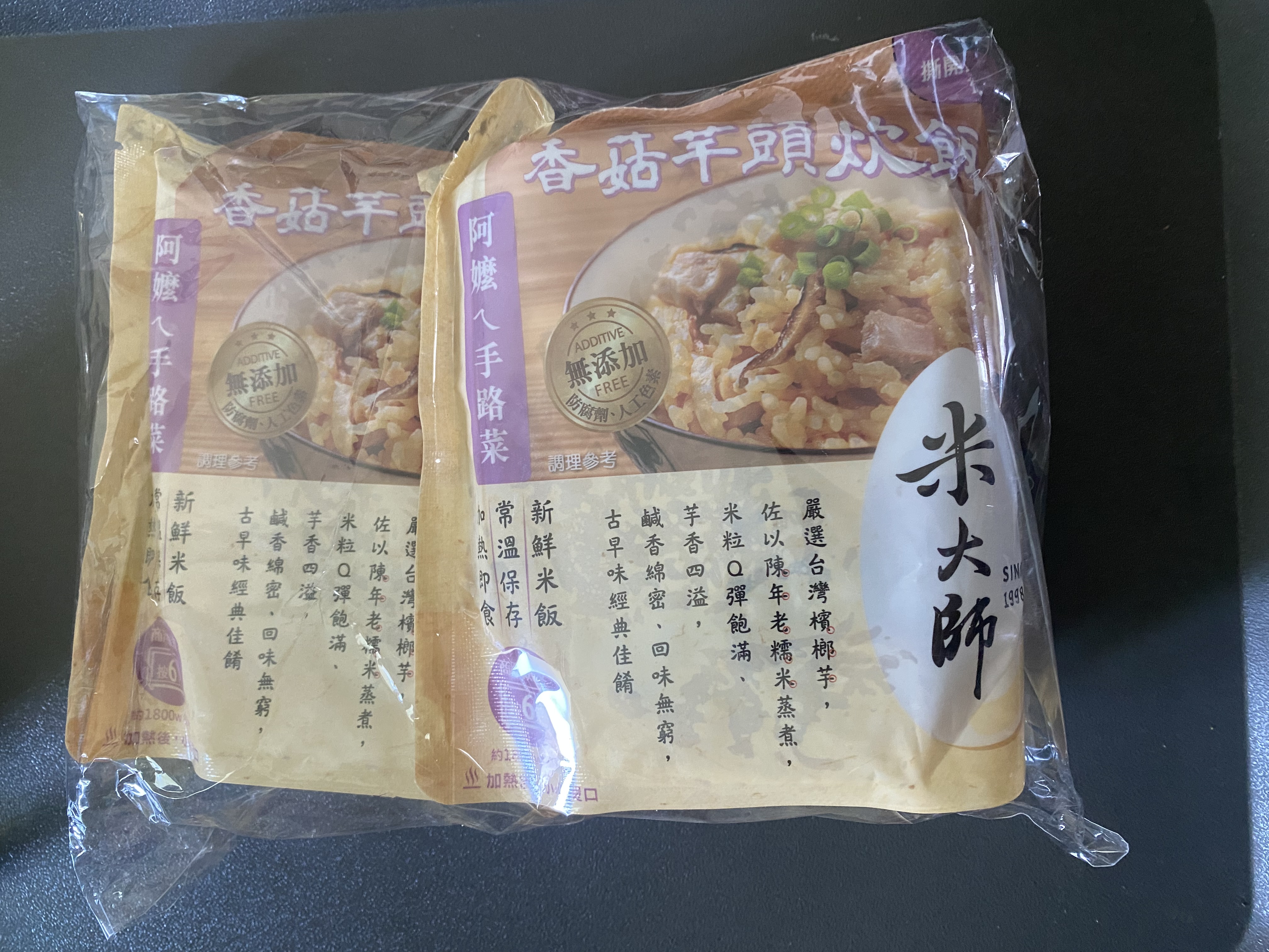成分:水、白米、芋頭、糯米、香菇、蝦、紅蔥頭、豬油(產地:加拿大)、複方調味粉(L-麩酸鈉、胺基乙酸、琥珀酸二鈉、DL-胺基丙酸、5'-次黃嘌呤核苷磷酸二鈉、5'-鳥嘌呤核苷磷酸二鈉、麥芽糊精、鹽、糖、雞肉抽出物、玉米澱粉、軟質棕油、檸檬酸、洋蔥粉、L-天門冬酸鈉、檸檬酸鈉、二氧化矽)、蔗糖、釀造醬油、食鹽、棕櫚油、紅蔥粉、白胡椒粉、黑胡椒粉、雞肉、西洋芹、白蘿蔔、紅蘿蔔、洋蔥、香蔥調味油(棕櫚油、大豆油、蔥萃取物)、肉燥香料(中鏈三酸甘油脂、香料)、芋頭香料(中鏈三酸甘油脂、芋頭香料)、香菇香料(芝麻油、香料、中鏈三酸甘油脂)