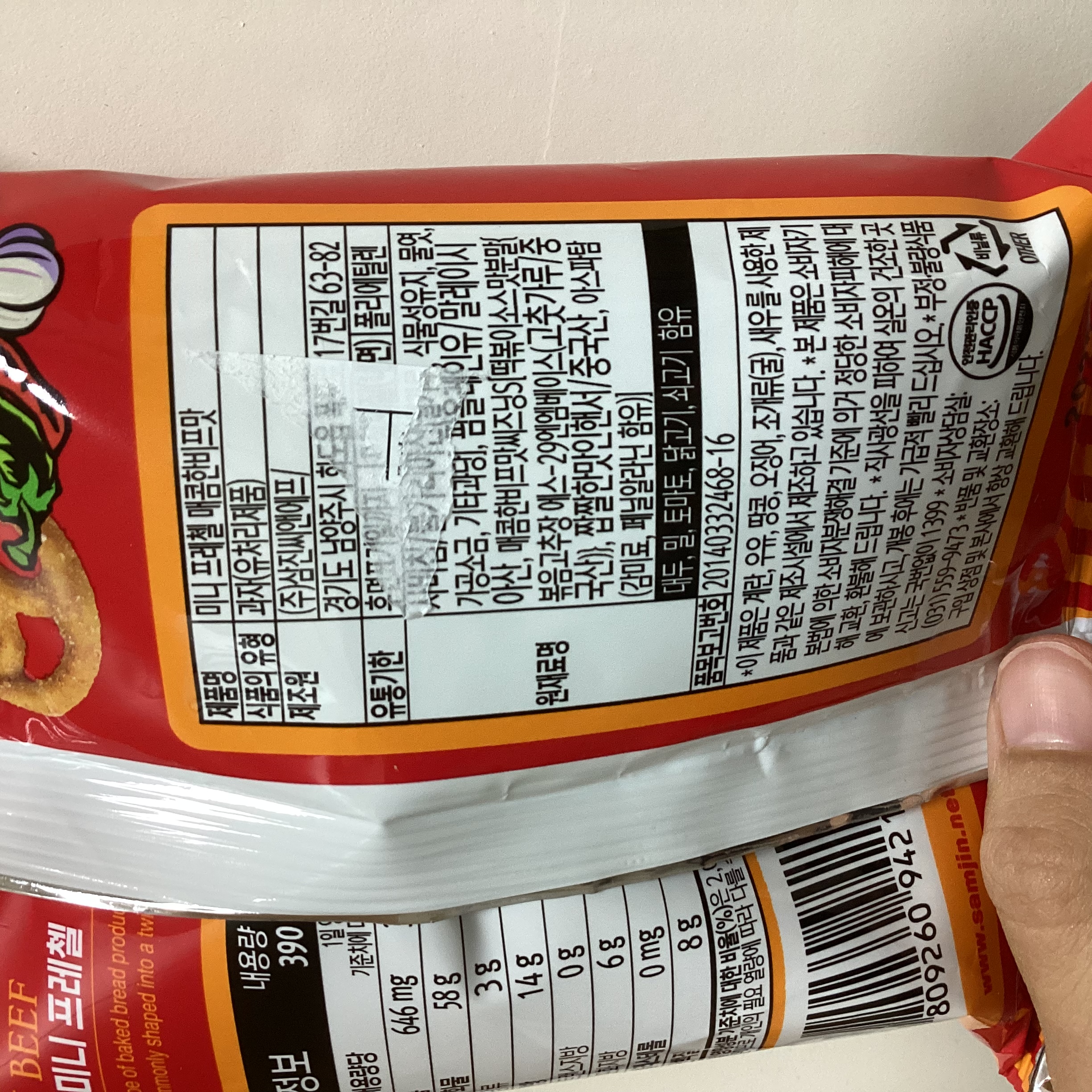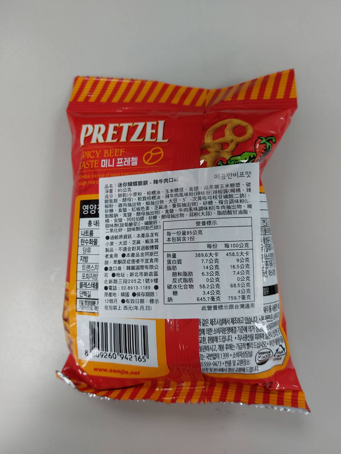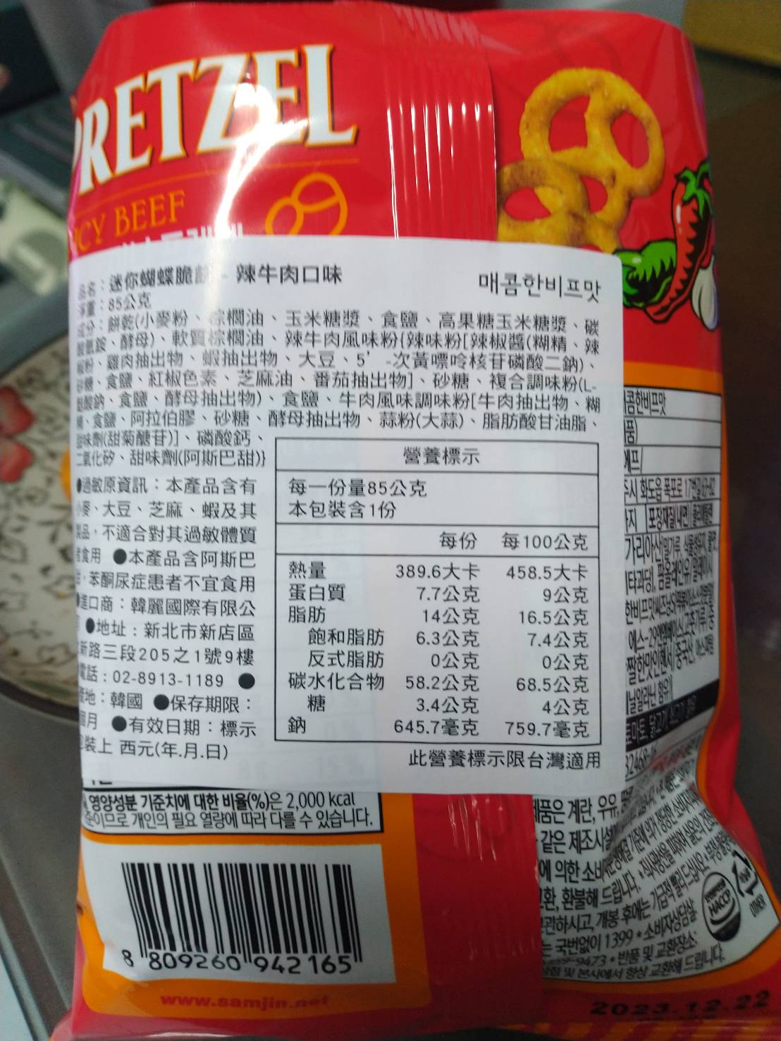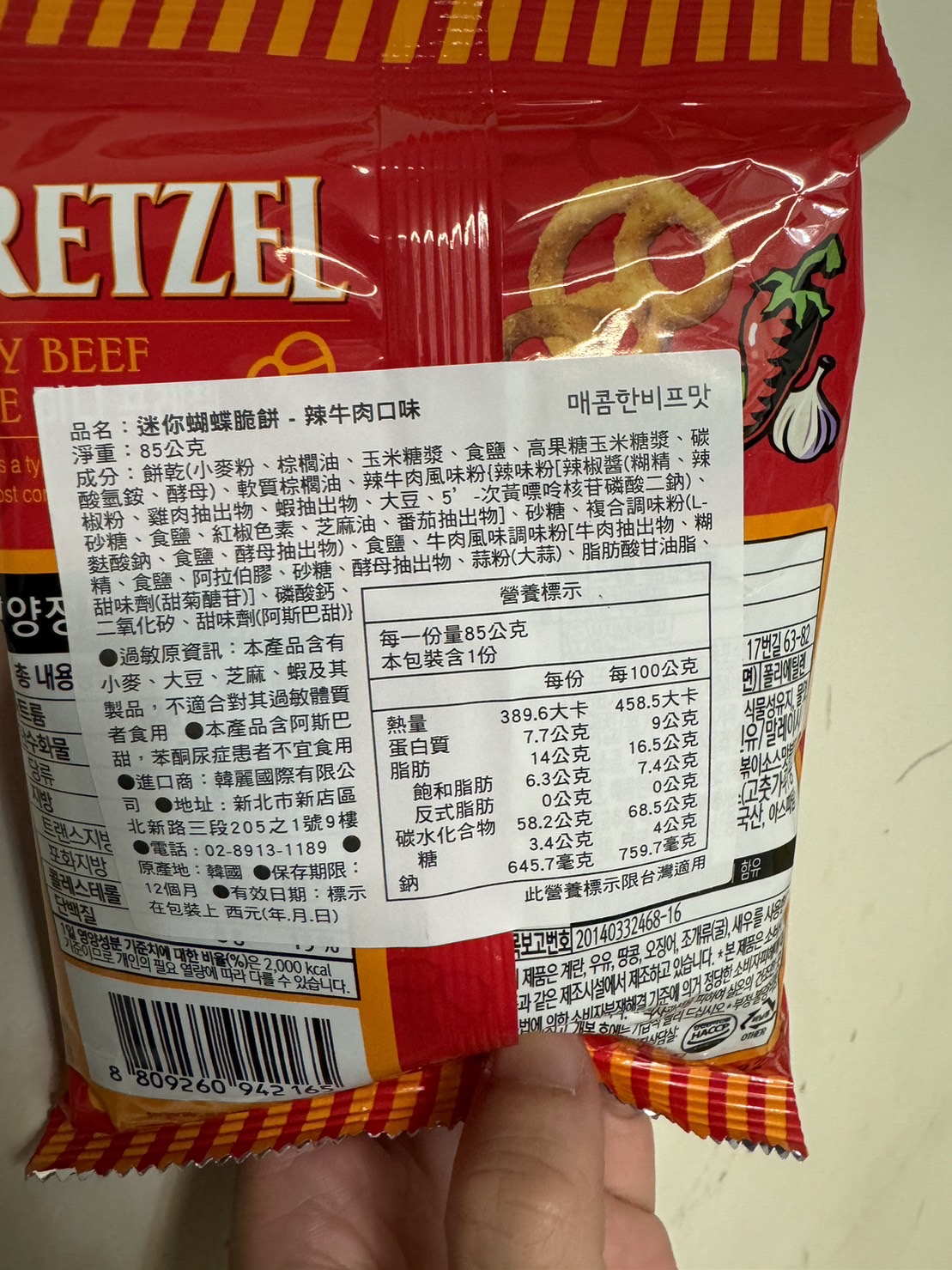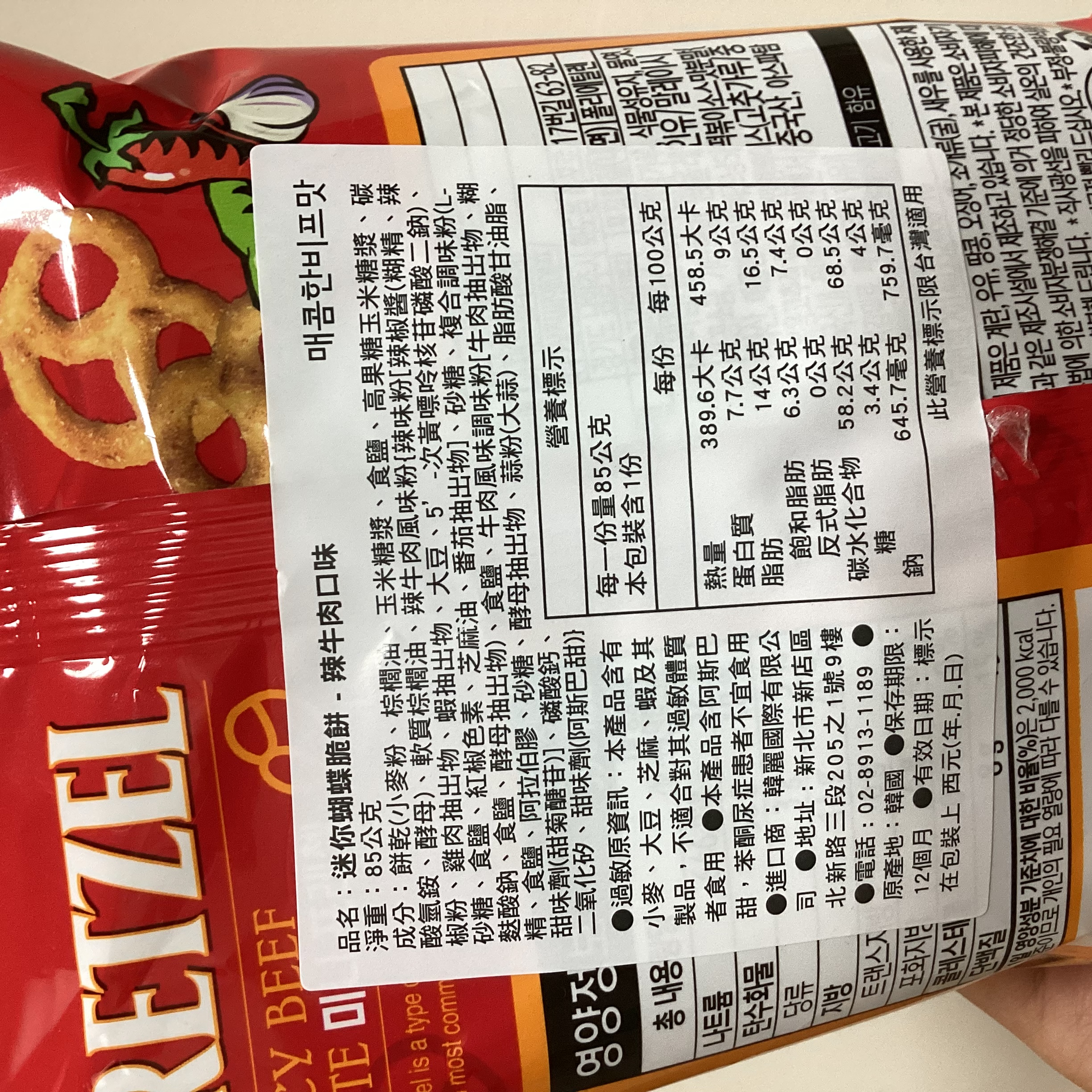 軟質棕櫚油、辣牛肉風味粉(韓國產)、辣味粉、辣椒醬(糊精、辣椒粉、雞肉抽出物、蝦抽出物、大豆、5’-次黃嘌呤核磷酸二鈉)、砂糖、食鹽、紅椒色素、芝麻油、番茄抽出物、砂糖、複合調味粉(L-麩酸鈉、食鹽、酵母抽出物)、食鹽、牛肉風味調味粉(牛肉抽出物)、糊精、食鹽、阿拉伯膠、砂糖、酵母抽出物、蒜粉(大蒜)、脂肪酸甘油脂、甜味劑(甜菊醣、磷酸鈣、二氧化矽、阿斯巴甜)
