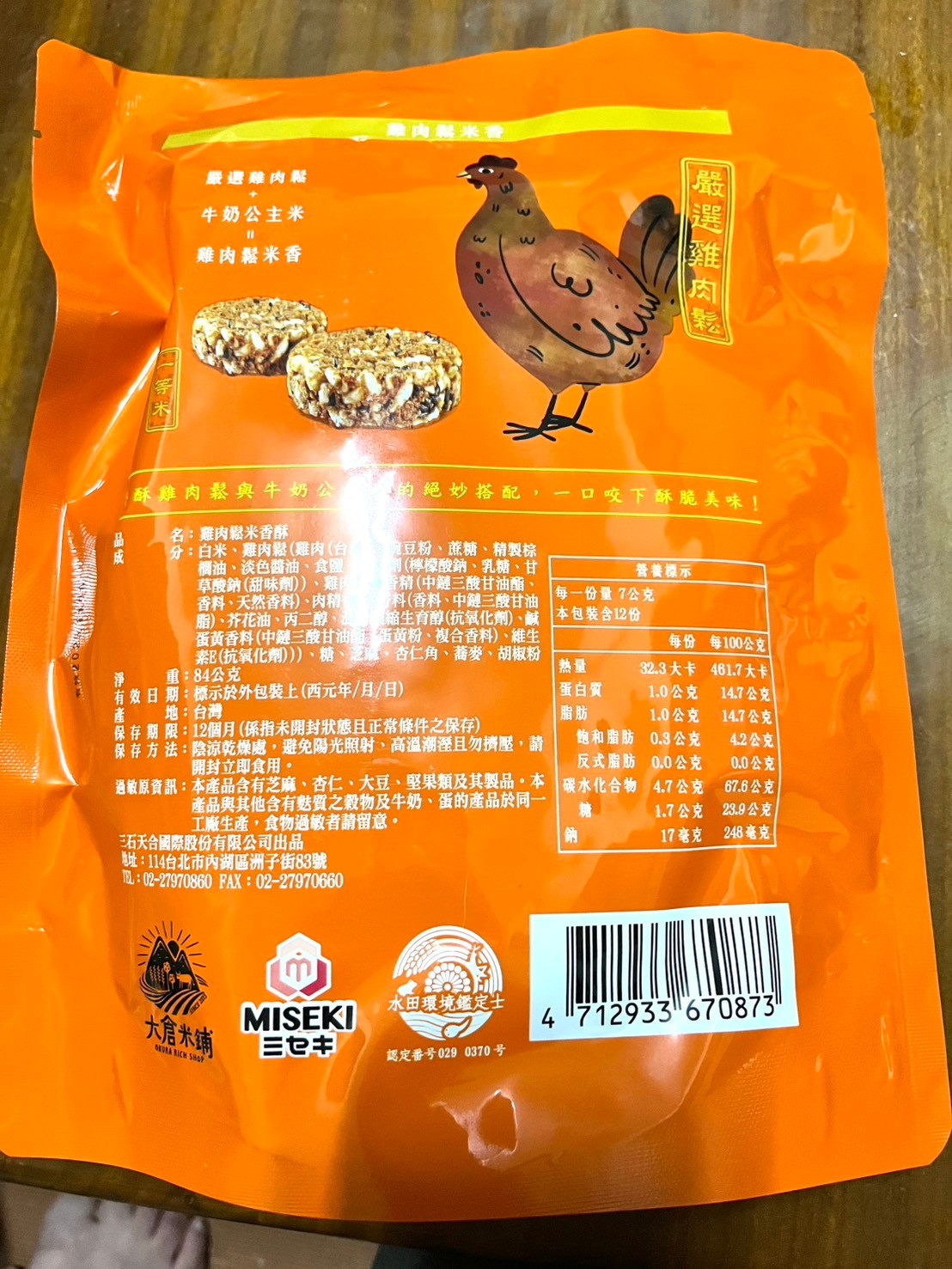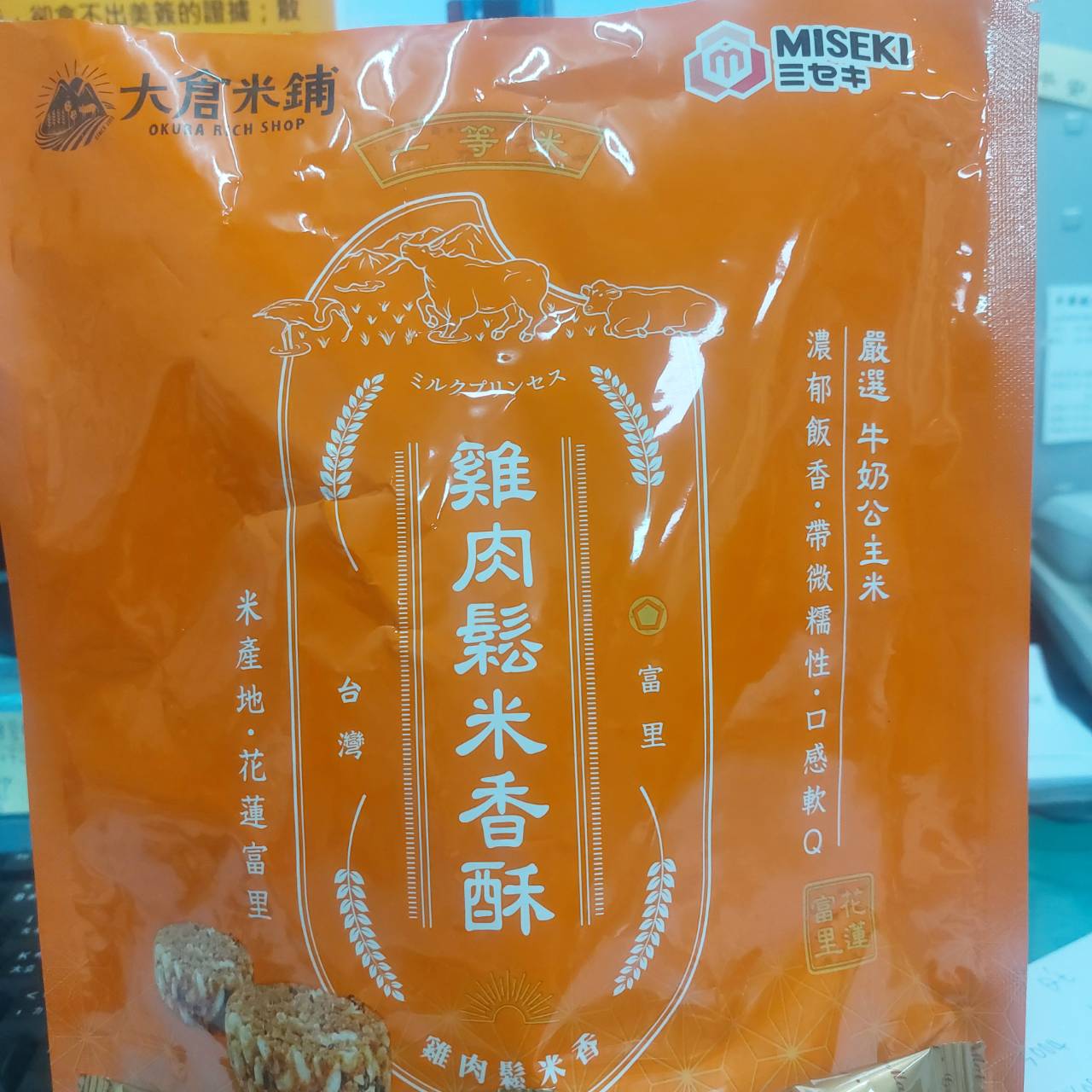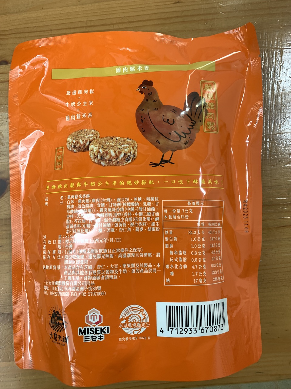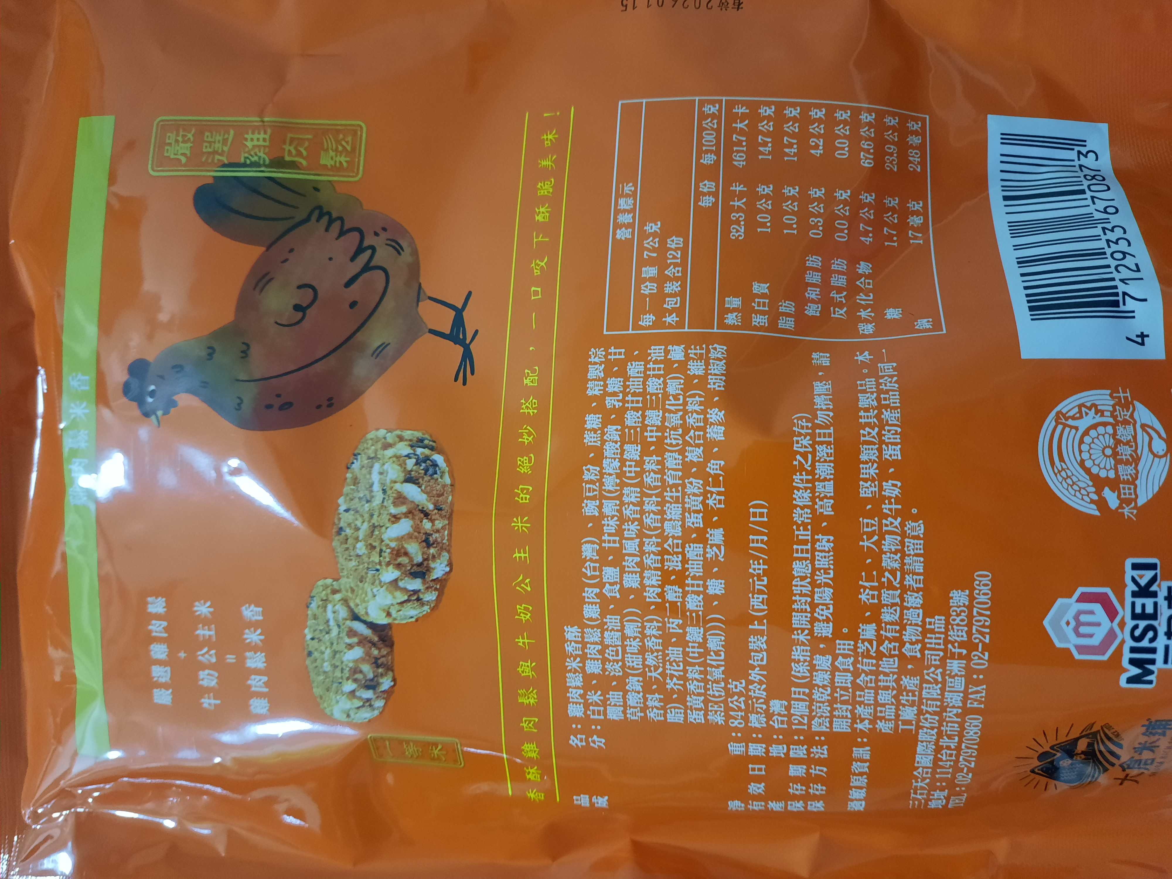 白米、雞肉鬆((雞肉(台灣)、豌豆粉、蔗糖、精製棕櫚油、淡色醬油、食鹽、甘味劑(檸檬酸鈉、乳糖、甘草酸鈉(甜味劑))、雞肉風味香精(中鏈三酸甘油酯香料、天然香料)肉精香料(香料(香料、中鏈三酸甘油脂)、芥花油、丙二醇、混合濃縮生育醇(抗氧化劑)、鹹蛋黃香料(中鏈三酸甘油酯粉、蛋黃粉、複合香料) 維生素E(抗氧化劑))、糖、芝麻、杏仁角、蕎麥、胡椒粉、麥芽糖粉、黑芝麻、杏仁角、蕎麥、胡椒粉、蒜