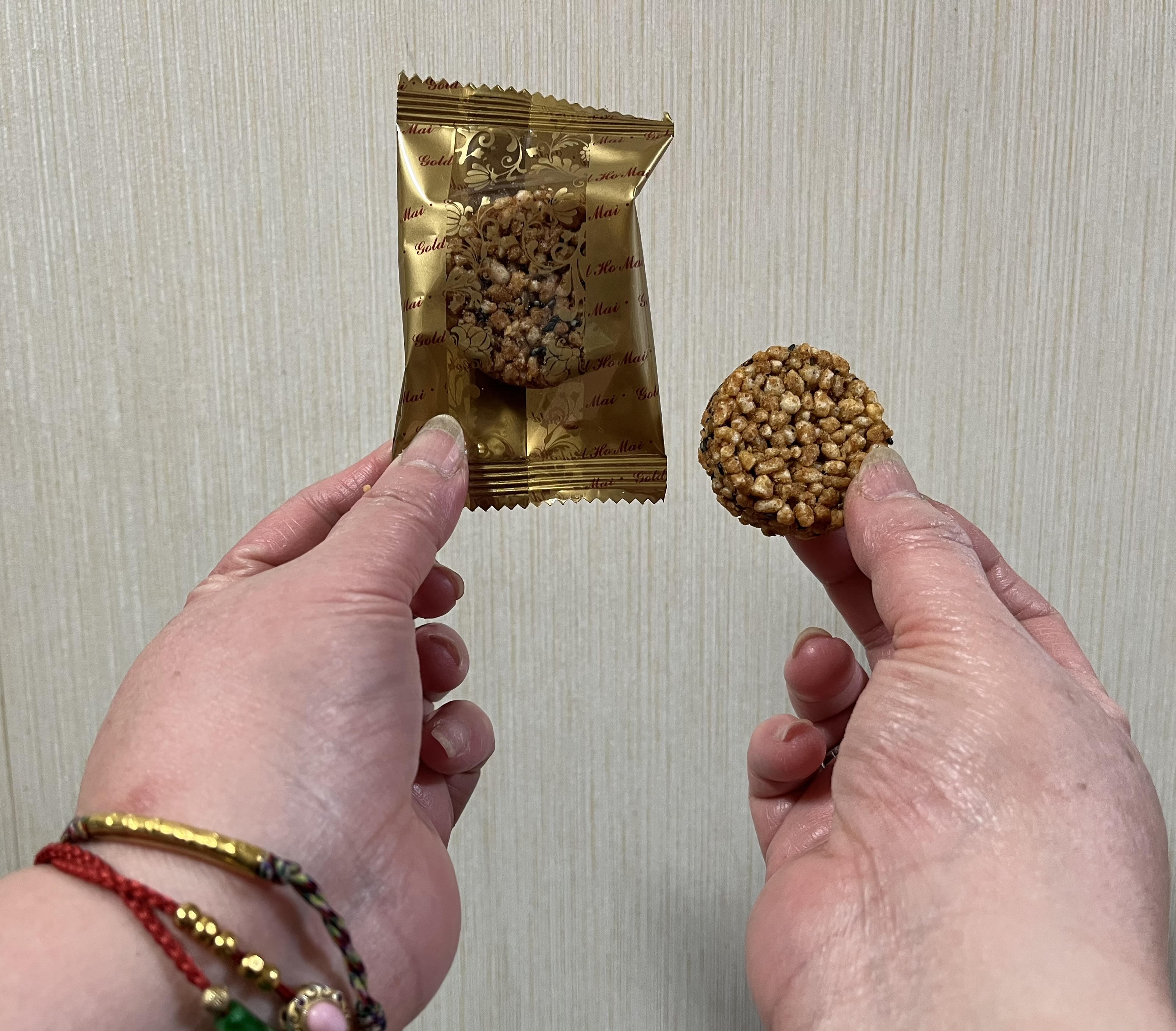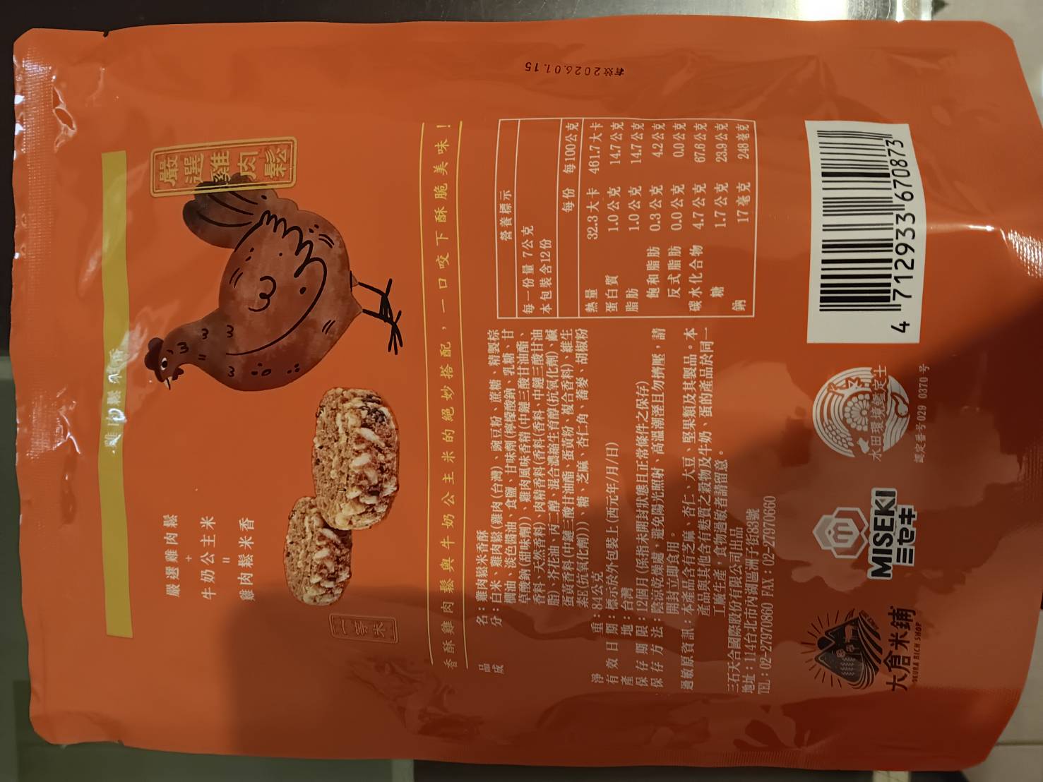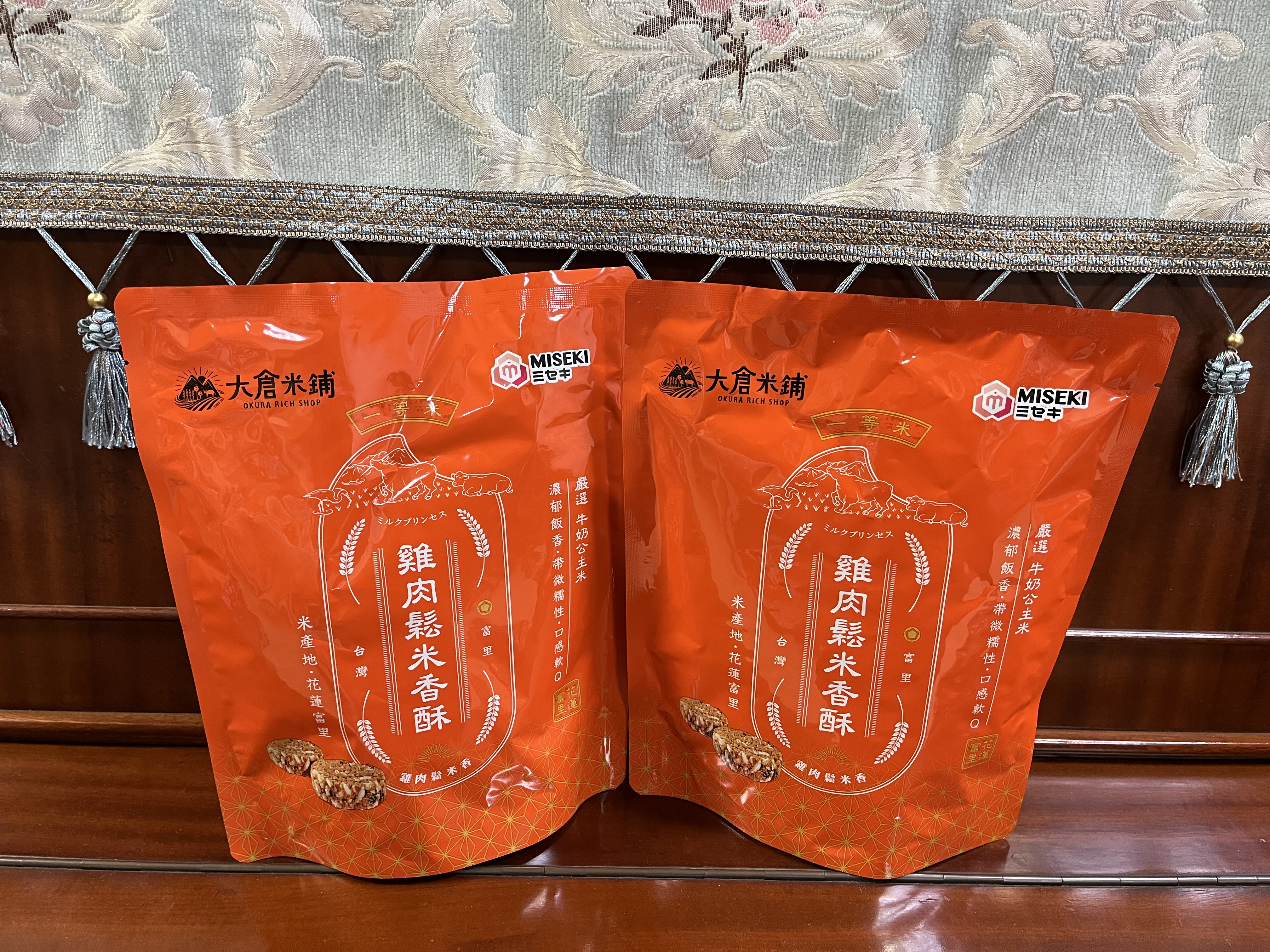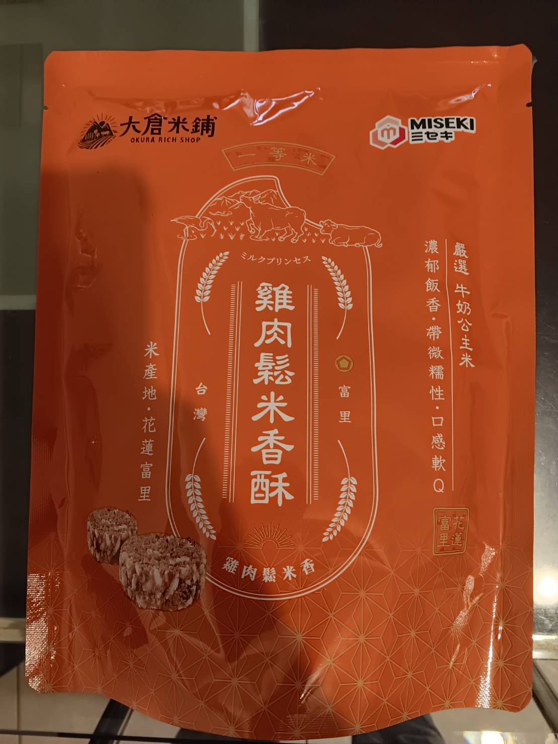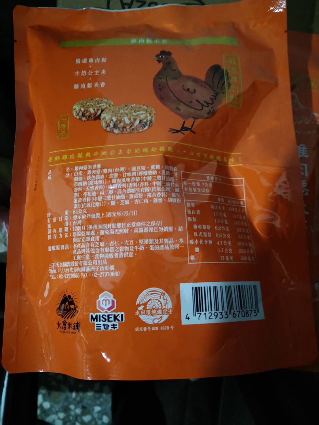白米、雞肉鬆((雞肉(台灣)、豌豆粉、蔗糖、精製棕櫚油、淡色醬油、食鹽、甘味劑(檸檬酸鈉、乳糖、甘草酸鈉(甜味劑))、雞肉風味香精(中鏈三酸甘油酯香料、天然香料)肉精香料(香料(香料、中鏈三酸甘油脂)、芥花油、丙二醇、混合濃縮生育醇(抗氧化劑)、鹹蛋黃香料(中鏈三酸甘油酯粉、蛋黃粉、複合香料) 維生素E(抗氧化劑))、糖、芝麻、杏仁角、蕎麥、胡椒粉、麥芽糖粉、黑芝麻、杏仁角、蕎麥、胡椒粉、蒜