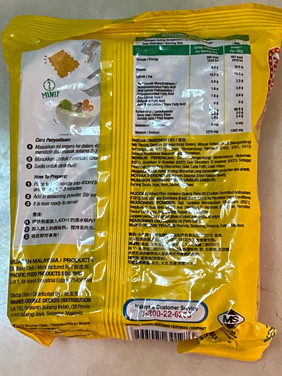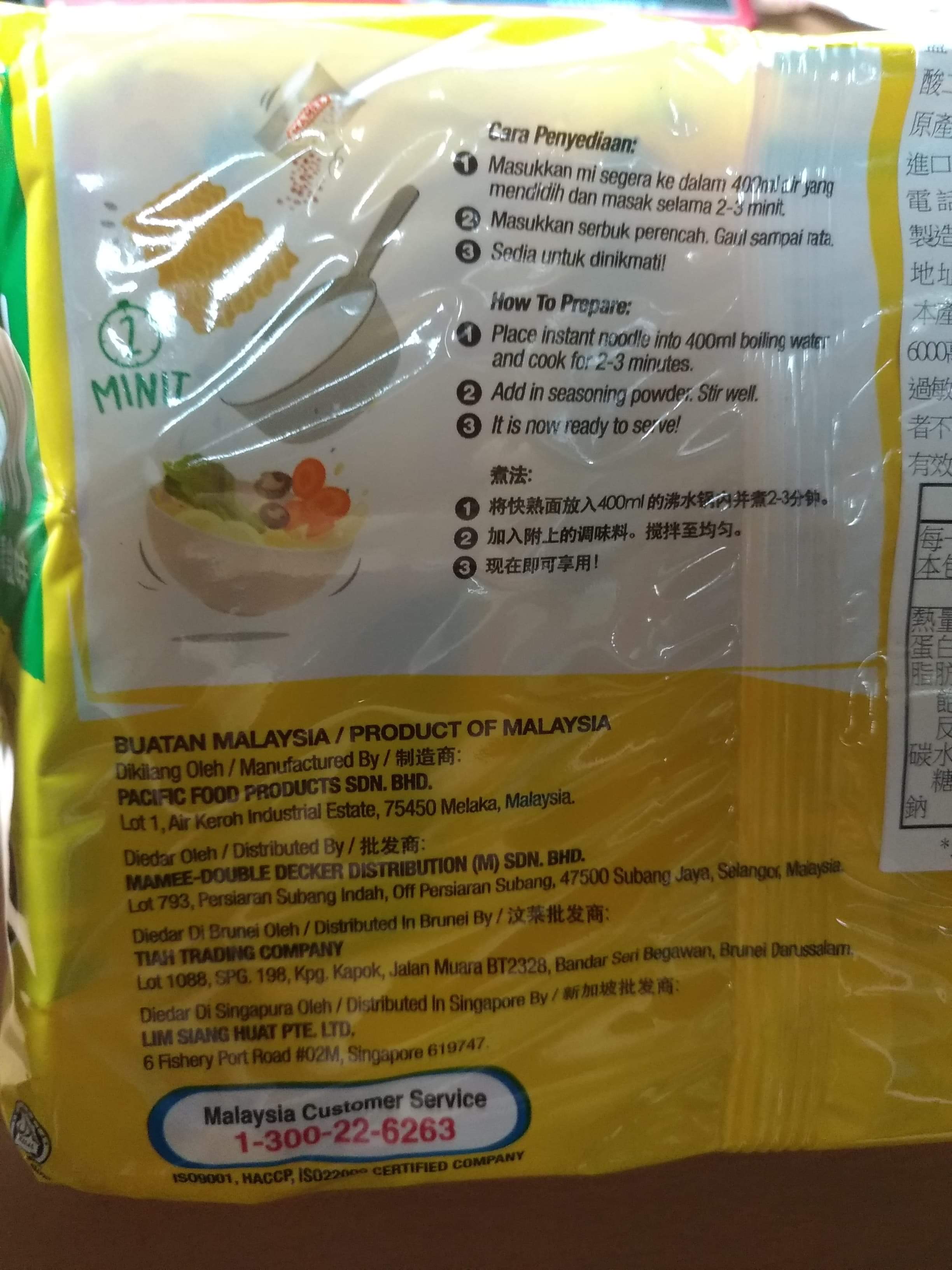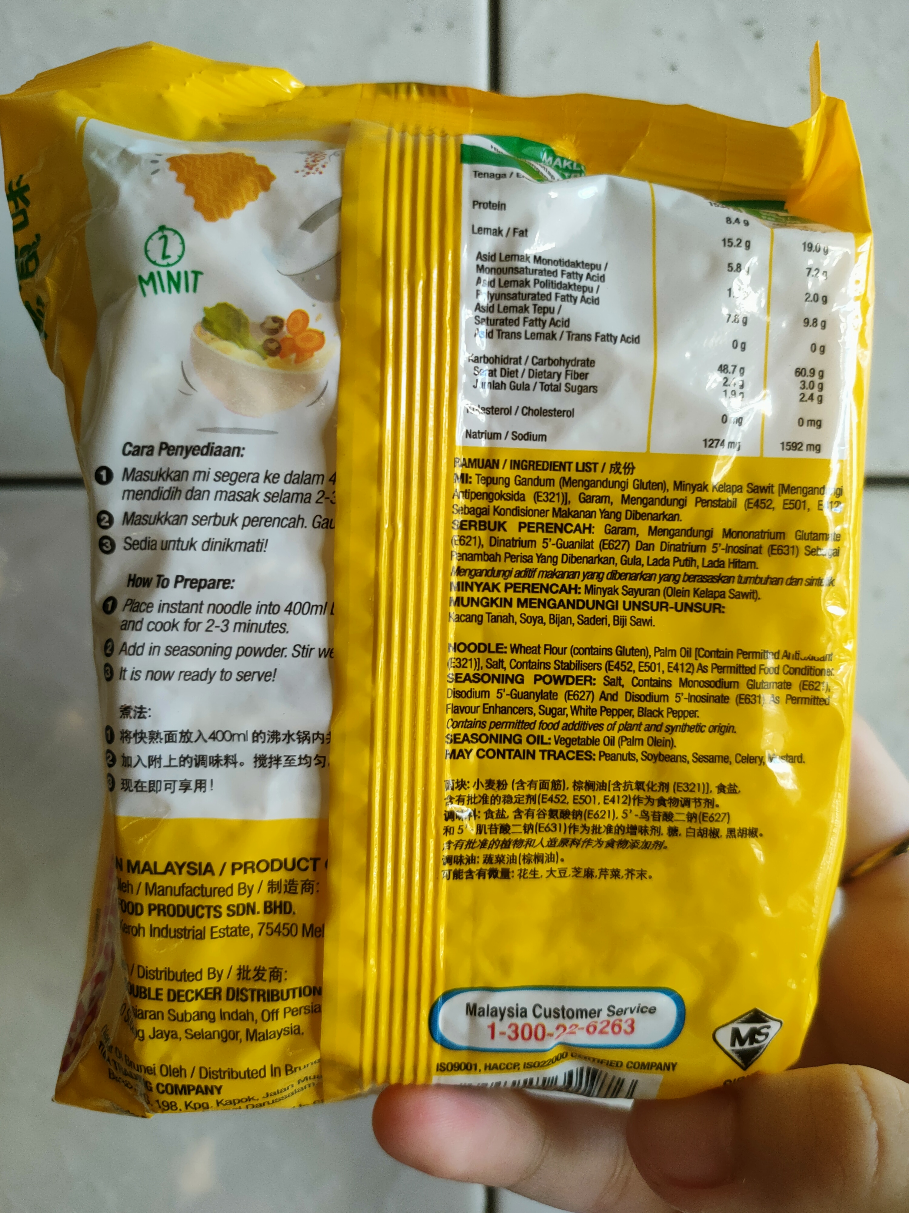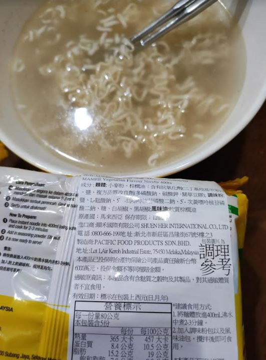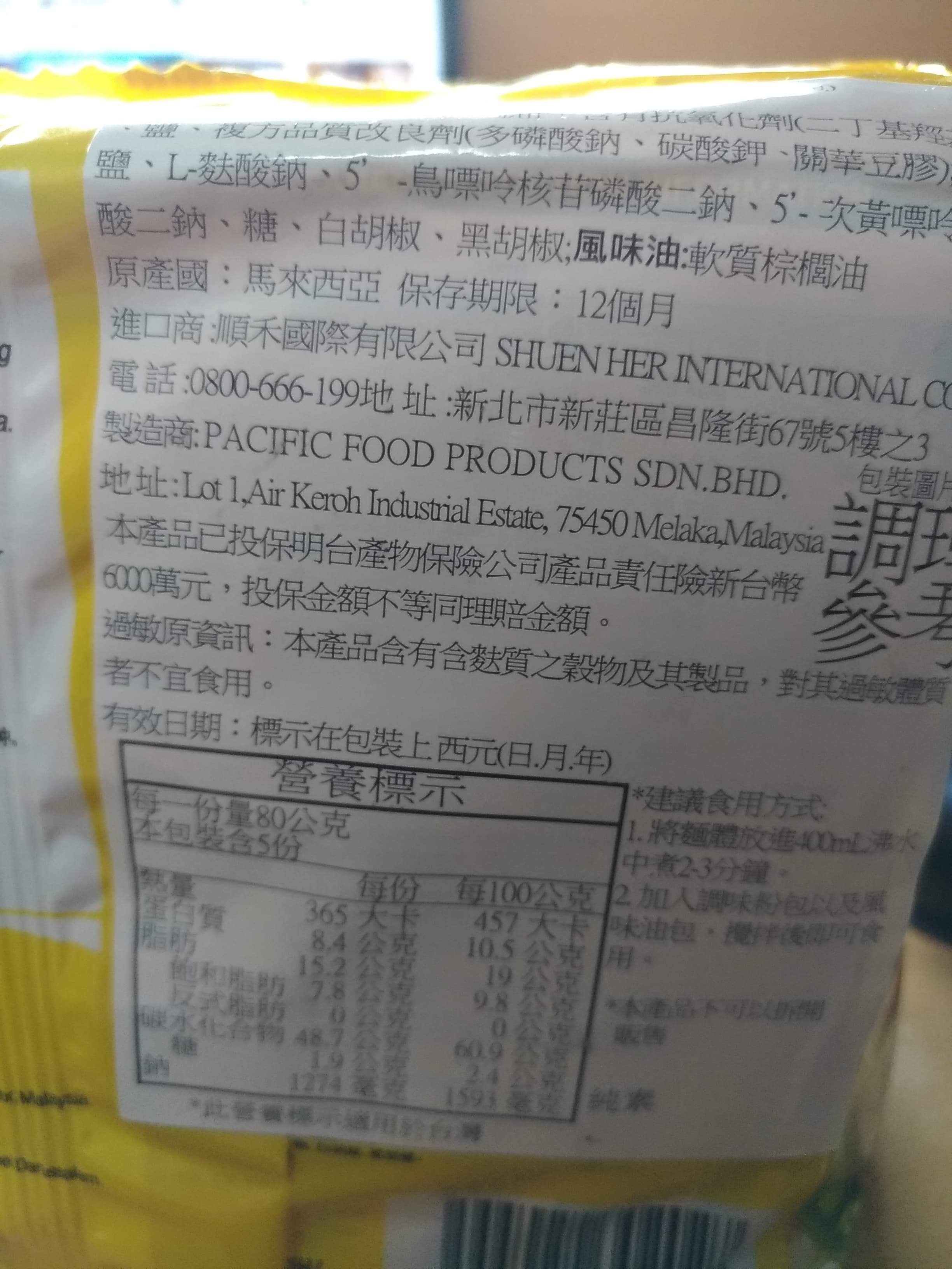 麵體: 小麥粉、棕櫚油﹝含有抗氧化劑(二丁基羥基甲苯)﹞、鹽、複方品質改良劑(多磷酸鈉、碳酸鉀、關華豆膠); 調味粉:鹽、L-麩酸鈉、5’-鳥嘌呤核苷磷酸二鈉、5’-次黃嘌呤核苷磷酸二鈉、糖、白胡椒、黑胡椒;風味油:軟質棕櫚油。