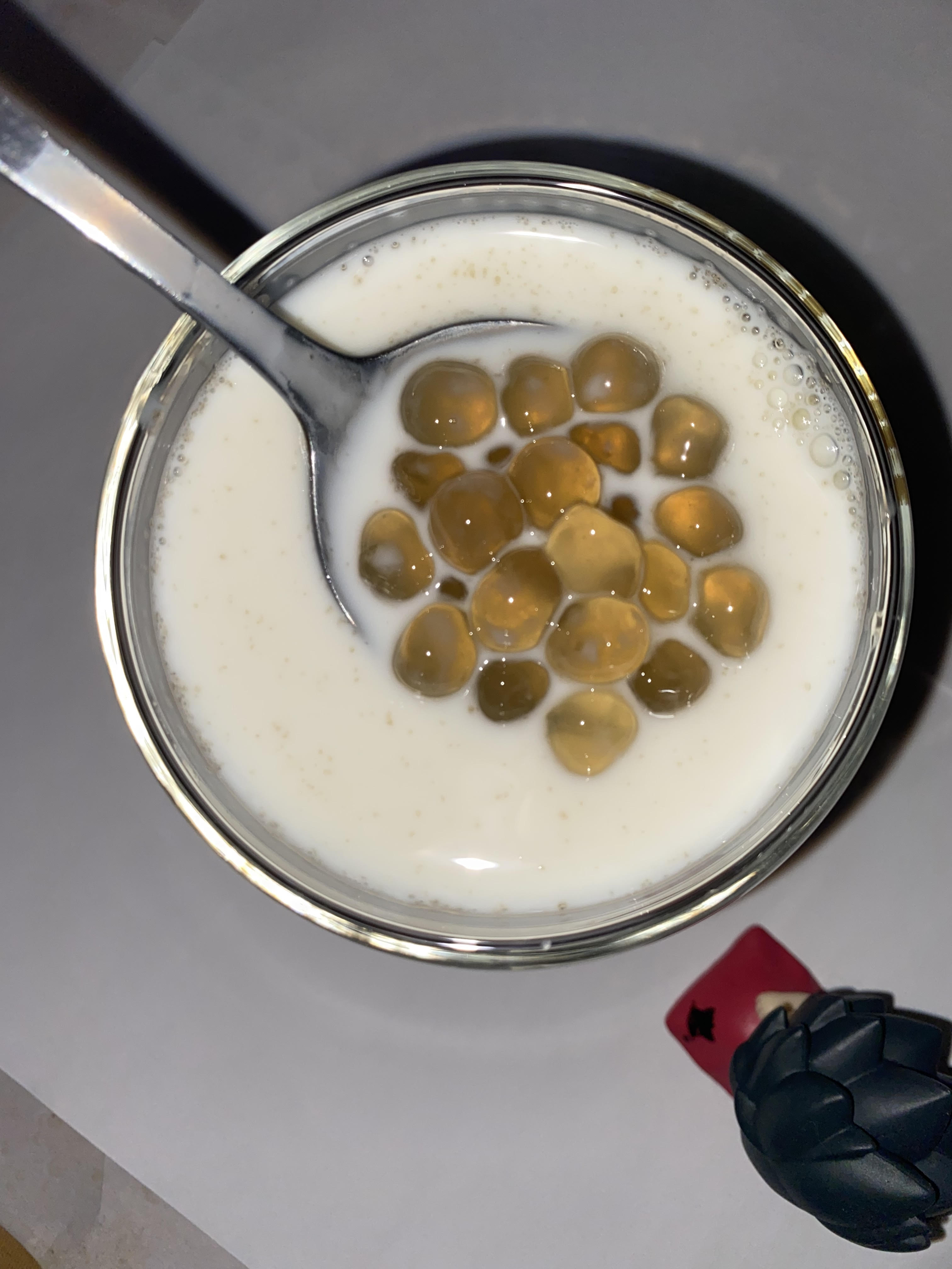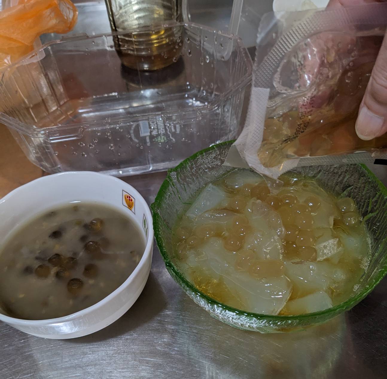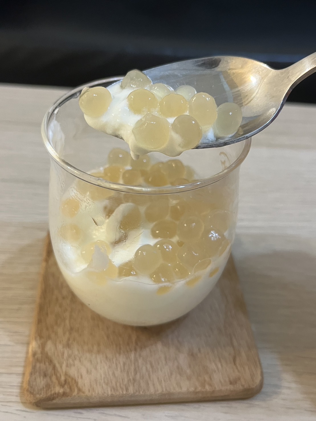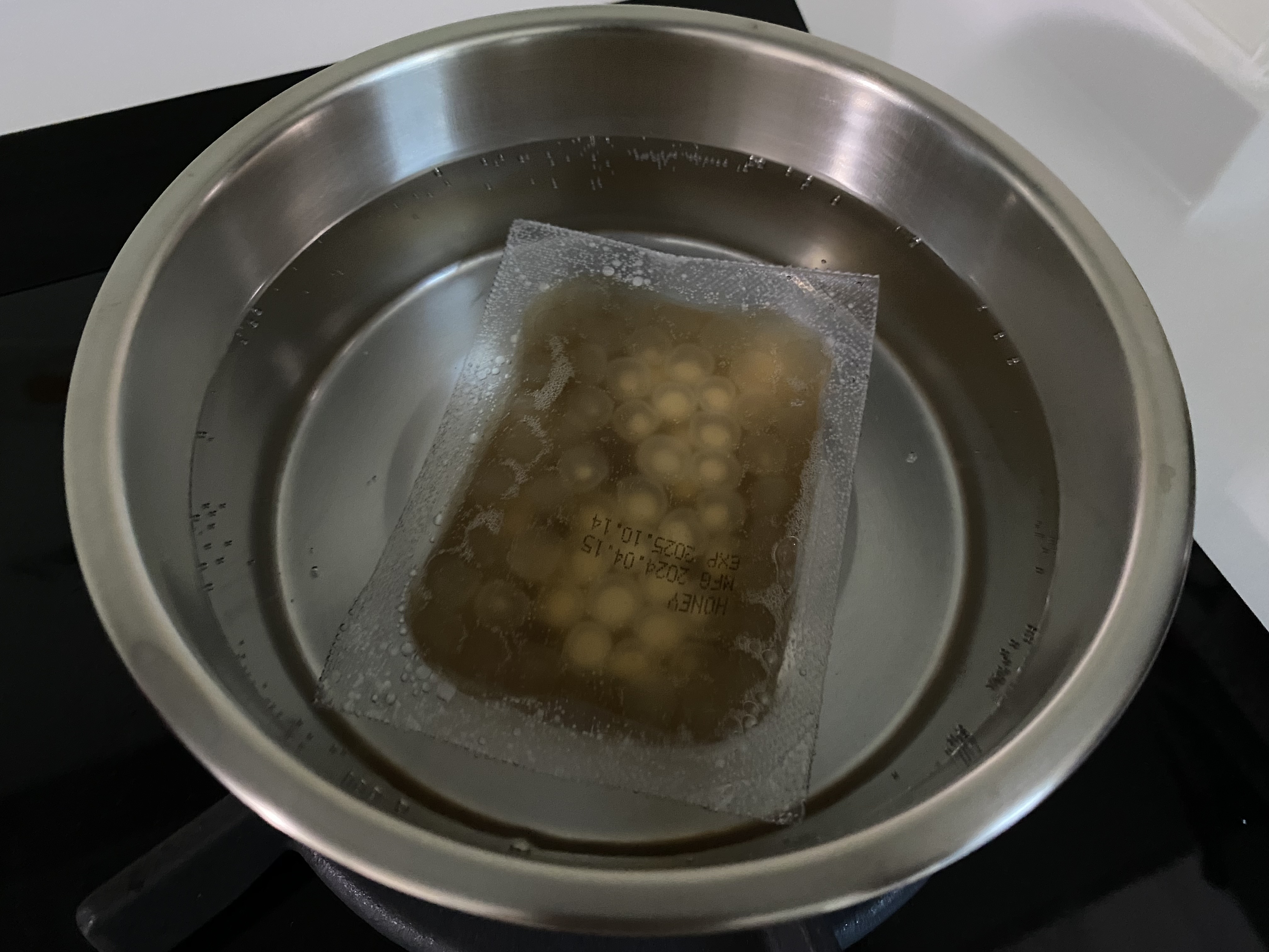 將珍珠包復熱完,加入鮮奶,茶,豆花,冰淇淋,蛋糕等都很美味!