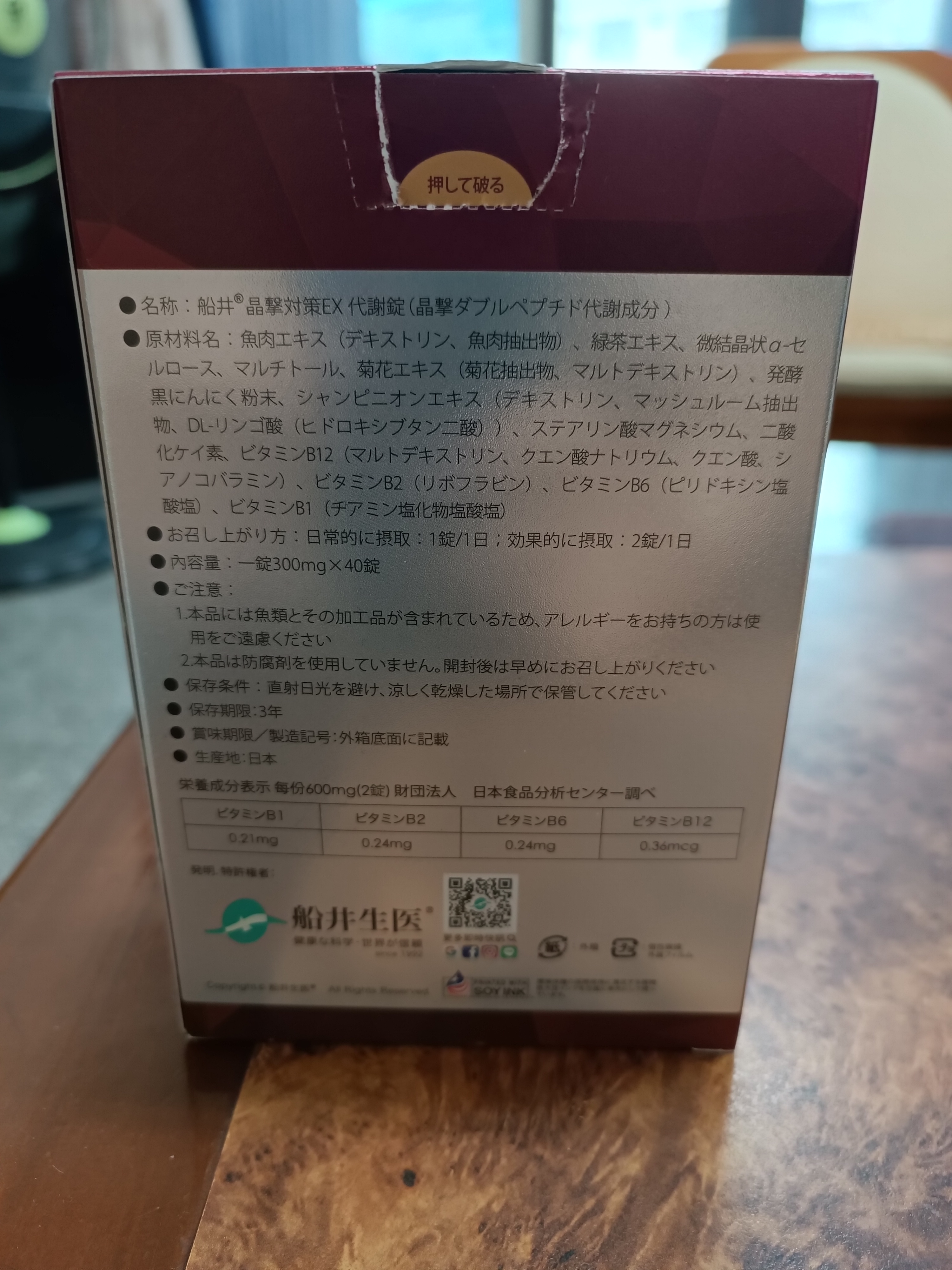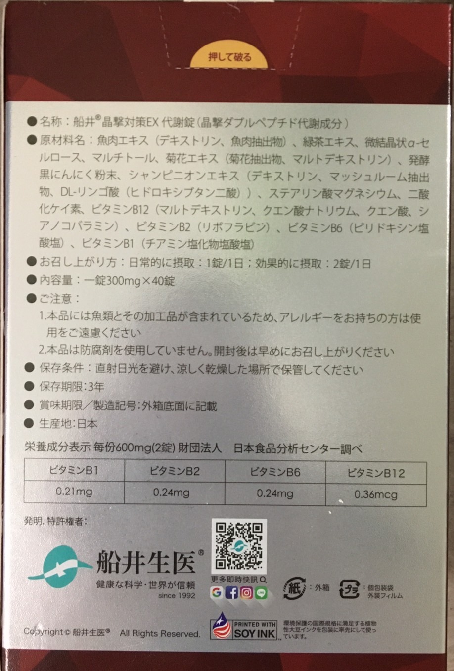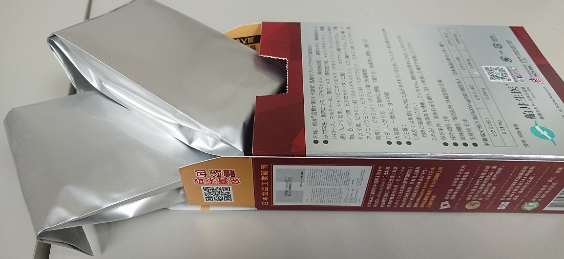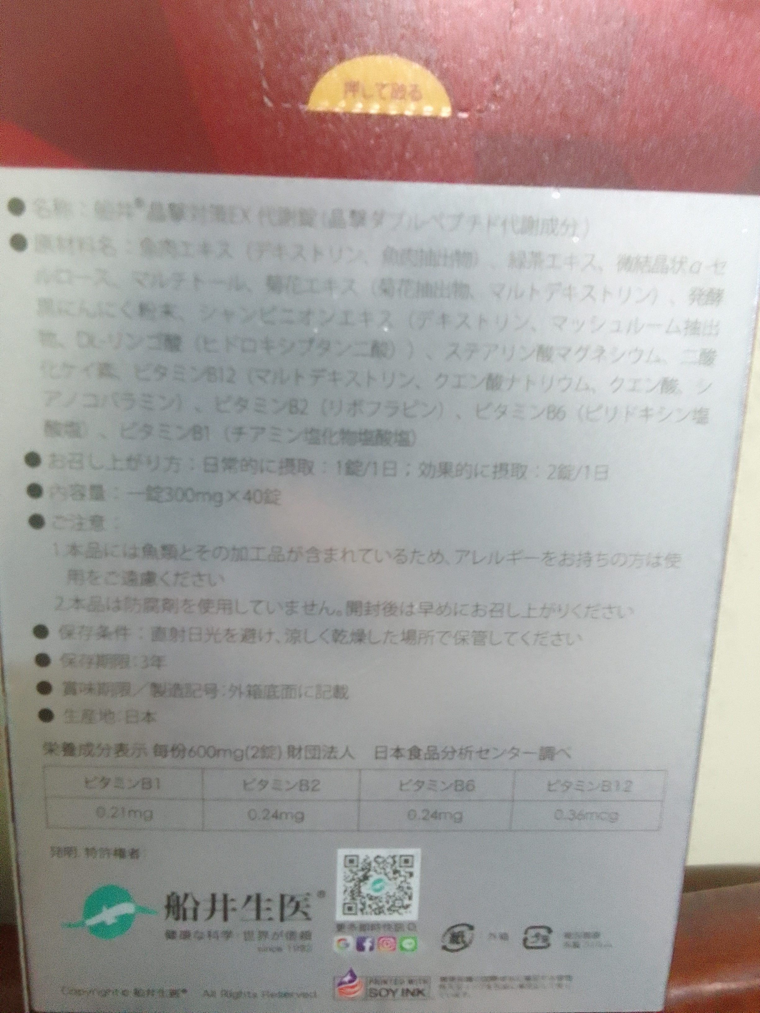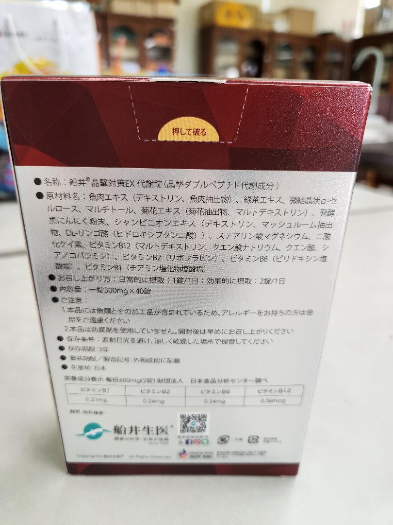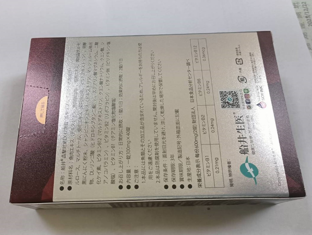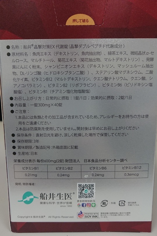魚肉萃取(糊精、魚肉萃取)、綠茶萃取、微結晶狀α-纖維素、麥芽糖醇、菊花萃取(菊花萃取物、麥芽糊精)、發酵黑蒜粉、洋菇萃取(糊精洋菇萃取、DL-蘋果酸(羥基丁二酸))硬脂酸鎂、二氧化矽、維生素B12(麥芽糊精、檸檬酸鈉、檸檬酸、氰鈷胺明)、維生素B2(核黃素)、維生素B6(鹽酸吡哆辛)、維生素B1(鹽酸硫胺明)