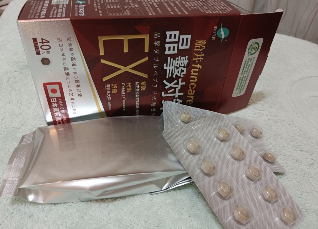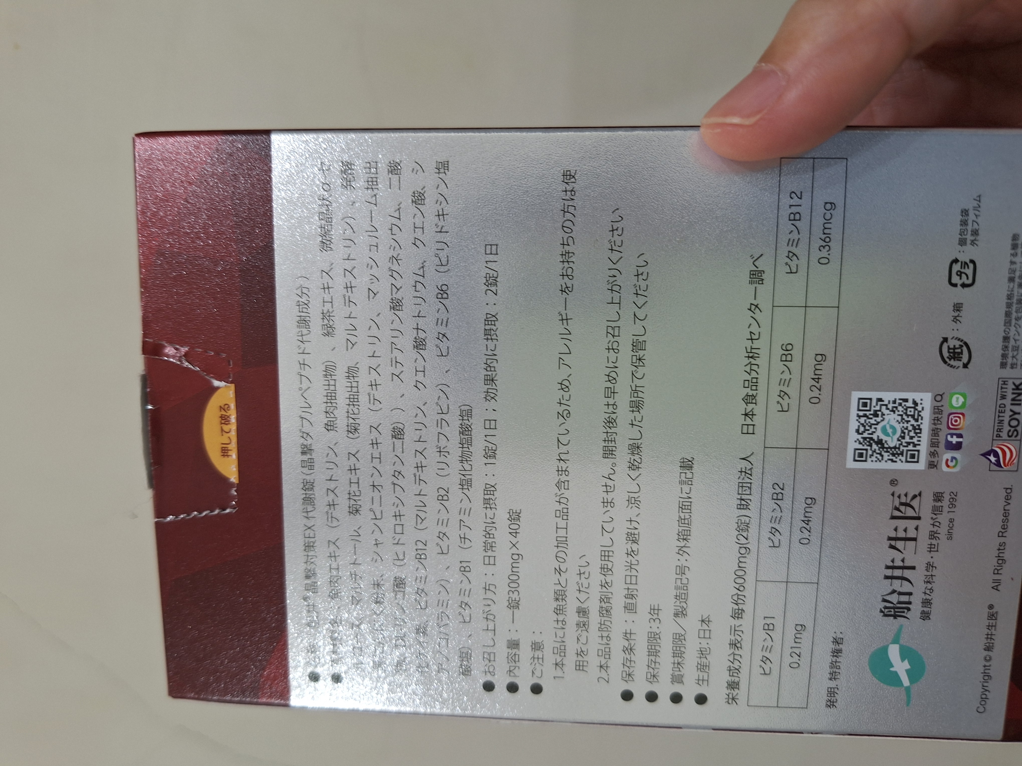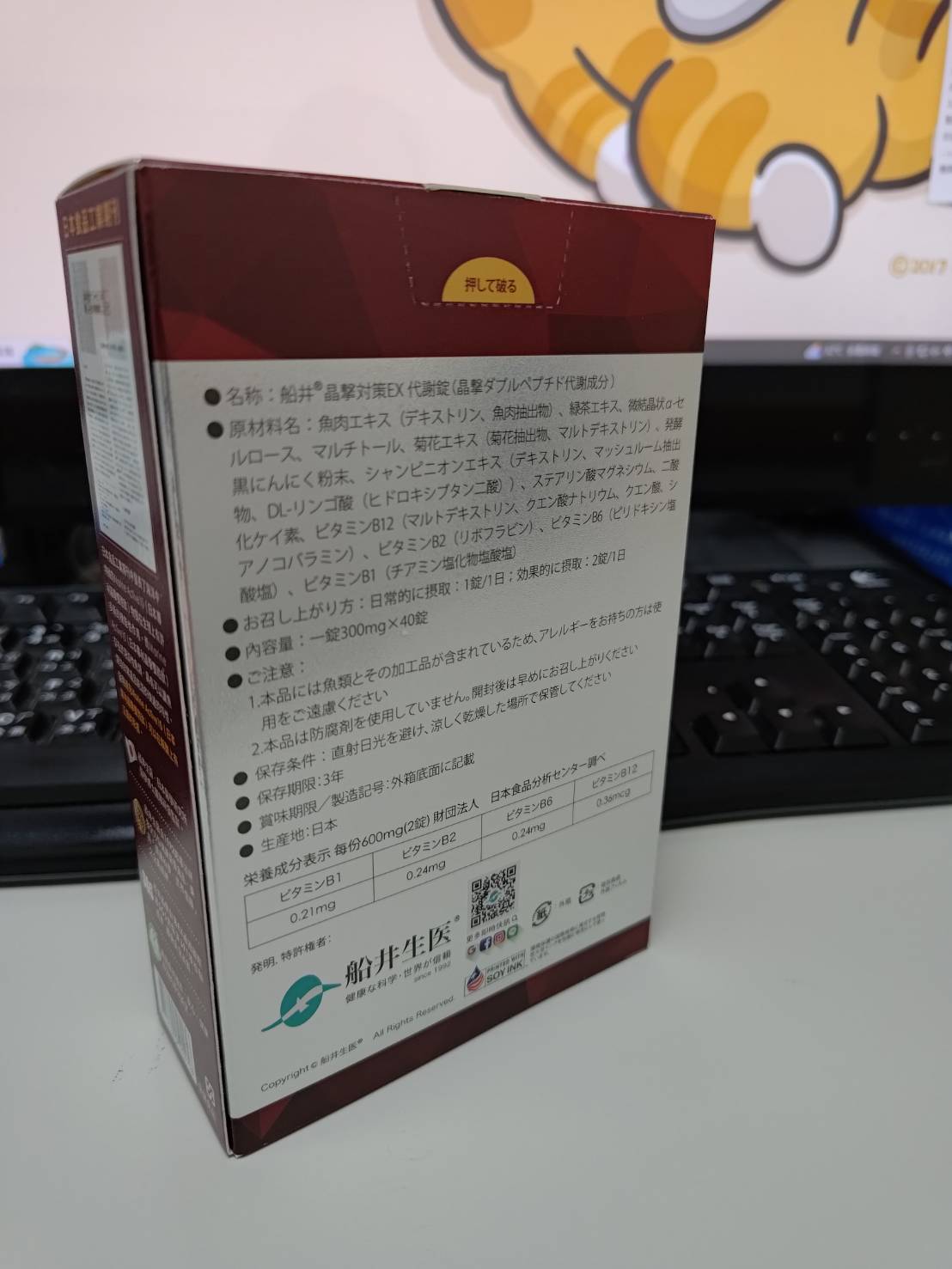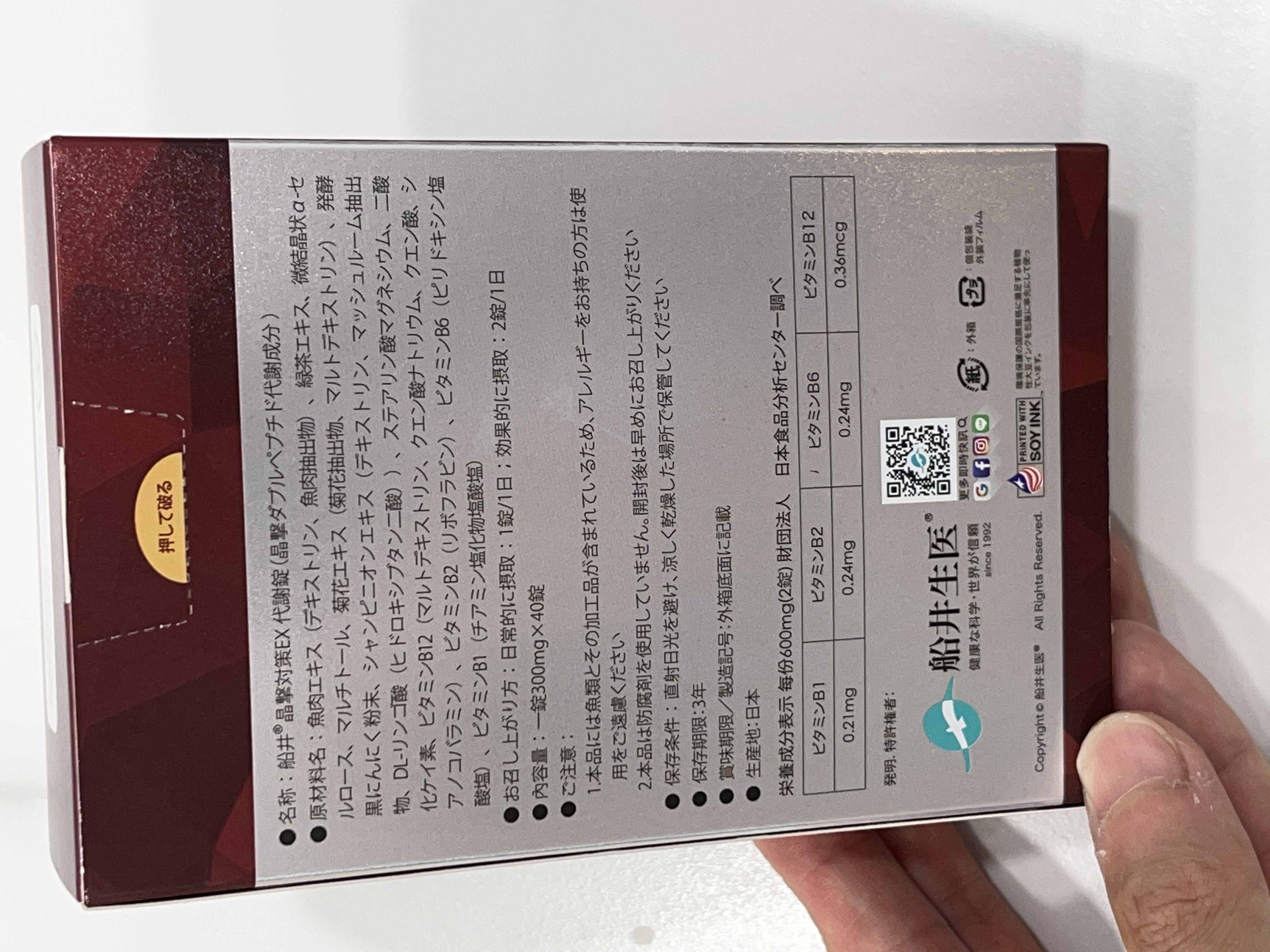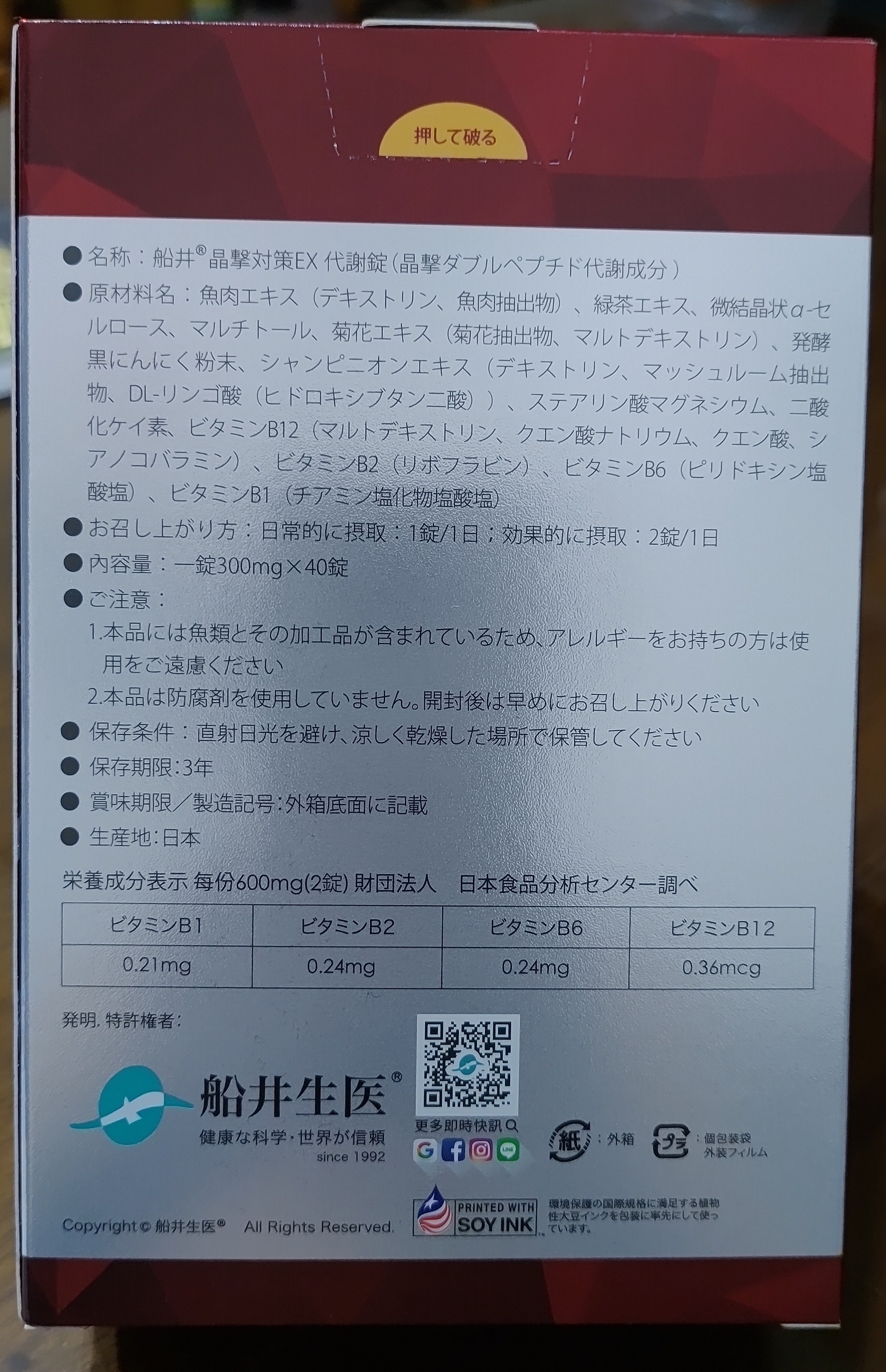 魚肉萃取(糊精、魚肉萃取)、綠茶萃取、微結晶狀α-纖維素、麥芽糖醇、菊花萃取(菊花萃取物、麥芽糊精)、發酵黑蒜粉、洋菇萃取(糊精洋菇萃取、DL-蘋果酸(羥基丁二酸))硬脂酸鎂、二氧化矽、維生素B12(麥芽糊精、檸檬酸鈉、檸檬酸、氰鈷胺明)、維生素B2(核黃素)、維生素B6(鹽酸吡哆辛)、維生素B1(鹽酸硫胺明)