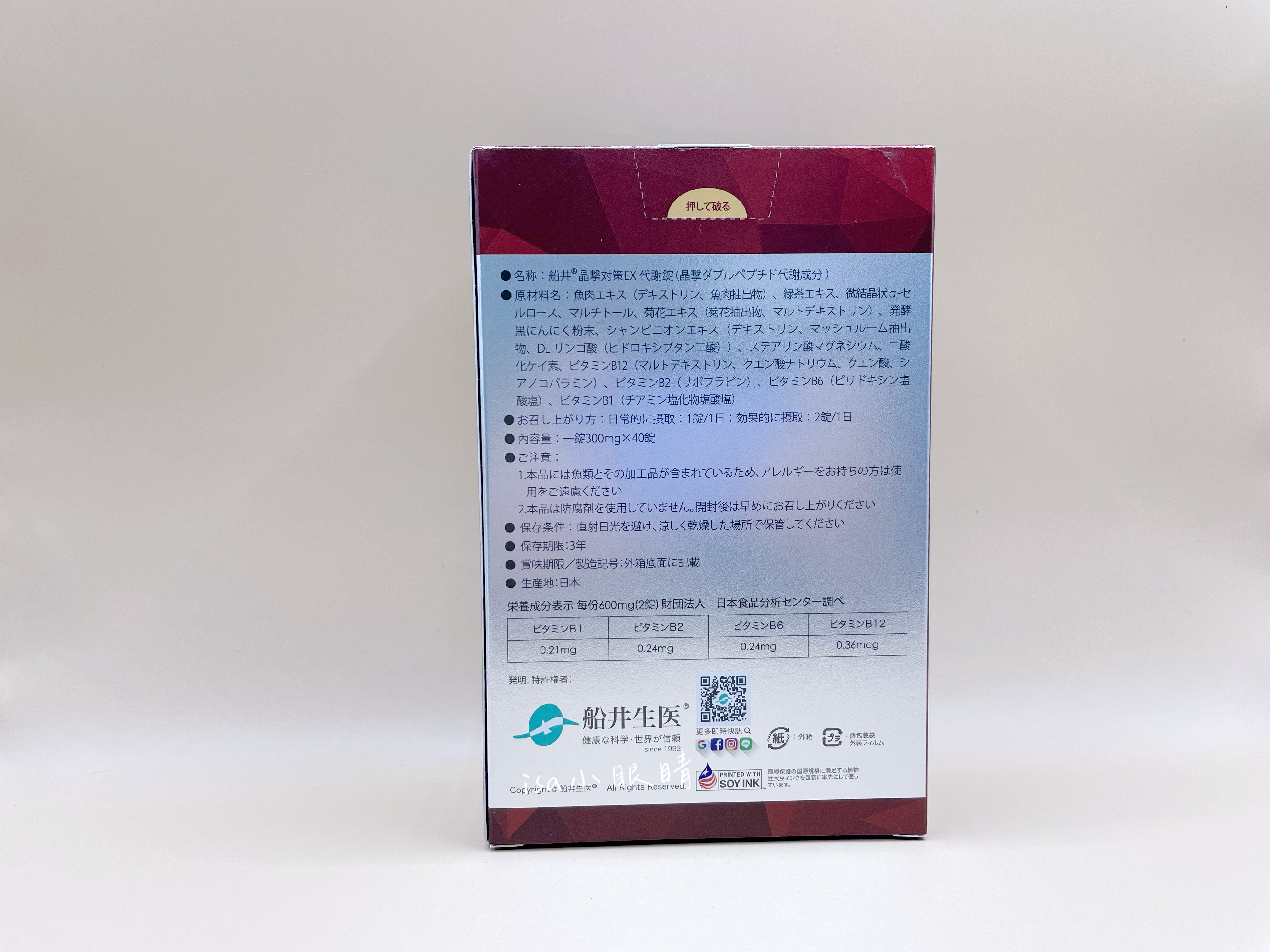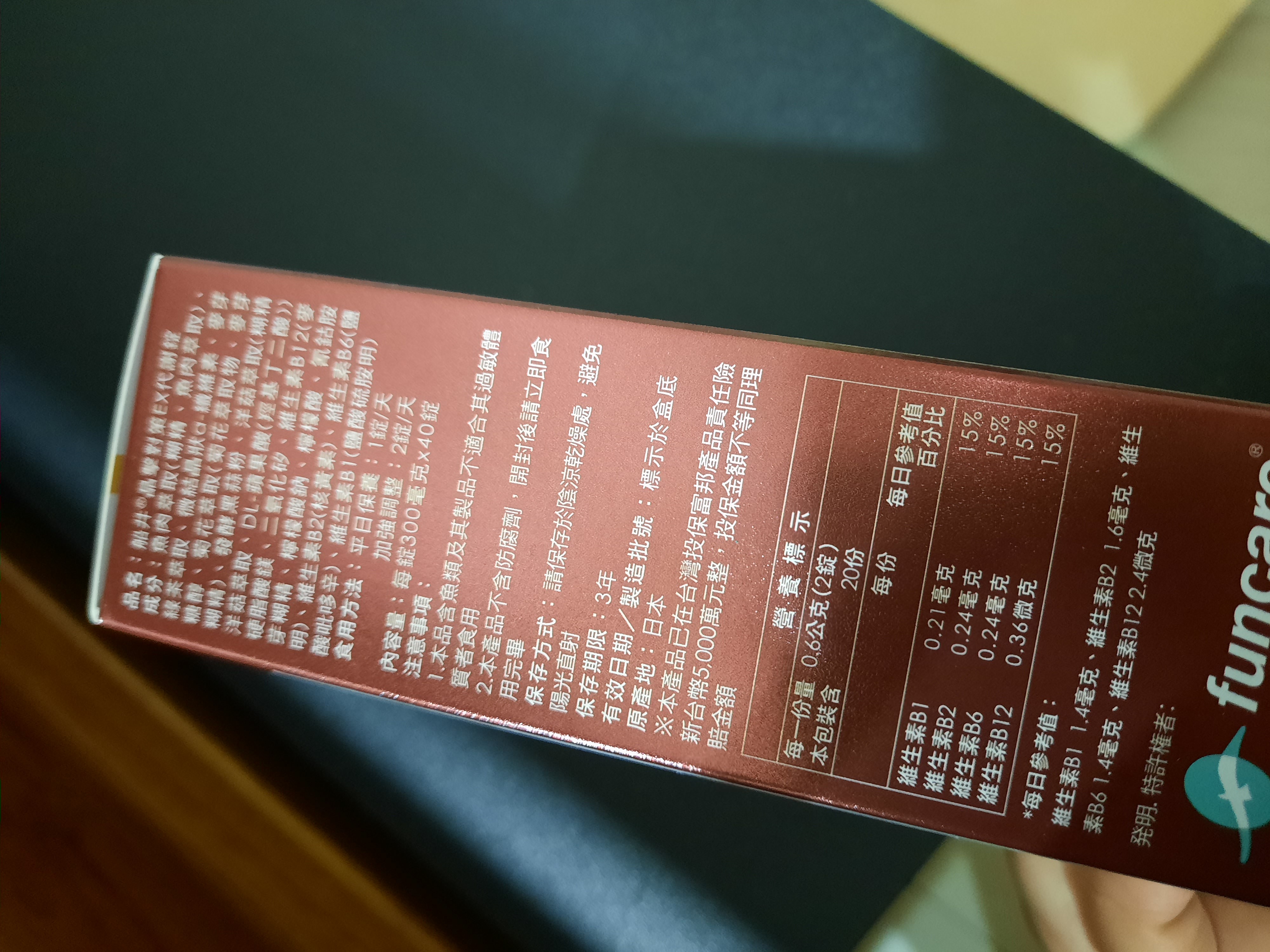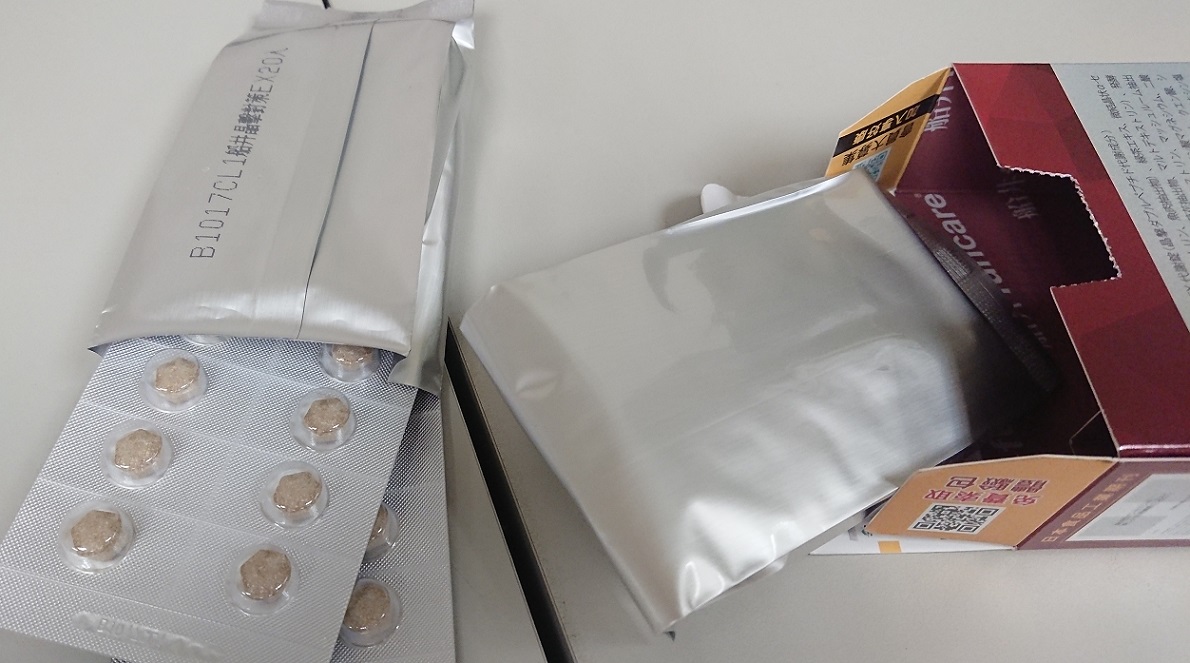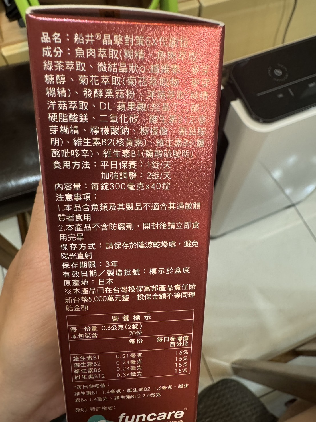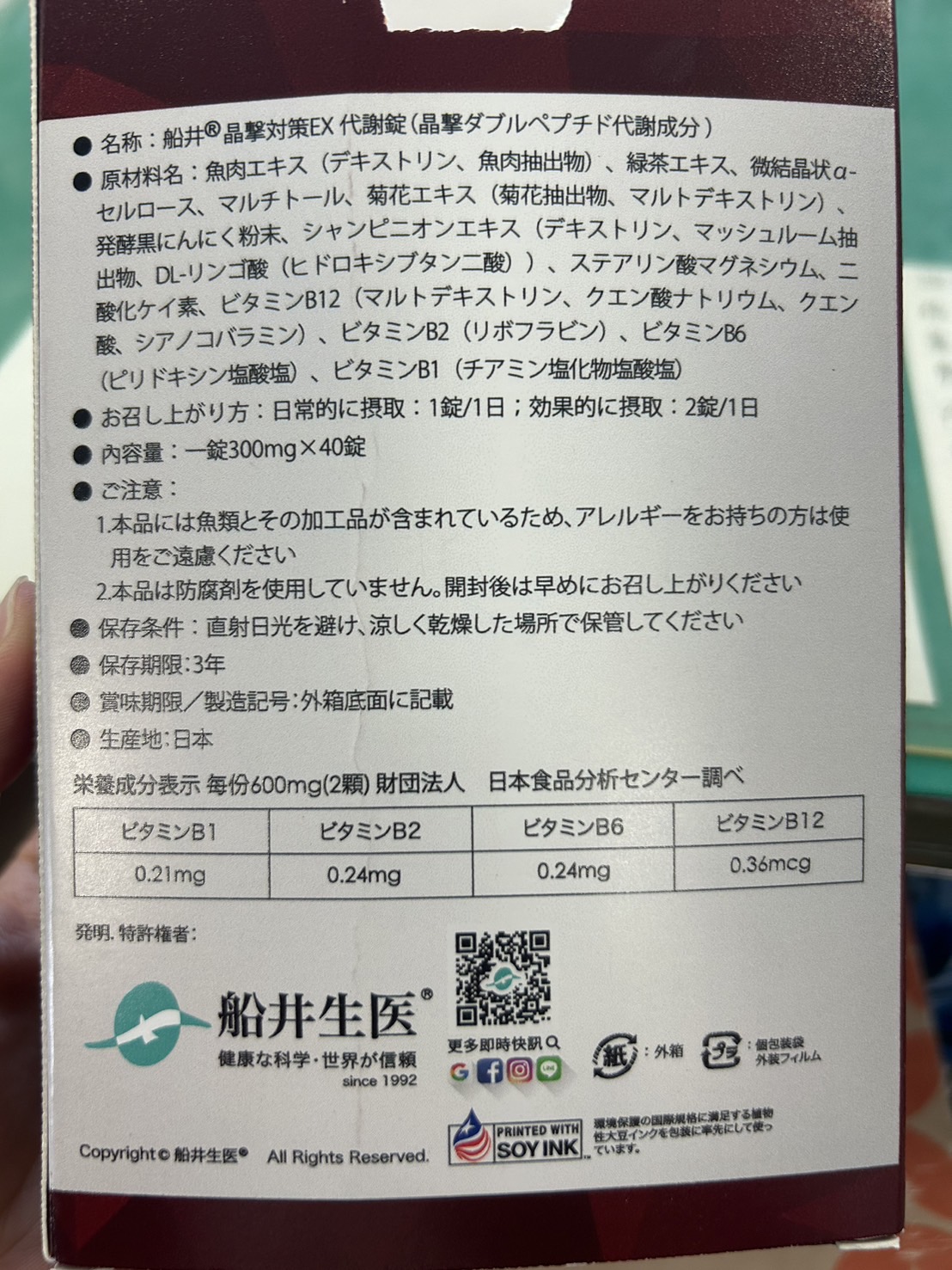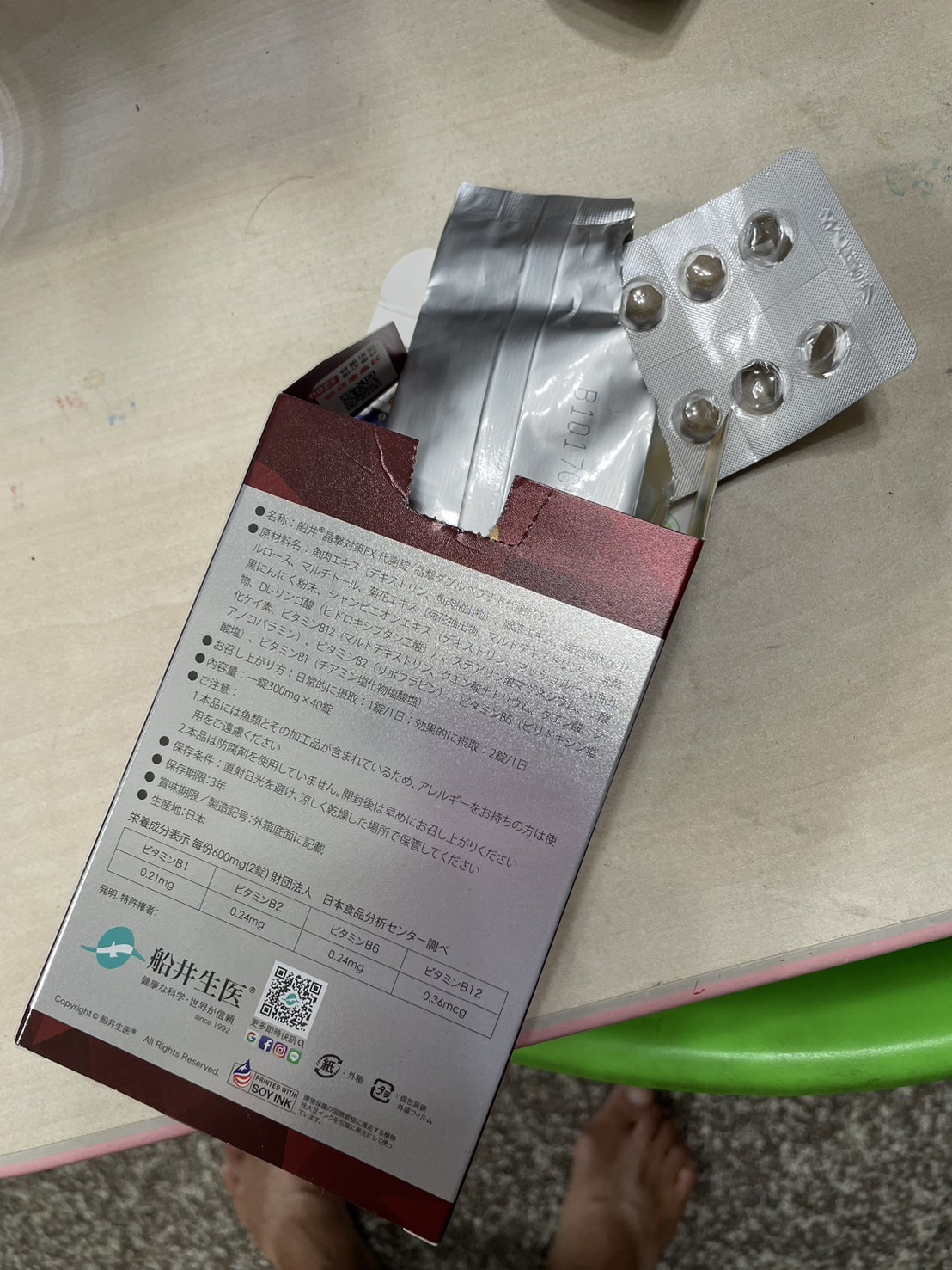 魚肉萃取(糊精、魚肉萃取)、綠茶萃取、微結晶狀α-纖維素、麥芽糖醇、菊花萃取(菊花萃取物、麥芽糊精)、發酵黑蒜粉、洋菇萃取(糊精洋菇萃取、DL-蘋果酸(羥基丁二酸))硬脂酸鎂、二氧化矽、維生素B12(麥芽糊精、檸檬酸鈉、檸檬酸、氰鈷胺明)、維生素B2(核黃素)、維生素B6(鹽酸吡哆辛)、維生素B1(鹽酸硫胺明)