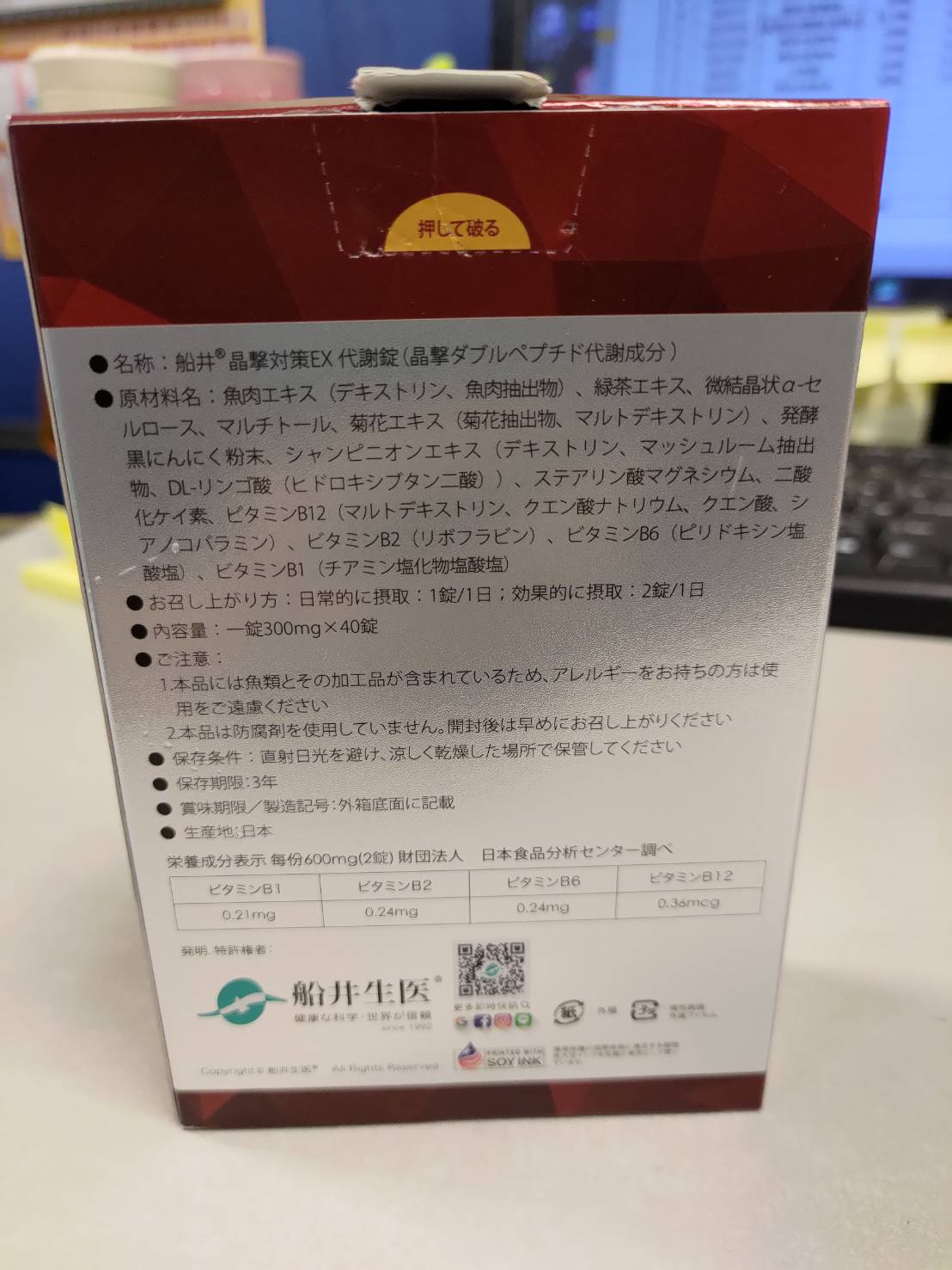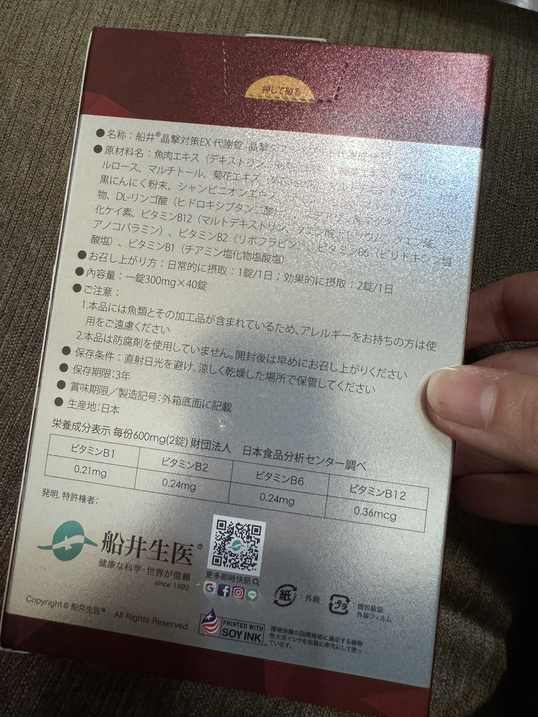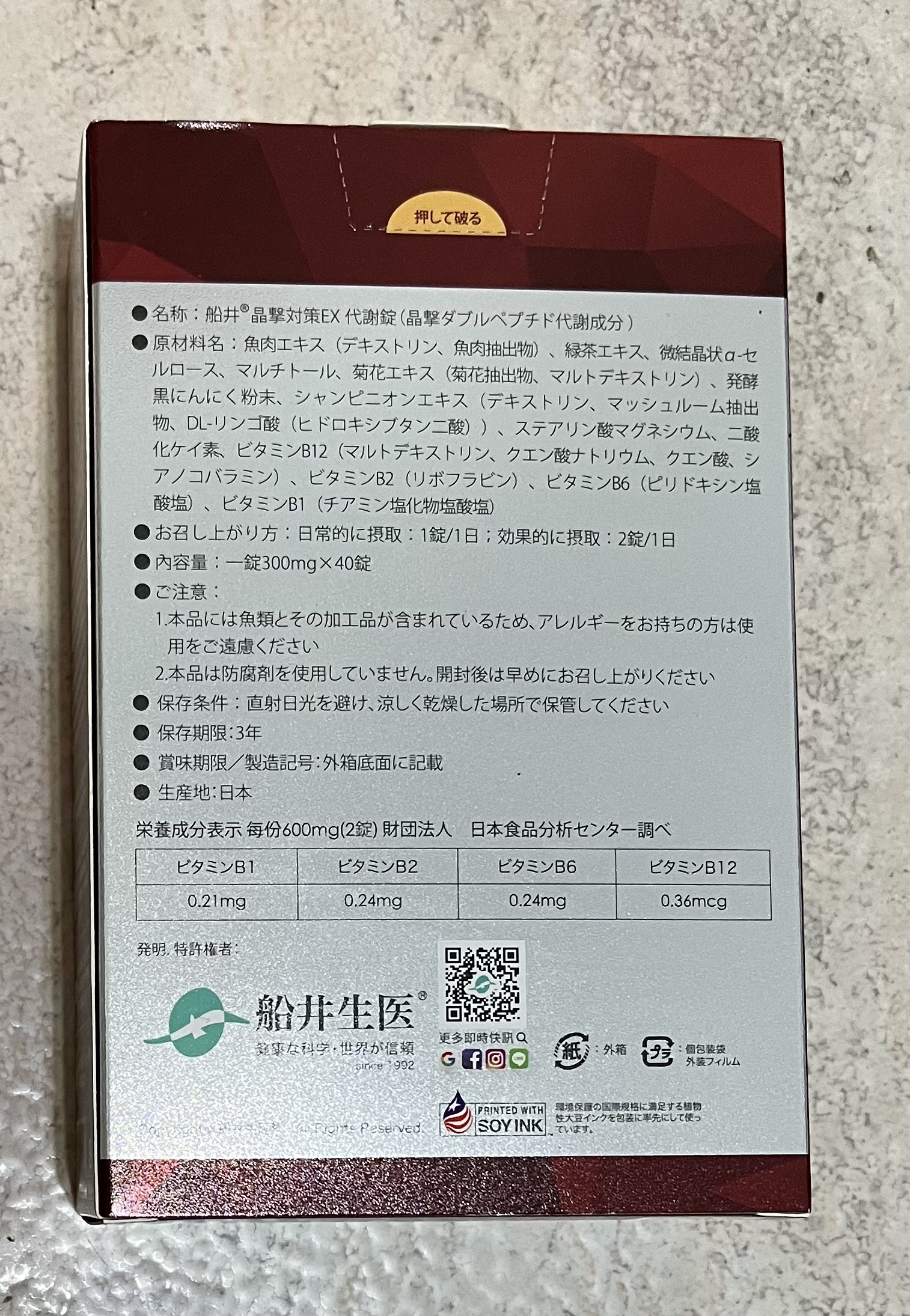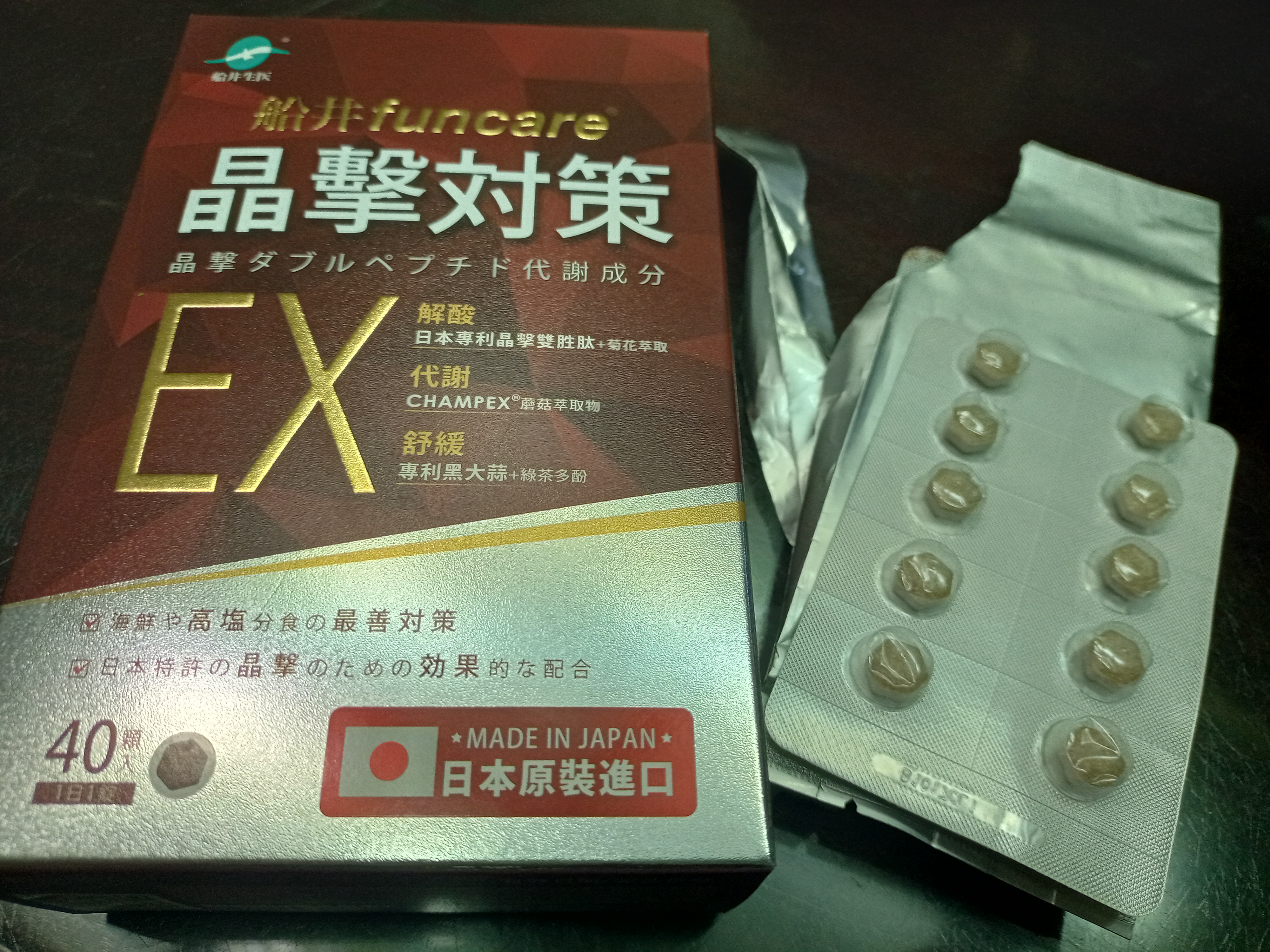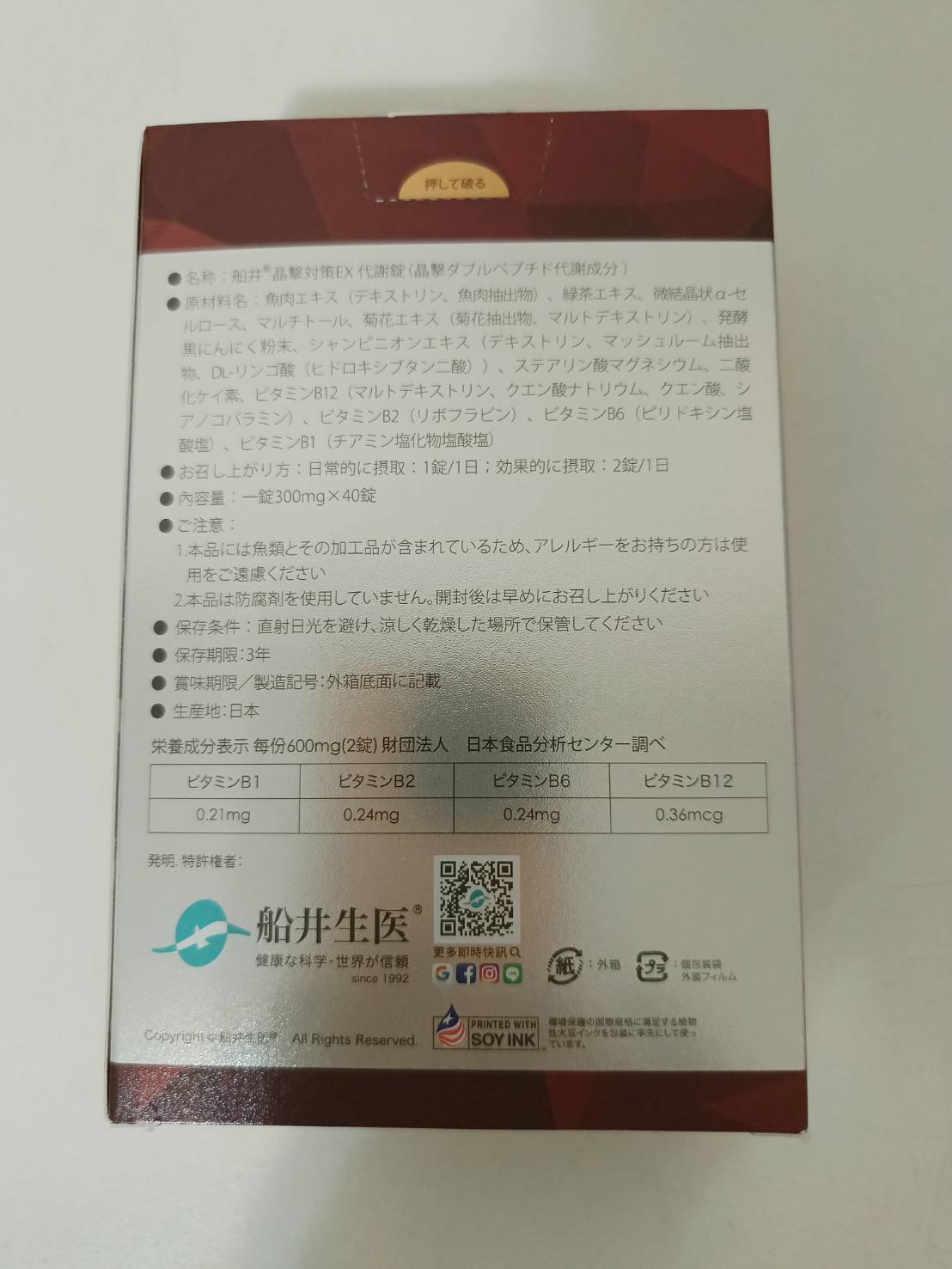 魚肉萃取(糊精、魚肉萃取)、綠茶萃取、微結晶狀α-纖維素、麥芽糖醇、菊花萃取(菊花萃取物、麥芽糊精)、發酵黑蒜粉、洋菇萃取(糊精洋菇萃取、DL-蘋果酸(羥基丁二酸))硬脂酸鎂、二氧化矽、維生素B12(麥芽糊精、檸檬酸鈉、檸檬酸、氰鈷胺明)、維生素B2(核黃素)、維生素B6(鹽酸吡哆辛)、維生素B1(鹽酸硫胺明)