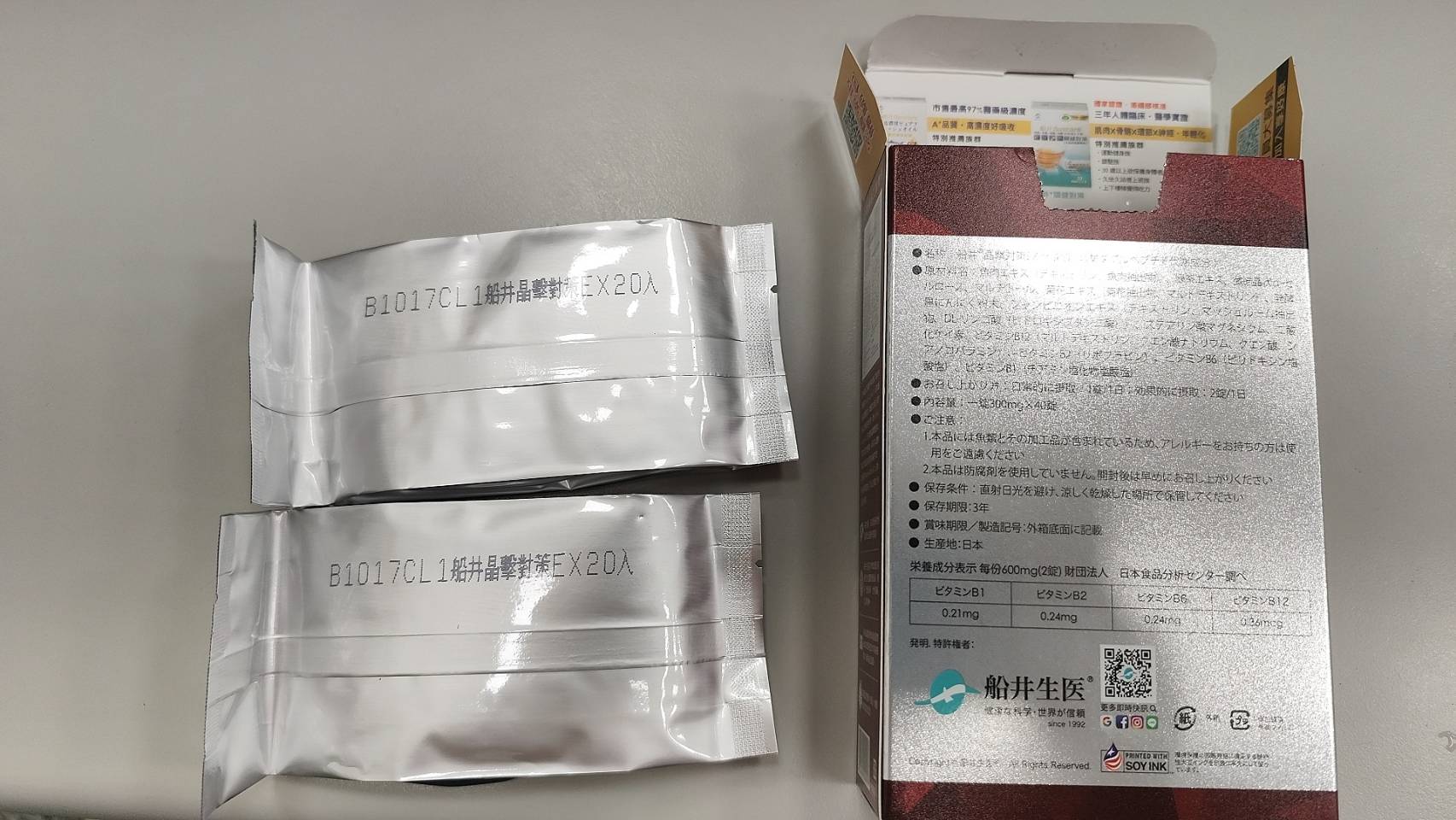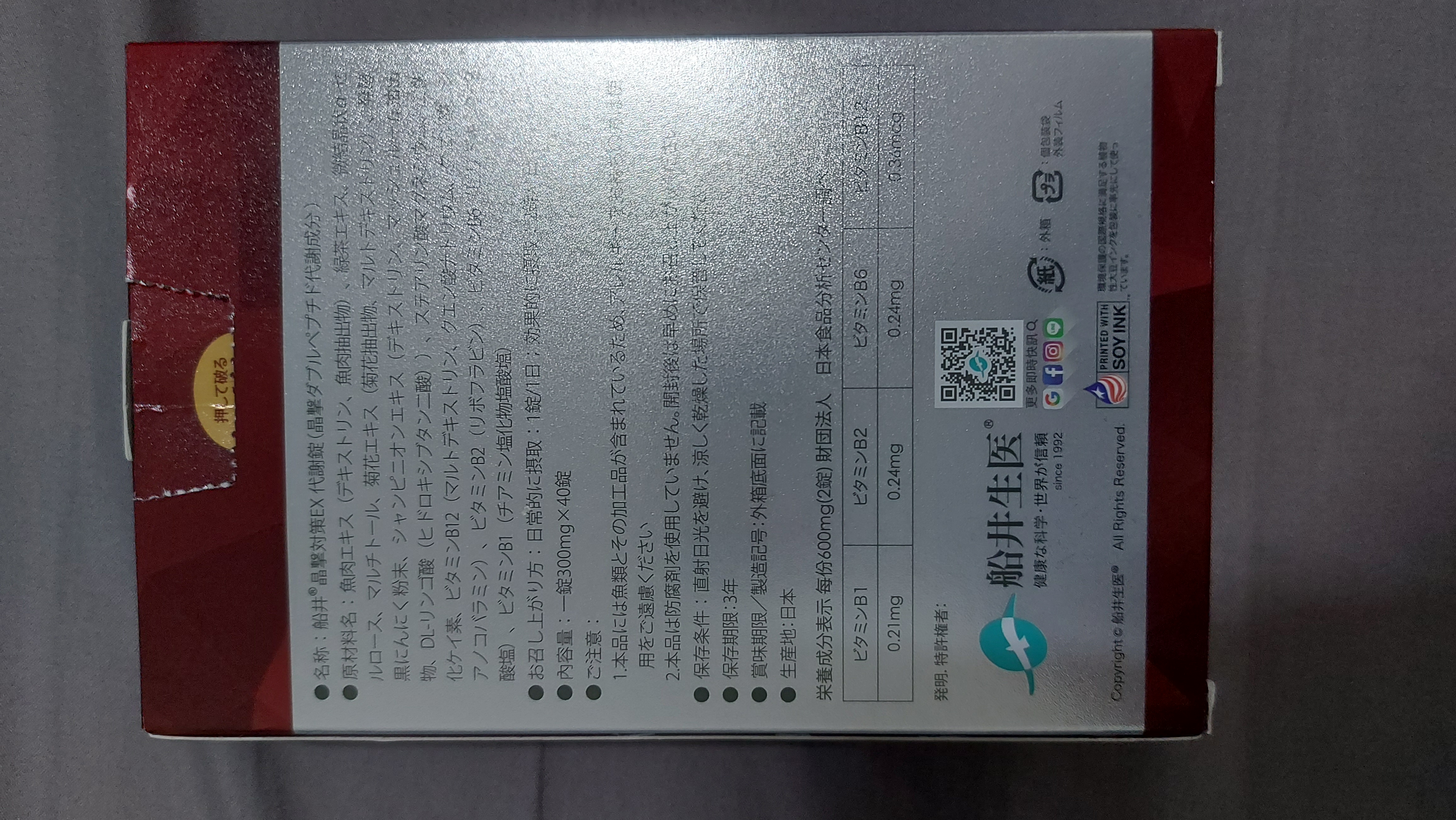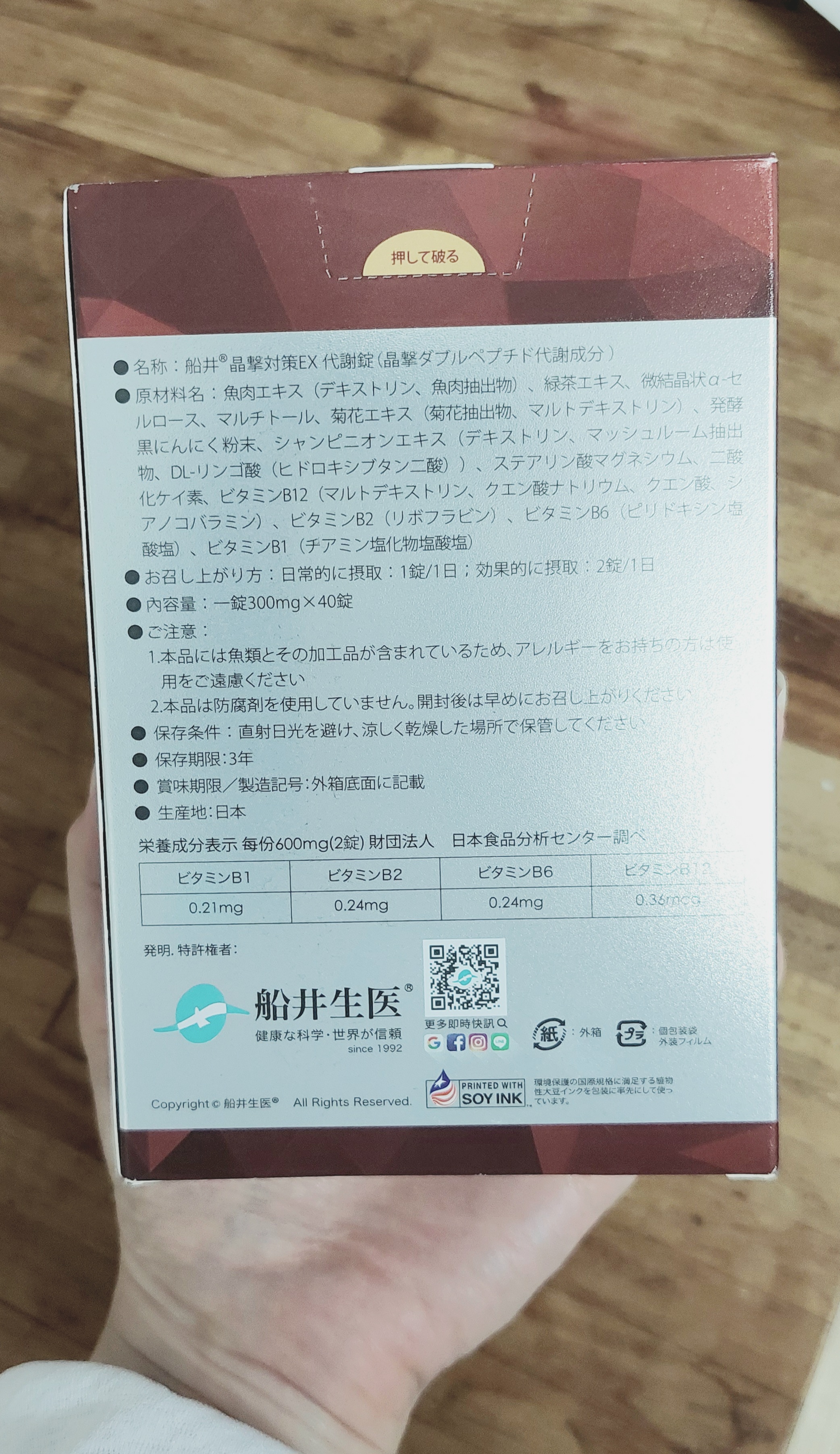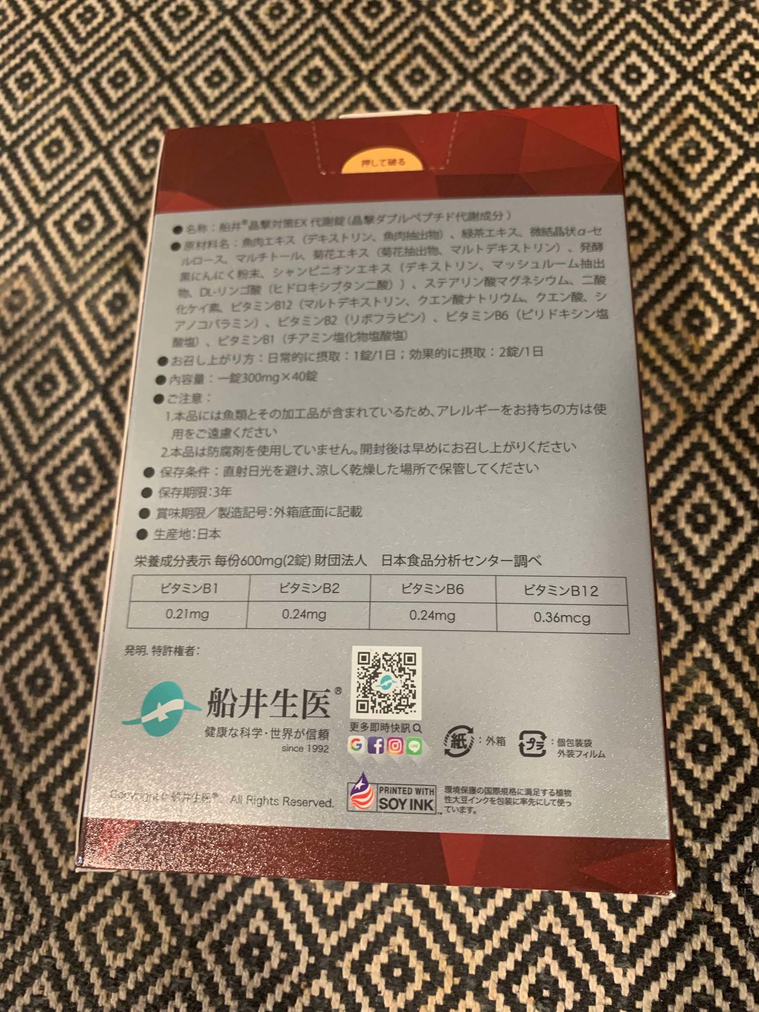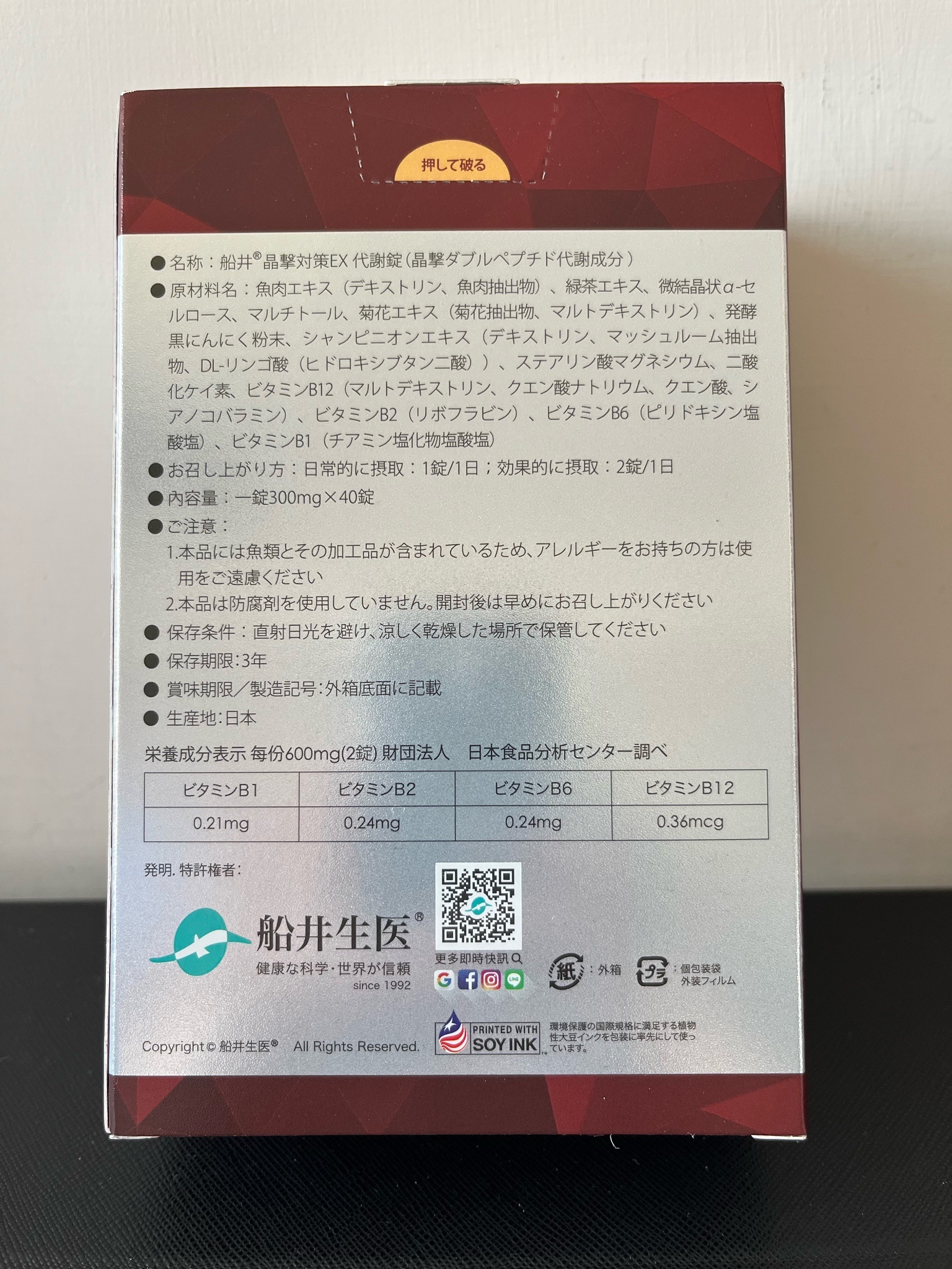 魚肉萃取(糊精、魚肉萃取)、綠茶萃取、微結晶狀α-纖維素、麥芽糖醇、菊花萃取(菊花萃取物、麥芽糊精)、發酵黑蒜粉、洋菇萃取(糊精洋菇萃取、DL-蘋果酸(羥基丁二酸))硬脂酸鎂、二氧化矽、維生素B12(麥芽糊精、檸檬酸鈉、檸檬酸、氰鈷胺明)、維生素B2(核黃素)、維生素B6(鹽酸吡哆辛)、維生素B1(鹽酸硫胺明)
