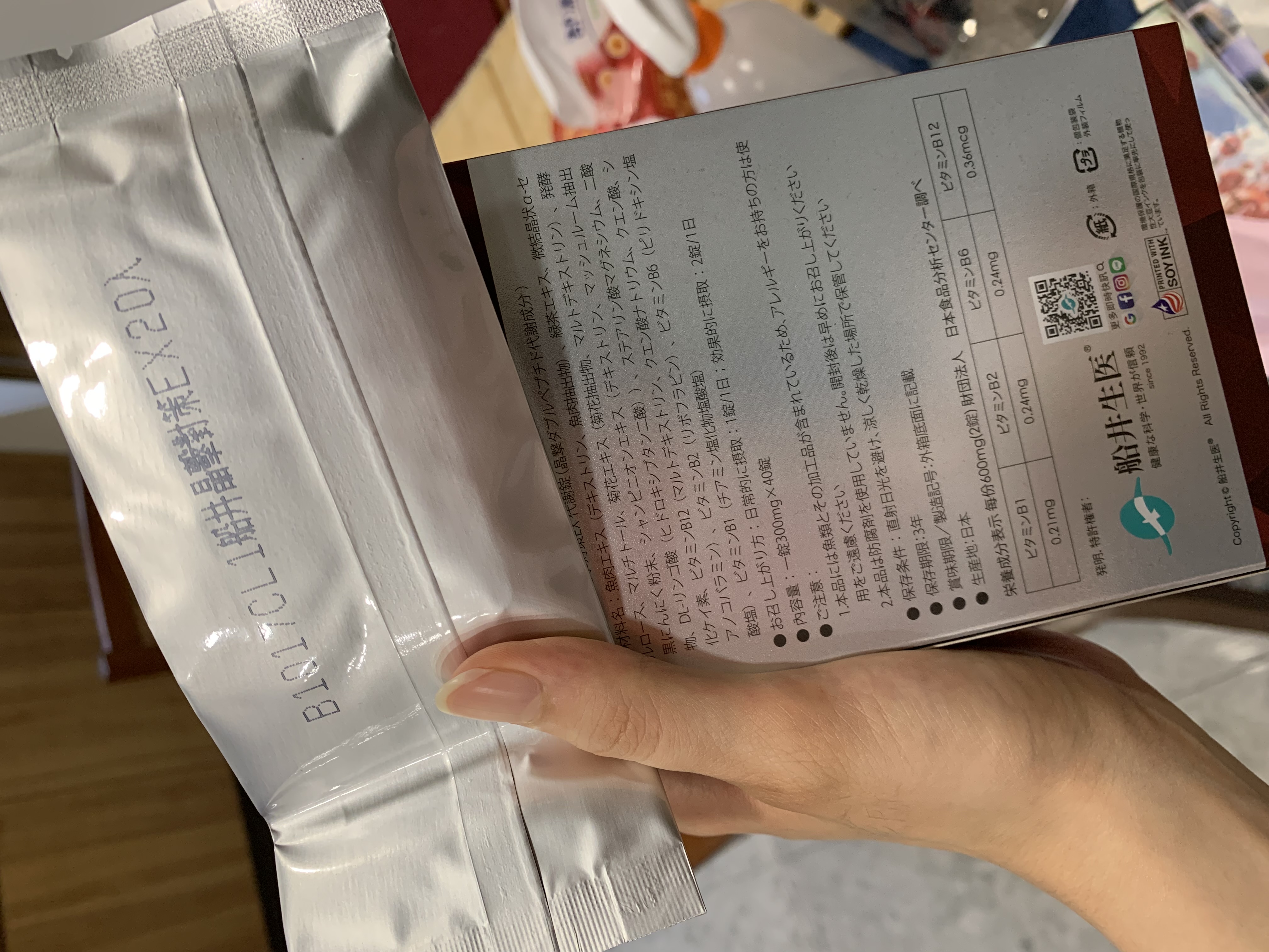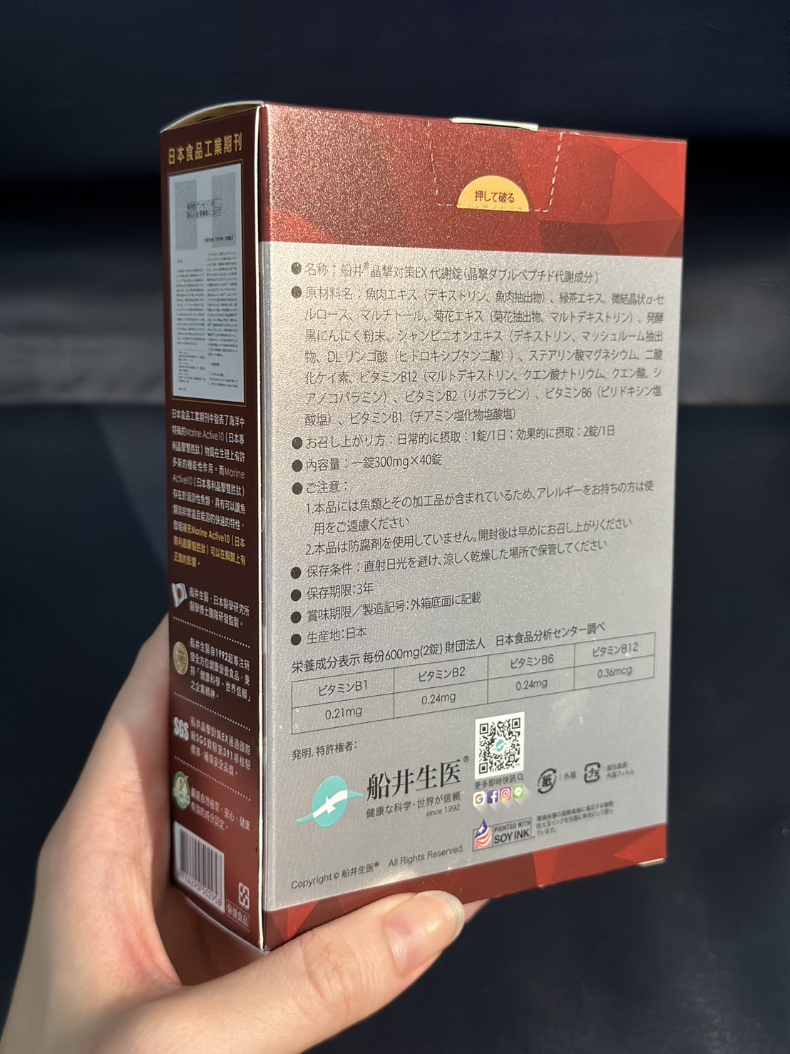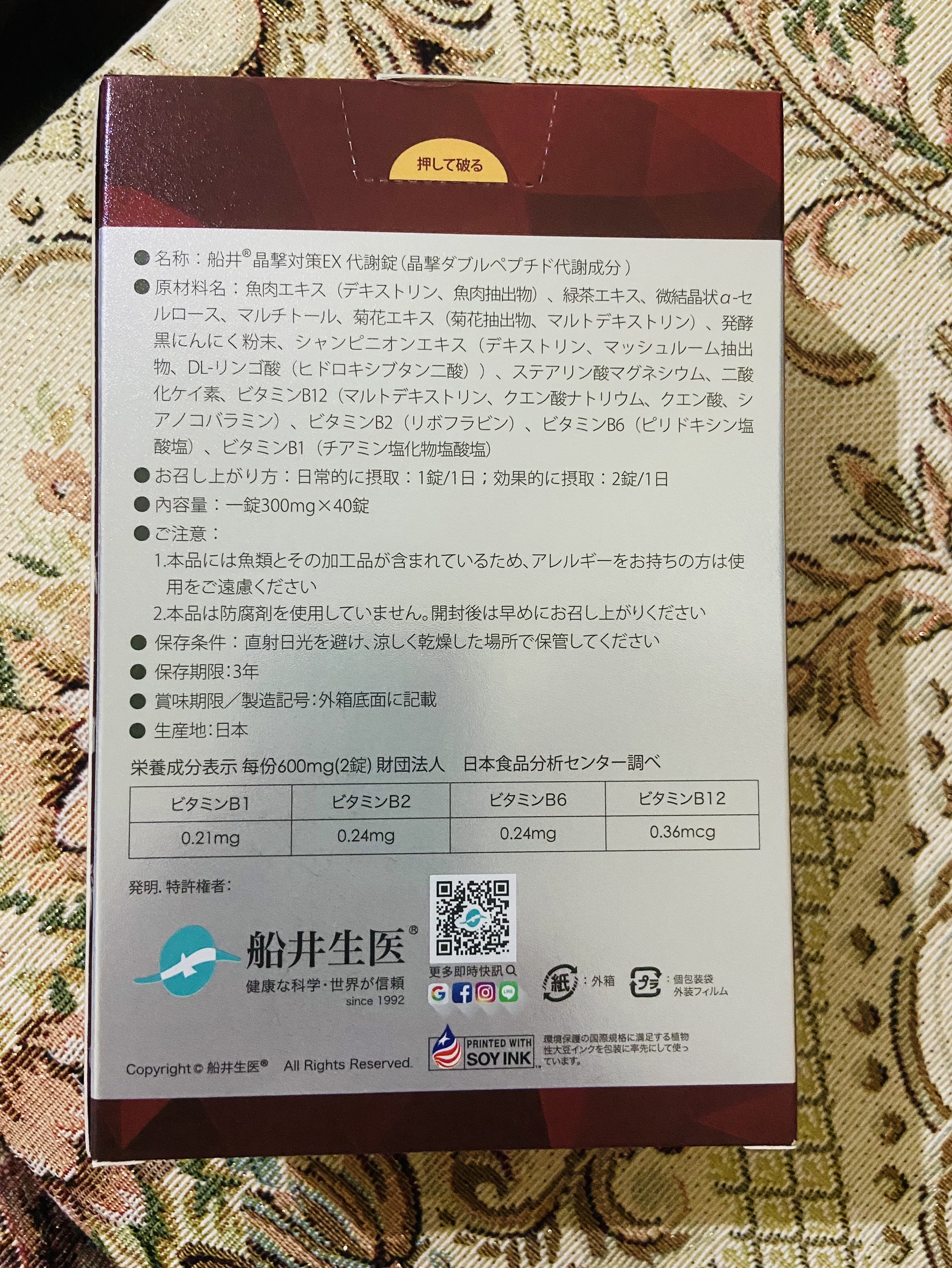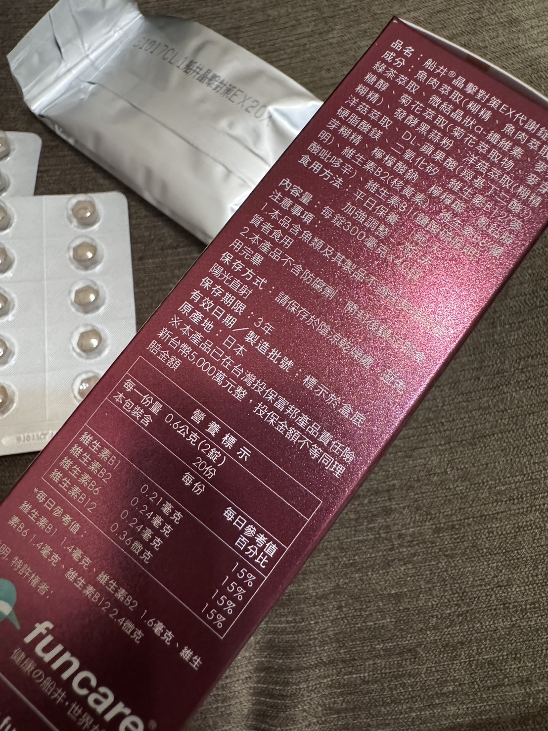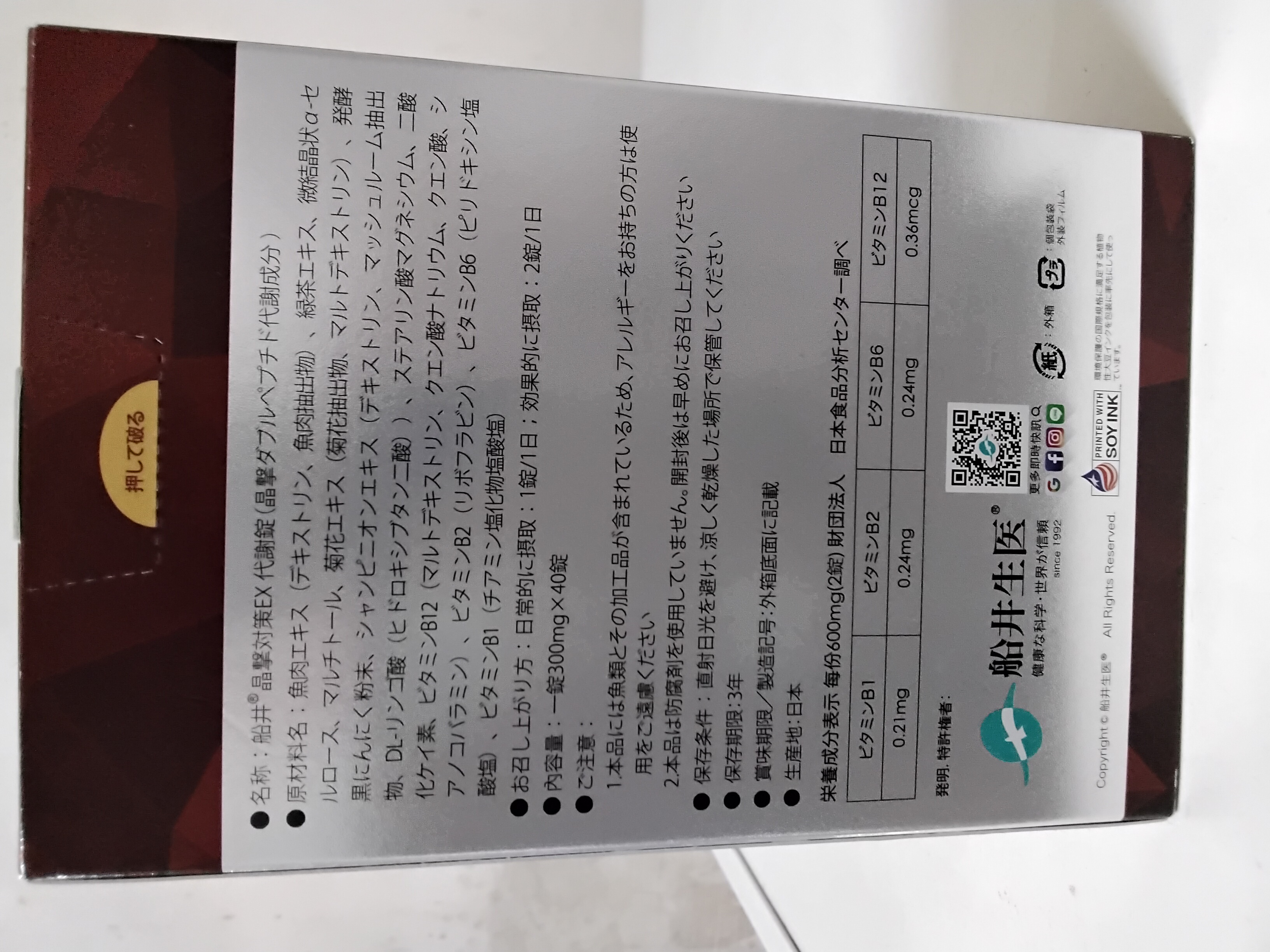 魚肉萃取(糊精、魚肉萃取)、綠茶萃取、微結晶狀α-纖維素、麥芽糖醇、菊花萃取(菊花萃取物、麥芽糊精)、發酵黑蒜粉、洋菇萃取(糊精洋菇萃取、DL-蘋果酸(羥基丁二酸))硬脂酸鎂、二氧化矽、維生素B12(麥芽糊精、檸檬酸鈉、檸檬酸、氰鈷胺明)、維生素B2(核黃素)、維生素B6(鹽酸吡哆辛)、維生素B1(鹽酸硫胺明)