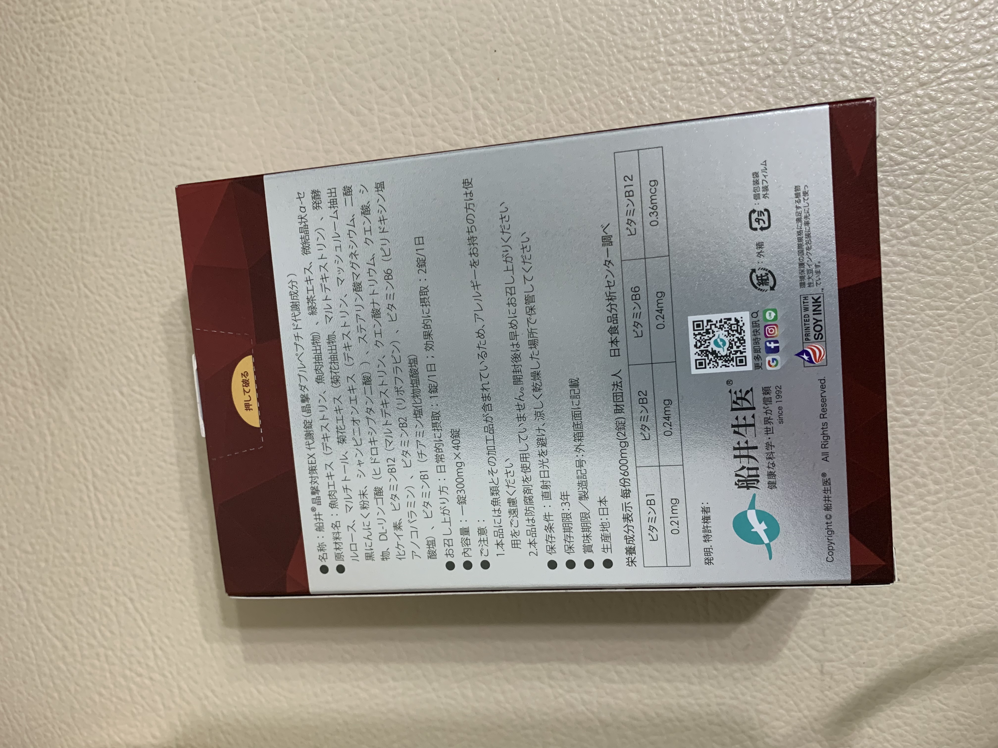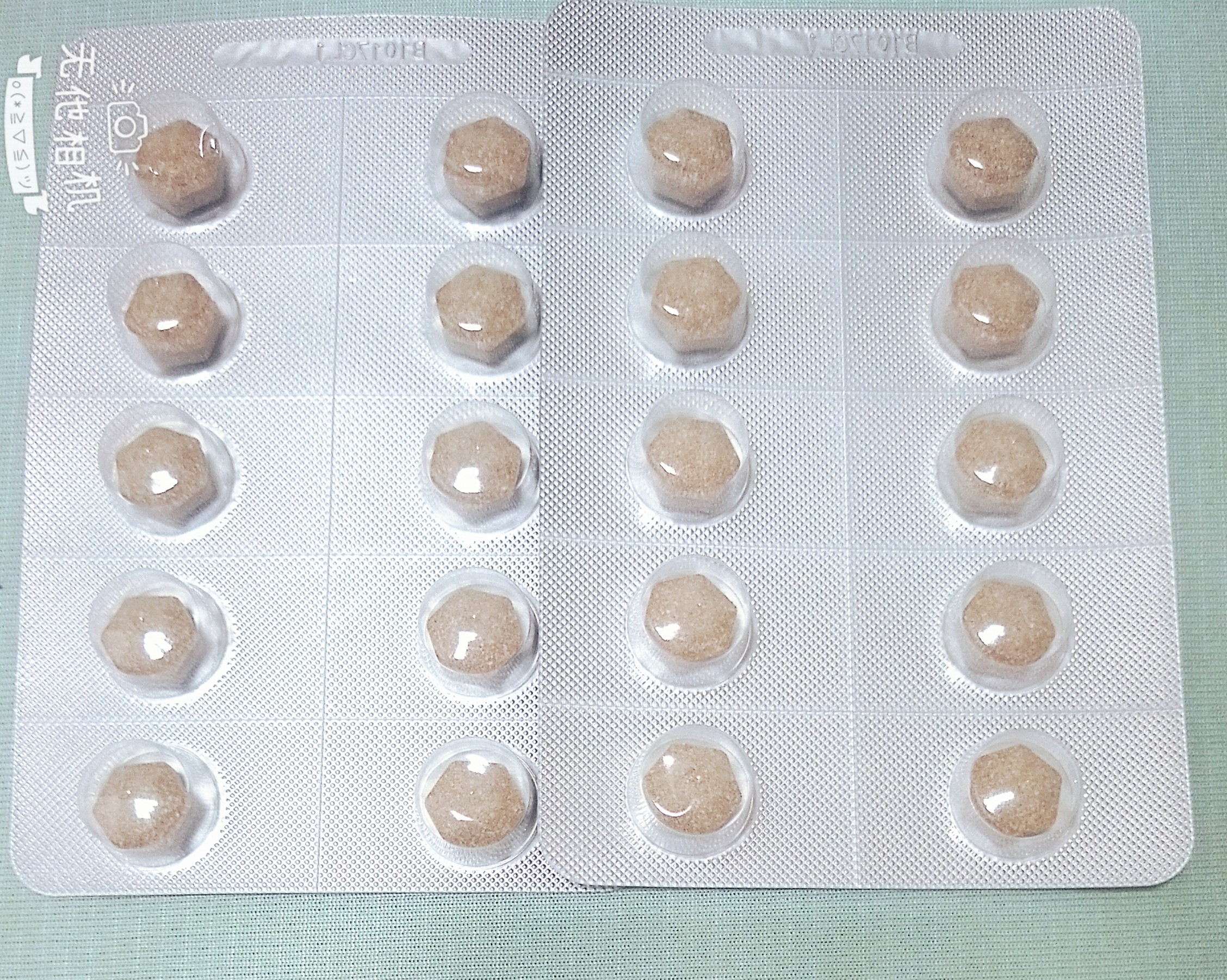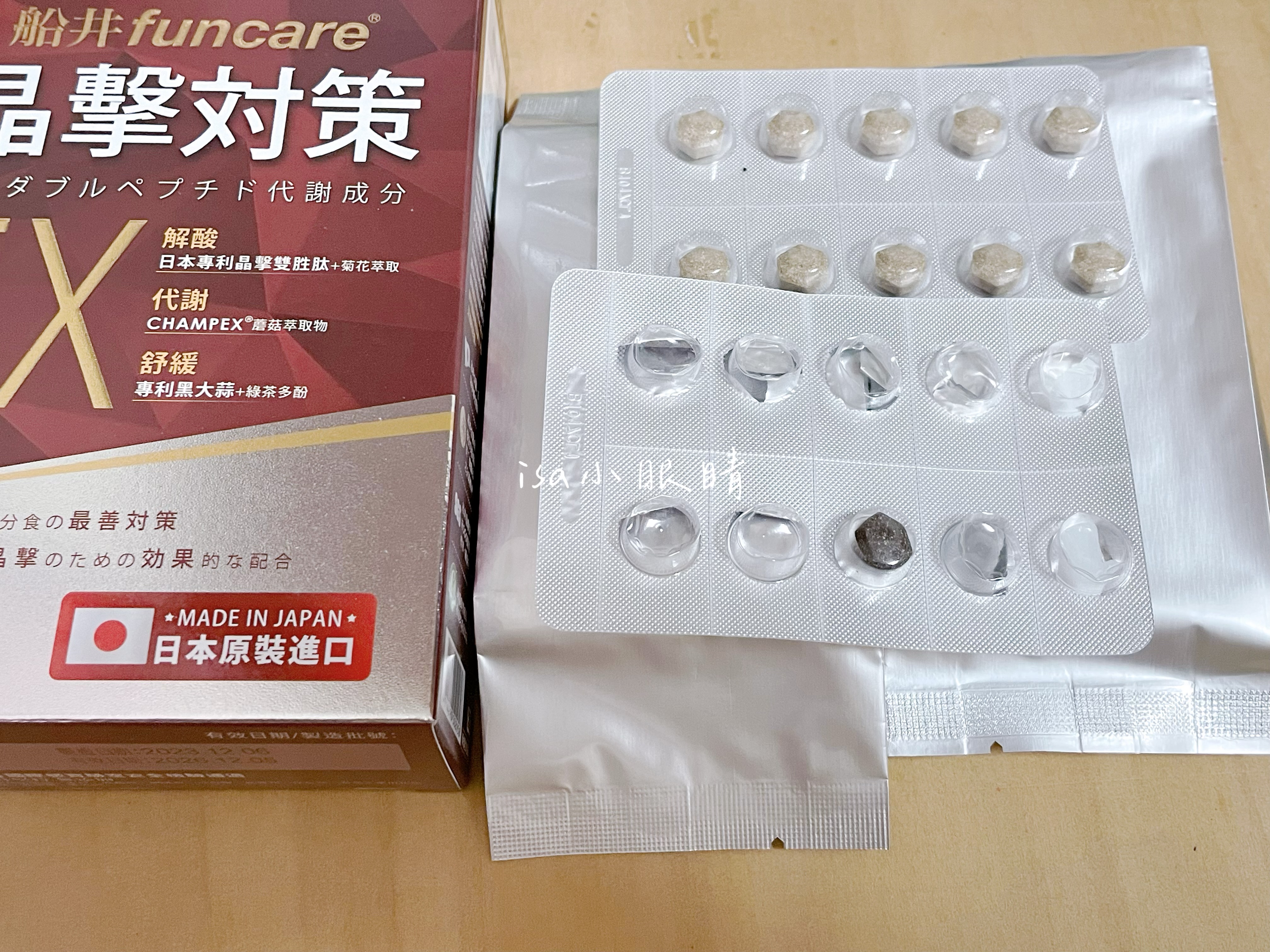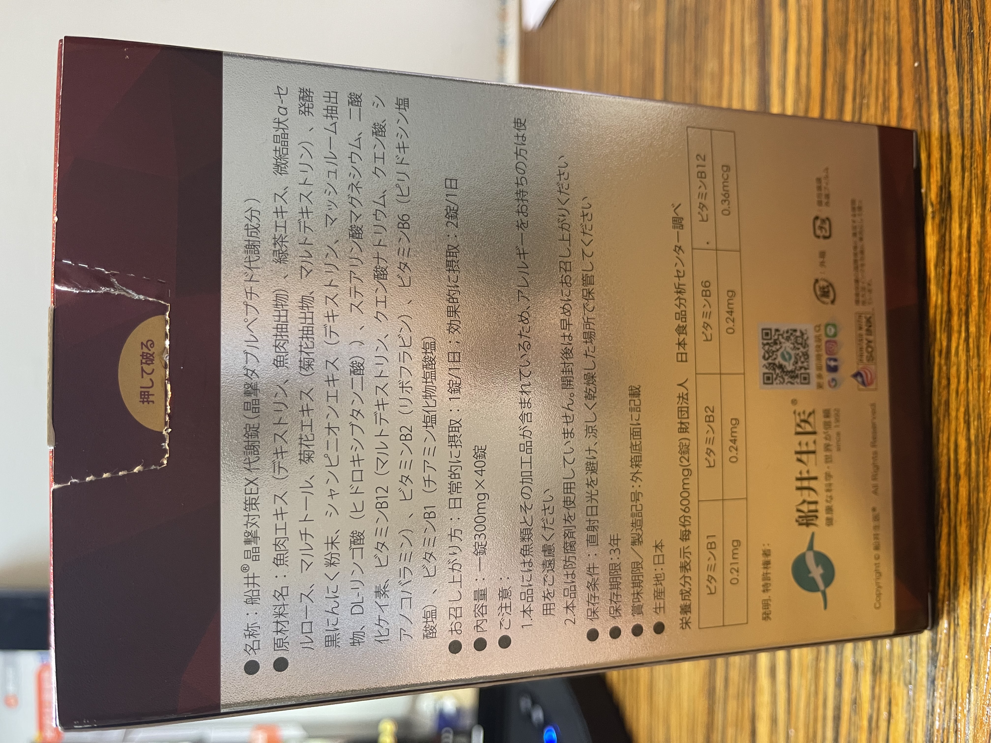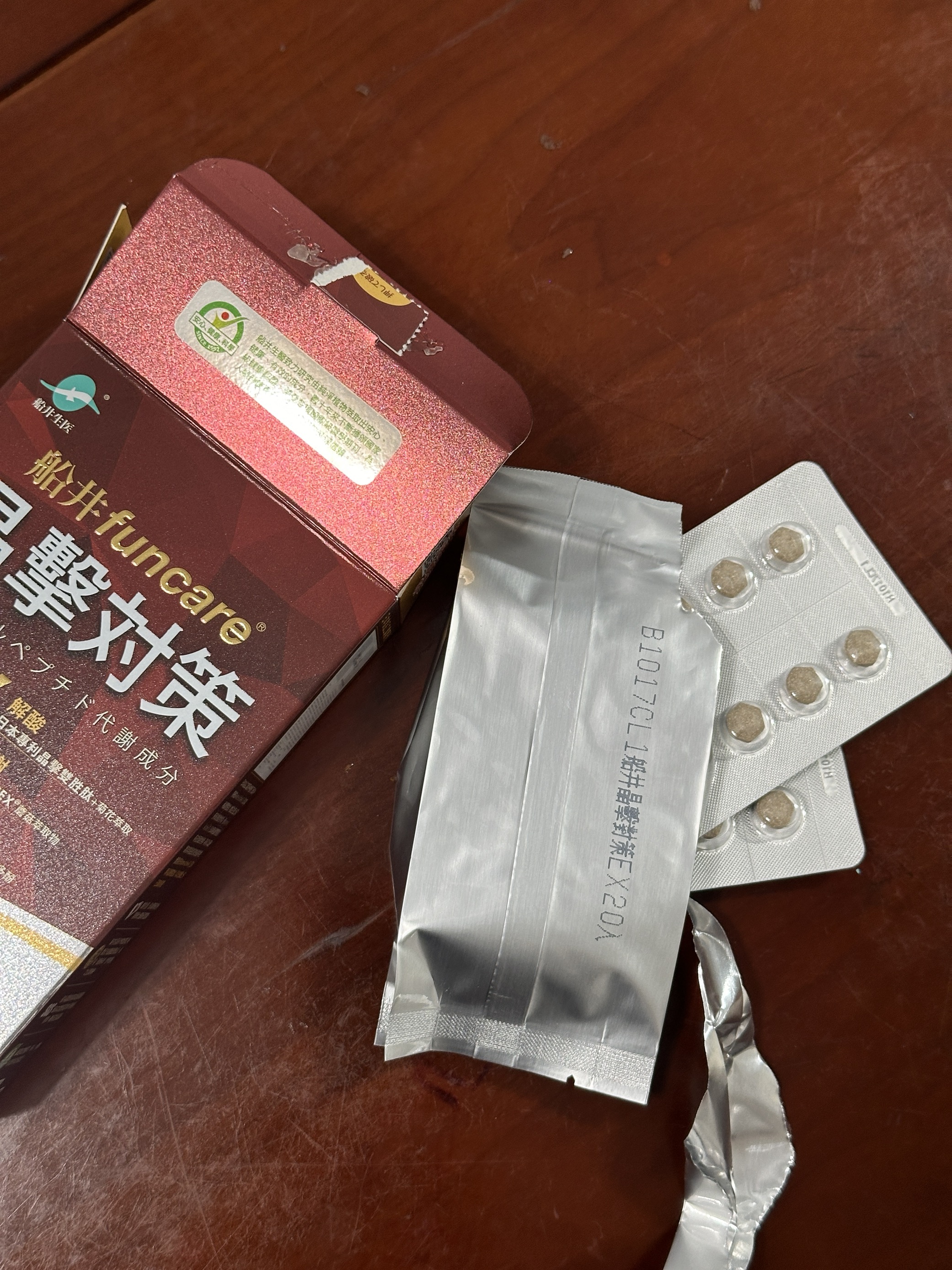 魚肉萃取(糊精、魚肉萃取)、綠茶萃取、微結晶狀α-纖維素、麥芽糖醇、菊花萃取(菊花萃取物、麥芽糊精)、發酵黑蒜粉、洋菇萃取(糊精洋菇萃取、DL-蘋果酸(羥基丁二酸))硬脂酸鎂、二氧化矽、維生素B12(麥芽糊精、檸檬酸鈉、檸檬酸、氰鈷胺明)、維生素B2(核黃素)、維生素B6(鹽酸吡哆辛)、維生素B1(鹽酸硫胺明)