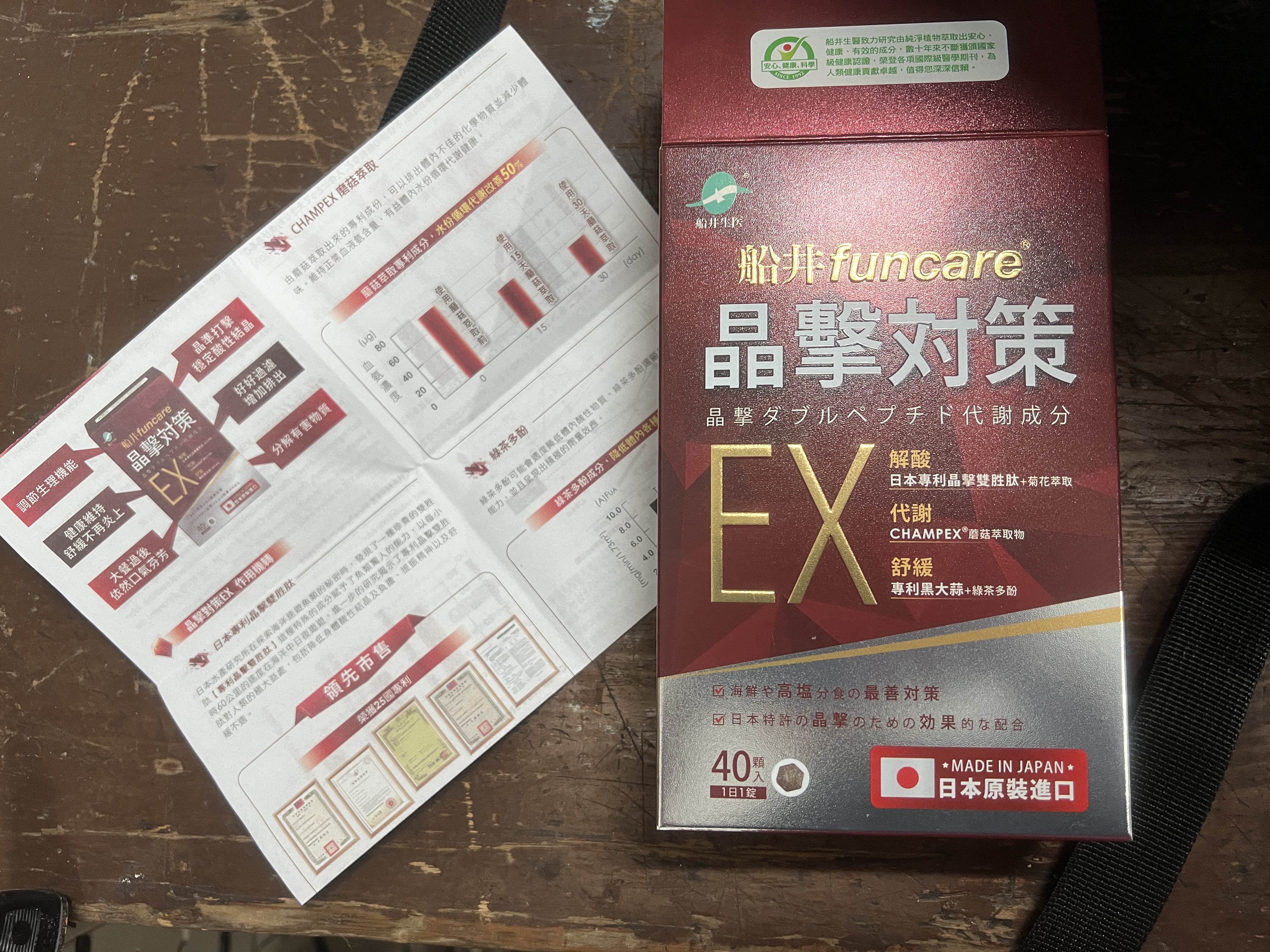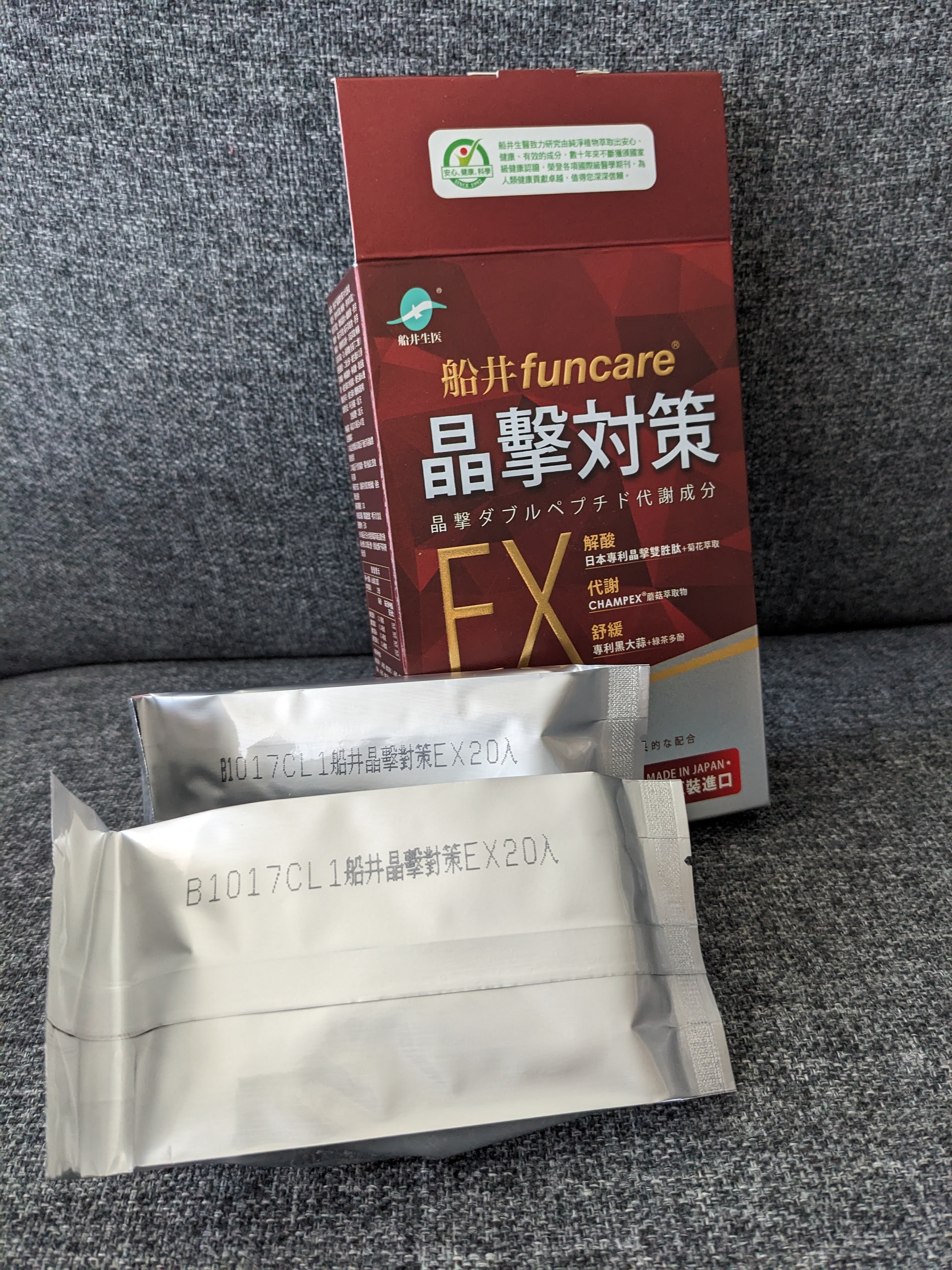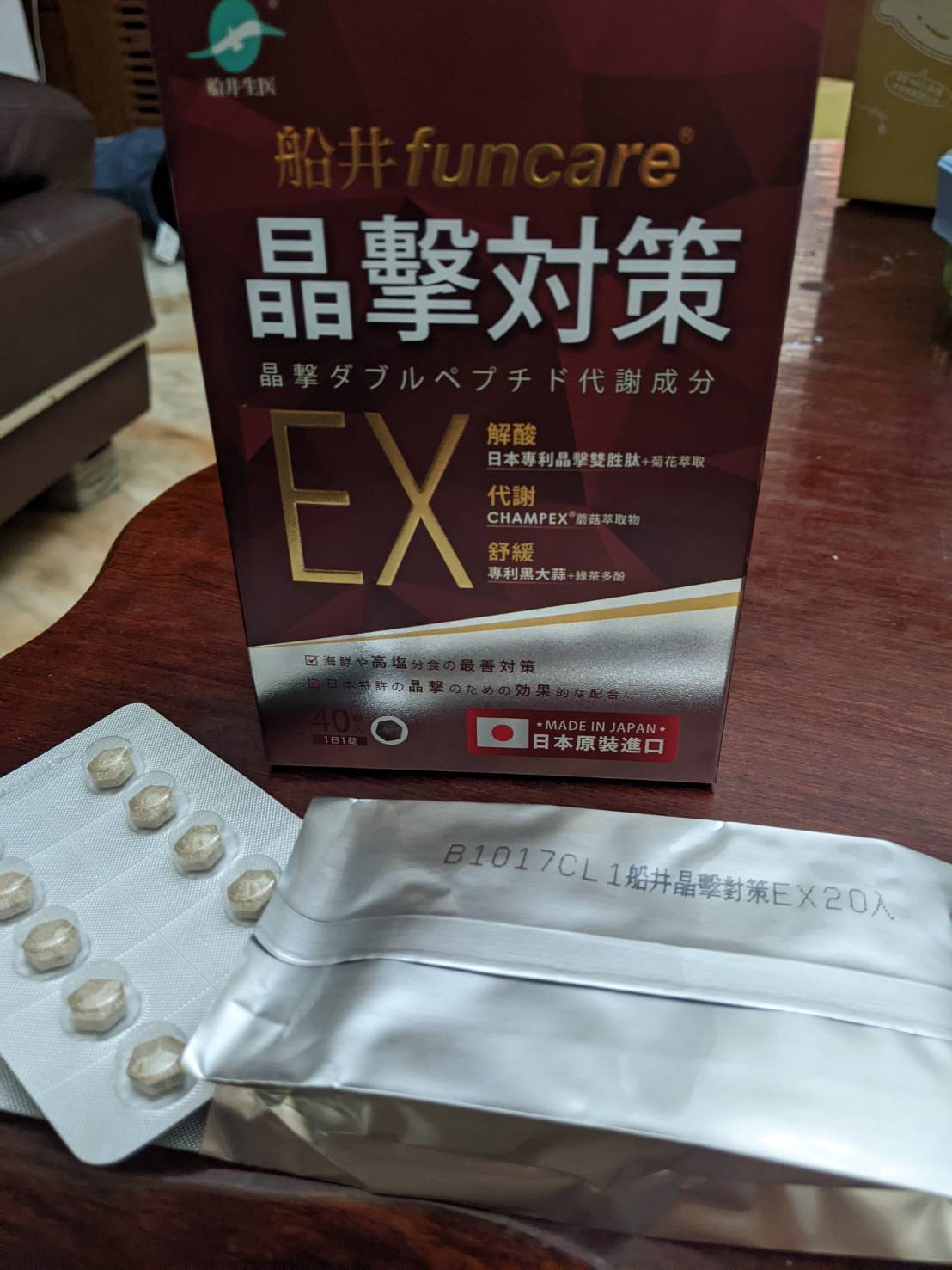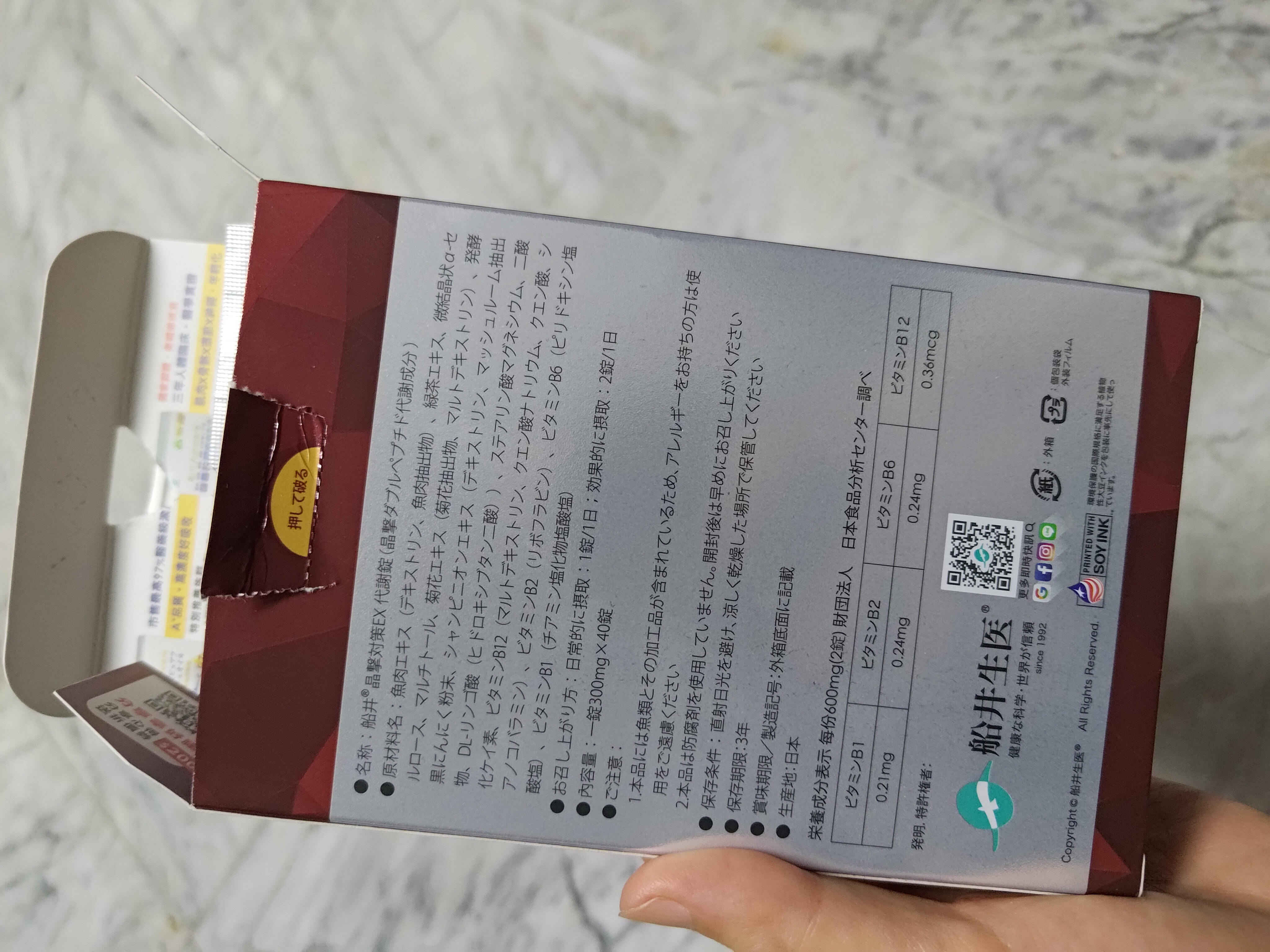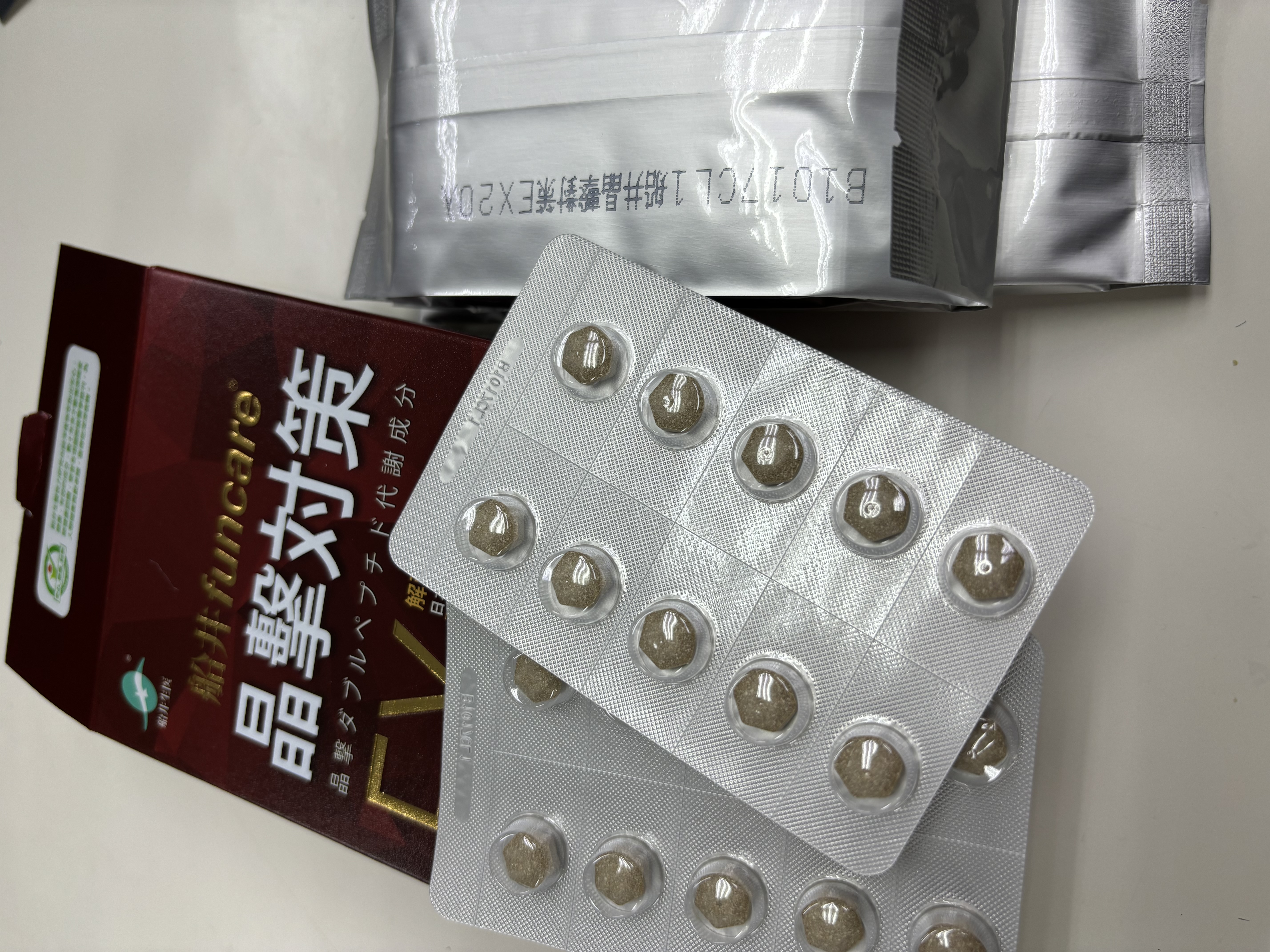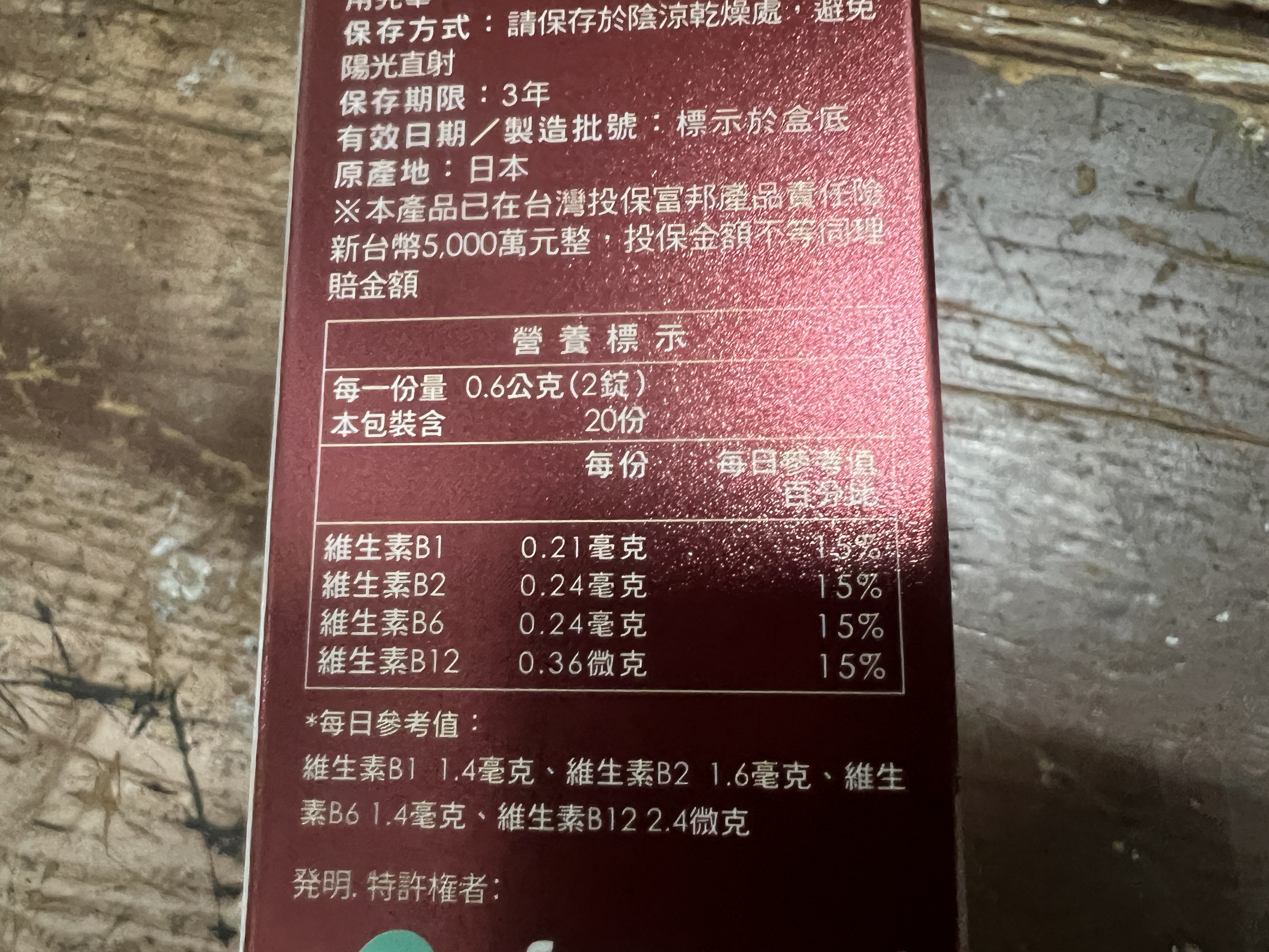 魚肉萃取(糊精、魚肉萃取)、綠茶萃取、微結晶狀α-纖維素、麥芽糖醇、菊花萃取(菊花萃取物、麥芽糊精)、發酵黑蒜粉、洋菇萃取(糊精洋菇萃取、DL-蘋果酸(羥基丁二酸))硬脂酸鎂、二氧化矽、維生素B12(麥芽糊精、檸檬酸鈉、檸檬酸、氰鈷胺明)、維生素B2(核黃素)、維生素B6(鹽酸吡哆辛)、維生素B1(鹽酸硫胺明)