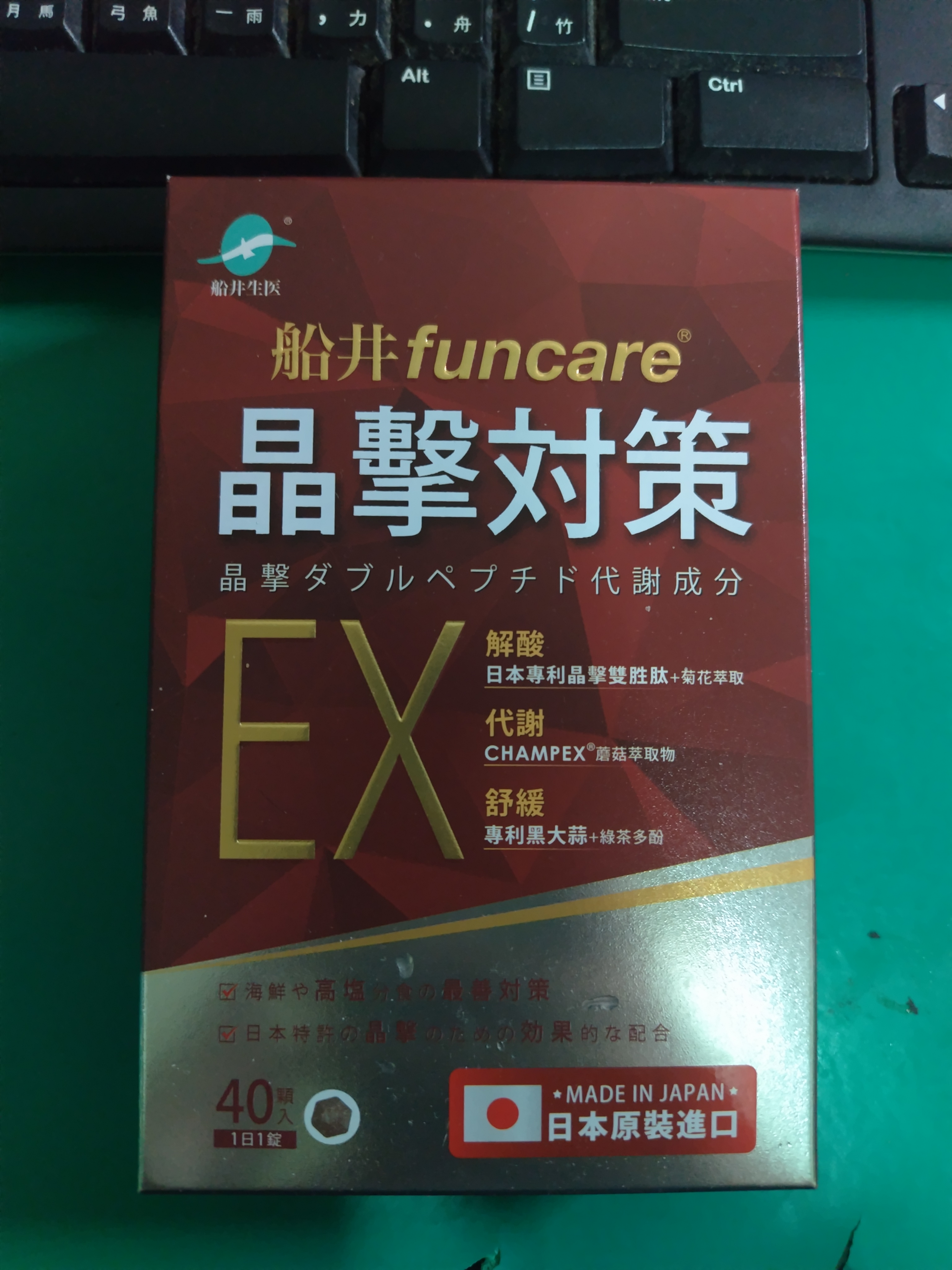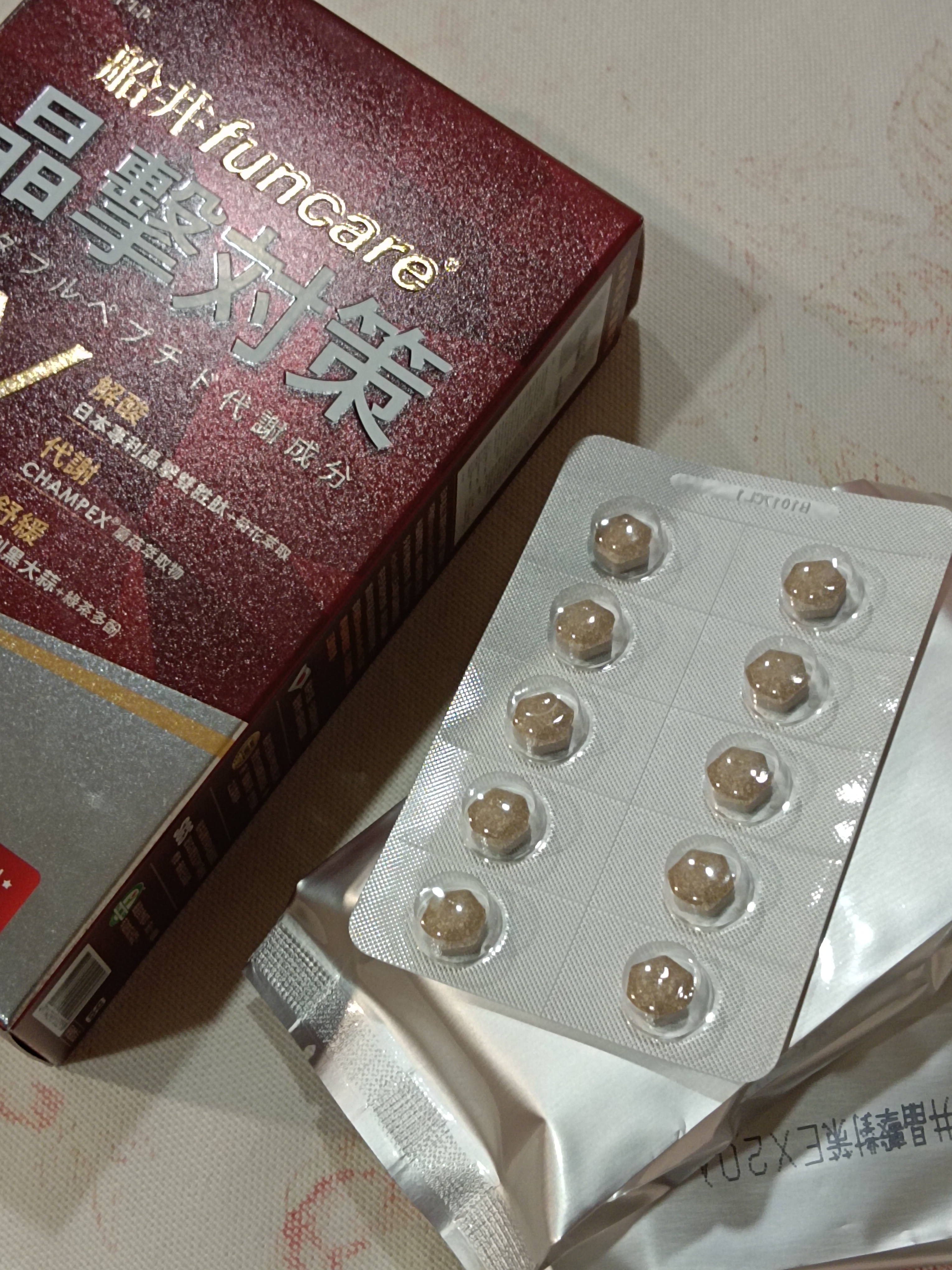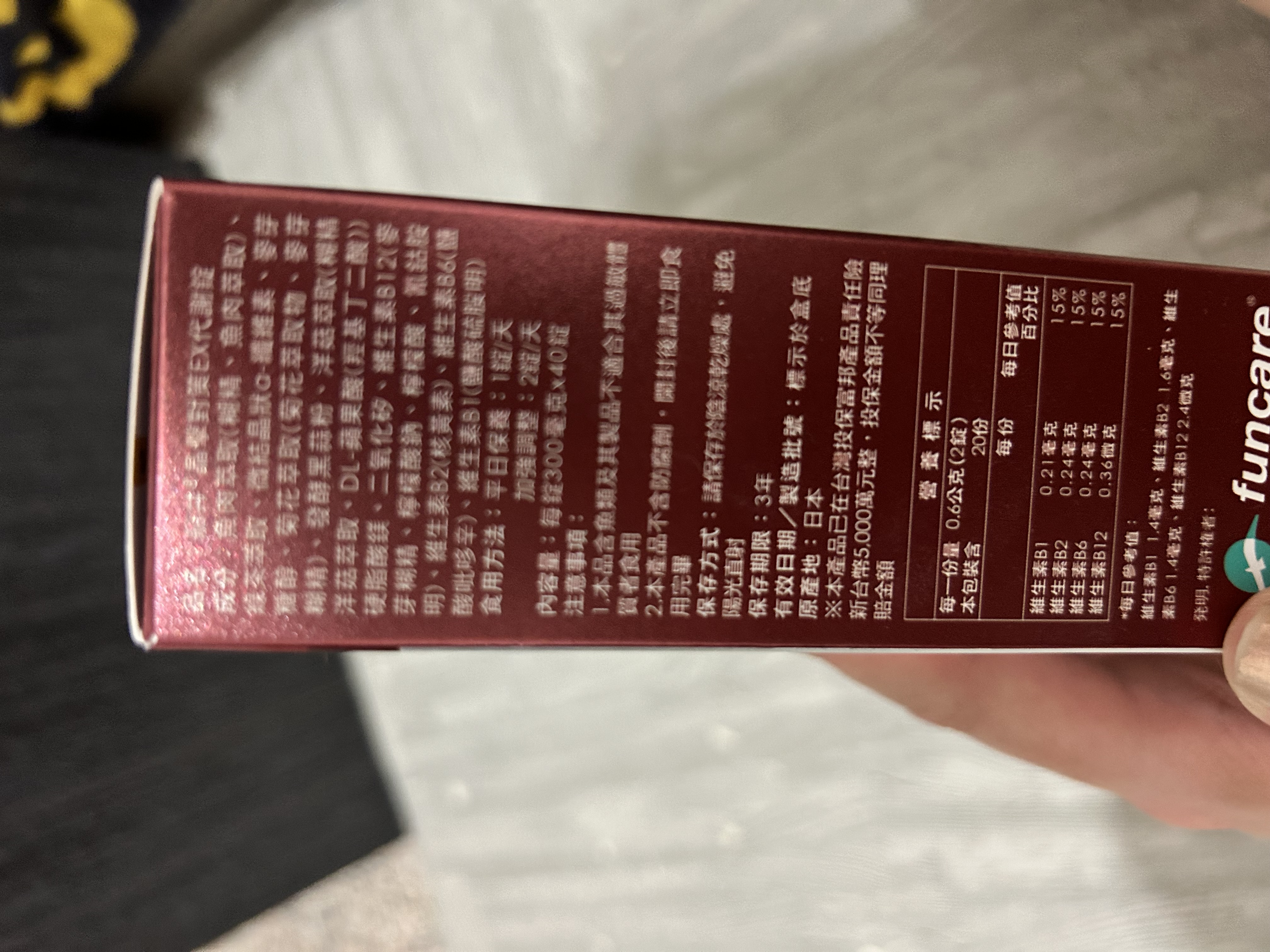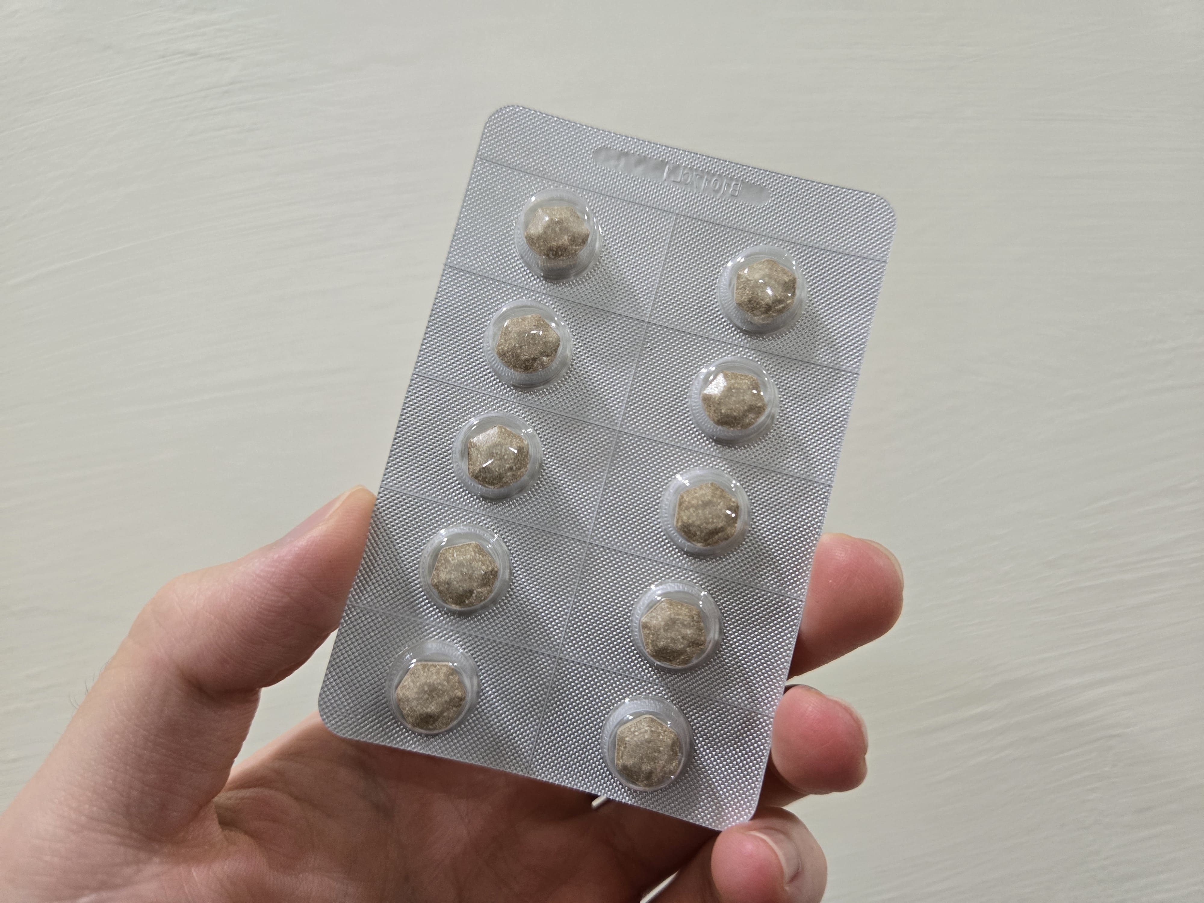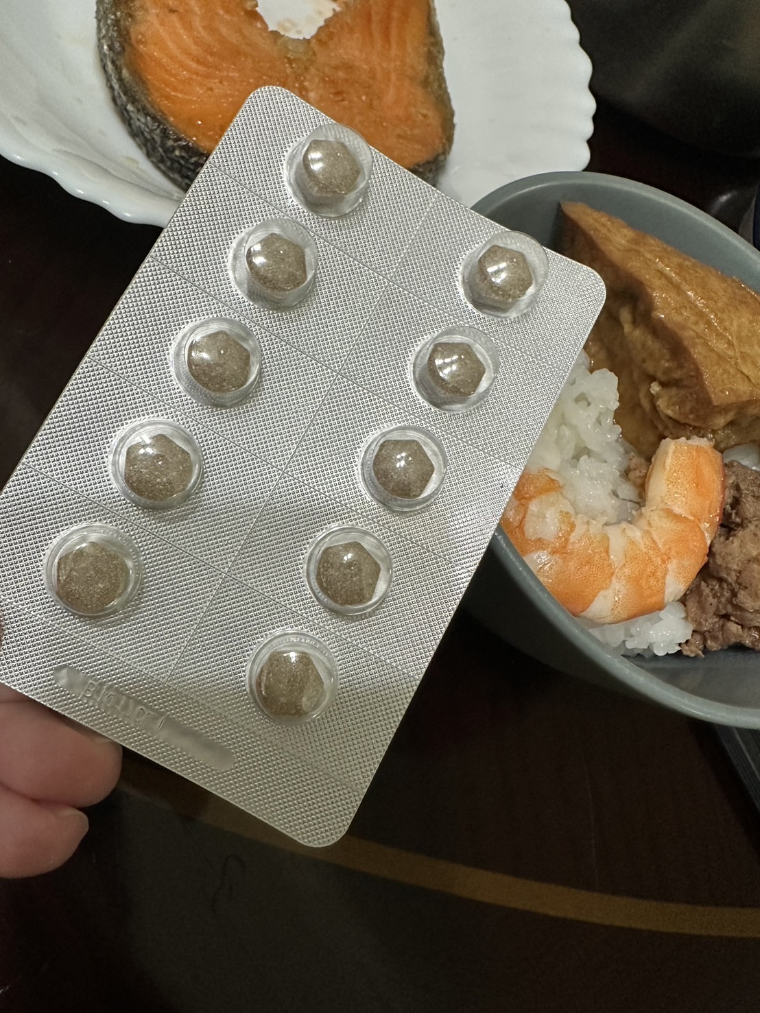 魚肉萃取(糊精、魚肉萃取)、綠茶萃取、微結晶狀α-纖維素、麥芽糖醇、菊花萃取(菊花萃取物、麥芽糊精)、發酵黑蒜粉、洋菇萃取(糊精洋菇萃取、DL-蘋果酸(羥基丁二酸))硬脂酸鎂、二氧化矽、維生素B12(麥芽糊精、檸檬酸鈉、檸檬酸、氰鈷胺明)、維生素B2(核黃素)、維生素B6(鹽酸吡哆辛)、維生素B1(鹽酸硫胺明)