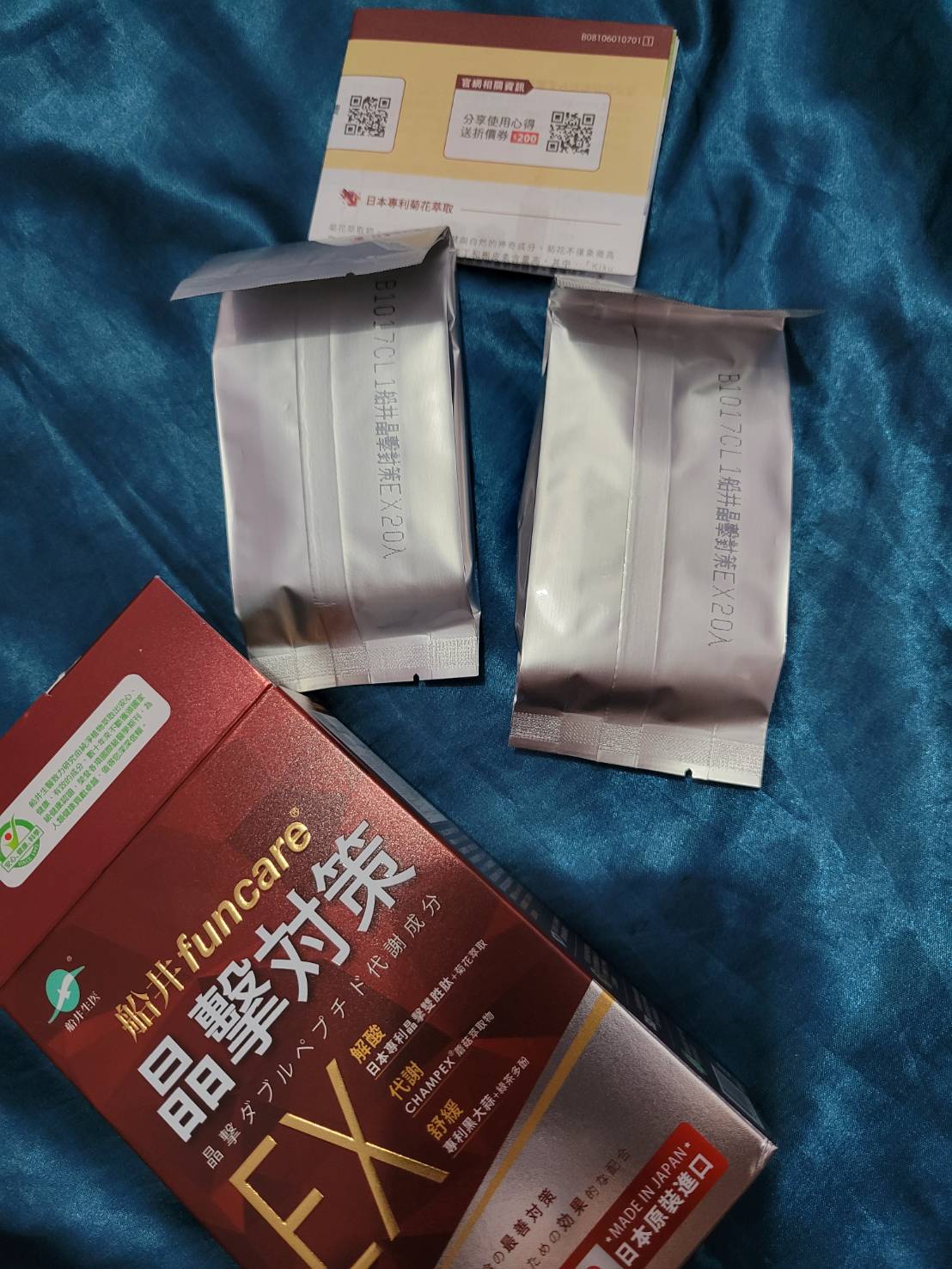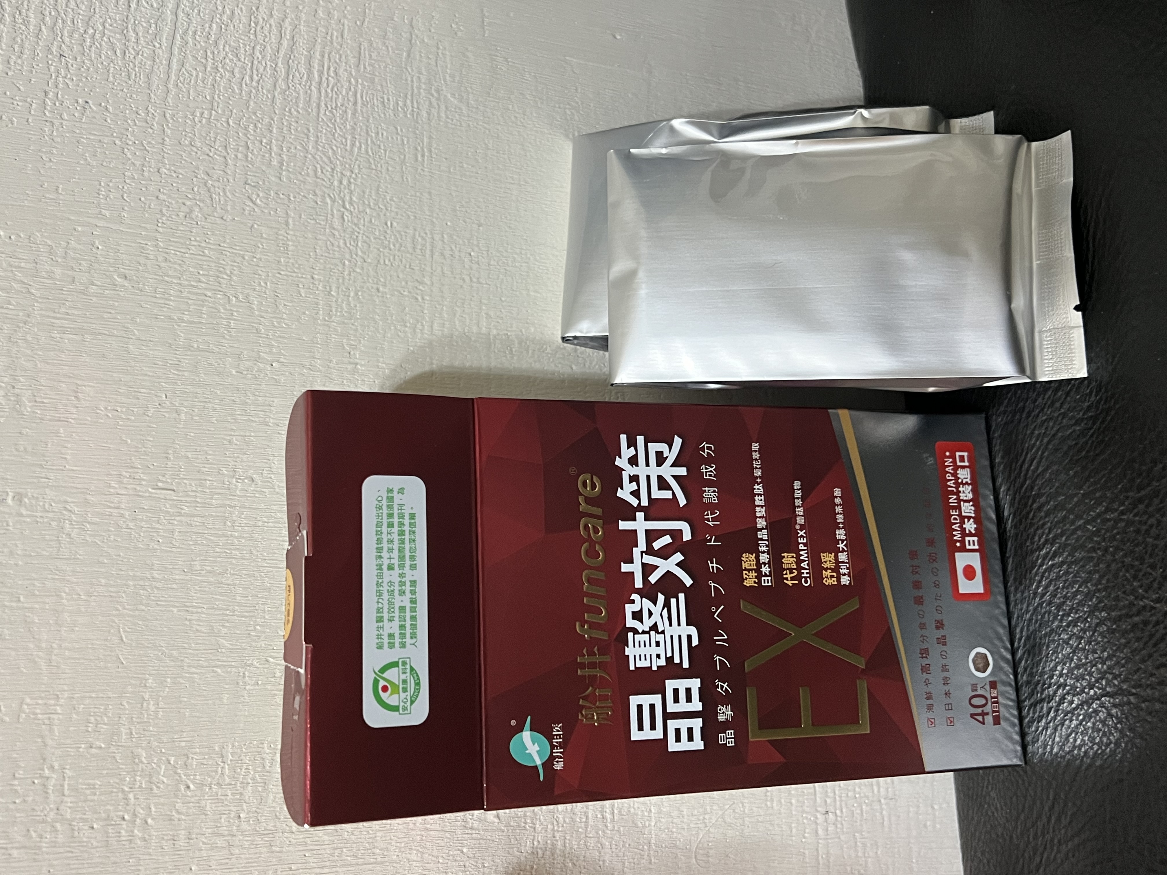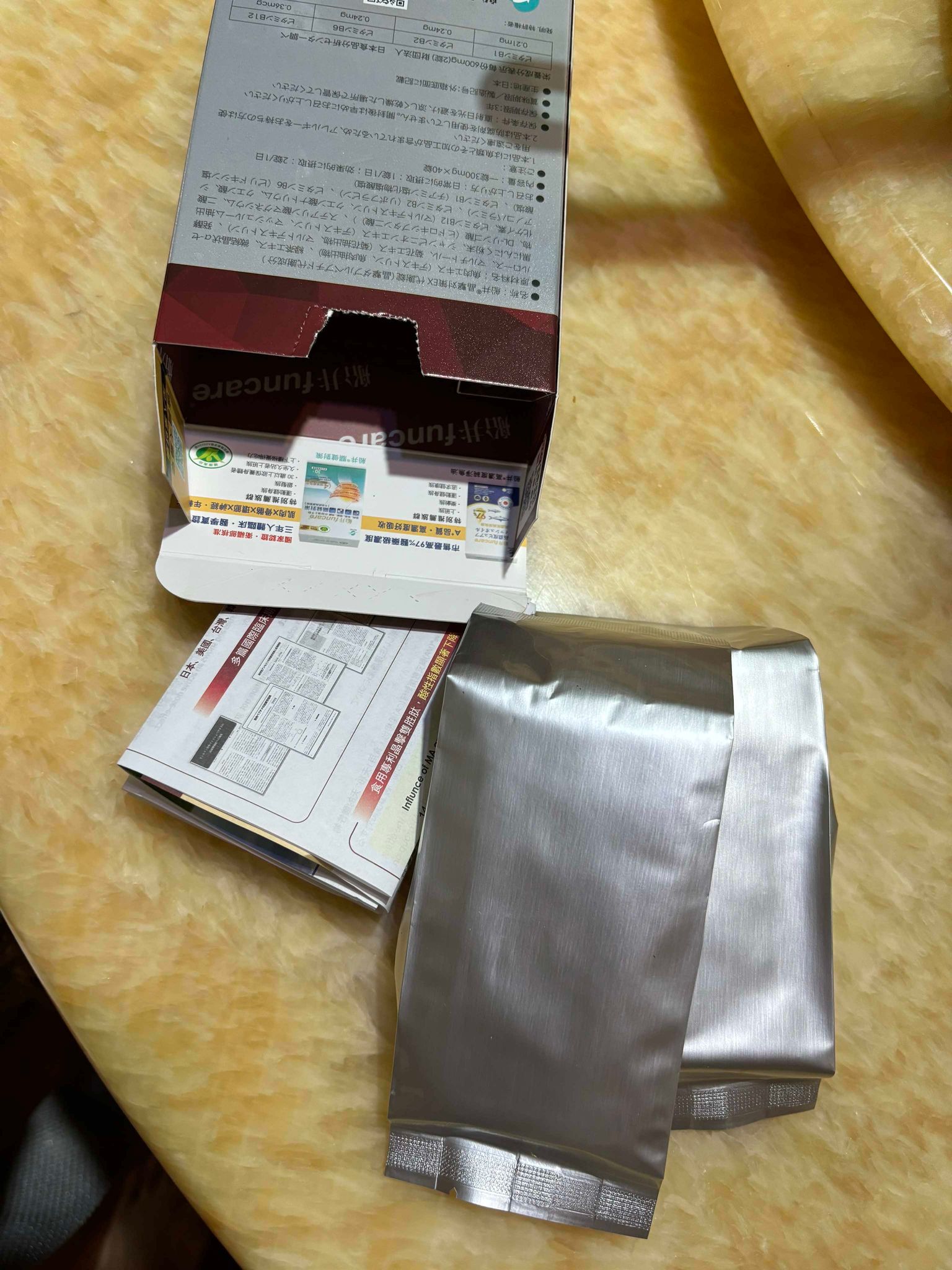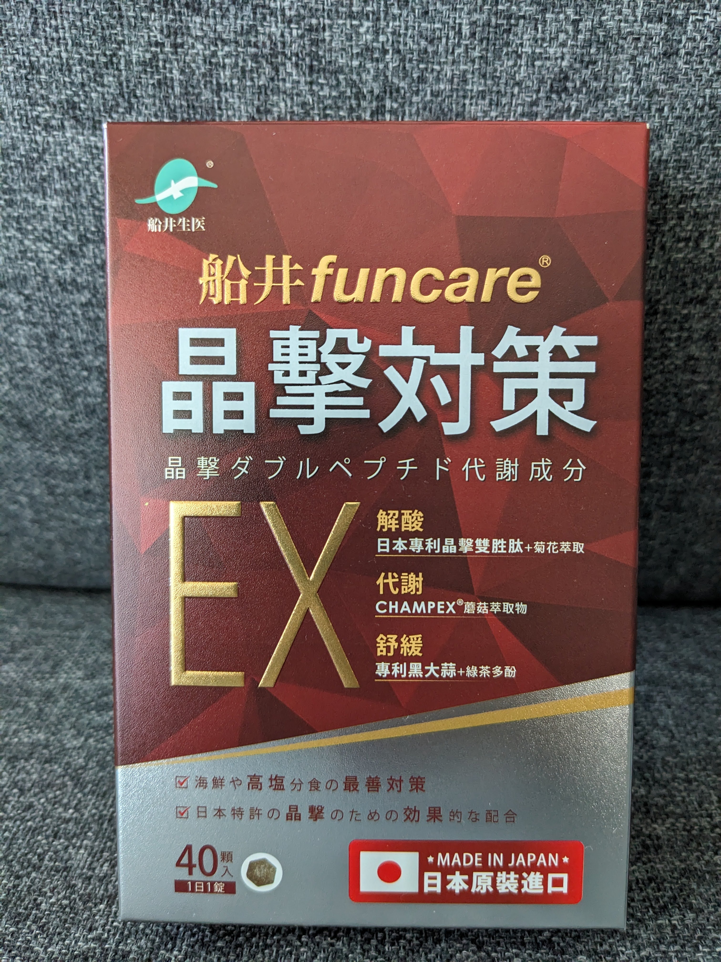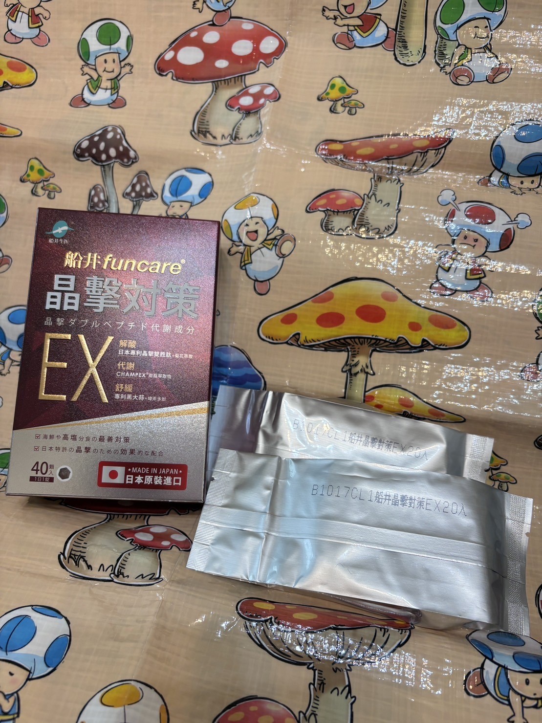 魚肉萃取(糊精、魚肉萃取)、綠茶萃取、微結晶狀α-纖維素、麥芽糖醇、菊花萃取(菊花萃取物、麥芽糊精)、發酵黑蒜粉、洋菇萃取(糊精洋菇萃取、DL-蘋果酸(羥基丁二酸))硬脂酸鎂、二氧化矽、維生素B12(麥芽糊精、檸檬酸鈉、檸檬酸、氰鈷胺明)、維生素B2(核黃素)、維生素B6(鹽酸吡哆辛)、維生素B1(鹽酸硫胺明)