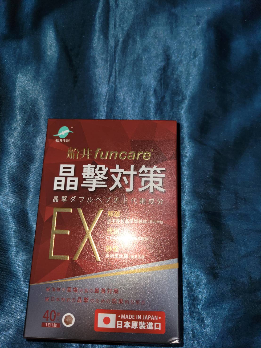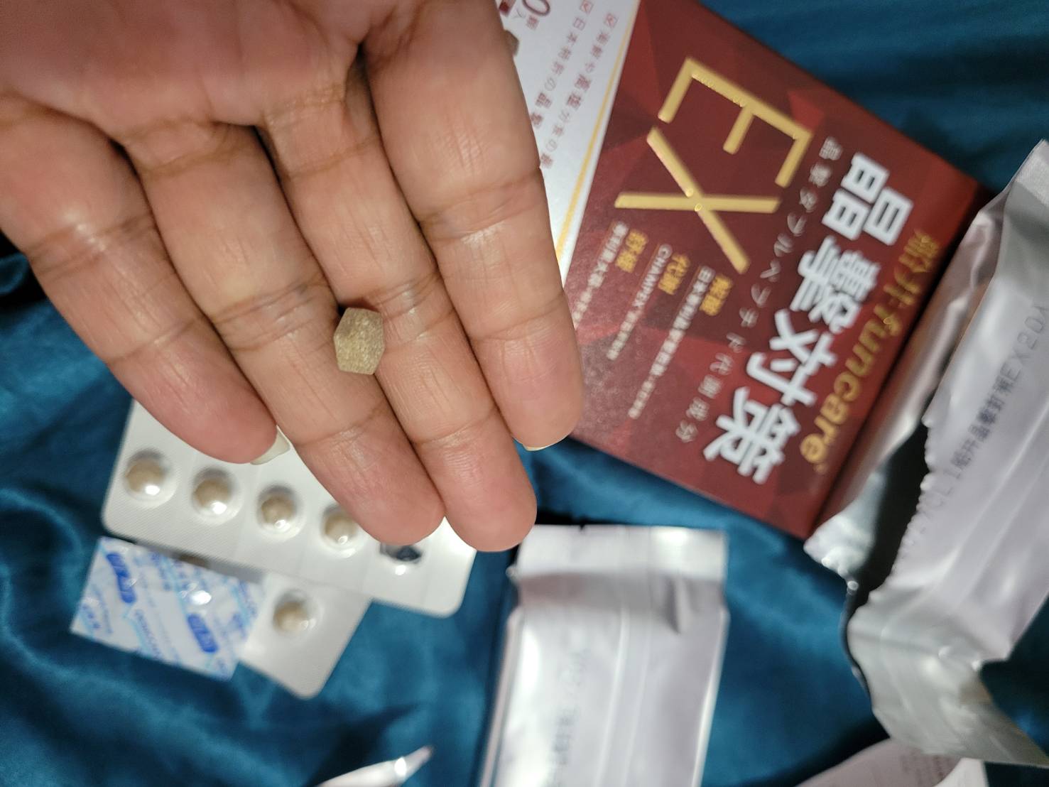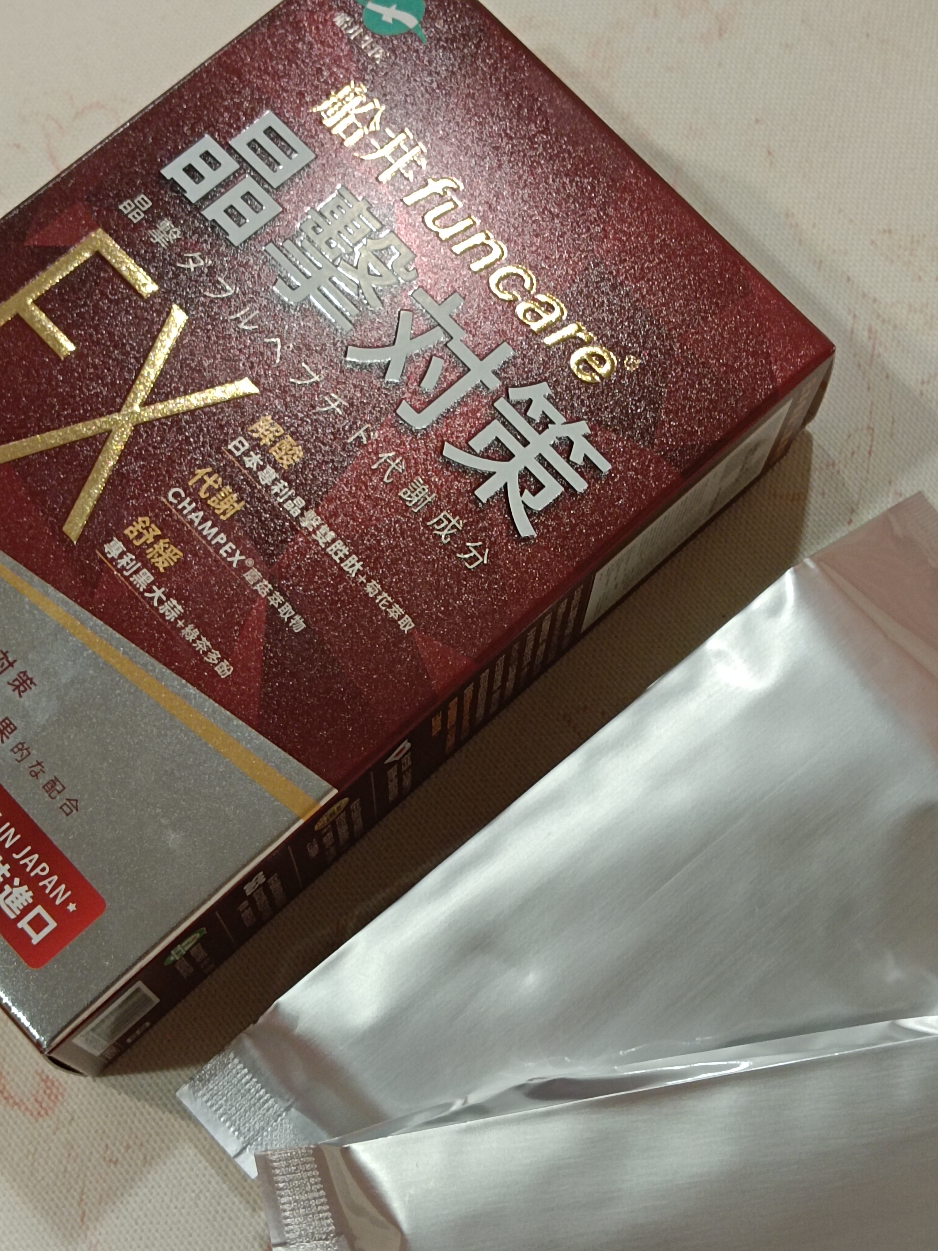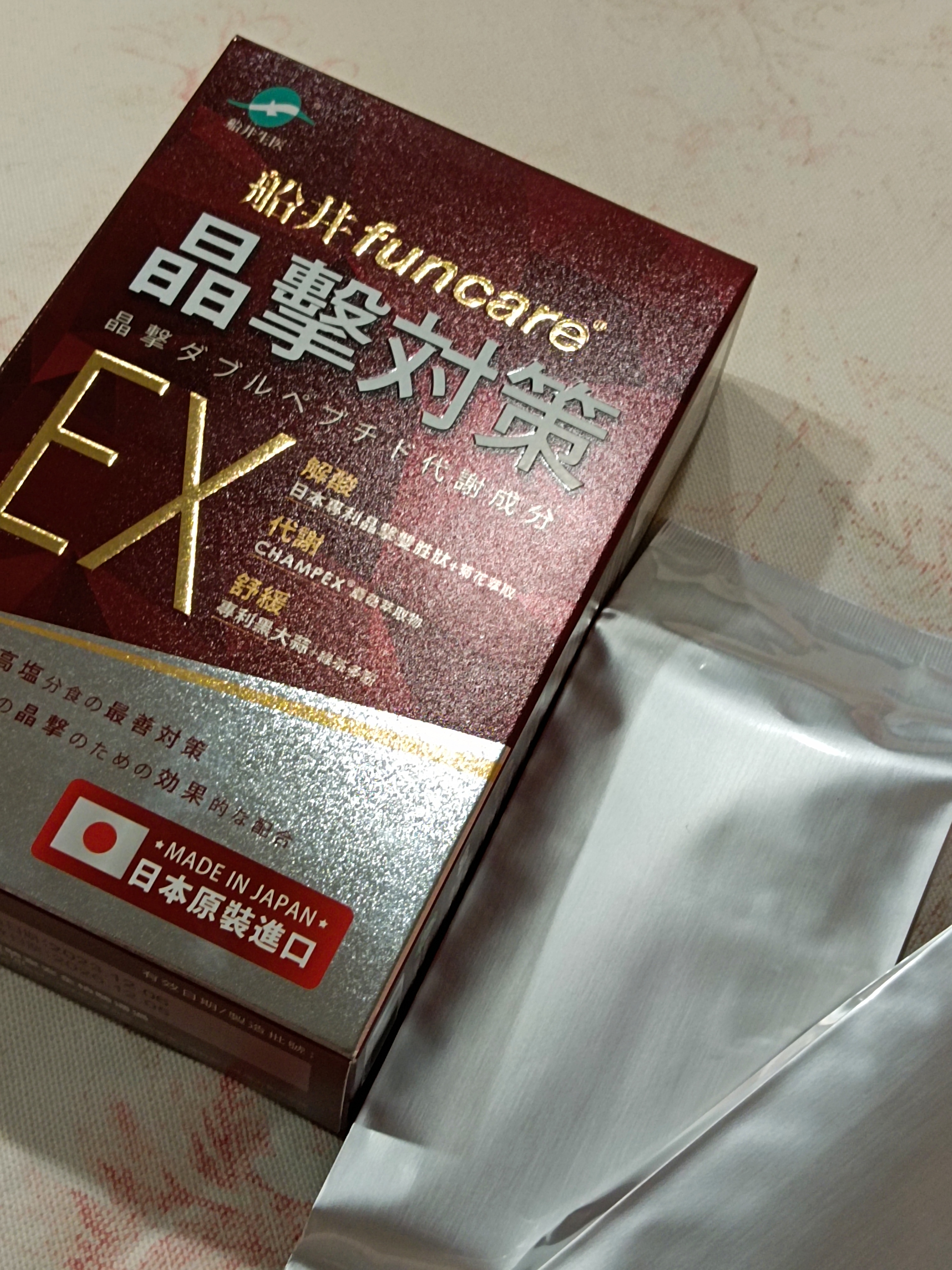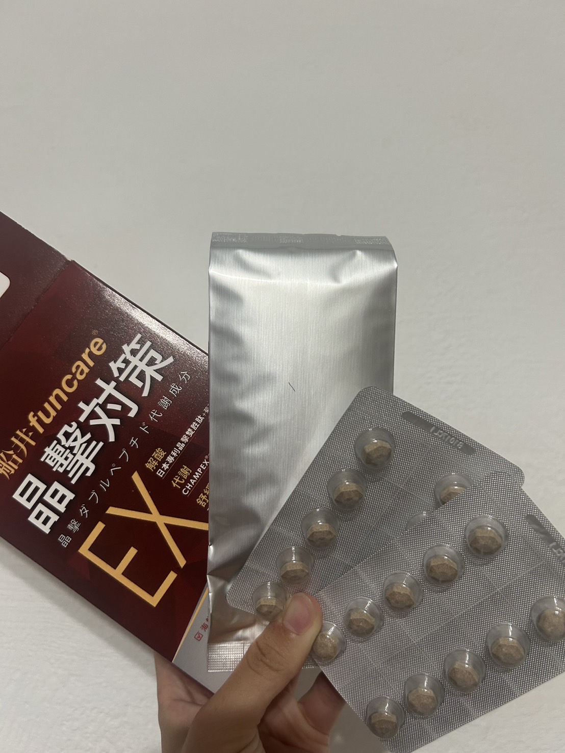 魚肉萃取(糊精、魚肉萃取)、綠茶萃取、微結晶狀α-纖維素、麥芽糖醇、菊花萃取(菊花萃取物、麥芽糊精)、發酵黑蒜粉、洋菇萃取(糊精洋菇萃取、DL-蘋果酸(羥基丁二酸))硬脂酸鎂、二氧化矽、維生素B12(麥芽糊精、檸檬酸鈉、檸檬酸、氰鈷胺明)、維生素B2(核黃素)、維生素B6(鹽酸吡哆辛)、維生素B1(鹽酸硫胺明)