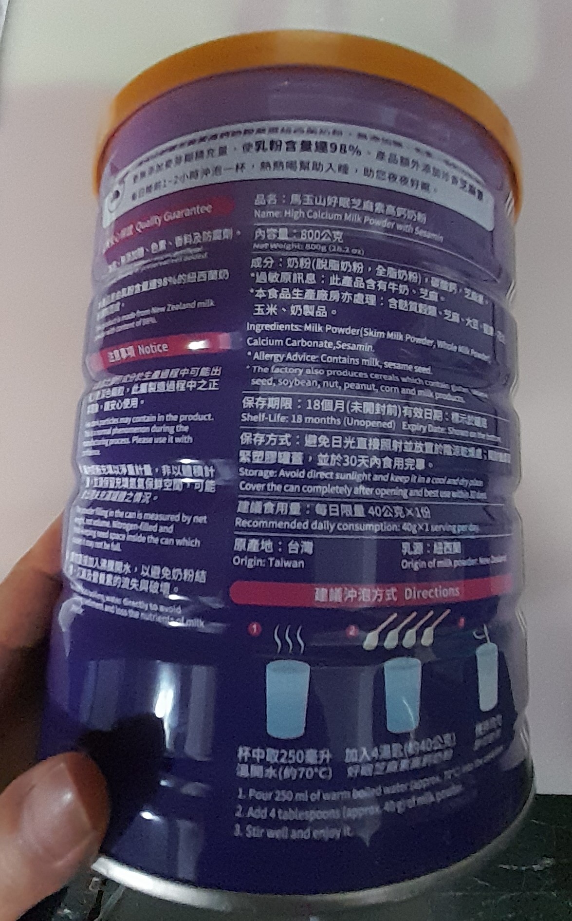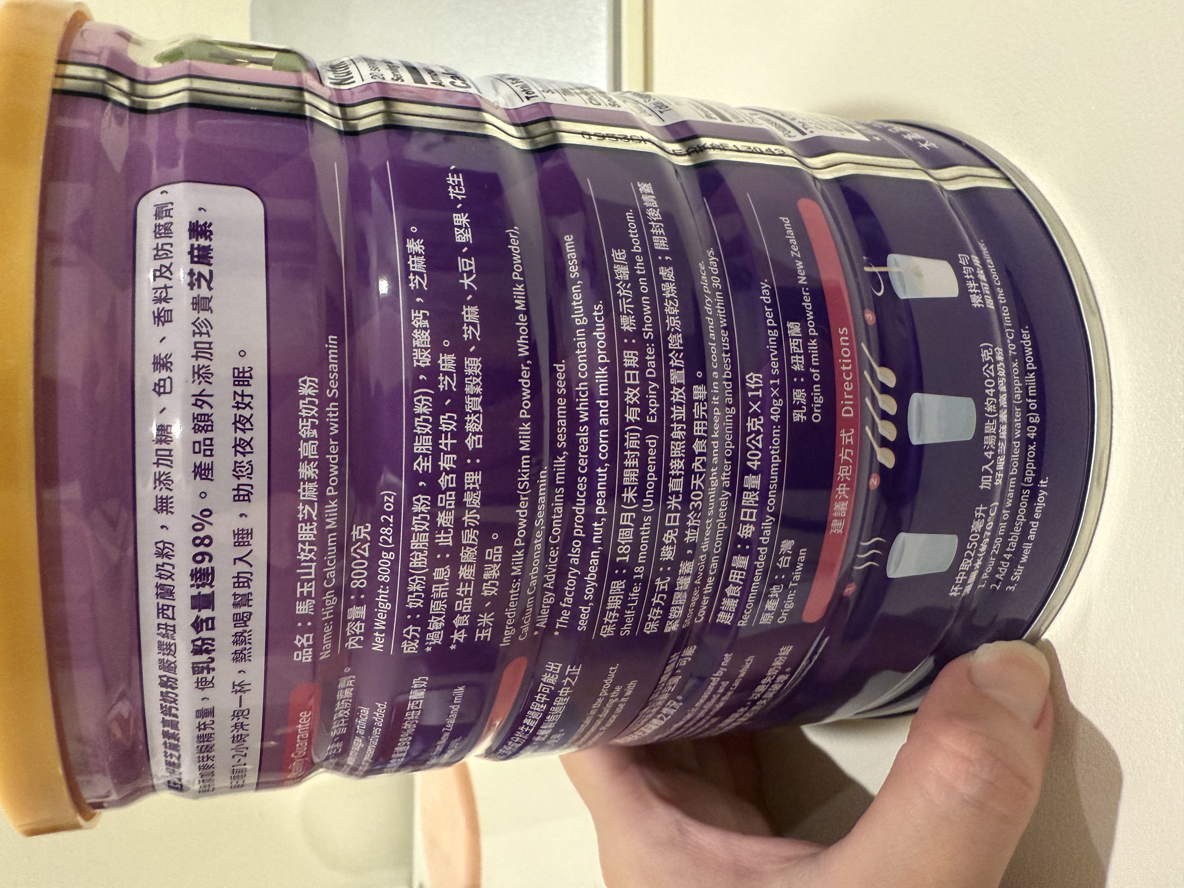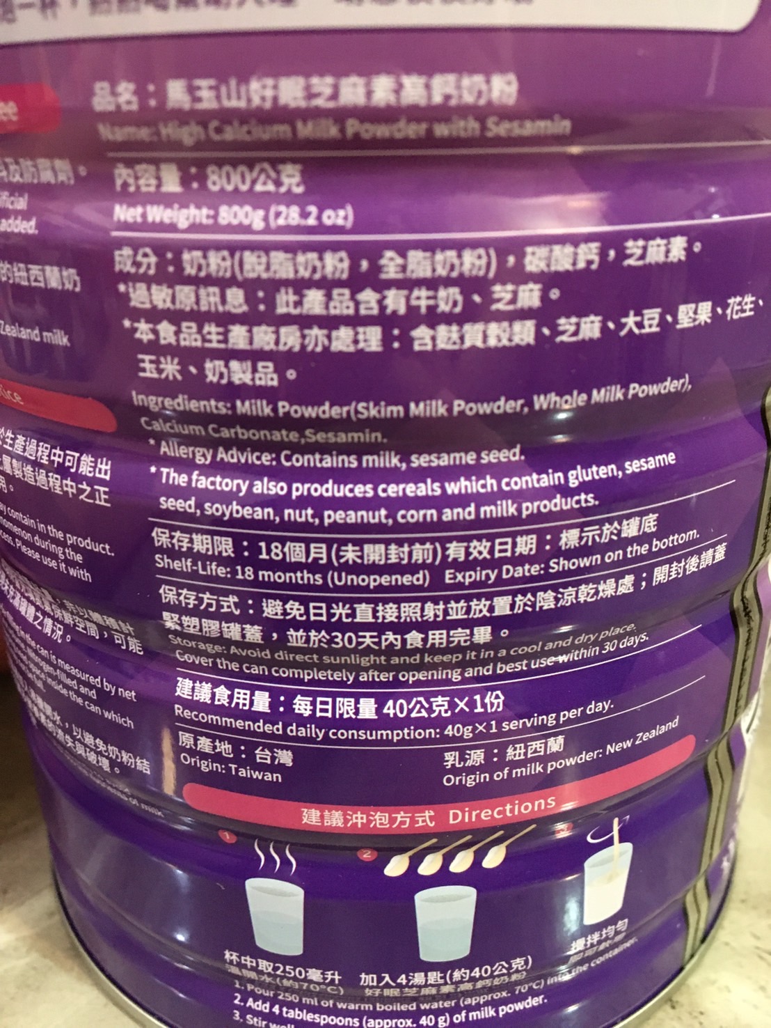 奶粉(脫脂奶粉、全脂奶粉),碳酸鈣,芝麻素。