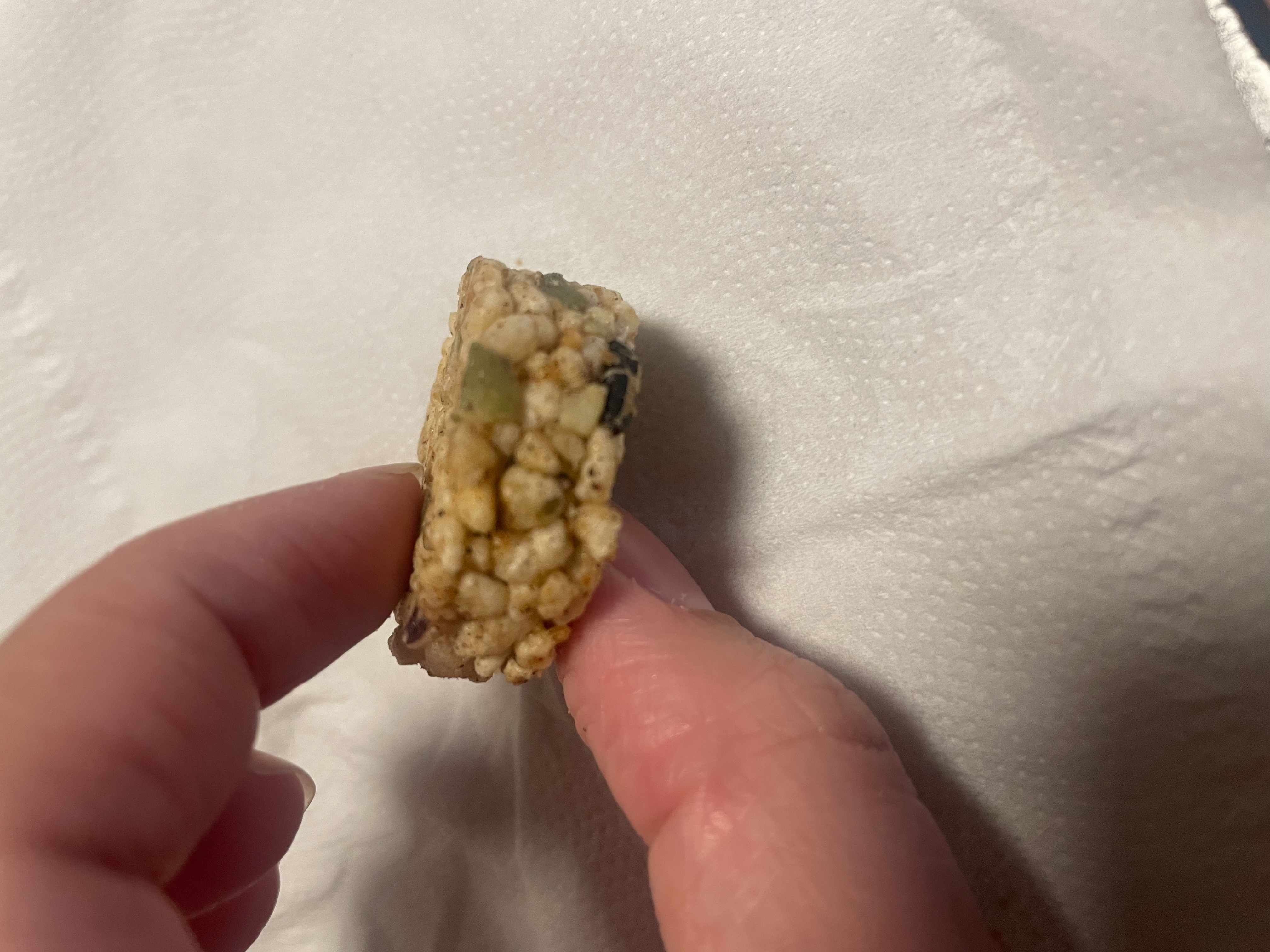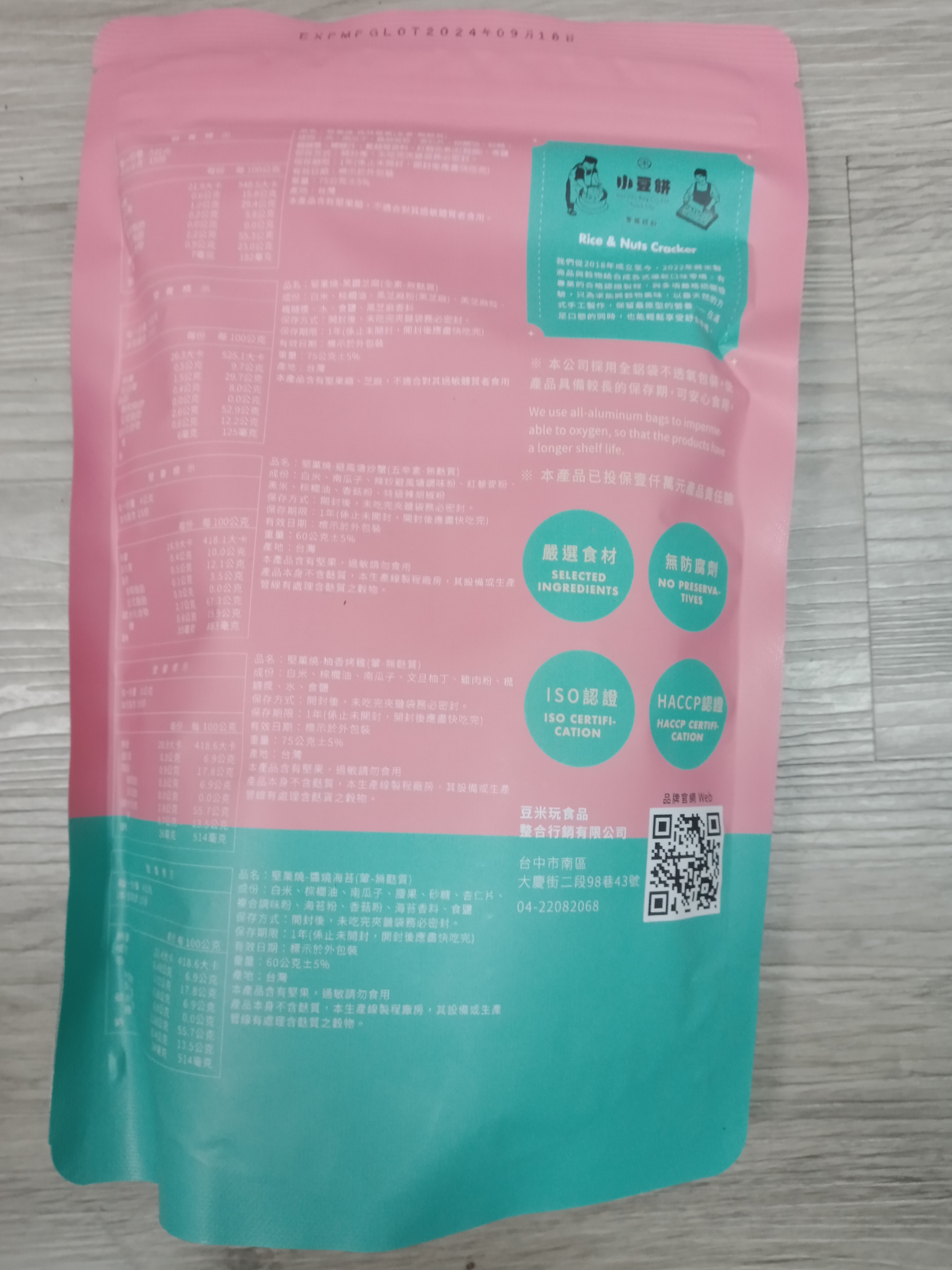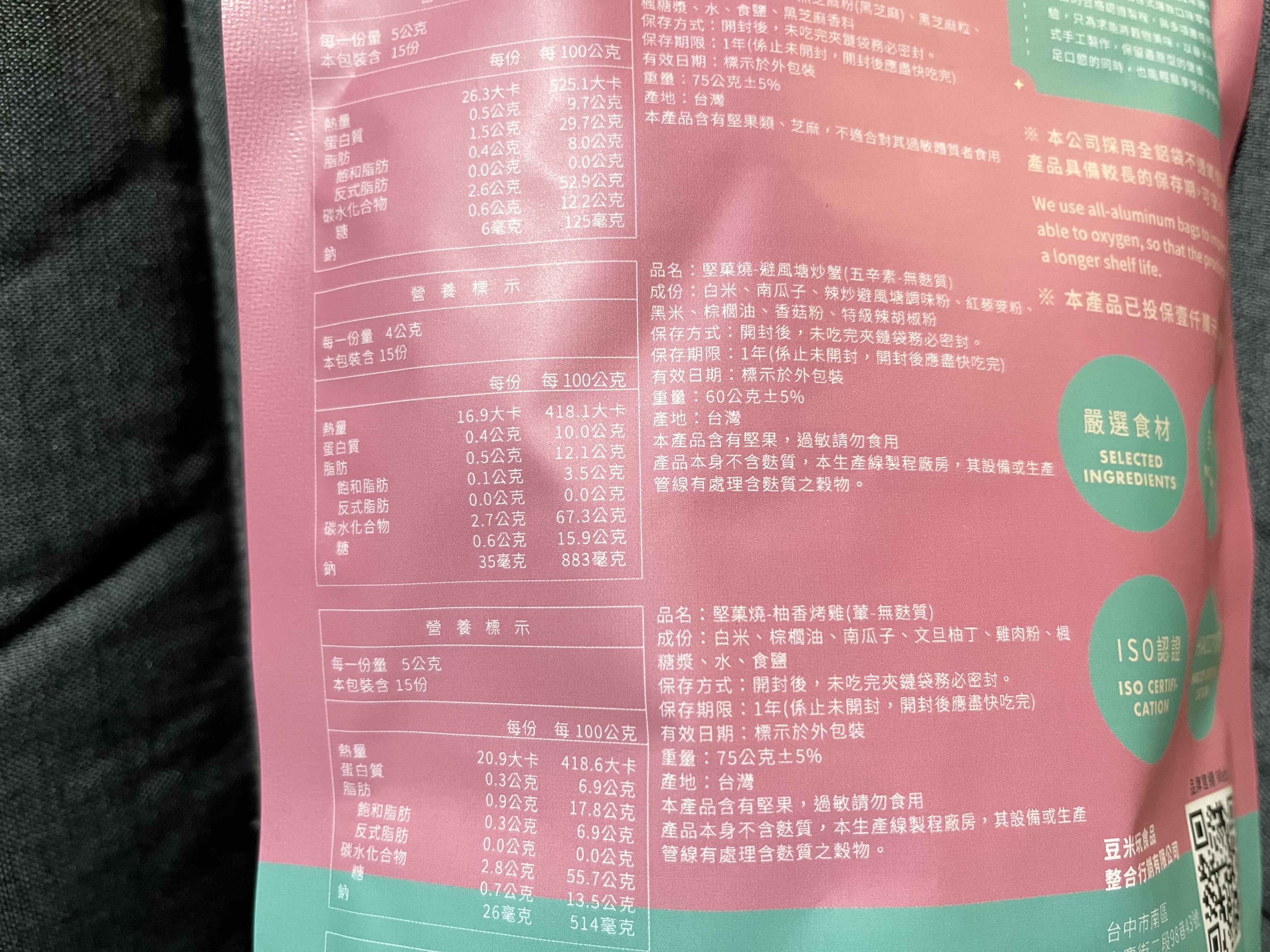 白米、南瓜子、辣炒避風塘調味粉(鹽、蒜、棕櫚油、玉米澱粉(基因改造)、糖、胡椒、蔥、芝麻、辣椒、洋蔥、巴西里、大蒜抽出物)、紅藜麥粉、黑米、棕櫚油、香菇粉、特級辣胡椒粉(麩皮粉、麥芽糊精、綠辣椒、胡椒、玉米澱粉、雞心椒、茶枝、八角、當歸)