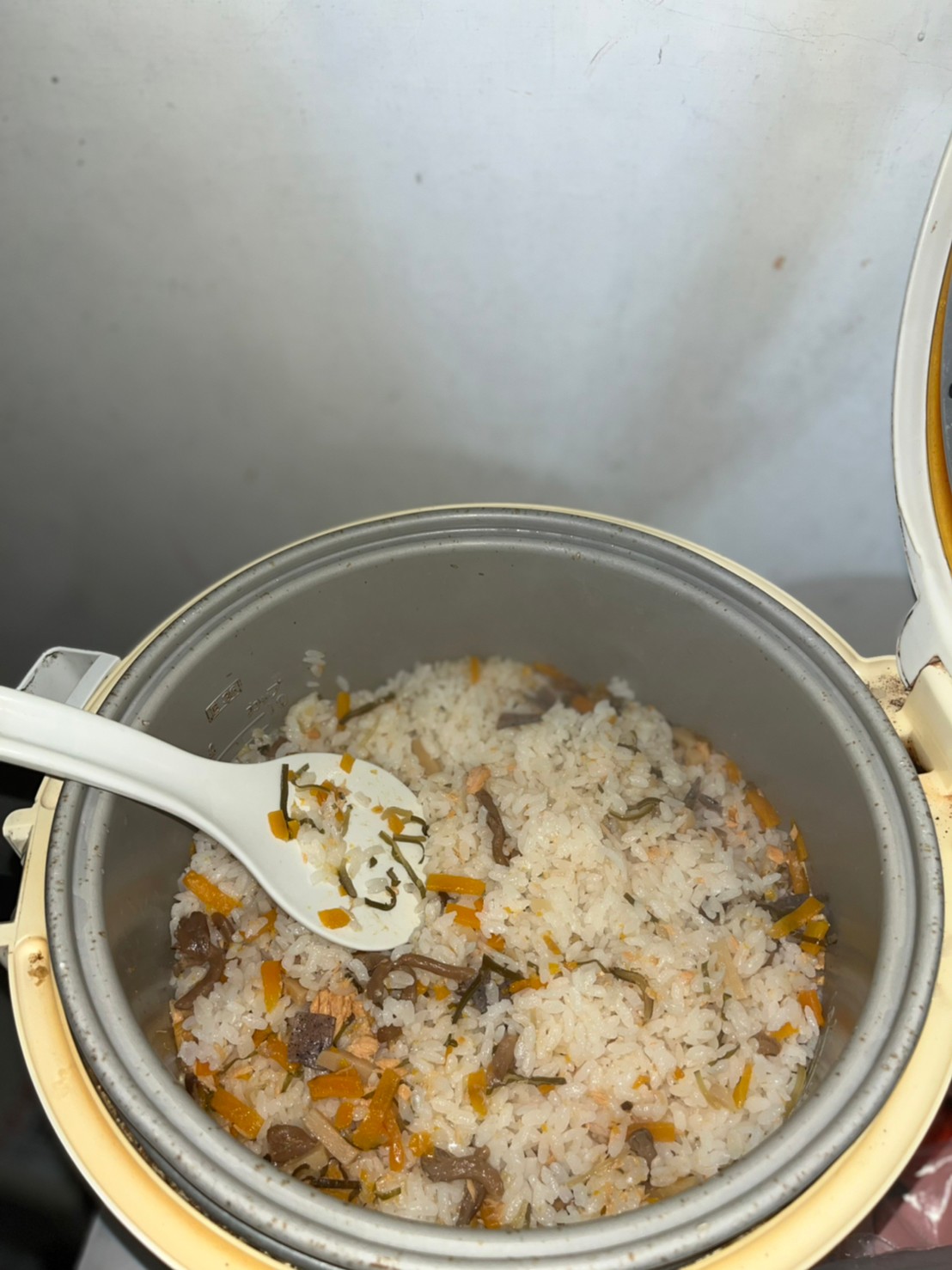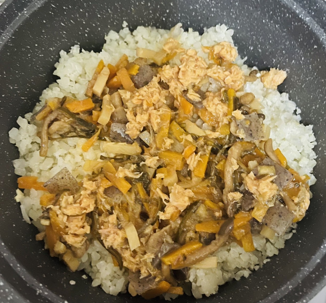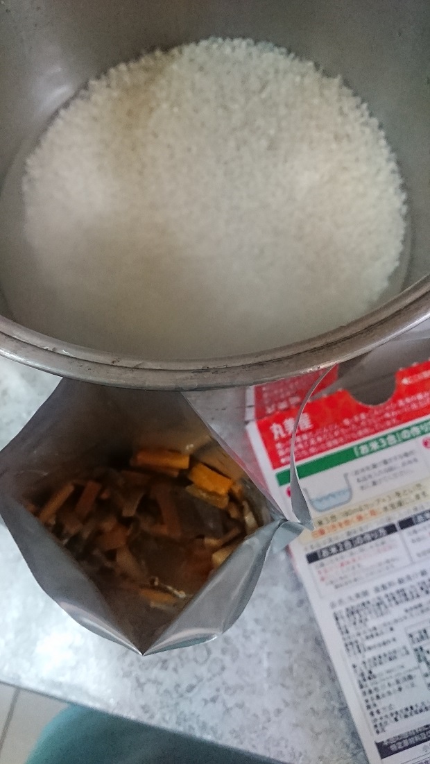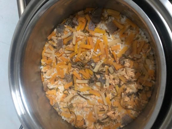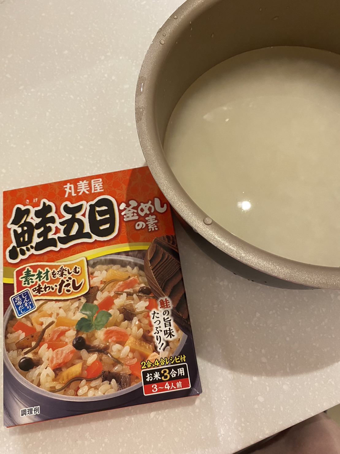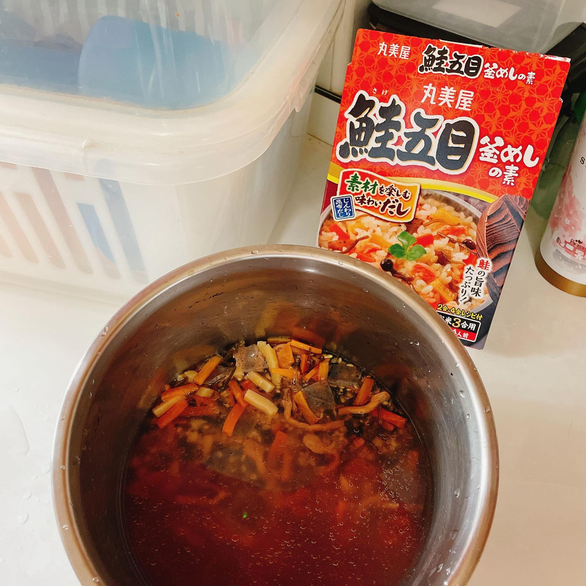 3杯米洗淨後加水,加入釜飯料,將其放入電子鍋或電鍋進行烹煮,待其烹飪完成後即可享用。