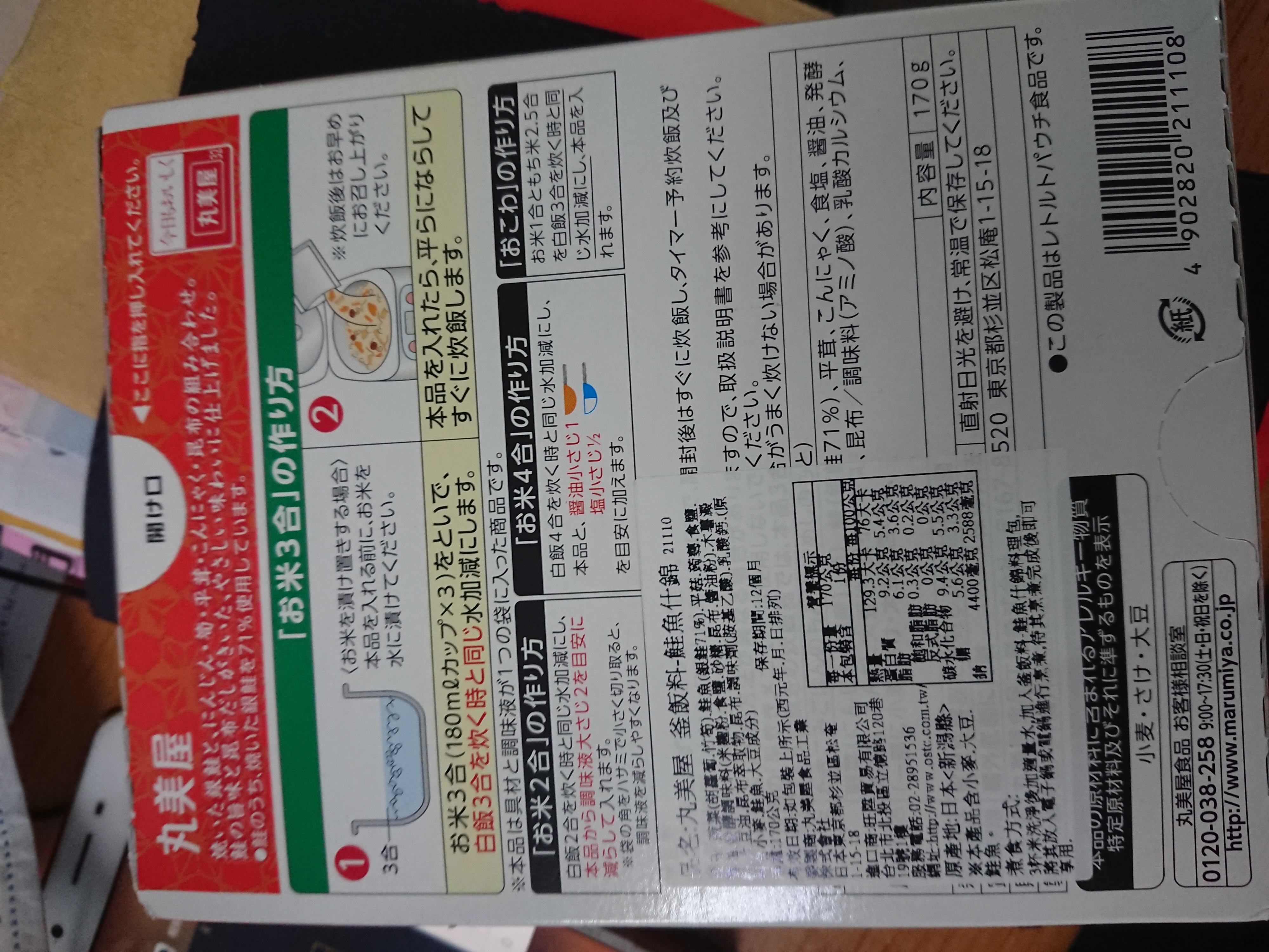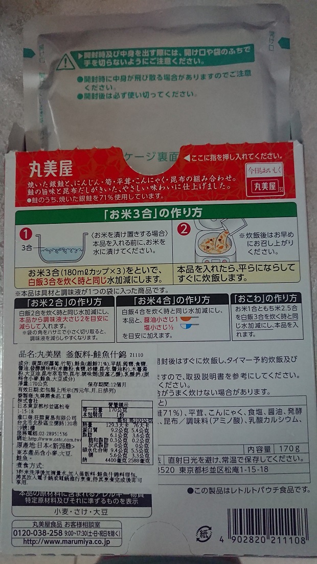 蔬菜(胡蘿蔔.竹筍).鮭魚(銀鮭71%).平菇.蒟蒻.食鹽.醬油.發酵調味料(米麴粉.食鹽.砂糖.昆布.醬油粉).木薯澱粉.大豆油.昆布萃取物.昆布.調味劑(胺基乙酸).乳酸鈣.(原料含小麥.鮭魚.大豆成分)